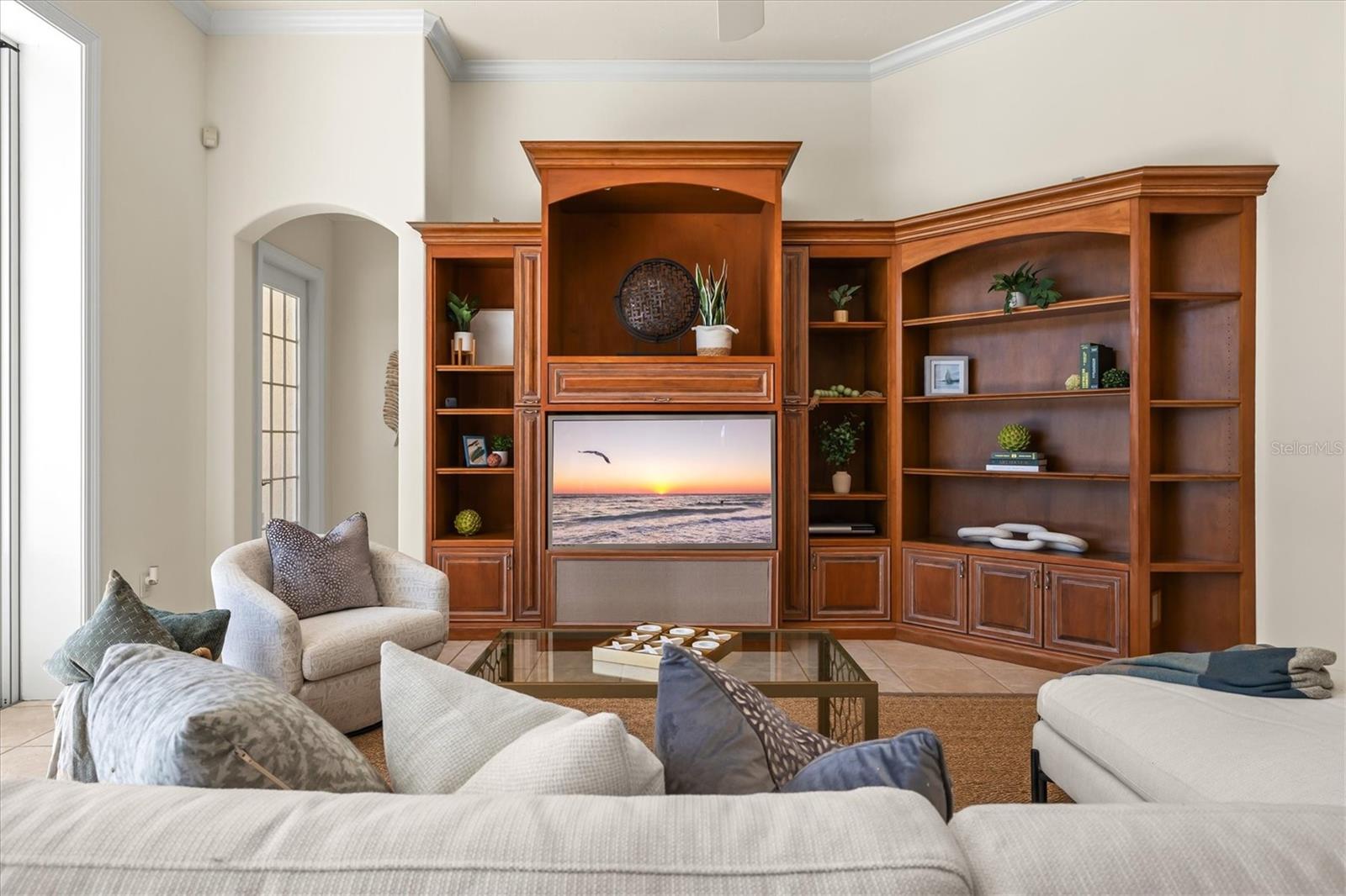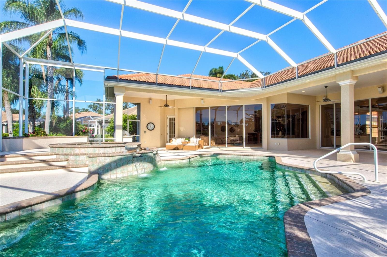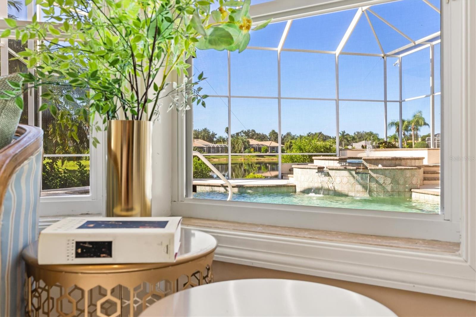 This meticulously maintained, custom-built Dan Najjar Sterling Manor home offers timeless elegance and exceptional craftsmanship in the sought-after Richmond Park neighborhood of award-winning University Park Country Club. With 3,732 square feet of living space on a .36-acre lot, this one-story, split-floorplan home features 3 bedrooms, 3 bathrooms, a study, and a 3-car garage.A circular driveway with landscape lighting welcomes you to the home, where the front entry provides a brilliant direct view of the sparkling pool and spa and serene pond beyond. Expansive living areas open seamlessly to the outdoors through three sets of sliding glass doors, leading to the screened lanai with a large pool featuring automatic popups, spa with gas heating, and a full outdoor kitchen complete with Corian counters, sink, and built-in gas grill.Inside, the home is richly appointed with granite and marble surfaces, trayed and beam ceilings, and custom details throughout. The chef's kitchen is both functional and refined, offering a Sub-Zero refrigerator, Thermador gas range and double oven, Bosch extra-quiet dishwasher, walk-in hidden pantry with built-in safe, refrigerated wine cabinet, instant hot water tap, and center island.The family room showcases a striking custom wood built-in with shelving, TV display, and hidden storage, while the study impresses with handsome wood cabinetry, Bermuda shutters, and built-ins designed for both beauty and functionality.The luxurious primary suite features a custom walk-in closet with two entrances, abundant built-in shelving and storage, and a spa-like bathroom with dual vanities, dual showers, Jacuzzi tub, and elegant cabinetry. Two additional guest bedrooms and baths provide comfort and privacy for visitors.This home also offers significant updates and conveniences, including a NEW TILE ROOF (2024) with transferrable warranty, NEW TWO-ZONE CARRIER HVAC SYSTEM (2025), NEW Rheem 55-gallon GAS WATER HEATER with expansion bladder and circulation system (2024), three Bose surround sound systems, eight Casablanca fans with Inteli-Touch controls, recessed lighting, and four unique chandeliers.Blending elegance, comfort, and thoughtful design, this Sterling Manor home presents a rare opportunity to enjoy resort-style living in one of Sarasota's premier communities.University Park Country Club is consistently ranked one of the top courses in Florida featuring 27 holes of championship golf; tennis and pickleball; fitness center, croquet - as well as an array of social and group activities. Just a short drive outside this peaceful enclave is downtown Sarasota, with shopping, arts & theatres, museums, dining and entertainment, top-ranked healthcare, beaches and SRQ International Airport.