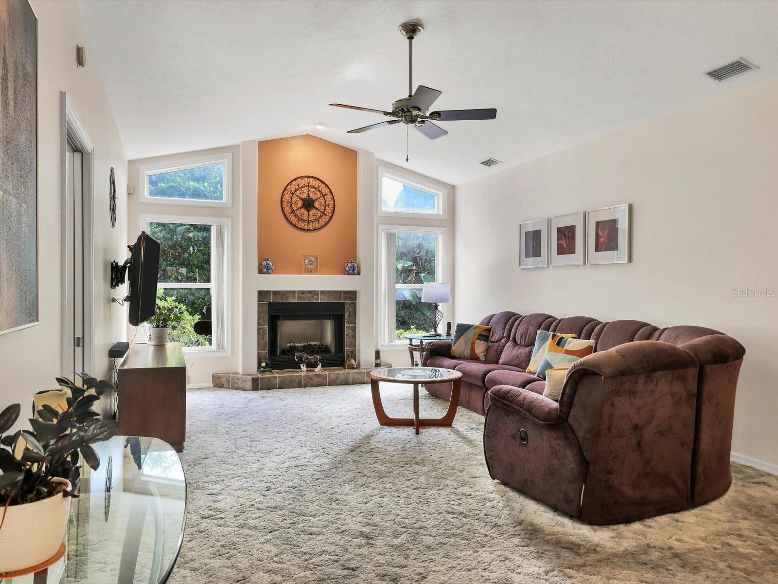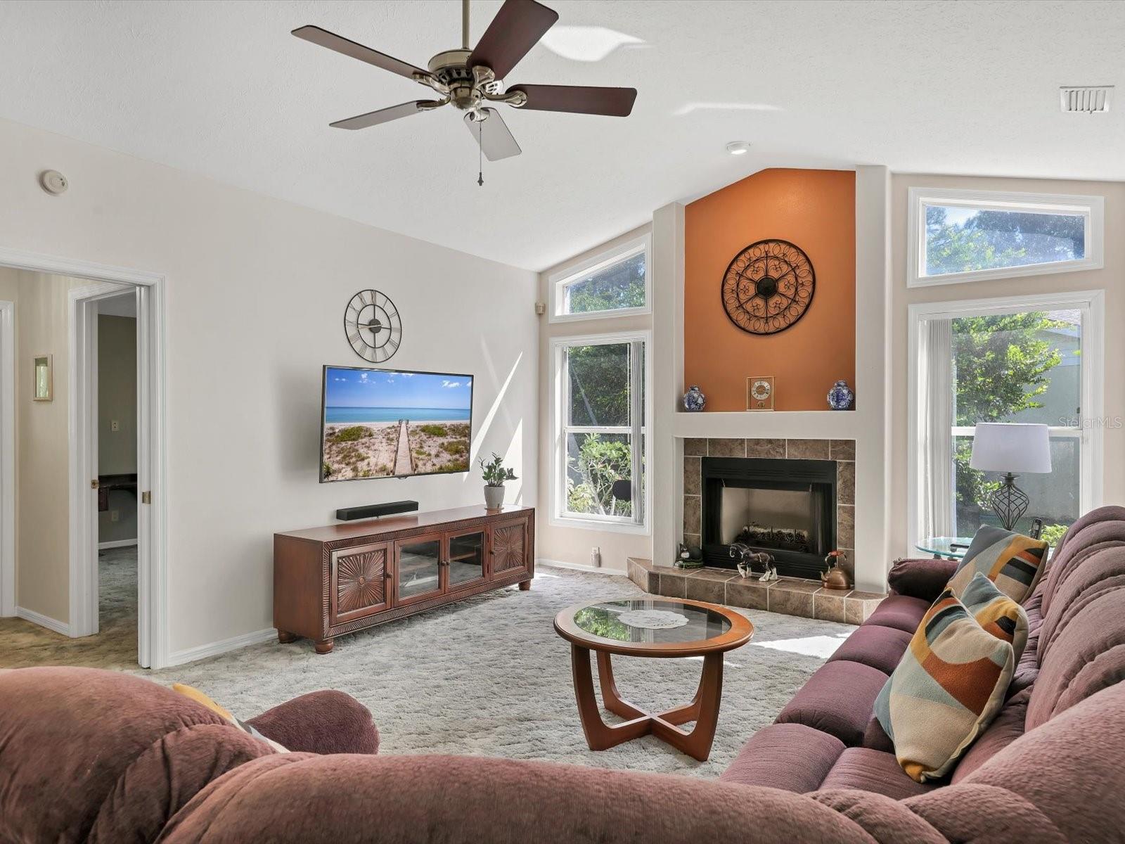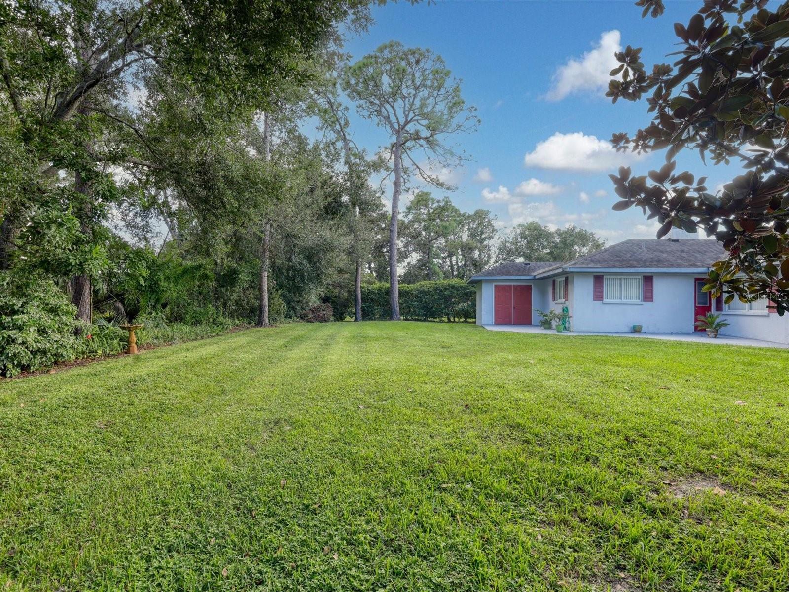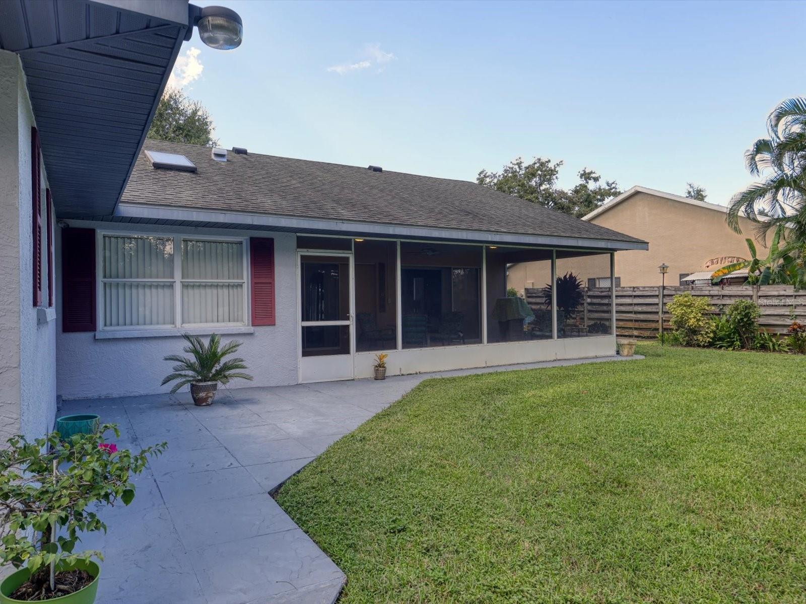 A LOVELY HOME IN A POPULAR & QUIET NEIGHBORHOOD...SO MUCH HOUSE FOR THE PRICE! This inviting home offers a thoughtful layout with comfortable spaces for everyday living. Upon entry, you are welcomed by the expansive living and dining room combo, highlighted by a large picture window that frames the landscaped outdoors. The dining area opens directly to the lanai, creating a natural extension for gatherings and entertaining. The updated kitchen features granite countertops, overhead lighting, and a skylight that fills the room with natural light. It seamlessly connects to the spacious great room, where a wood-burning fireplace and garden views set the scene for cozy family time. Designed with privacy in mind, the split floor plan includes three bedrooms and two bathrooms. Each bedroom has a walk-in closet, while the guest bath conveniently opens to the lanai. The primary suite also has lanai access and features a large walk-in closet, double sinks, and a garden tub. Every room in the home overlooks the peaceful, landscaped yard. The lanai offers serene views of the private backyard and water, with plenty of space to add a pool. An attached shed provides extra storage. With the roof replaced in 2014 and HVAC in 2019, this home is ready for easy updates to compliment your personal taste to make it your own. Conveniently located near beaches, shopping, and entertainment. See why this community has become so popular and why this is the one!