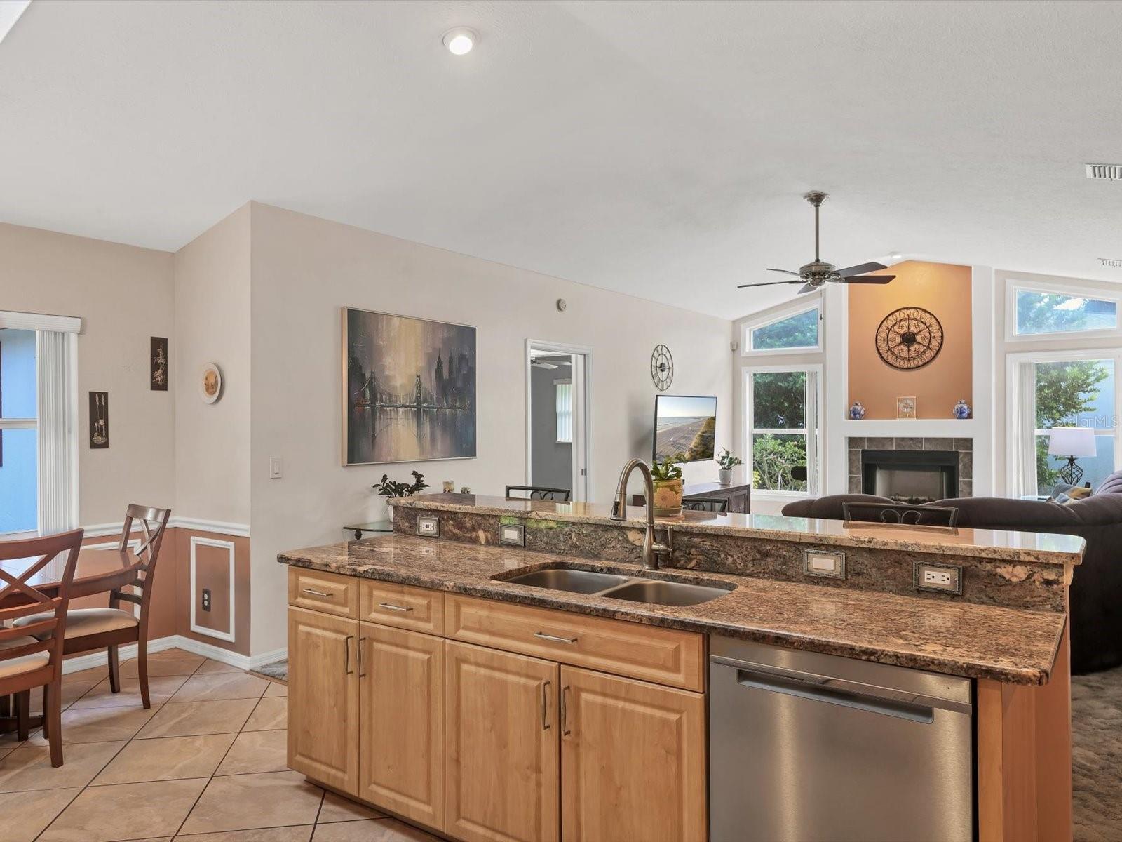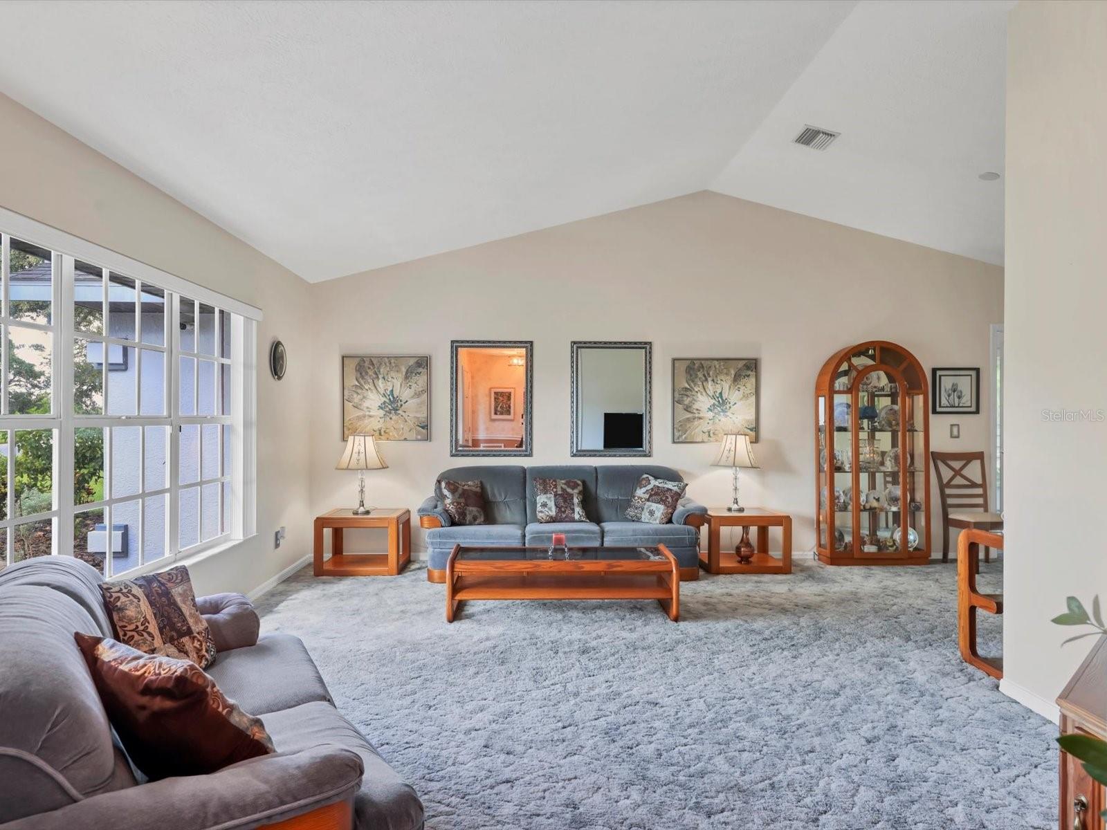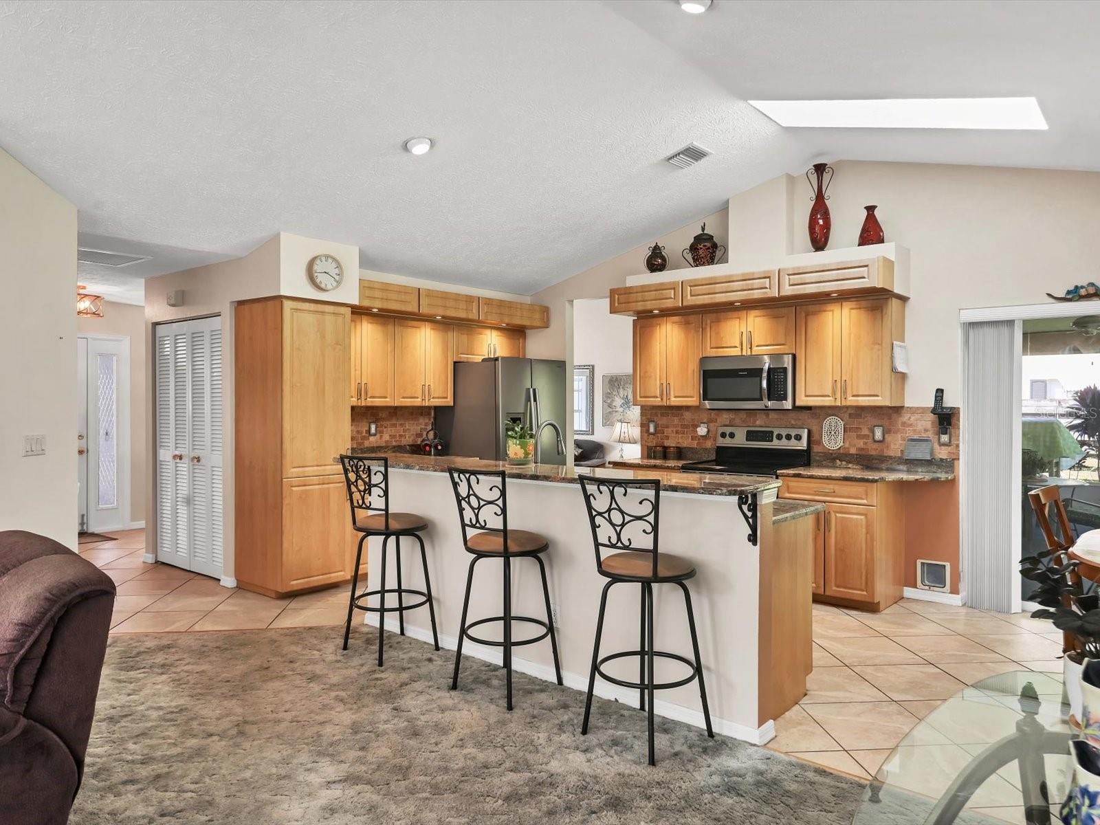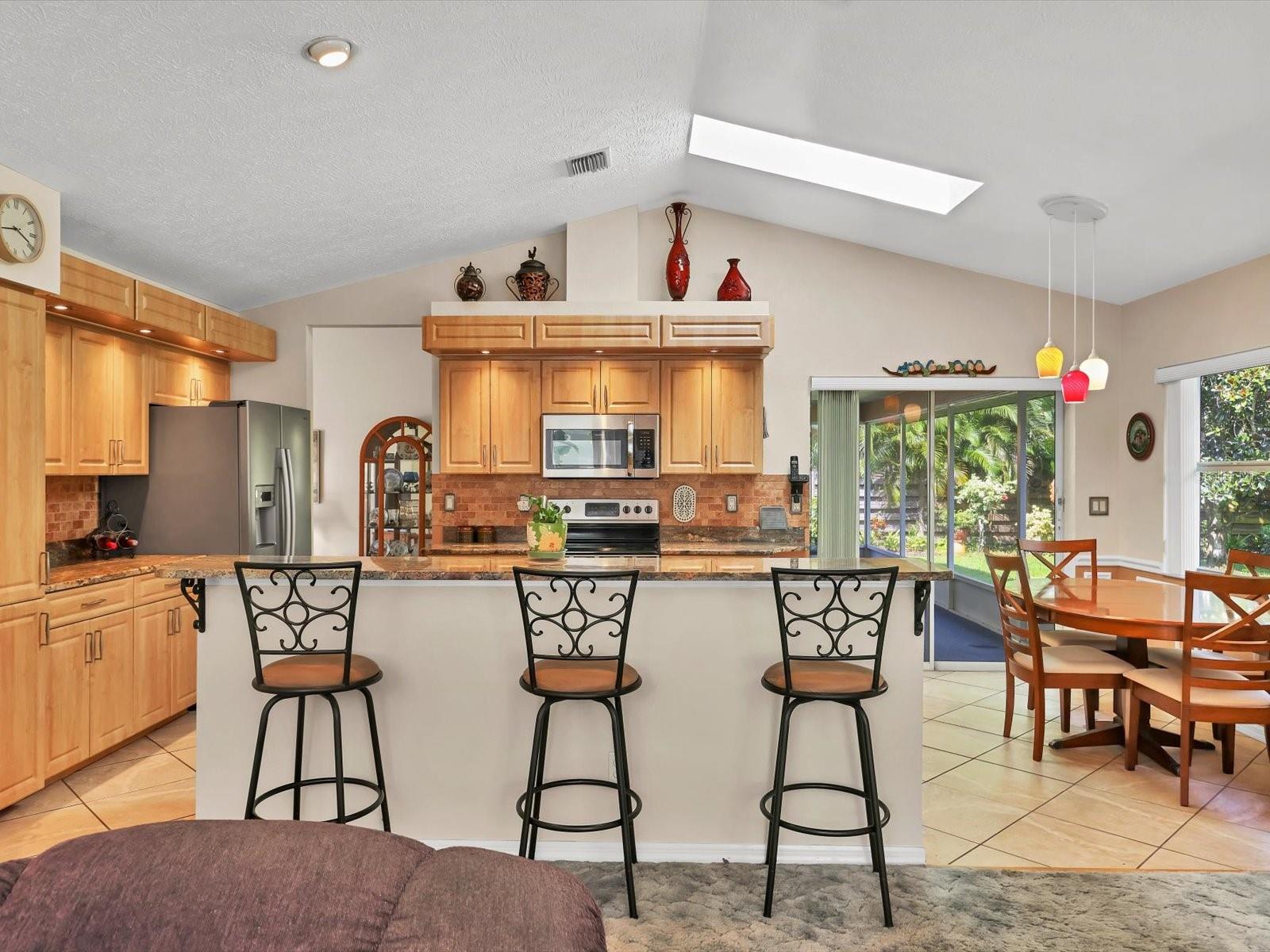 A LOVELY HOME IN A POPULAR & QUIET NEIGHBORHOOD...SO MUCH HOUSE FOR THE PRICE! This inviting home offers a thoughtful layout with comfortable spaces for everyday living. Upon entry, you are welcomed by the expansive living and dining room combo, highlighted by a large picture window that frames the landscaped outdoors. The dining area opens directly to the lanai, creating a natural extension for gatherings and entertaining. The updated kitchen features granite countertops, overhead lighting, and a skylight that fills the room with natural light. It seamlessly connects to the spacious great room, where a wood-burning fireplace and garden views set the scene for cozy family time. Designed with privacy in mind, the split floor plan includes three bedrooms and two bathrooms. Each bedroom has a walk-in closet, while the guest bath conveniently opens to the lanai. The primary suite also has lanai access and features a large walk-in closet, double sinks, and a garden tub. Every room in the home overlooks the peaceful, landscaped yard. The lanai offers serene views of the private backyard and water, with plenty of space to add a pool. An attached shed provides extra storage. With the roof replaced in 2014 and HVAC in 2019, this home is ready for easy updates to compliment your personal taste to make it your own. Conveniently located near beaches, shopping, and entertainment. See why this community has become so popular and why this is the one!