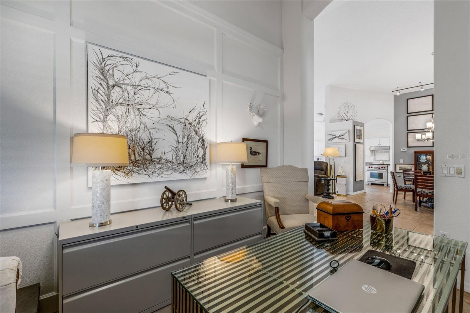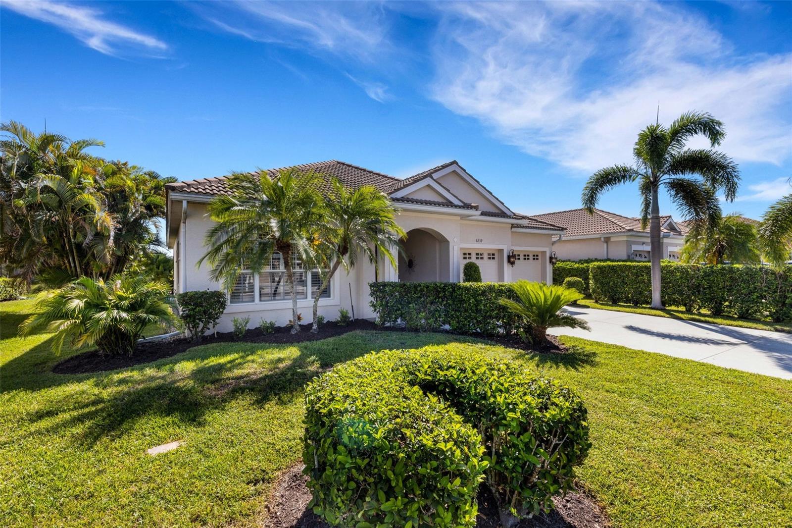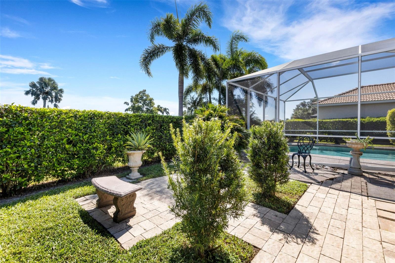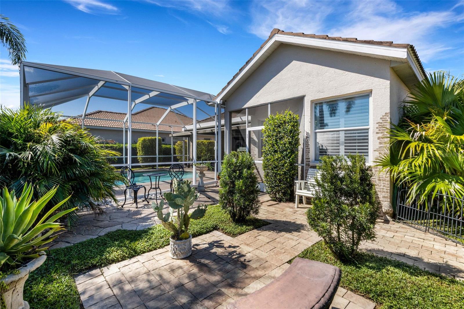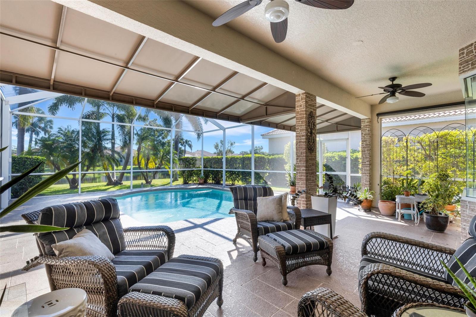 Welcome to this beautifully appointed pool home with 2 bedrooms, 2 baths, plus a large den/office in the sought-after Tara Preserve community. Designed with an artist's eye, every room offers thoughtful details and high-end finishes that set this property apart...custom shiplap, wainscoting, architectural molding, designer lighting and so much more.The heart of the home is the chef's kitchen, featuring a Wolf gas range with designer hood and tile inlay, taupe quartz countertops, shaker-style cabinetry with textured glass fronts and open shelving, and both under-cabinet and uplighting for added ambiance. The sunny breakfast area overlooks the pool and is just perfect for casual meals. High ceilings, plantation shutters, and elegant tile floors flow throughout the open layout (no carpet). The great room shines with a custom trim accent wall, sconce lighting, and dramatic uplighting. A mirrored and trimmed feature wall in the dining room makes it ideal for entertaining.The spacious primary suite boasts lanai access, a sitting area, dual vanities, soaking tub, and walk-in shower with floor-to-ceiling designer tile. Outside, your backyard oasis awaits with a sparkling pool, covered lanai - expanded with permanent awnings. The custom etched and stained concrete floor and painted brick-accent walls along with the picturesque water view beyond the lanai and landscape lighting make this outdoor area quite spectacular. A very special and unique feature is the serene paver courtyard surrounded by lush hedges...your very own private retreat.All of this and you're living in a golf community with OPTIONAL membership. Low HOA fees cover a large array of amenities: tennis courts, pickleball, heated community pool and spa, and clubhouse hosting many neighborhood activities. Internet and cable are included in the HOA fee! Please note taxes include CDD fee. Conveniently located near I-75, UTC Mall, Downtown Sarasota, and, of course, fabulous beaches (Siesta Key, Longboat Key, Anna Maria Island).This home blends style, comfort, and designer features to reflect Florida living at its best--move right in and enjoy!