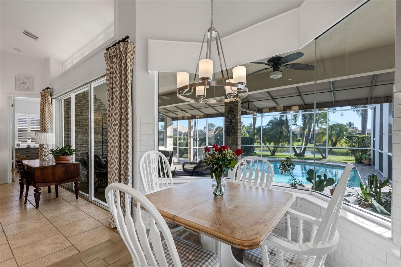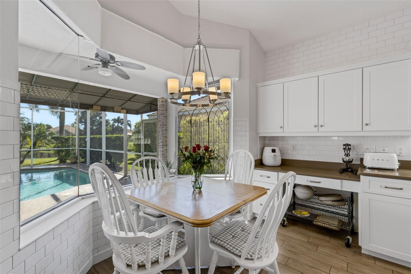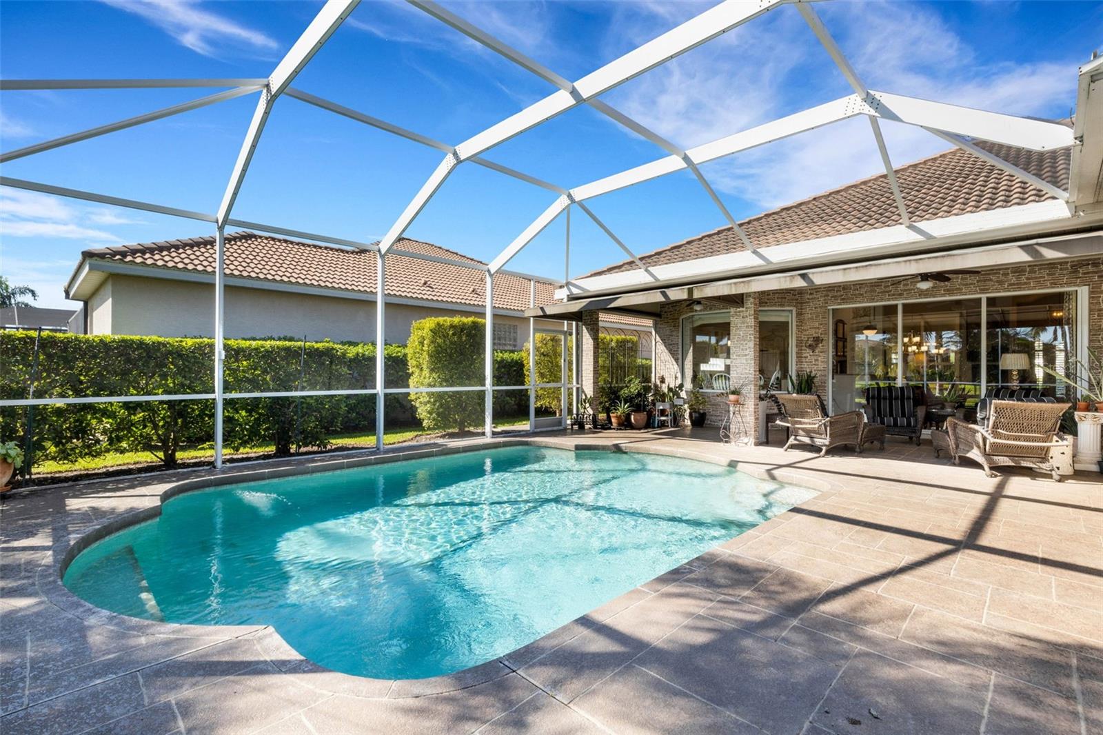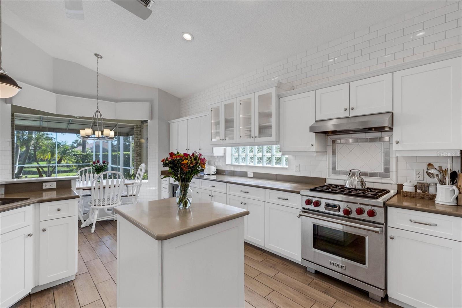 Welcome to this beautifully appointed pool home with 2 bedrooms, 2 baths, plus a large den/office in the sought-after Tara Preserve community. Designed with an artist's eye, every room offers thoughtful details and high-end finishes that set this property apart...custom shiplap, wainscoting, architectural molding, designer lighting and so much more.The heart of the home is the chef's kitchen, featuring a Wolf gas range with designer hood and tile inlay, taupe quartz countertops, shaker-style cabinetry with textured glass fronts and open shelving, and both under-cabinet and uplighting for added ambiance. The sunny breakfast area overlooks the pool and is just perfect for casual meals. High ceilings, plantation shutters, and elegant tile floors flow throughout the open layout (no carpet). The great room shines with a custom trim accent wall, sconce lighting, and dramatic uplighting. A mirrored and trimmed feature wall in the dining room makes it ideal for entertaining.The spacious primary suite boasts lanai access, a sitting area, dual vanities, soaking tub, and walk-in shower with floor-to-ceiling designer tile. Outside, your backyard oasis awaits with a sparkling pool, covered lanai - expanded with permanent awnings. The custom etched and stained concrete floor and painted brick-accent walls along with the picturesque water view beyond the lanai and landscape lighting make this outdoor area quite spectacular. A very special and unique feature is the serene paver courtyard surrounded by lush hedges...your very own private retreat.All of this and you're living in a golf community with OPTIONAL membership. Low HOA fees cover a large array of amenities: tennis courts, pickleball, heated community pool and spa, and clubhouse hosting many neighborhood activities. Internet and cable are included in the HOA fee! Please note taxes include CDD fee. Conveniently located near I-75, UTC Mall, Downtown Sarasota, and, of course, fabulous beaches (Siesta Key, Longboat Key, Anna Maria Island).This home blends style, comfort, and designer features to reflect Florida living at its best--move right in and enjoy!