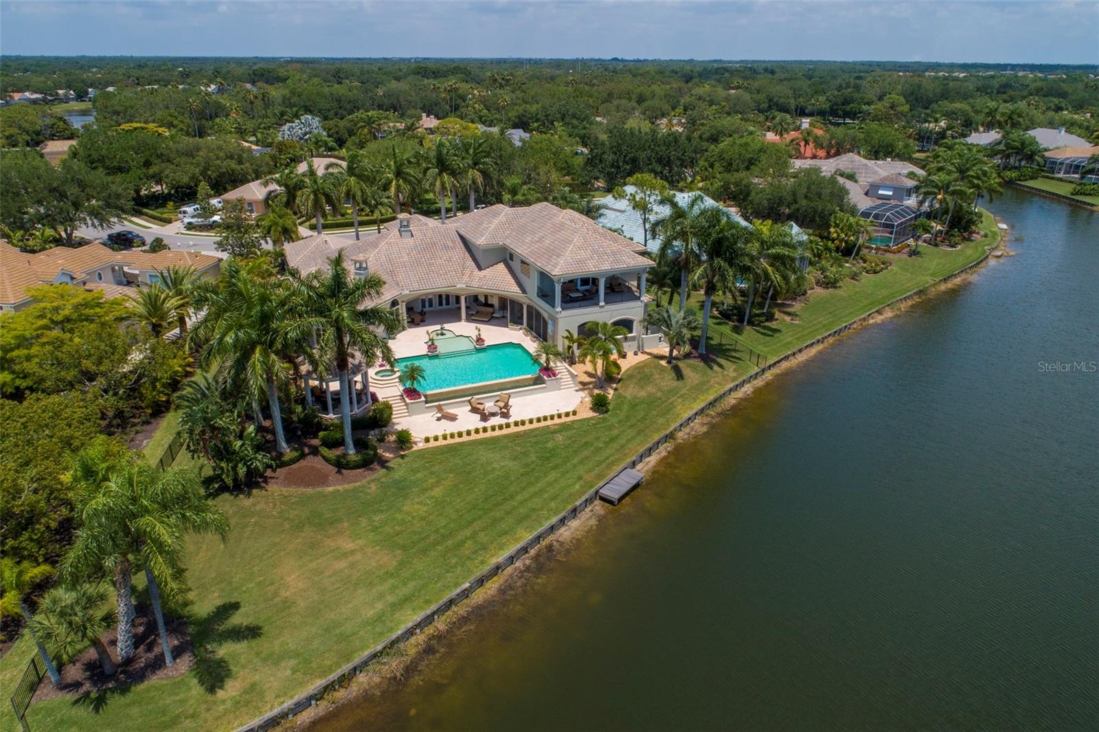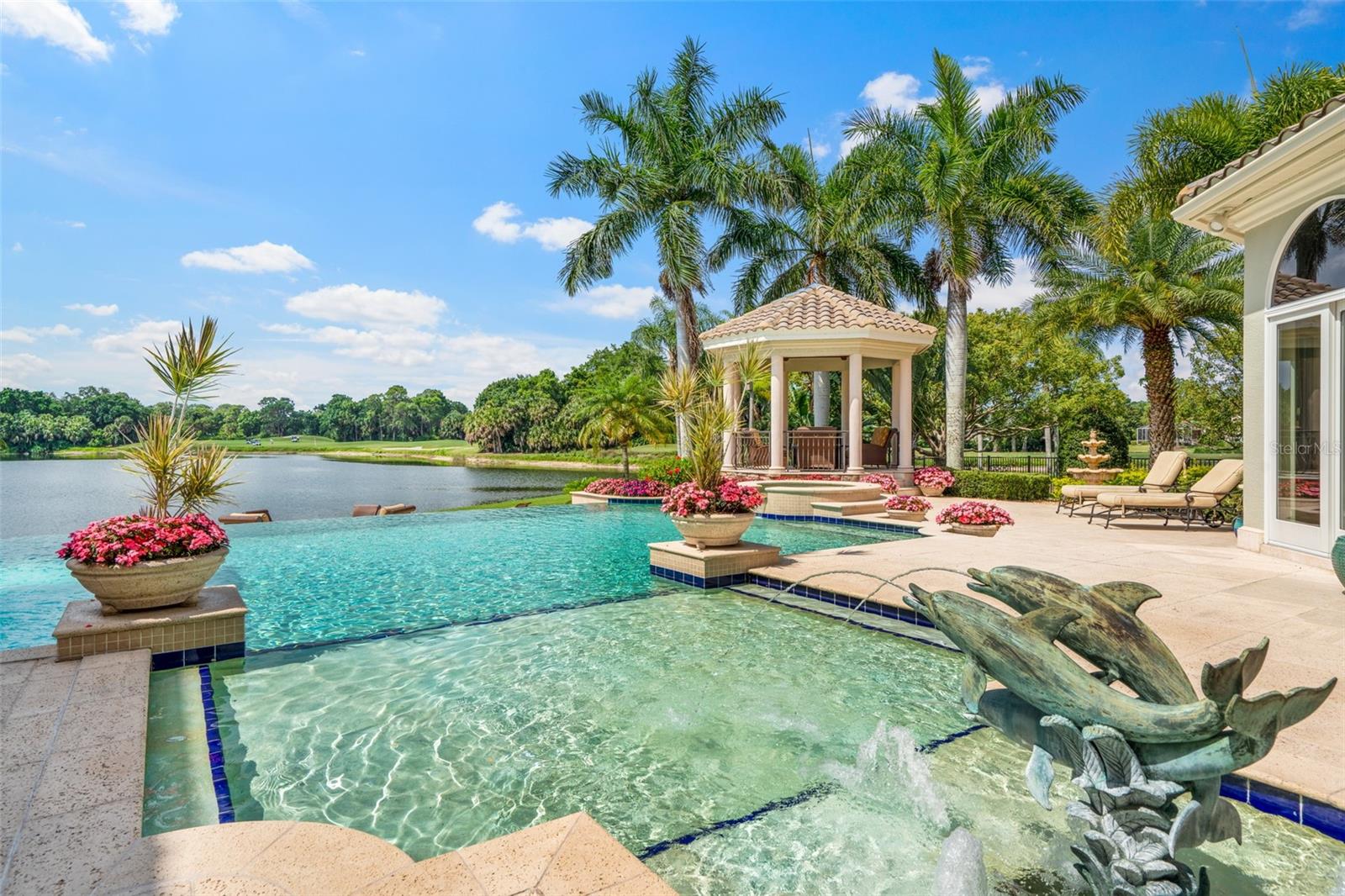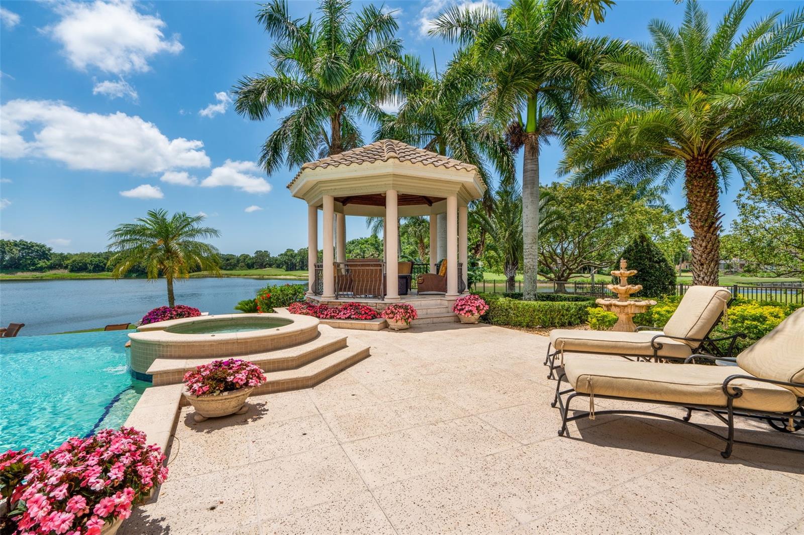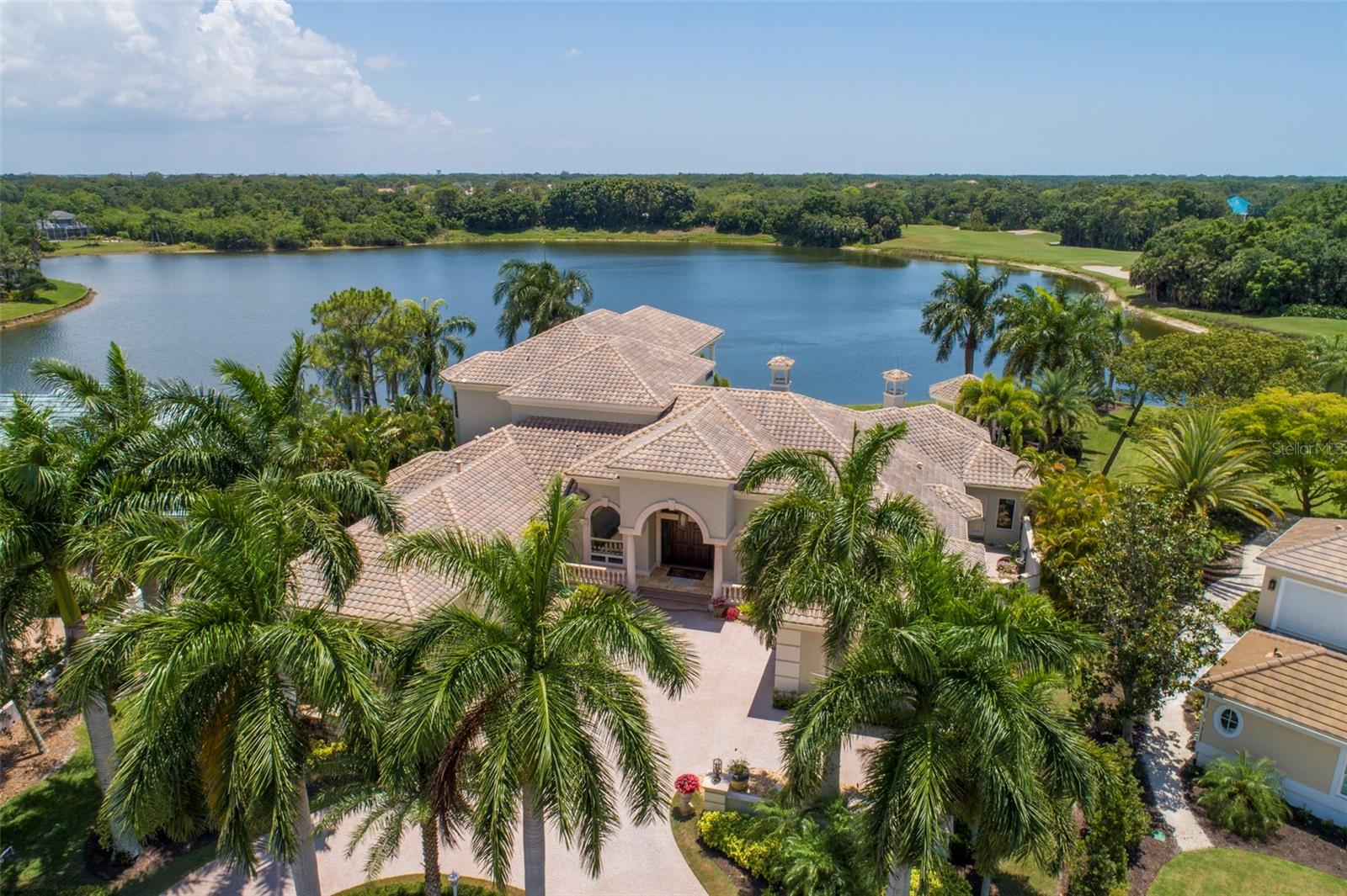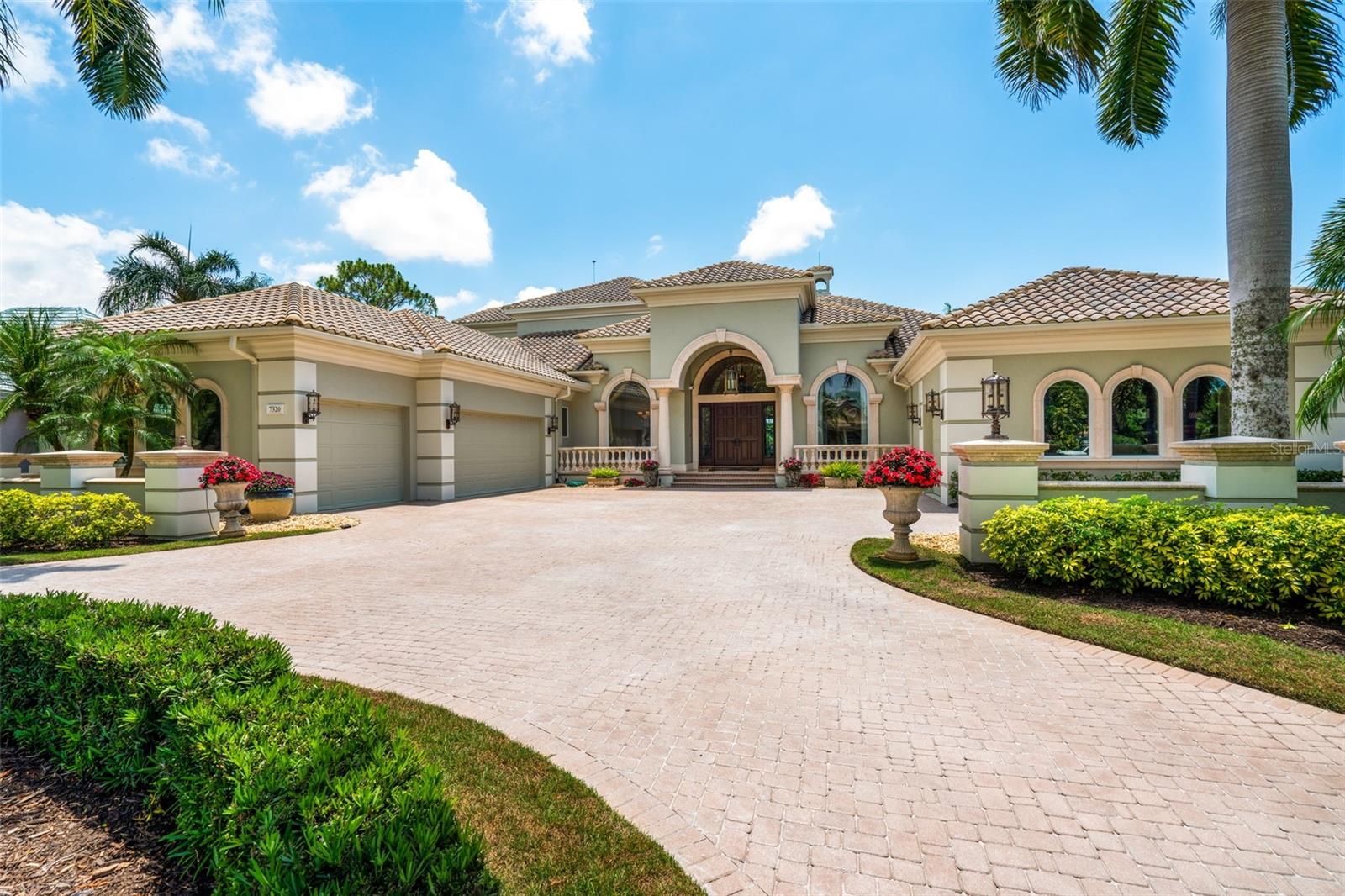 Inside the gates of University Park Country Club in the coveted enclave of Knightsbridge, this notable residence pairs timeless architecture with thoughtful modern UPDATES. Set on acre and the largest lakefront lot in the Park, the home enjoys complete privacy with sweeping water views and backdrop of the golf course in the distance. Built by one of Sarasota's premier builders, the home is distinguished by an open-air infinity pool and spa (RE-SURFACED AND NEW TILE), fountains, a detached gazebo, and landscaping groomed to the hilt. The interior with travertine and walnut-plank flooring and custom millwork throughout is a testament of the finest craftsmanship. The everlasting finishes are enhanced with freshly painted walls, updated window treatments and other refinements throughout. The chef's kitchen is a true centerpiece, recently enhanced with new quartz countertops. Custom cabinetry, a Butler's Pantry and premium appliances include a six-burner Wolf range, separate wall oven, two Sub-Zero refrigerators, three dishwashers, and a built-in Miele coffee bar--ideal for entertaining on any scale. For those who pine for excellence in construction and everlasting elegance - the talent in this craft of fine carpentry has become more precious with time. The first-floor primary suite features custom closets, updated lighting and electronic shades, a dramatic fireplace, Anderson doors to the pool, and access to a private courtyard. Second level, accessed by ELEVATOR or a grand staircase, you'll find a theater room for 8, a large bonus room with built-in media wall, full bar, sumptuous guest suite and a covered terrace. Additional highlights include a side entry 4-CAR AIR CONDITIONED GARAGE plus golf cart bay and a separate air-conditioned storage room. A whole house GENERATOR, water filtration and RO, smart lighting system, newer aluminum fencing to secure the entire rear side boundary lines, screened and full outdoor kitchen with stone fireplace, and updated audio system. This is resort-style living in one of Sarasota's premier gated country club settings that continues to enjoy a reputation of the finest (optional) golf, tennis and racquet sports around. Social mixes and club dining is part of the lifestyle. Appreciate the unequivocal convenience to University Park's shopping mecca nearby, fine dining, SRQ International Airport and downtown Sarasota just a short 20 minute drive.