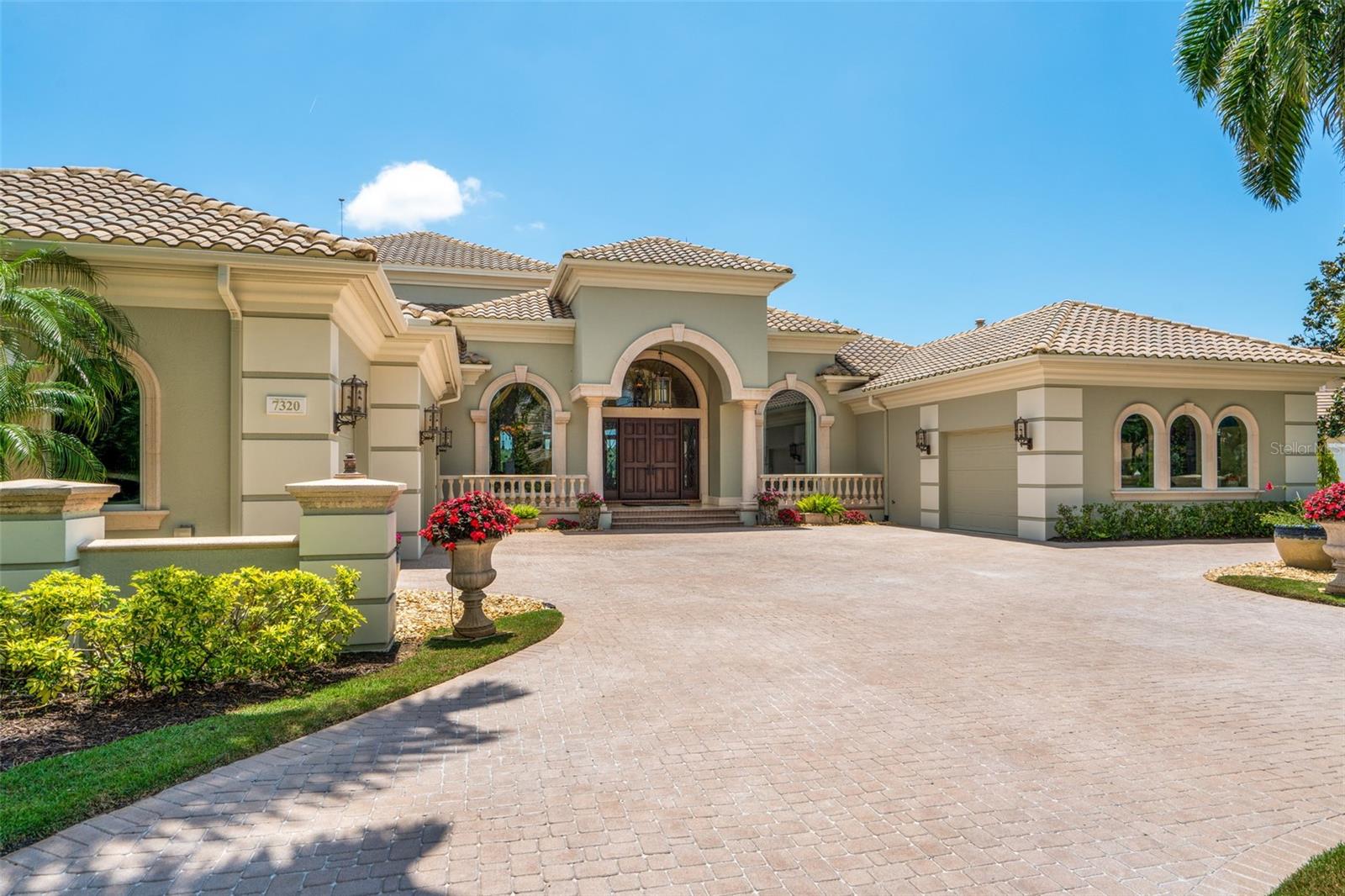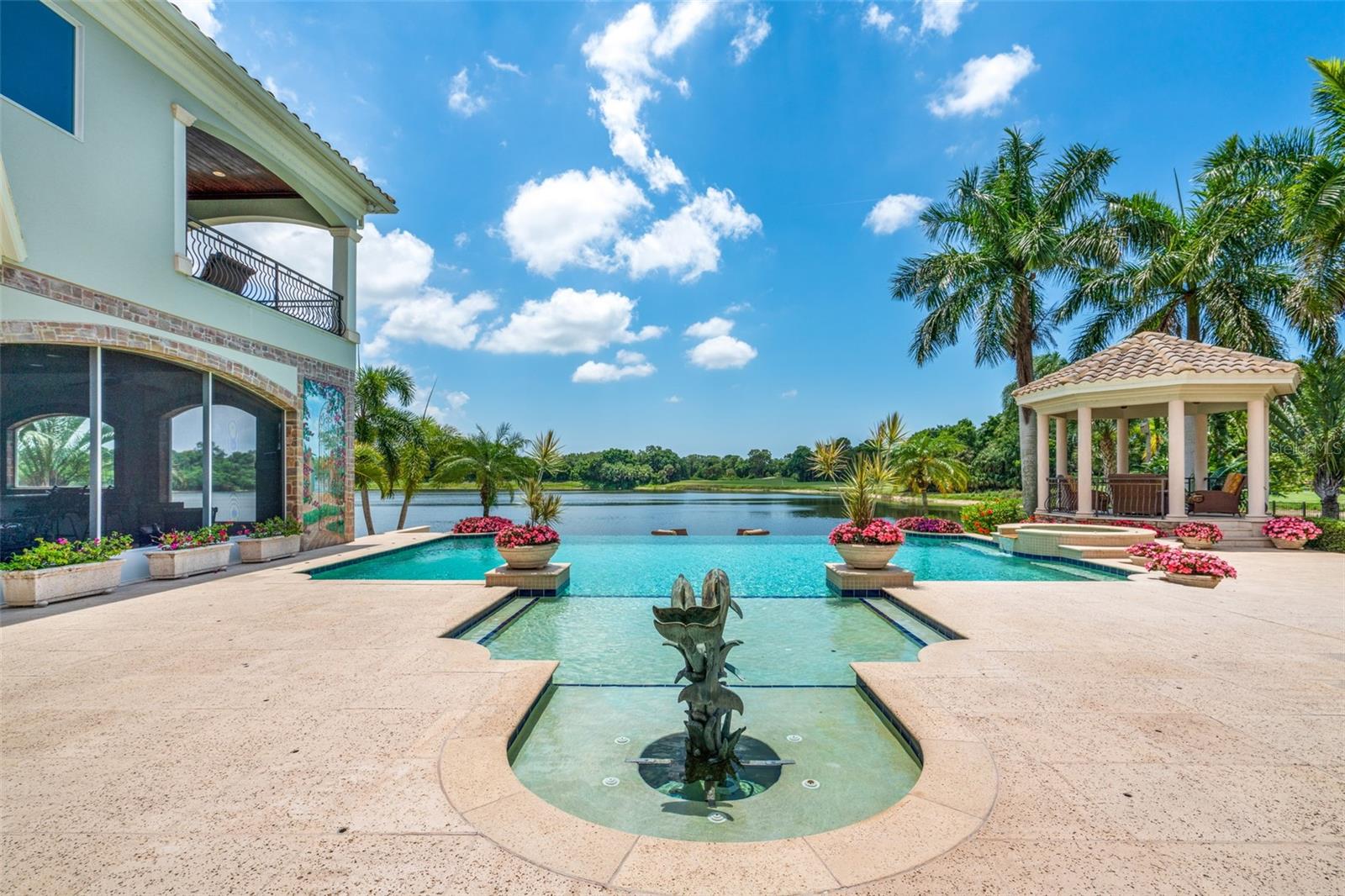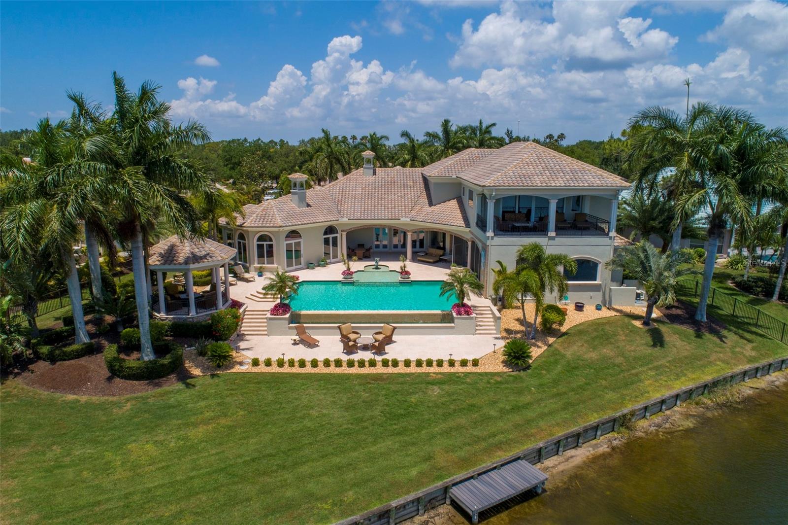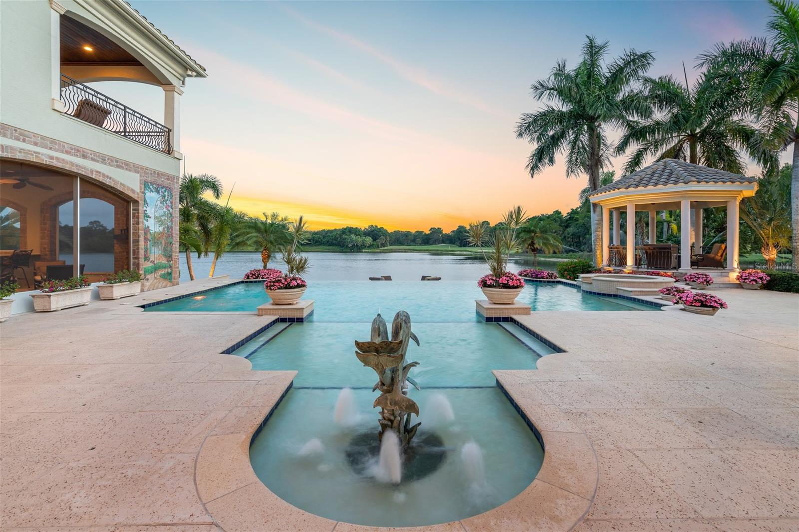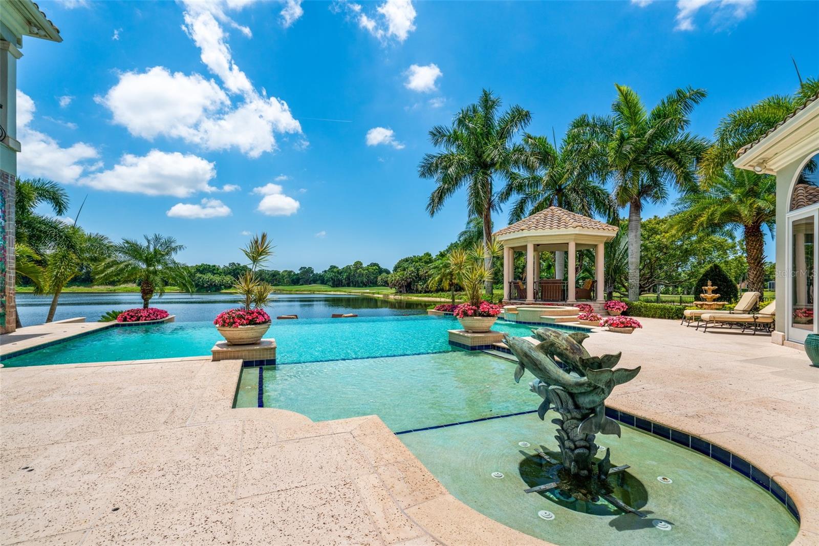 Inside the gates of University Park Country Club in the coveted enclave of Knightsbridge, this notable residence pairs timeless architecture with thoughtful modern UPDATES. Set on acre and the largest lakefront lot in the Park, the home enjoys complete privacy with sweeping water views and backdrop of the golf course in the distance. Built by one of Sarasota's premier builders, the home is distinguished by an open-air infinity pool and spa (RE-SURFACED AND NEW TILE), fountains, a detached gazebo, and landscaping groomed to the hilt. The interior with travertine and walnut-plank flooring and custom millwork throughout is a testament of the finest craftsmanship. The everlasting finishes are enhanced with freshly painted walls, updated window treatments and other refinements throughout. The chef's kitchen is a true centerpiece, recently enhanced with new quartz countertops. Custom cabinetry, a Butler's Pantry and premium appliances include a six-burner Wolf range, separate wall oven, two Sub-Zero refrigerators, three dishwashers, and a built-in Miele coffee bar--ideal for entertaining on any scale. For those who pine for excellence in construction and everlasting elegance - the talent in this craft of fine carpentry has become more precious with time. The first-floor primary suite features custom closets, updated lighting and electronic shades, a dramatic fireplace, Anderson doors to the pool, and access to a private courtyard. Second level, accessed by ELEVATOR or a grand staircase, you'll find a theater room for 8, a large bonus room with built-in media wall, full bar, sumptuous guest suite and a covered terrace. Additional highlights include a side entry 4-CAR AIR CONDITIONED GARAGE plus golf cart bay and a separate air-conditioned storage room. A whole house GENERATOR, water filtration and RO, smart lighting system, newer aluminum fencing to secure the entire rear side boundary lines, screened and full outdoor kitchen with stone fireplace, and updated audio system. This is resort-style living in one of Sarasota's premier gated country club settings that continues to enjoy a reputation of the finest (optional) golf, tennis and racquet sports around. Social mixes and club dining is part of the lifestyle. Appreciate the unequivocal convenience to University Park's shopping mecca nearby, fine dining, SRQ International Airport and downtown Sarasota just a short 20 minute drive.