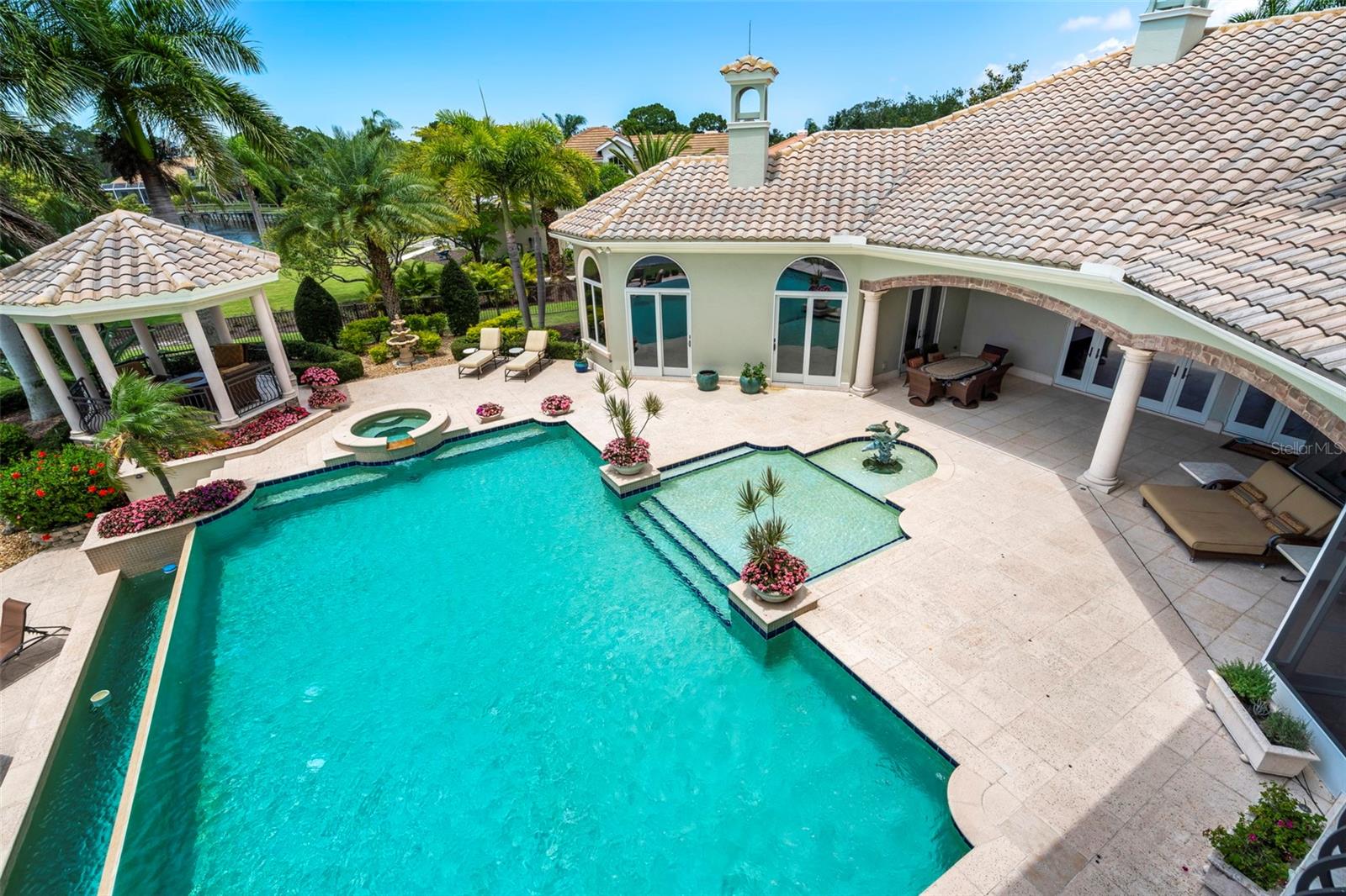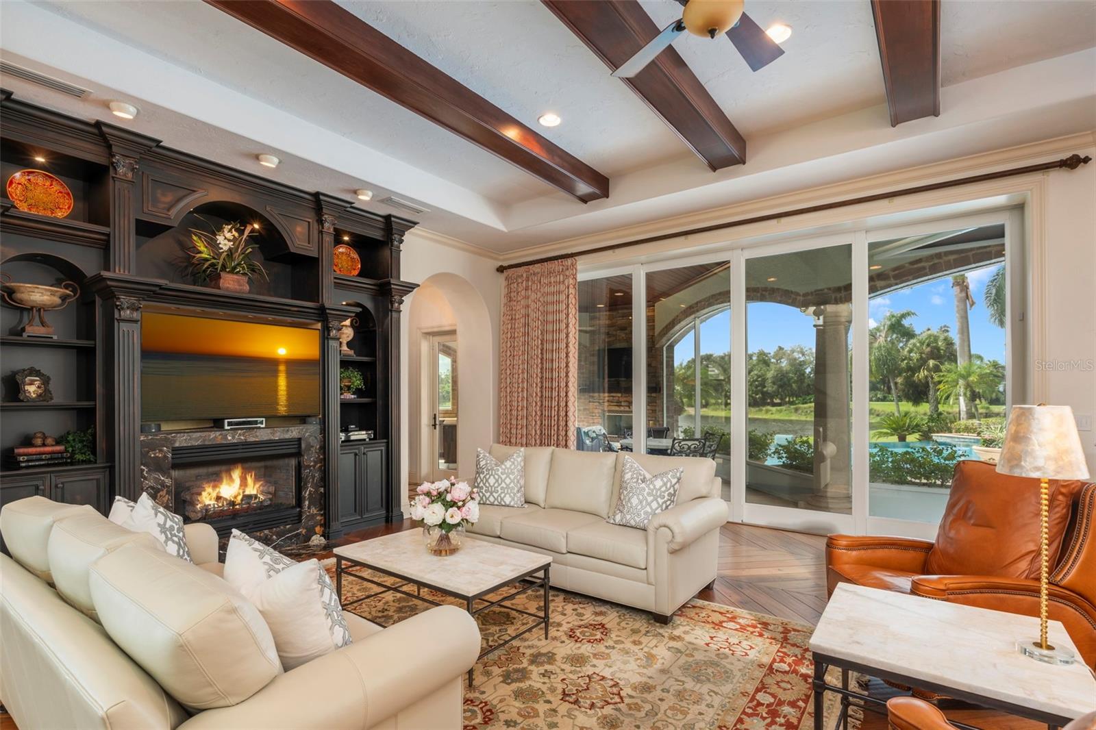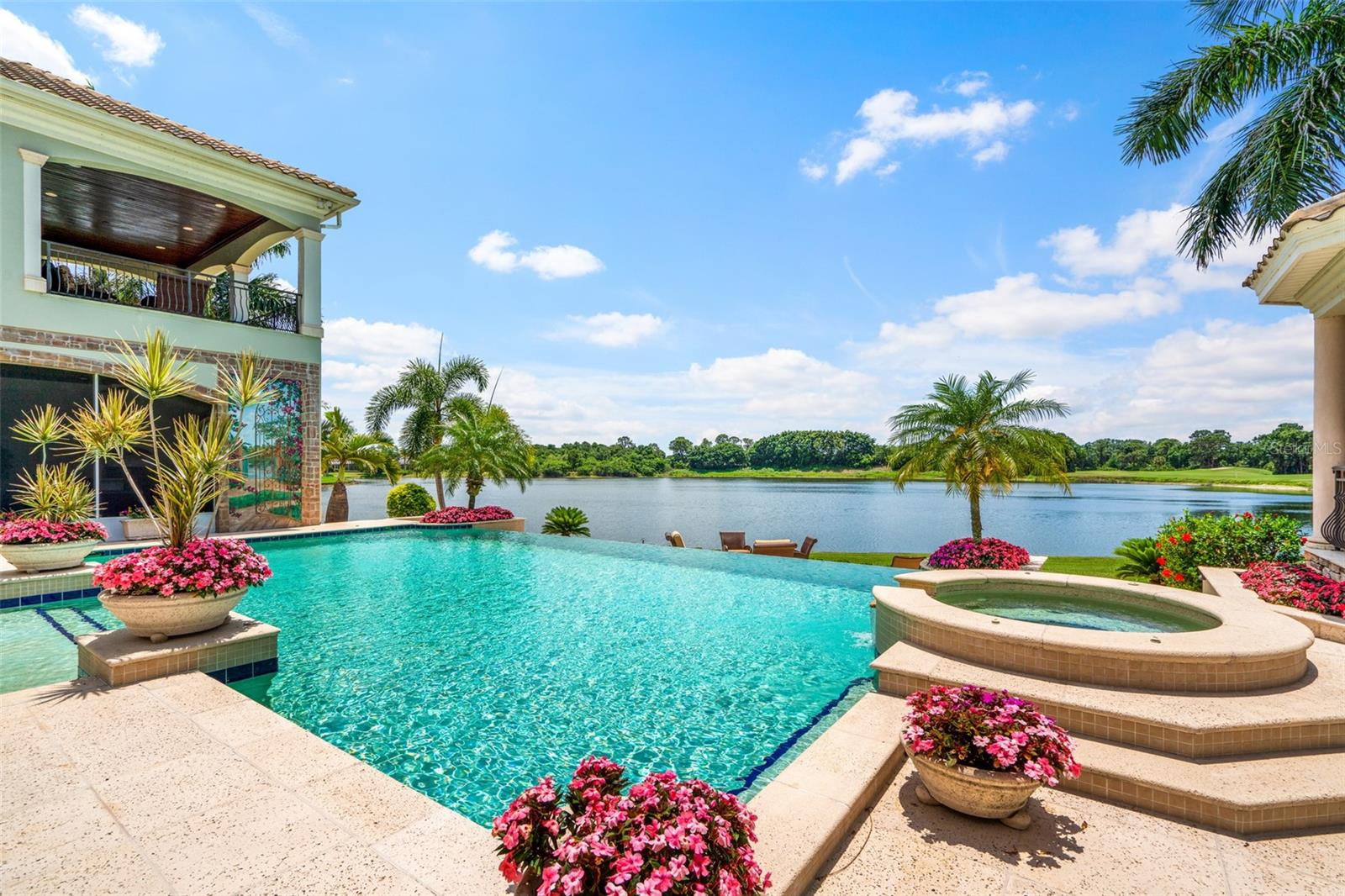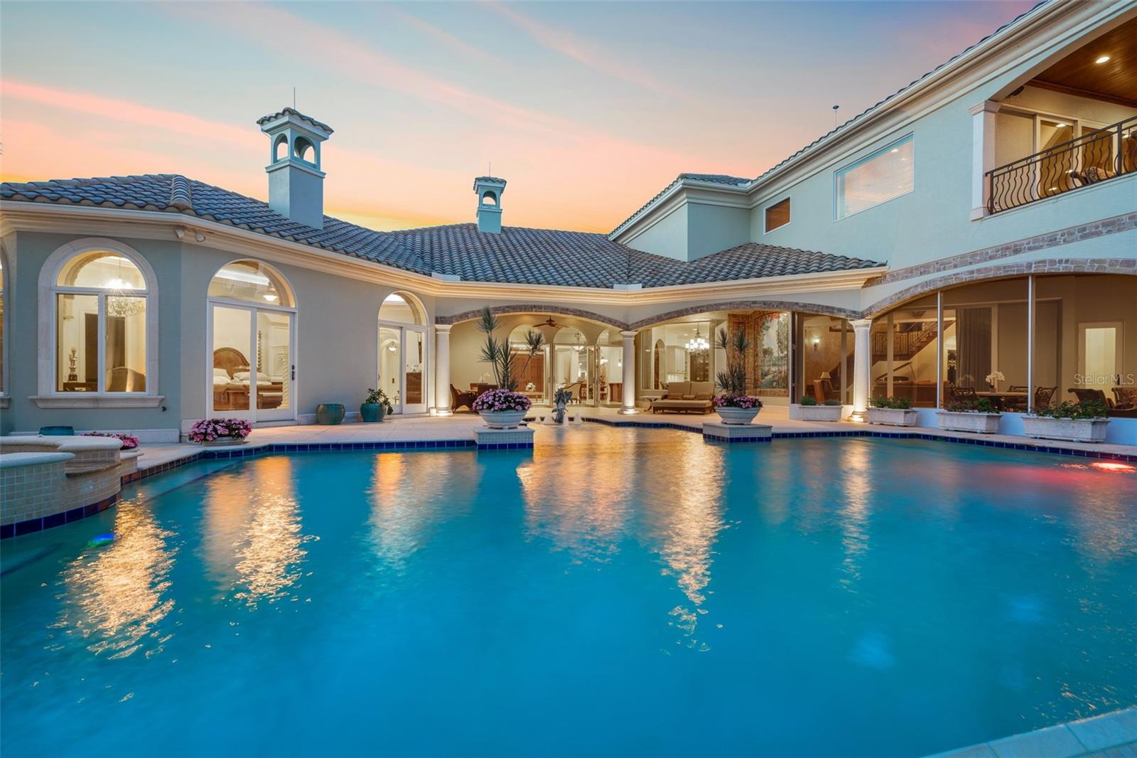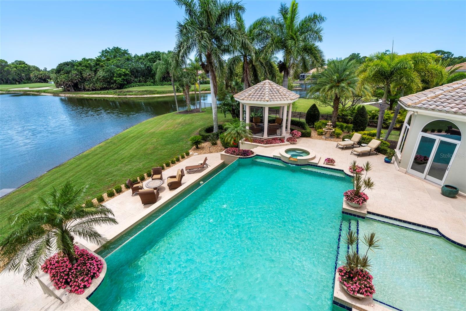 Inside the gates of University Park Country Club in the coveted enclave of Knightsbridge, this notable residence pairs timeless architecture with thoughtful modern UPDATES. Set on acre and the largest lakefront lot in the Park, the home enjoys complete privacy with sweeping water views and backdrop of the golf course in the distance. Built by one of Sarasota's premier builders, the home is distinguished by an open-air infinity pool and spa (RE-SURFACED AND NEW TILE), fountains, a detached gazebo, and landscaping groomed to the hilt. The interior with travertine and walnut-plank flooring and custom millwork throughout is a testament of the finest craftsmanship. The everlasting finishes are enhanced with freshly painted walls, updated window treatments and other refinements throughout. The chef's kitchen is a true centerpiece, recently enhanced with new quartz countertops. Custom cabinetry, a Butler's Pantry and premium appliances include a six-burner Wolf range, separate wall oven, two Sub-Zero refrigerators, three dishwashers, and a built-in Miele coffee bar--ideal for entertaining on any scale. For those who pine for excellence in construction and everlasting elegance - the talent in this craft of fine carpentry has become more precious with time. The first-floor primary suite features custom closets, updated lighting and electronic shades, a dramatic fireplace, Anderson doors to the pool, and access to a private courtyard. Second level, accessed by ELEVATOR or a grand staircase, you'll find a theater room for 8, a large bonus room with built-in media wall, full bar, sumptuous guest suite and a covered terrace. Additional highlights include a side entry 4-CAR AIR CONDITIONED GARAGE plus golf cart bay and a separate air-conditioned storage room. A whole house GENERATOR, water filtration and RO, smart lighting system, newer aluminum fencing to secure the entire rear side boundary lines, screened and full outdoor kitchen with stone fireplace, and updated audio system. This is resort-style living in one of Sarasota's premier gated country club settings that continues to enjoy a reputation of the finest (optional) golf, tennis and racquet sports around. Social mixes and club dining is part of the lifestyle. Appreciate the unequivocal convenience to University Park's shopping mecca nearby, fine dining, SRQ International Airport and downtown Sarasota just a short 20 minute drive.