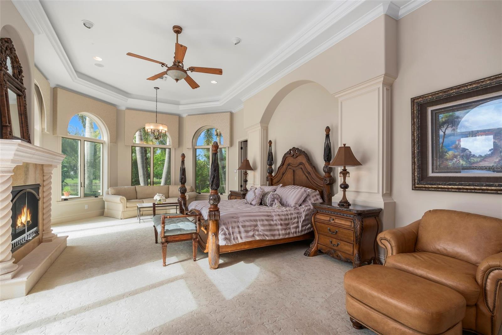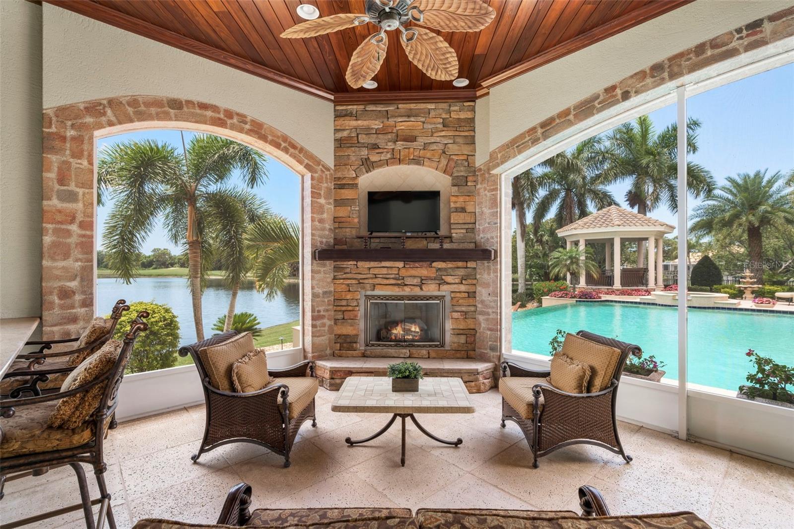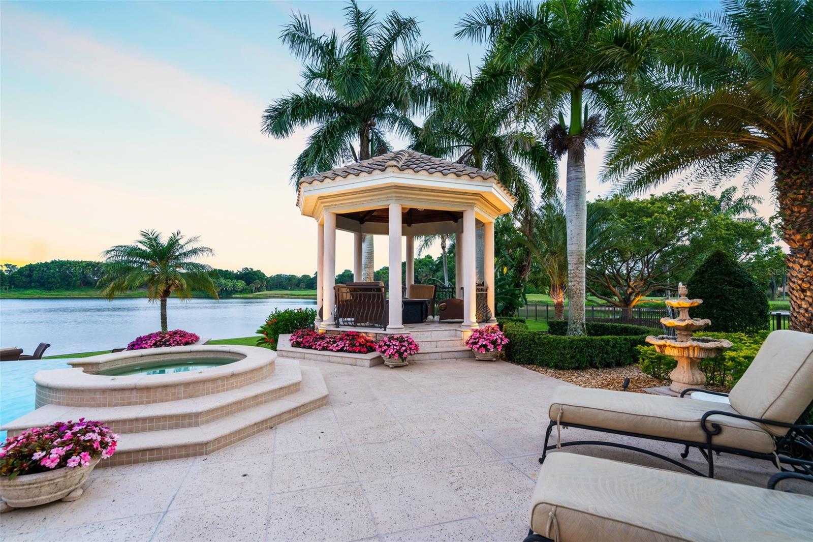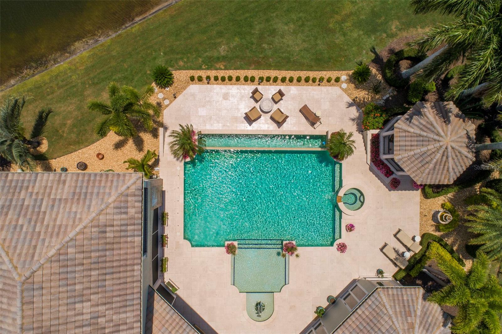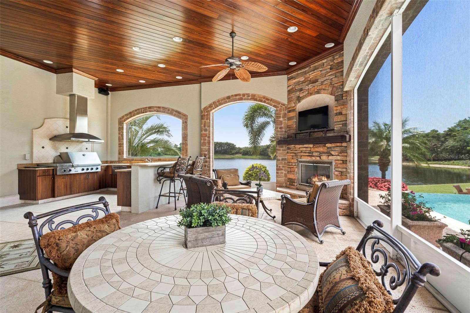 Inside the gates of University Park Country Club in the coveted enclave of Knightsbridge, this notable residence pairs timeless architecture with thoughtful modern UPDATES. Set on acre and the largest lakefront lot in the Park, the home enjoys complete privacy with sweeping water views and backdrop of the golf course in the distance. Built by one of Sarasota's premier builders, the home is distinguished by an open-air infinity pool and spa (RE-SURFACED AND NEW TILE), fountains, a detached gazebo, and landscaping groomed to the hilt. The interior with travertine and walnut-plank flooring and custom millwork throughout is a testament of the finest craftsmanship. The everlasting finishes are enhanced with freshly painted walls, updated window treatments and other refinements throughout. The chef's kitchen is a true centerpiece, recently enhanced with new quartz countertops. Custom cabinetry, a Butler's Pantry and premium appliances include a six-burner Wolf range, separate wall oven, two Sub-Zero refrigerators, three dishwashers, and a built-in Miele coffee bar--ideal for entertaining on any scale. For those who pine for excellence in construction and everlasting elegance - the talent in this craft of fine carpentry has become more precious with time. The first-floor primary suite features custom closets, updated lighting and electronic shades, a dramatic fireplace, Anderson doors to the pool, and access to a private courtyard. Second level, accessed by ELEVATOR or a grand staircase, you'll find a theater room for 8, a large bonus room with built-in media wall, full bar, sumptuous guest suite and a covered terrace. Additional highlights include a side entry 4-CAR AIR CONDITIONED GARAGE plus golf cart bay and a separate air-conditioned storage room. A whole house GENERATOR, water filtration and RO, smart lighting system, newer aluminum fencing to secure the entire rear side boundary lines, screened and full outdoor kitchen with stone fireplace, and updated audio system. This is resort-style living in one of Sarasota's premier gated country club settings that continues to enjoy a reputation of the finest (optional) golf, tennis and racquet sports around. Social mixes and club dining is part of the lifestyle. Appreciate the unequivocal convenience to University Park's shopping mecca nearby, fine dining, SRQ International Airport and downtown Sarasota just a short 20 minute drive.