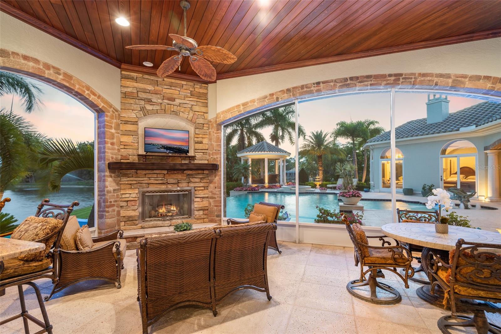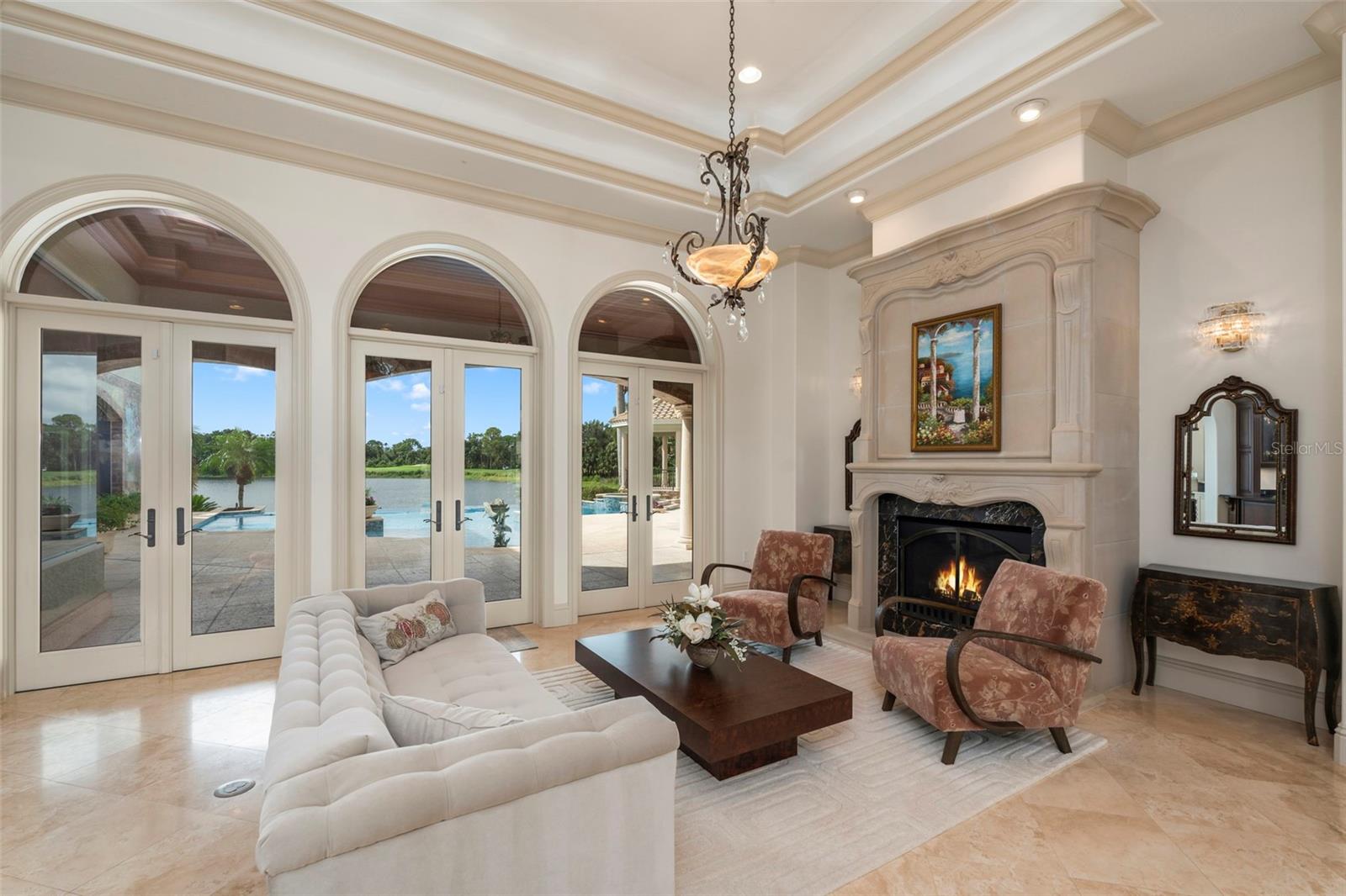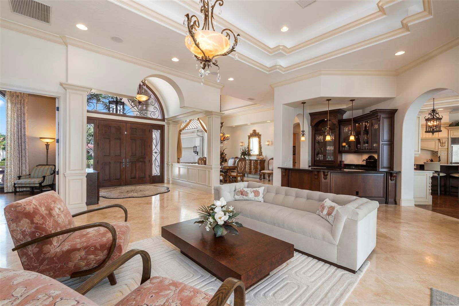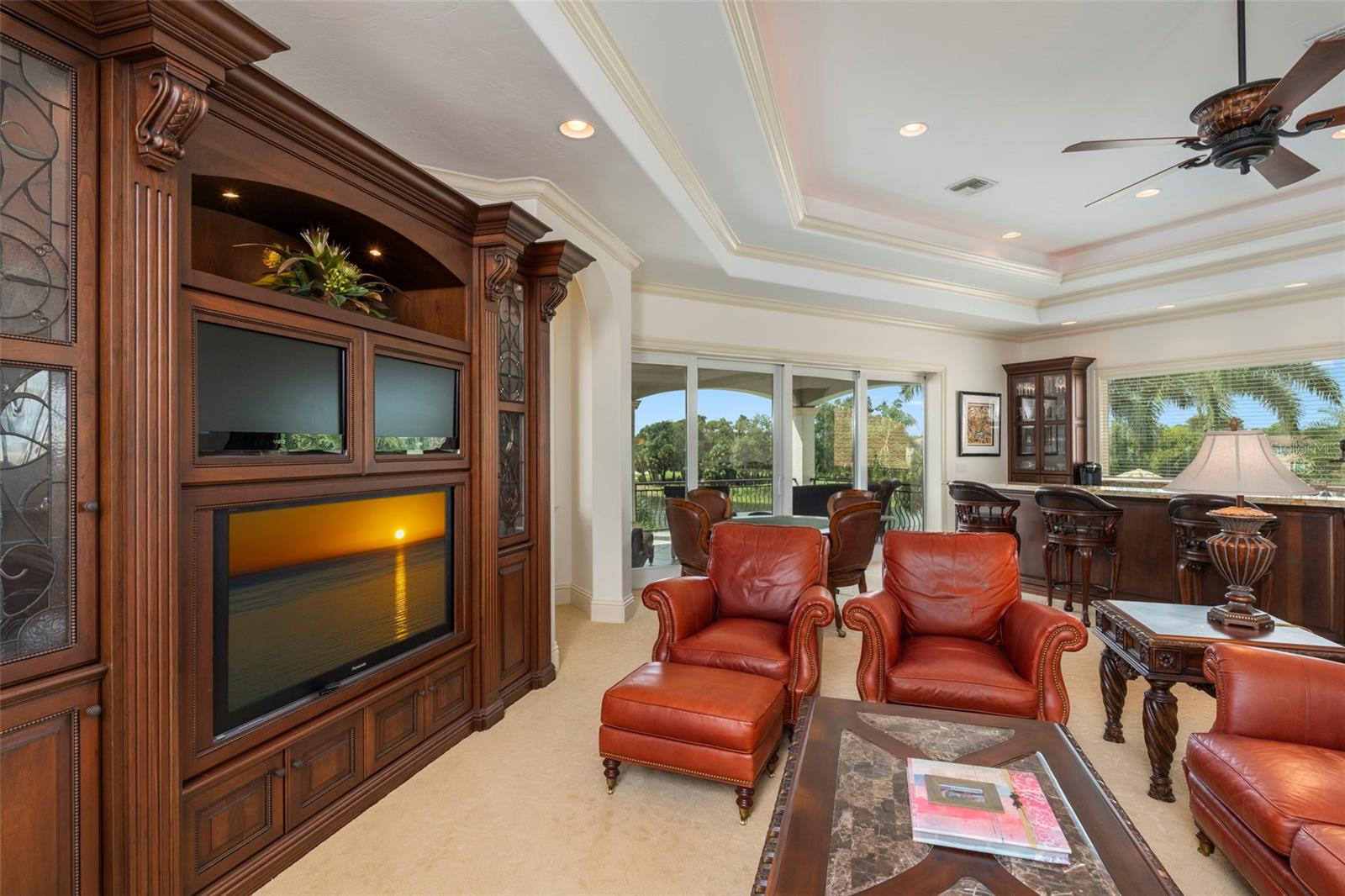 Inside the gates of University Park Country Club in the coveted enclave of Knightsbridge, this notable residence pairs timeless architecture with thoughtful modern UPDATES. Set on acre and the largest lakefront lot in the Park, the home enjoys complete privacy with sweeping water views and backdrop of the golf course in the distance. Built by one of Sarasota's premier builders, the home is distinguished by an open-air infinity pool and spa (RE-SURFACED AND NEW TILE), fountains, a detached gazebo, and landscaping groomed to the hilt. The interior with travertine and walnut-plank flooring and custom millwork throughout is a testament of the finest craftsmanship. The everlasting finishes are enhanced with freshly painted walls, updated window treatments and other refinements throughout. The chef's kitchen is a true centerpiece, recently enhanced with new quartz countertops. Custom cabinetry, a Butler's Pantry and premium appliances include a six-burner Wolf range, separate wall oven, two Sub-Zero refrigerators, three dishwashers, and a built-in Miele coffee bar--ideal for entertaining on any scale. For those who pine for excellence in construction and everlasting elegance - the talent in this craft of fine carpentry has become more precious with time. The first-floor primary suite features custom closets, updated lighting and electronic shades, a dramatic fireplace, Anderson doors to the pool, and access to a private courtyard. Second level, accessed by ELEVATOR or a grand staircase, you'll find a theater room for 8, a large bonus room with built-in media wall, full bar, sumptuous guest suite and a covered terrace. Additional highlights include a side entry 4-CAR AIR CONDITIONED GARAGE plus golf cart bay and a separate air-conditioned storage room. A whole house GENERATOR, water filtration and RO, smart lighting system, newer aluminum fencing to secure the entire rear side boundary lines, screened and full outdoor kitchen with stone fireplace, and updated audio system. This is resort-style living in one of Sarasota's premier gated country club settings that continues to enjoy a reputation of the finest (optional) golf, tennis and racquet sports around. Social mixes and club dining is part of the lifestyle. Appreciate the unequivocal convenience to University Park's shopping mecca nearby, fine dining, SRQ International Airport and downtown Sarasota just a short 20 minute drive.