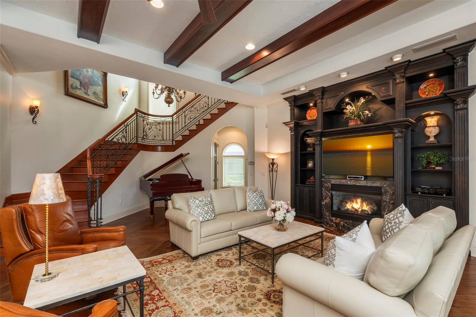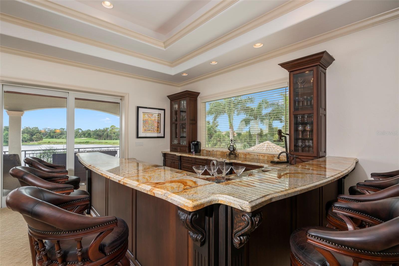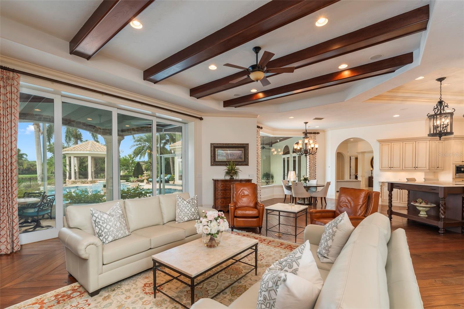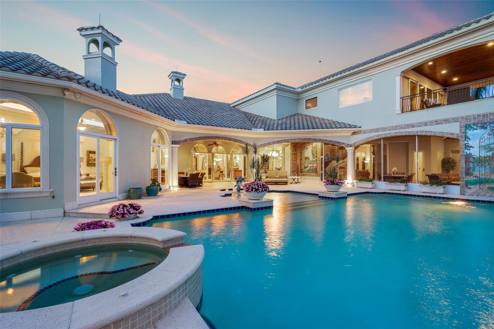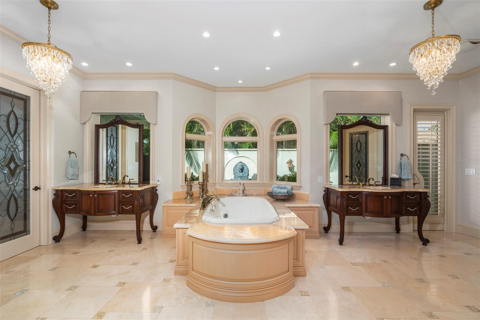 Inside the gates of University Park Country Club in the coveted enclave of Knightsbridge, this notable residence pairs timeless architecture with thoughtful modern UPDATES. Set on acre and the largest lakefront lot in the Park, the home enjoys complete privacy with sweeping water views and backdrop of the golf course in the distance. Built by one of Sarasota's premier builders, the home is distinguished by an open-air infinity pool and spa (RE-SURFACED AND NEW TILE), fountains, a detached gazebo, and landscaping groomed to the hilt. The interior with travertine and walnut-plank flooring and custom millwork throughout is a testament of the finest craftsmanship. The everlasting finishes are enhanced with freshly painted walls, updated window treatments and other refinements throughout. The chef's kitchen is a true centerpiece, recently enhanced with new quartz countertops. Custom cabinetry, a Butler's Pantry and premium appliances include a six-burner Wolf range, separate wall oven, two Sub-Zero refrigerators, three dishwashers, and a built-in Miele coffee bar--ideal for entertaining on any scale. For those who pine for excellence in construction and everlasting elegance - the talent in this craft of fine carpentry has become more precious with time. The first-floor primary suite features custom closets, updated lighting and electronic shades, a dramatic fireplace, Anderson doors to the pool, and access to a private courtyard. Second level, accessed by ELEVATOR or a grand staircase, you'll find a theater room for 8, a large bonus room with built-in media wall, full bar, sumptuous guest suite and a covered terrace. Additional highlights include a side entry 4-CAR AIR CONDITIONED GARAGE plus golf cart bay and a separate air-conditioned storage room. A whole house GENERATOR, water filtration and RO, smart lighting system, newer aluminum fencing to secure the entire rear side boundary lines, screened and full outdoor kitchen with stone fireplace, and updated audio system. This is resort-style living in one of Sarasota's premier gated country club settings that continues to enjoy a reputation of the finest (optional) golf, tennis and racquet sports around. Social mixes and club dining is part of the lifestyle. Appreciate the unequivocal convenience to University Park's shopping mecca nearby, fine dining, SRQ International Airport and downtown Sarasota just a short 20 minute drive.