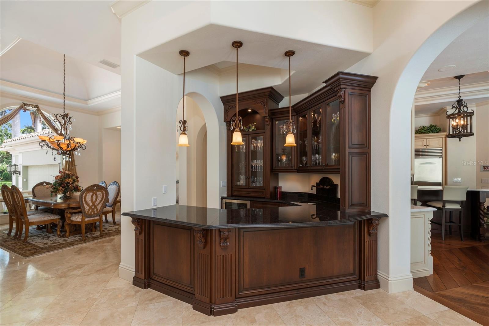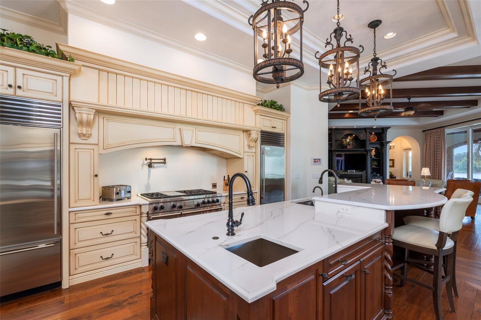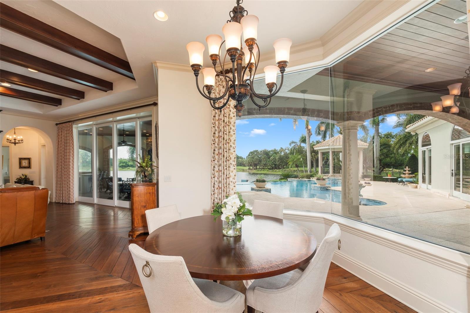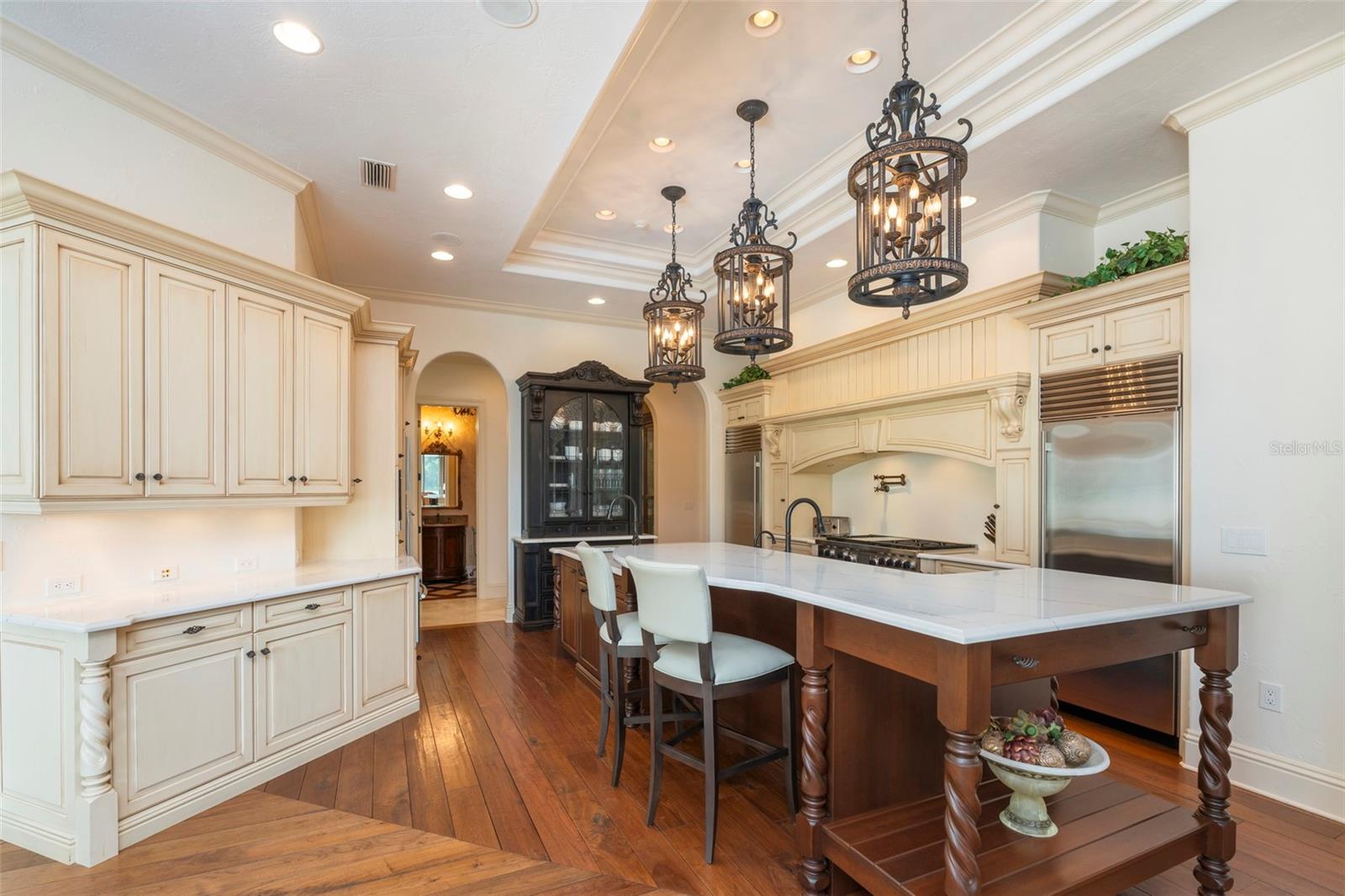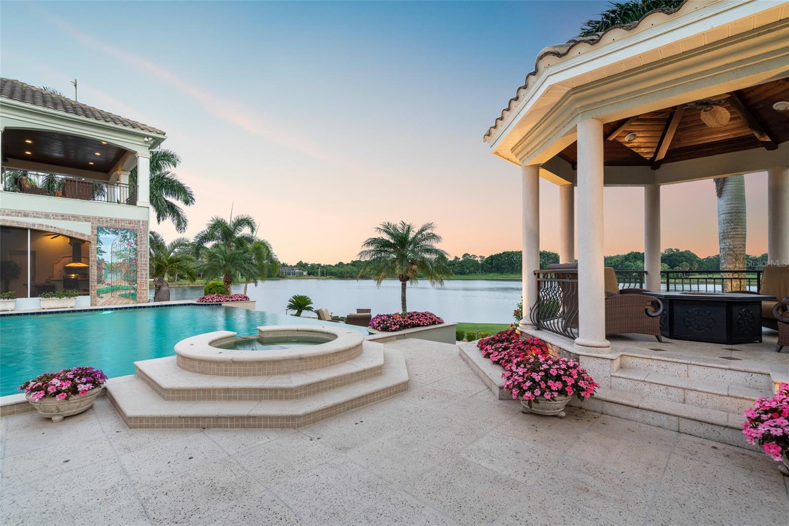 Inside the gates of University Park Country Club in the coveted enclave of Knightsbridge, this notable residence pairs timeless architecture with thoughtful modern UPDATES. Set on acre and the largest lakefront lot in the Park, the home enjoys complete privacy with sweeping water views and backdrop of the golf course in the distance. Built by one of Sarasota's premier builders, the home is distinguished by an open-air infinity pool and spa (RE-SURFACED AND NEW TILE), fountains, a detached gazebo, and landscaping groomed to the hilt. The interior with travertine and walnut-plank flooring and custom millwork throughout is a testament of the finest craftsmanship. The everlasting finishes are enhanced with freshly painted walls, updated window treatments and other refinements throughout. The chef's kitchen is a true centerpiece, recently enhanced with new quartz countertops. Custom cabinetry, a Butler's Pantry and premium appliances include a six-burner Wolf range, separate wall oven, two Sub-Zero refrigerators, three dishwashers, and a built-in Miele coffee bar--ideal for entertaining on any scale. For those who pine for excellence in construction and everlasting elegance - the talent in this craft of fine carpentry has become more precious with time. The first-floor primary suite features custom closets, updated lighting and electronic shades, a dramatic fireplace, Anderson doors to the pool, and access to a private courtyard. Second level, accessed by ELEVATOR or a grand staircase, you'll find a theater room for 8, a large bonus room with built-in media wall, full bar, sumptuous guest suite and a covered terrace. Additional highlights include a side entry 4-CAR AIR CONDITIONED GARAGE plus golf cart bay and a separate air-conditioned storage room. A whole house GENERATOR, water filtration and RO, smart lighting system, newer aluminum fencing to secure the entire rear side boundary lines, screened and full outdoor kitchen with stone fireplace, and updated audio system. This is resort-style living in one of Sarasota's premier gated country club settings that continues to enjoy a reputation of the finest (optional) golf, tennis and racquet sports around. Social mixes and club dining is part of the lifestyle. Appreciate the unequivocal convenience to University Park's shopping mecca nearby, fine dining, SRQ International Airport and downtown Sarasota just a short 20 minute drive.