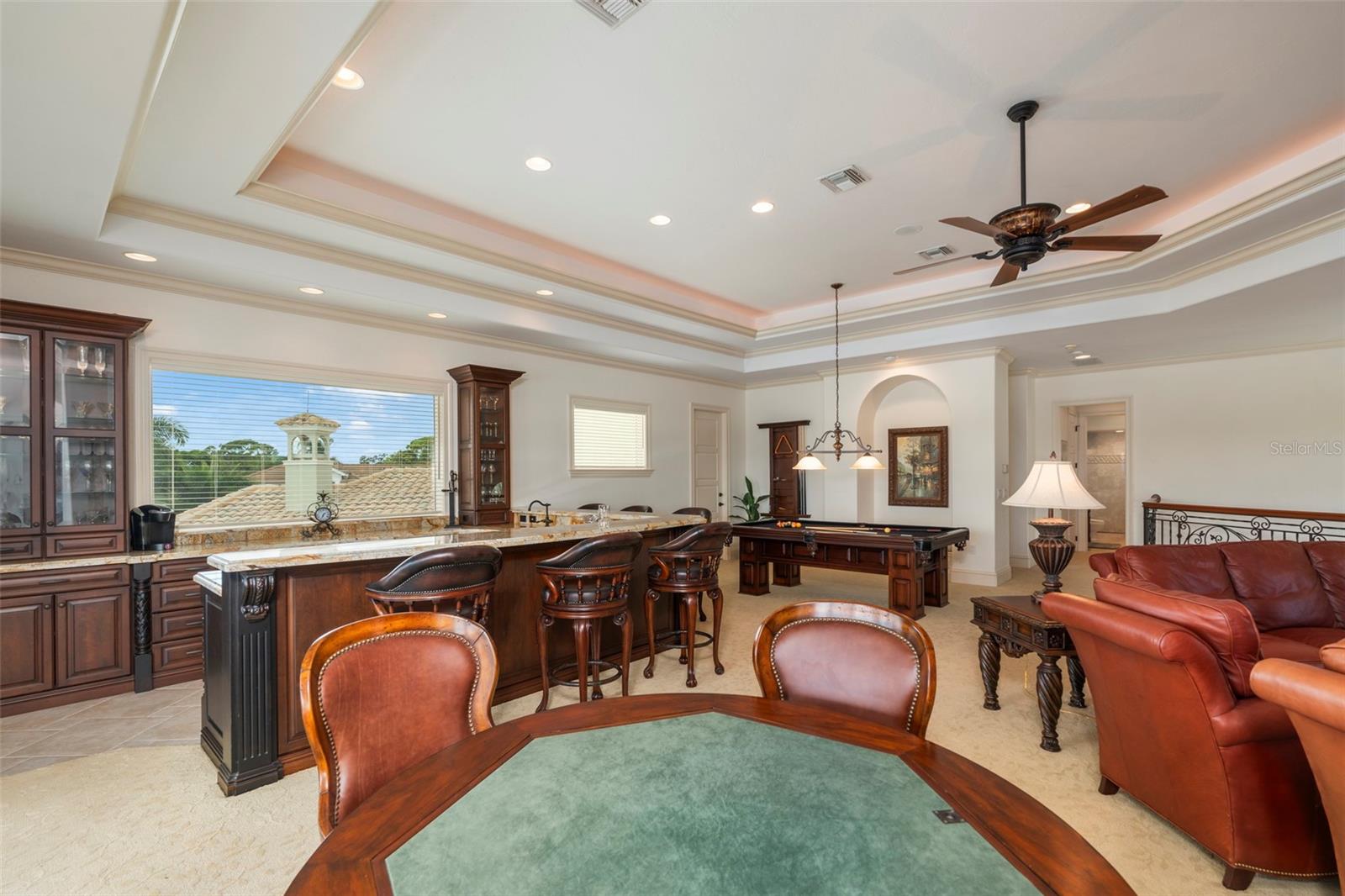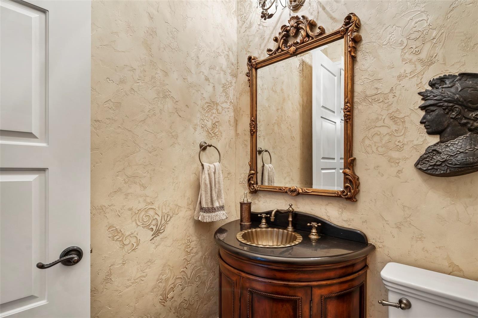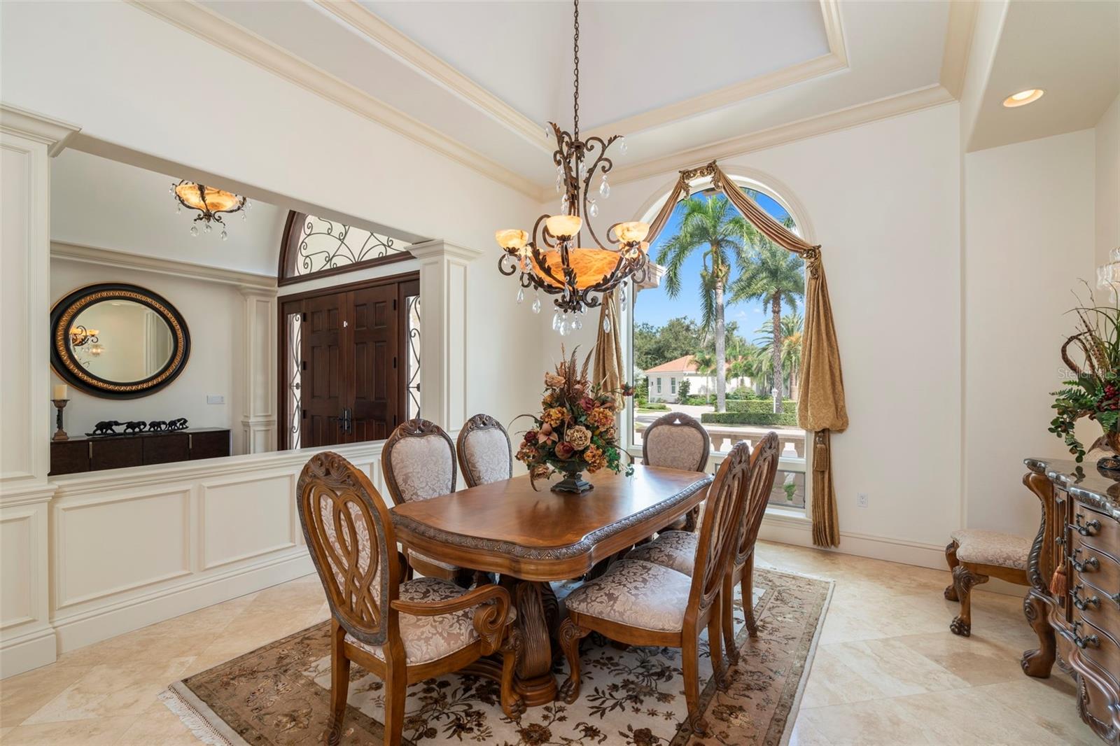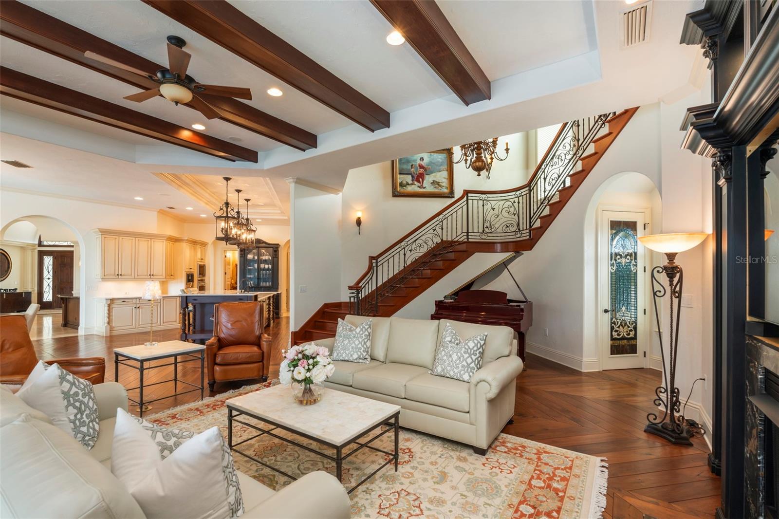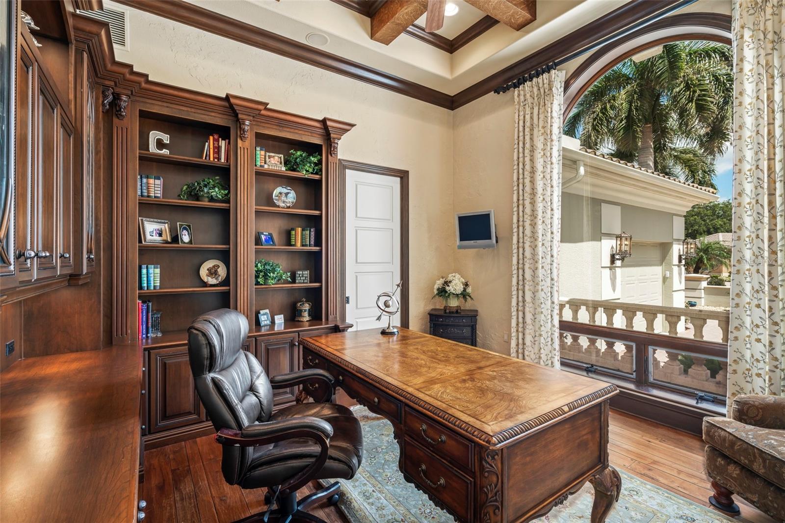 Inside the gates of University Park Country Club in the coveted enclave of Knightsbridge, this notable residence pairs timeless architecture with thoughtful modern UPDATES. Set on acre and the largest lakefront lot in the Park, the home enjoys complete privacy with sweeping water views and backdrop of the golf course in the distance. Built by one of Sarasota's premier builders, the home is distinguished by an open-air infinity pool and spa (RE-SURFACED AND NEW TILE), fountains, a detached gazebo, and landscaping groomed to the hilt. The interior with travertine and walnut-plank flooring and custom millwork throughout is a testament of the finest craftsmanship. The everlasting finishes are enhanced with freshly painted walls, updated window treatments and other refinements throughout. The chef's kitchen is a true centerpiece, recently enhanced with new quartz countertops. Custom cabinetry, a Butler's Pantry and premium appliances include a six-burner Wolf range, separate wall oven, two Sub-Zero refrigerators, three dishwashers, and a built-in Miele coffee bar--ideal for entertaining on any scale. For those who pine for excellence in construction and everlasting elegance - the talent in this craft of fine carpentry has become more precious with time. The first-floor primary suite features custom closets, updated lighting and electronic shades, a dramatic fireplace, Anderson doors to the pool, and access to a private courtyard. Second level, accessed by ELEVATOR or a grand staircase, you'll find a theater room for 8, a large bonus room with built-in media wall, full bar, sumptuous guest suite and a covered terrace. Additional highlights include a side entry 4-CAR AIR CONDITIONED GARAGE plus golf cart bay and a separate air-conditioned storage room. A whole house GENERATOR, water filtration and RO, smart lighting system, newer aluminum fencing to secure the entire rear side boundary lines, screened and full outdoor kitchen with stone fireplace, and updated audio system. This is resort-style living in one of Sarasota's premier gated country club settings that continues to enjoy a reputation of the finest (optional) golf, tennis and racquet sports around. Social mixes and club dining is part of the lifestyle. Appreciate the unequivocal convenience to University Park's shopping mecca nearby, fine dining, SRQ International Airport and downtown Sarasota just a short 20 minute drive.