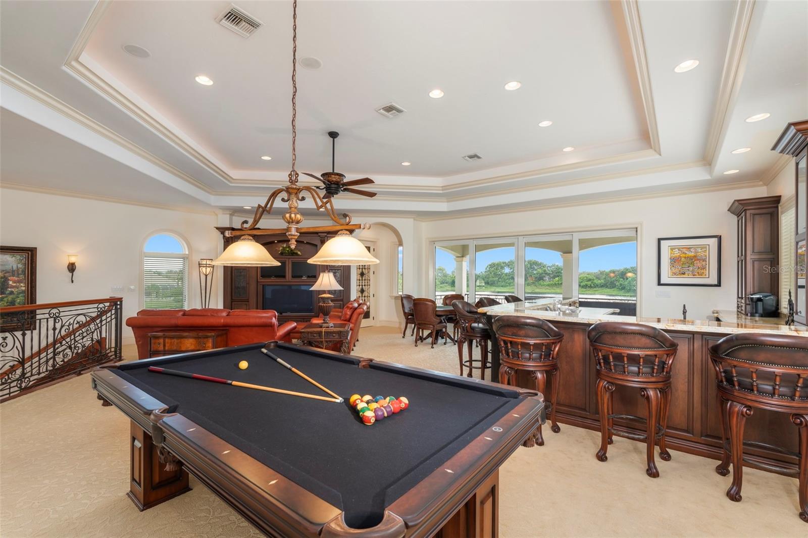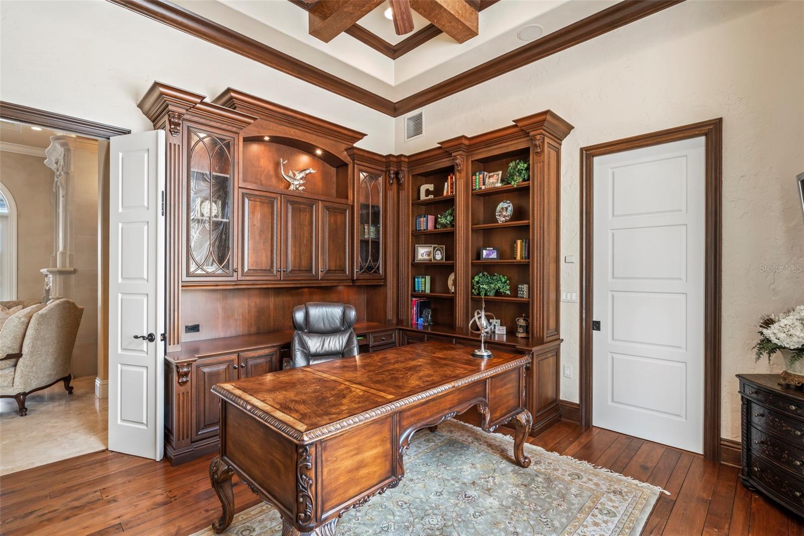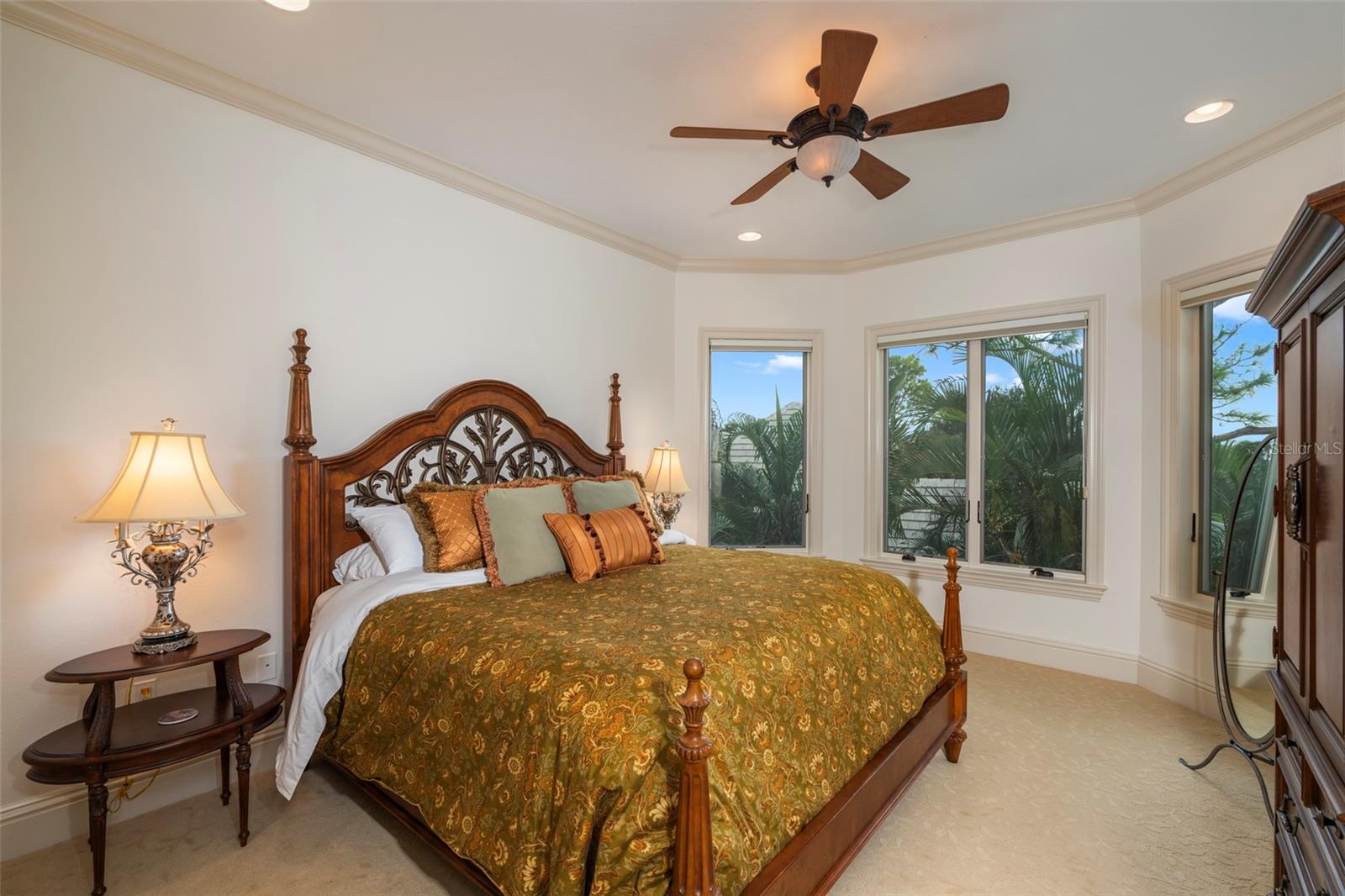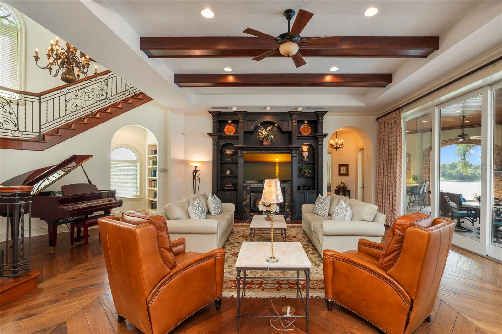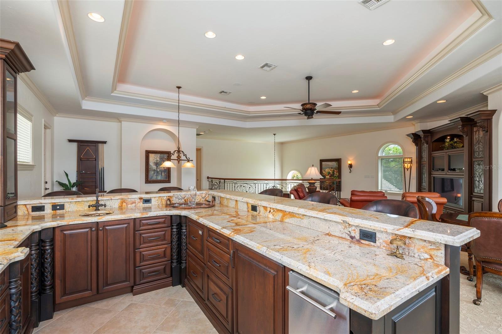 Inside the gates of University Park Country Club in the coveted enclave of Knightsbridge, this notable residence pairs timeless architecture with thoughtful modern UPDATES. Set on acre and the largest lakefront lot in the Park, the home enjoys complete privacy with sweeping water views and backdrop of the golf course in the distance. Built by one of Sarasota's premier builders, the home is distinguished by an open-air infinity pool and spa (RE-SURFACED AND NEW TILE), fountains, a detached gazebo, and landscaping groomed to the hilt. The interior with travertine and walnut-plank flooring and custom millwork throughout is a testament of the finest craftsmanship. The everlasting finishes are enhanced with freshly painted walls, updated window treatments and other refinements throughout. The chef's kitchen is a true centerpiece, recently enhanced with new quartz countertops. Custom cabinetry, a Butler's Pantry and premium appliances include a six-burner Wolf range, separate wall oven, two Sub-Zero refrigerators, three dishwashers, and a built-in Miele coffee bar--ideal for entertaining on any scale. For those who pine for excellence in construction and everlasting elegance - the talent in this craft of fine carpentry has become more precious with time. The first-floor primary suite features custom closets, updated lighting and electronic shades, a dramatic fireplace, Anderson doors to the pool, and access to a private courtyard. Second level, accessed by ELEVATOR or a grand staircase, you'll find a theater room for 8, a large bonus room with built-in media wall, full bar, sumptuous guest suite and a covered terrace. Additional highlights include a side entry 4-CAR AIR CONDITIONED GARAGE plus golf cart bay and a separate air-conditioned storage room. A whole house GENERATOR, water filtration and RO, smart lighting system, newer aluminum fencing to secure the entire rear side boundary lines, screened and full outdoor kitchen with stone fireplace, and updated audio system. This is resort-style living in one of Sarasota's premier gated country club settings that continues to enjoy a reputation of the finest (optional) golf, tennis and racquet sports around. Social mixes and club dining is part of the lifestyle. Appreciate the unequivocal convenience to University Park's shopping mecca nearby, fine dining, SRQ International Airport and downtown Sarasota just a short 20 minute drive.