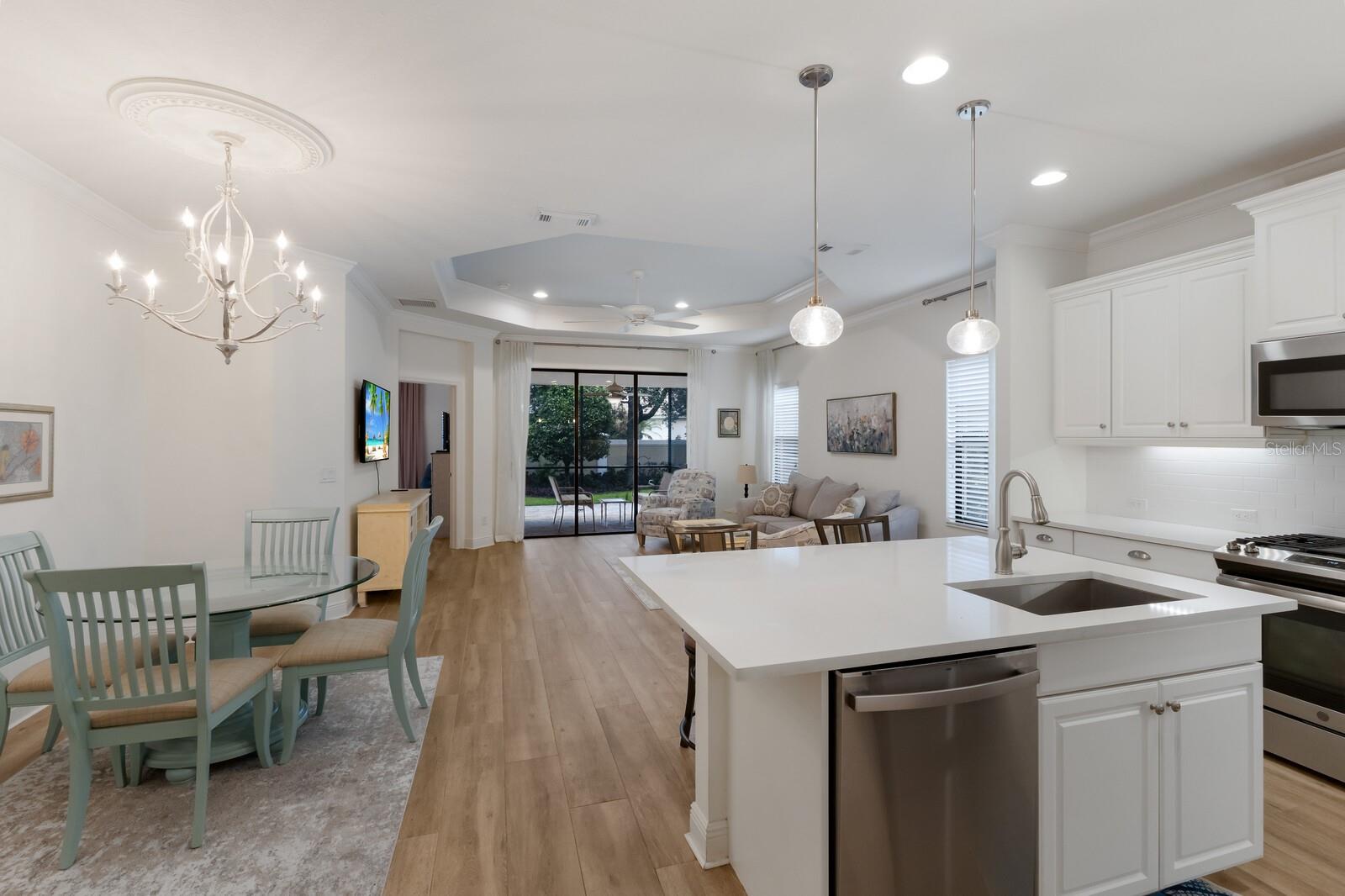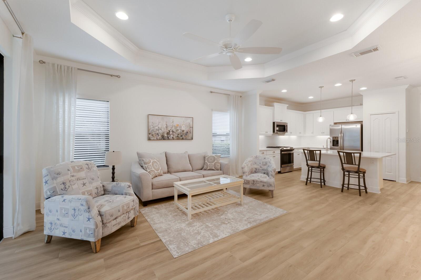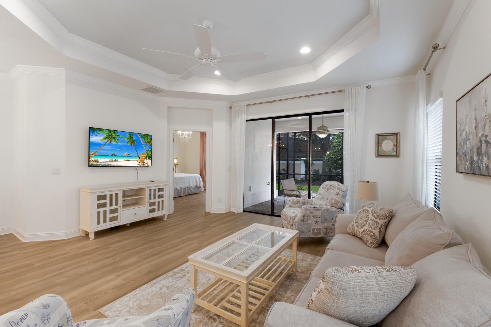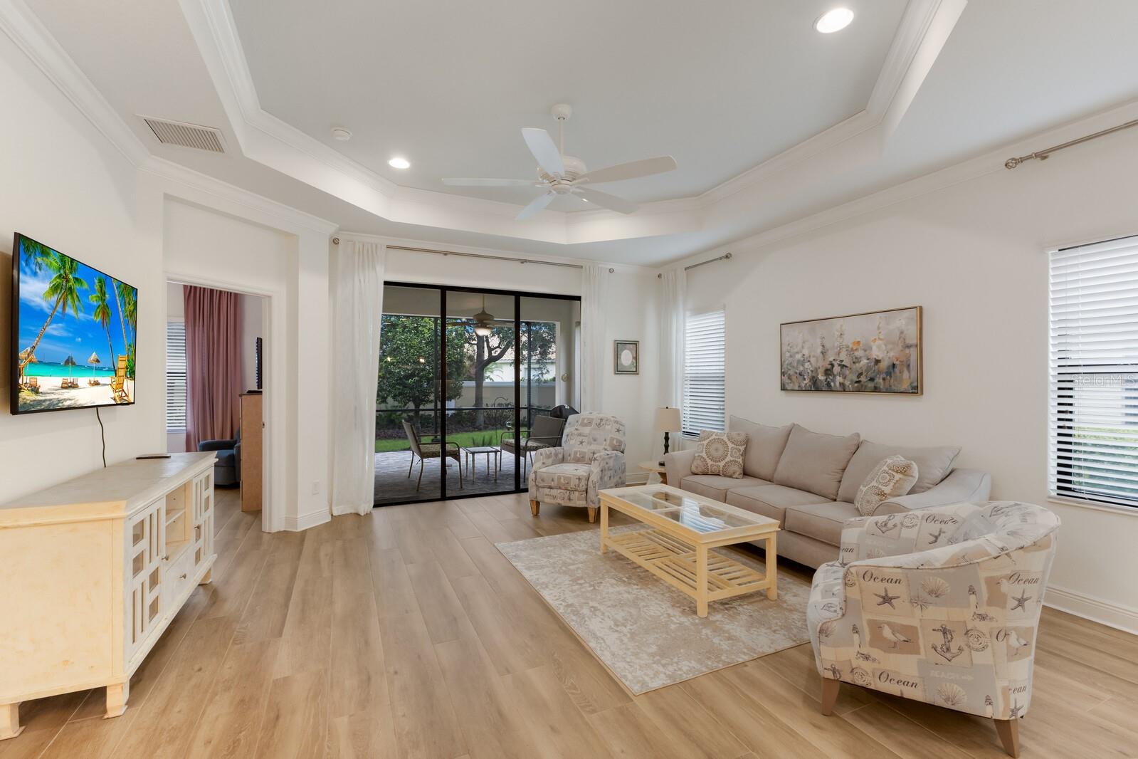 The Art Of Florida Living - Found In Villa Amalfi! Welcome home to this beautiful 2/2 + DEN, Tidewater model where style, comfort, and functionality come together in perfect harmony. Designed with an open-concept floorplan, this villa is ideal for both everyday living & entertaining! You'll fall in love with the beautifully equipped kitchen with extended island, quartz countertops & stainless appliances with gas range. Just to the left there is a charming dining nook perfectly positioned, creating a warm space for memorable meals. Flowing seamlessly from the kitchen, the great room impresses with a tray ceiling & a wall of glass sliders that bring the natural beauty of the outdoors in. The Primary suite boasts an en-suite bath with dual quartz vanities, a large walk-in closet and 2 closets (1 being a walk-in). Just off the foyer, French doors open to a versatile space perfect for a home office or a cozy media room. A thoughtfully designed split plan allows guests to enjoy their privacy in the 2nd bedroom and bath. Beyond the living spaces lies the home's true highlight... A spacious extended lanai, adorned with stunning tile work. It is perfect for lounging in the FL sun or enjoying a glass of wine as evening falls. An added brick patio offers a great grilling spot to dine al fresco and there is a gas hook-up for convenience outdoors as well! Other notable features not to be missed include: High-end plank (wood look) tile flooring throughout, crown moldings, an upgraded laundry, a new screen enclosure at the front entry and a new accordion hurricane shutter on the back sliders for added piece of mind. A two-car garage, paver drive & lush tropical landscape complete this picture-perfect retreat! Living is easy in this gated & pet friendly Neal community, which offers its residents a relaxing community pool/spa, covered cabanas & outdoor kitchen. There are NO CDD's and the lower HOA fee includes all exterior maintenance and reserves for new roofs as well! It is in a prime location near SRQ Airport, I-75, downtown SRQ and the University corridor which offers amazing dining, endless shopping, convenient healthcare, golf options and a short drive to our award-winning area beaches. Added BONUS... This home could be yours FURNISHED! Come take a look!