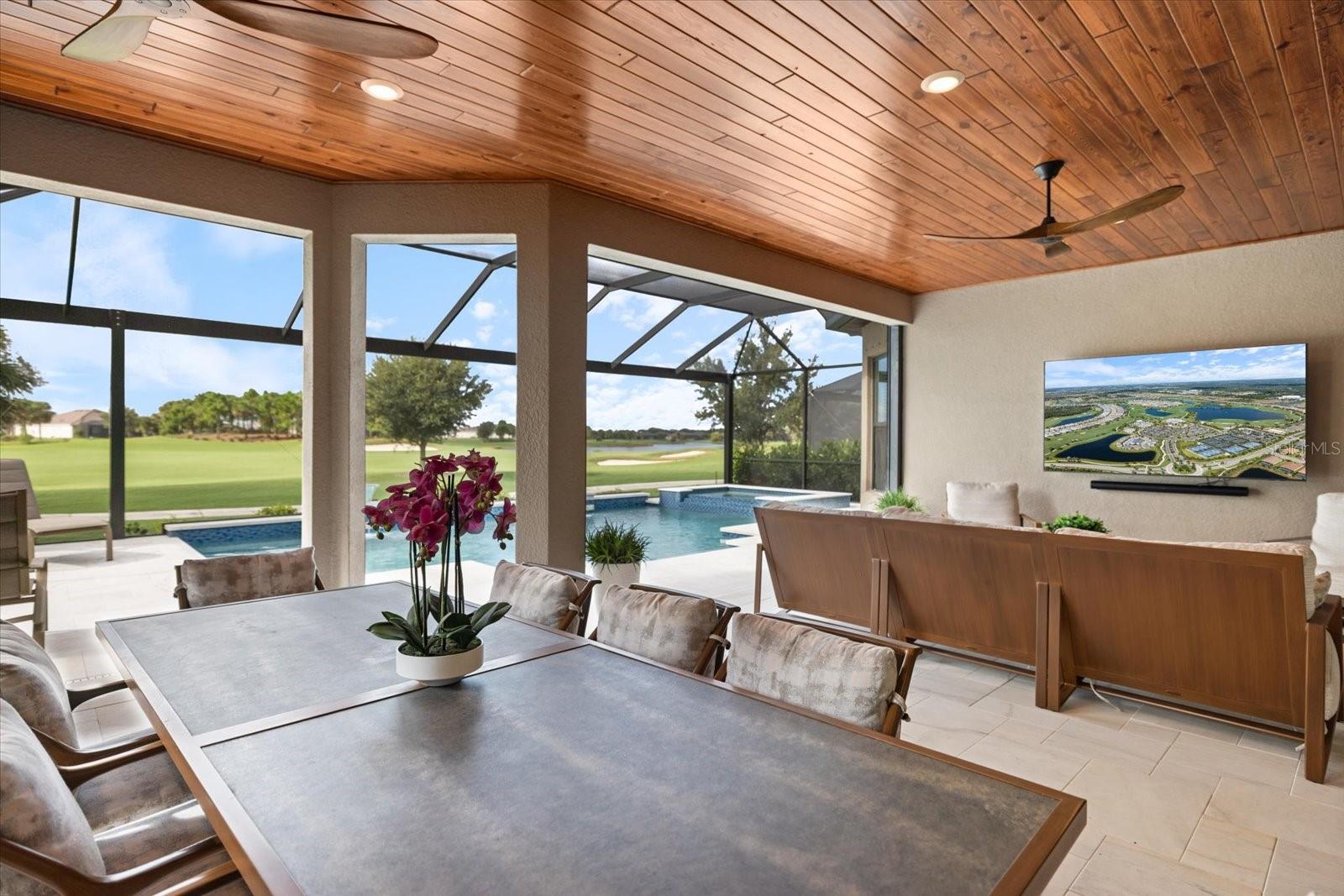 Discover an unparalleled lifestyle with this exceptional home, complete with deeded golf membership, located in the highly coveted Esplanade at Azario community in Lakewood Ranch, Florida, with a Southern exposure and breathtaking sunsets! This exquisite single-family residence encompasses 3,101 square feet of meticulously crafted living space, featuring 3 bedrooms, 3 baths, a den, and additional tandem space in the garage. Positioned on the 2nd fairway, this home offers direct access to world-class golfing at your convenience.Architectural elegance meets modern luxury in this stunning retreat, perfect for those who value both style and comfort. With over $300,000 in luxury upgrades, this open-concept floor plan is masterfully designed to seamlessly integrate indoor and outdoor living areas. Upon entry, you're welcomed by a spacious living area enhanced with sliding pocket doors that unveil breathtaking views of the golf course and serene water features.The highlight of this home is its expansive outdoor oasis, with professional landscaping and lightiing package, designed for both relaxation and entertainment. This resort-style setting includes a pristine saltwater pool and spa, adorned with elegant glass waterbowls fountains and enclosed by a clearview screen. A custom outdoor kitchen beckons culinary enthusiasts, while a fireplace and luxurious marble decking, complemented by intricate wood ceiling finishes, create a warm and inviting ambiance for gatherings. When the sliding glass doors are fully open, the covered lanai merges with indoor spaces, providing a vast area ideal for hosting guests.Inside, the extended gourmet kitchen stands out with quartz countertops, a prep sink in the island, and a large single-bowl main sink, making it perfect for casual meals and entertaining. The dining room, with its mirror and wood trim walls, exudes sophistication. The primary suite, featuring a bay window sitting area, offers unobstructed golf course views and is complemented by a luxurious bathroom with a large walk-in shower equipped with multiple shower heads, shampoo niches, and a shower bench. The extended vanity includes a drawer bank, quartz countertops, and dual sinks, while the closet boasts custom-built cabinets for ample storage.Beyond luxury, this home is equipped with advanced smart home technology for convenience and peace of mind, including motorized Storm Smart shutters, a blend of high-impact windows and storm panels, and motorized screens. With the remaining builder's warranty, this home is truly move-in ready.The Esplanade at Azario community offers an array of resort-style amenities to enrich your lifestyle. Residents can enjoy a large community pool and hot tub, a clubhouse, and a Bahama Bar for poolside dining. Culinary options include the Culinary Center, Barrel House and Bistro, and the Vine & Olive pizza place. Active lifestyles are supported by facilities for tennis, pickleball, bocce, a well-equipped fitness center, and scenic walking trails. With an onsite activity director orchestrating events for all ages, the community offers vibrant living.Embrace maintenance-free luxury in Lakewood Ranch, where each day feels like a vacation. This home offers the Florida lifestyle you've always envisioned--a perfect blend of sophistication and comfort.