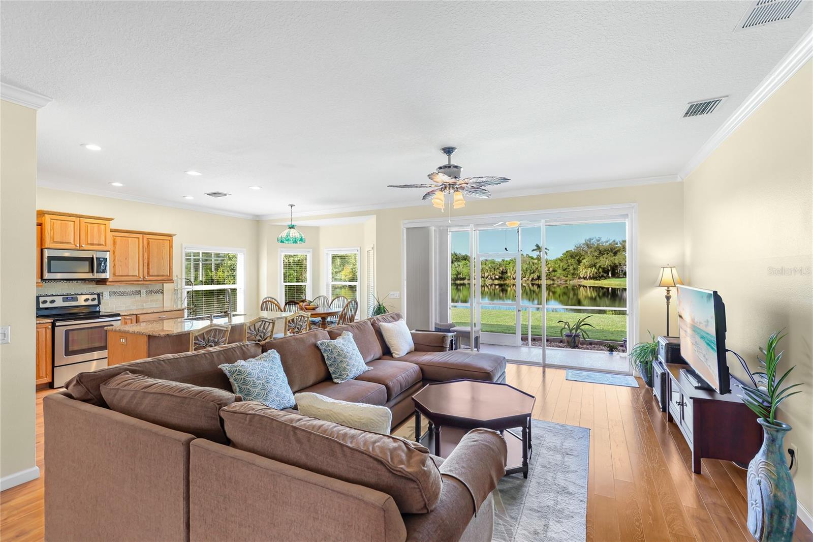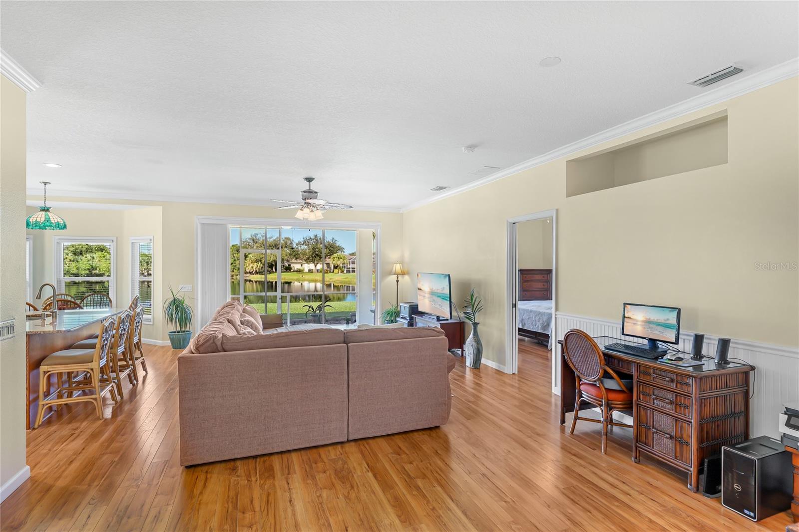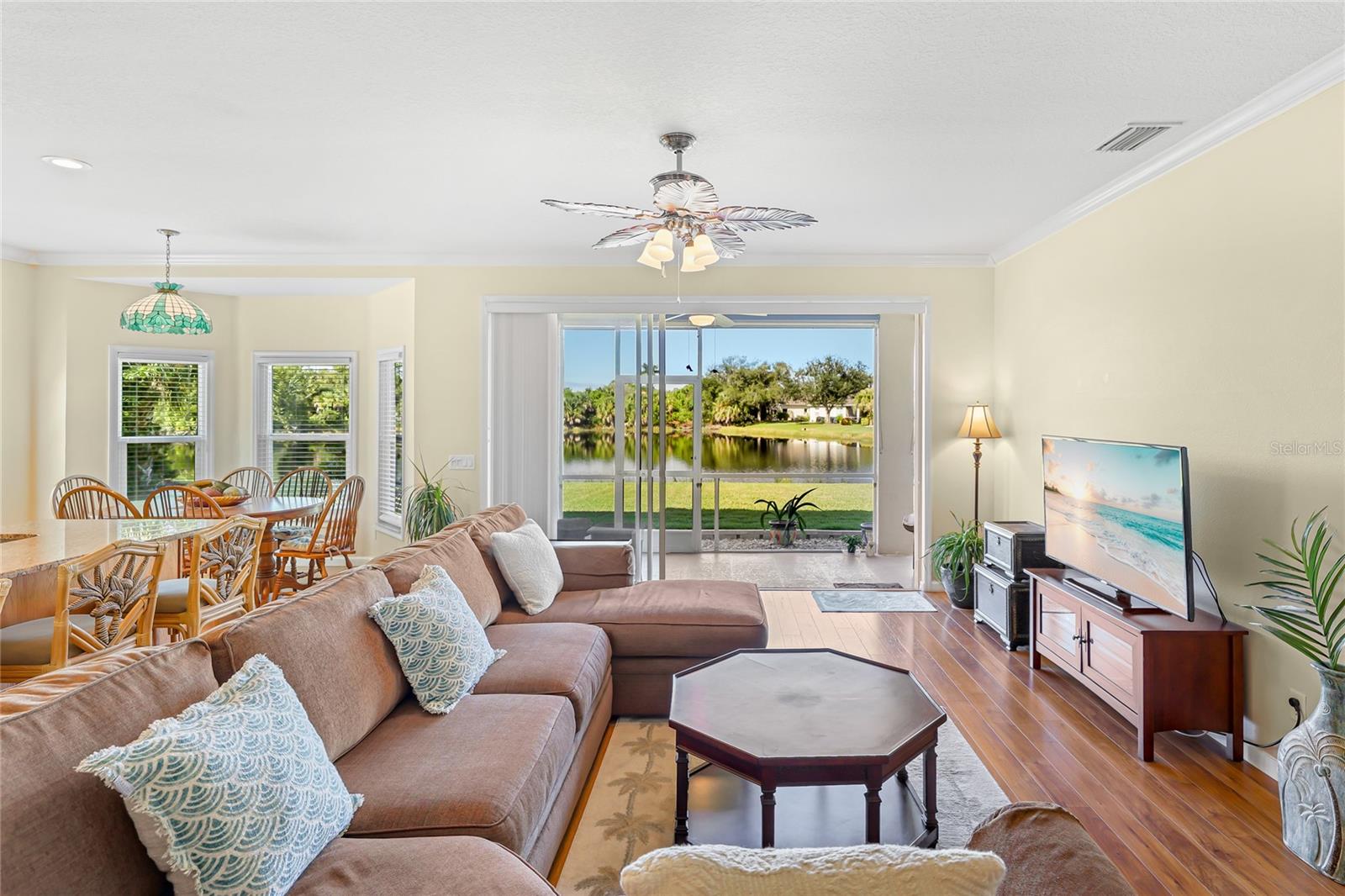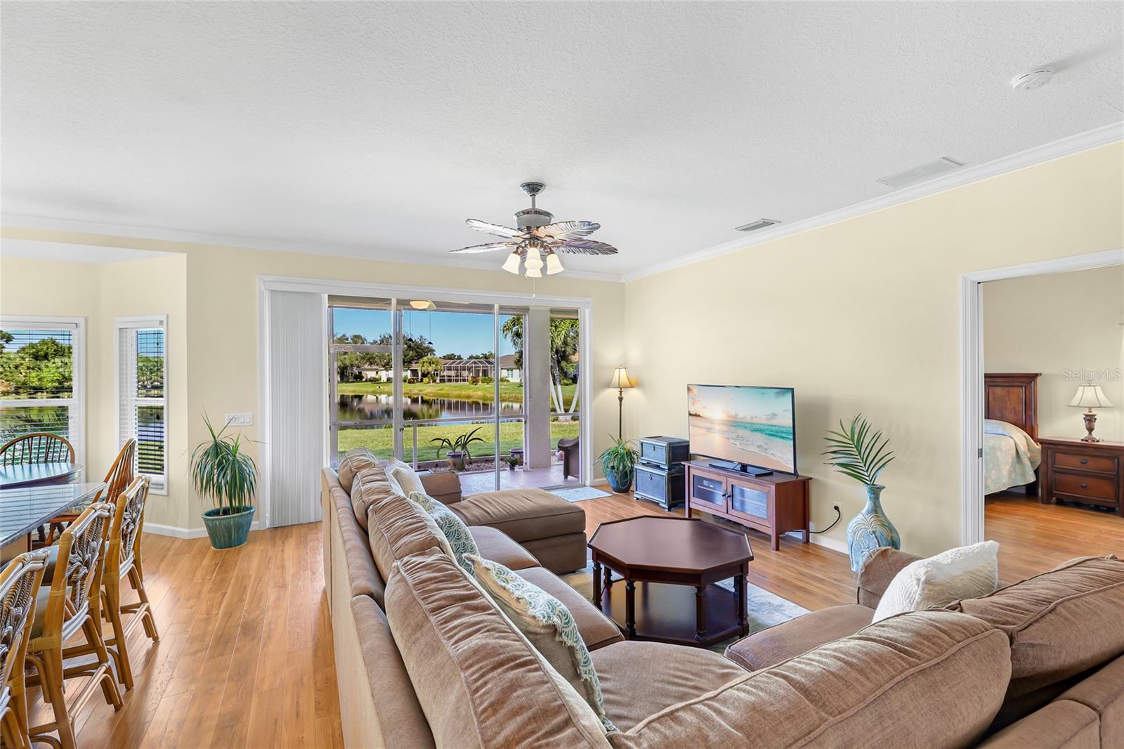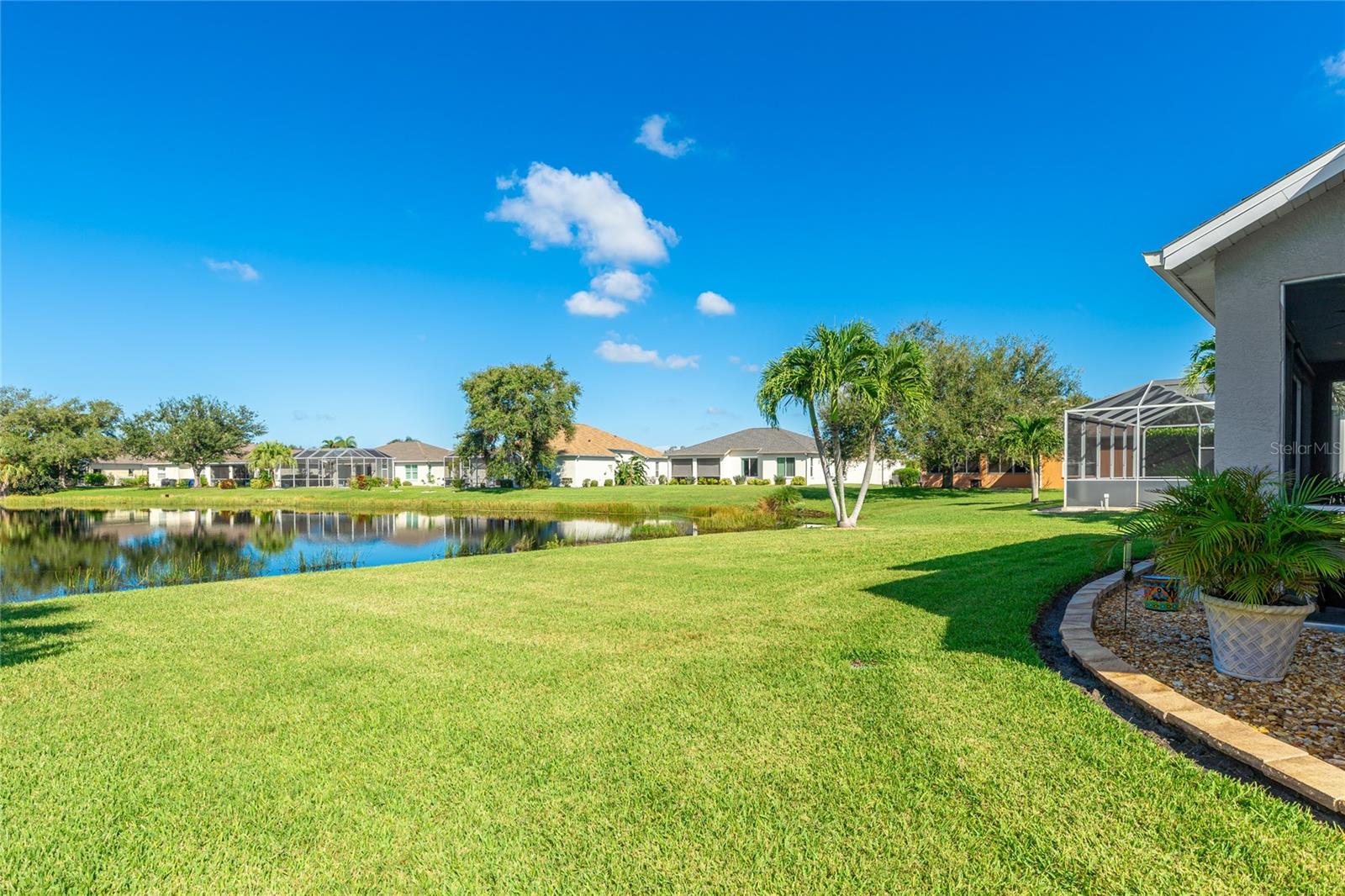 Welcome to this beautifully cared-for home in the desirable Woodmere Lakes community of Venice. Set on a peaceful pond view, this property combines comfort, function, and Florida lifestyle living. From the manicured lawn and landscaping to the screened front porch entry, you'll see the pride of ownership throughout. Inside, the open floor plan with laminate flooring and split-bedroom design offers both style and privacy. The owner's suite is tucked away on its own side of the home, while the guest bedrooms are positioned for convenience with an en-suite and shared bath.At the back of the home, you'll love the west-facing orientation -- perfect for enjoying stunning sunsets. The 28-foot-wide screened lanai is the ideal outdoor retreat, enhanced with retractable sun shades for your comfort year-round.This home has been thoughtfully updated with hurricane-impact windows, an impact garage door, and a whole-home surge protector. Important systems have already been taken care of: roof (2019), AC (2017 with regular maintenance), water heater (2015), re-pipe (2009), plus a new irrigation pump and vent cleanings in 2024. Move in with peace of mind knowing the big-ticket items are done.Perfectly located, you're just minutes from Venice's world-class golf courses and Gulf beaches like Manasota Key, Venice Beach, and Nokomis Beach. Downtown Venice offers charming shops and dining, while the Wellen Park District provides even more restaurants and entertainment. Sarasota Memorial Hospital is nearby for top-rated healthcare. Spend your evenings at the Venice Jetty watching dolphins play and boats cruise by. This home truly delivers the full Florida lifestyle.
