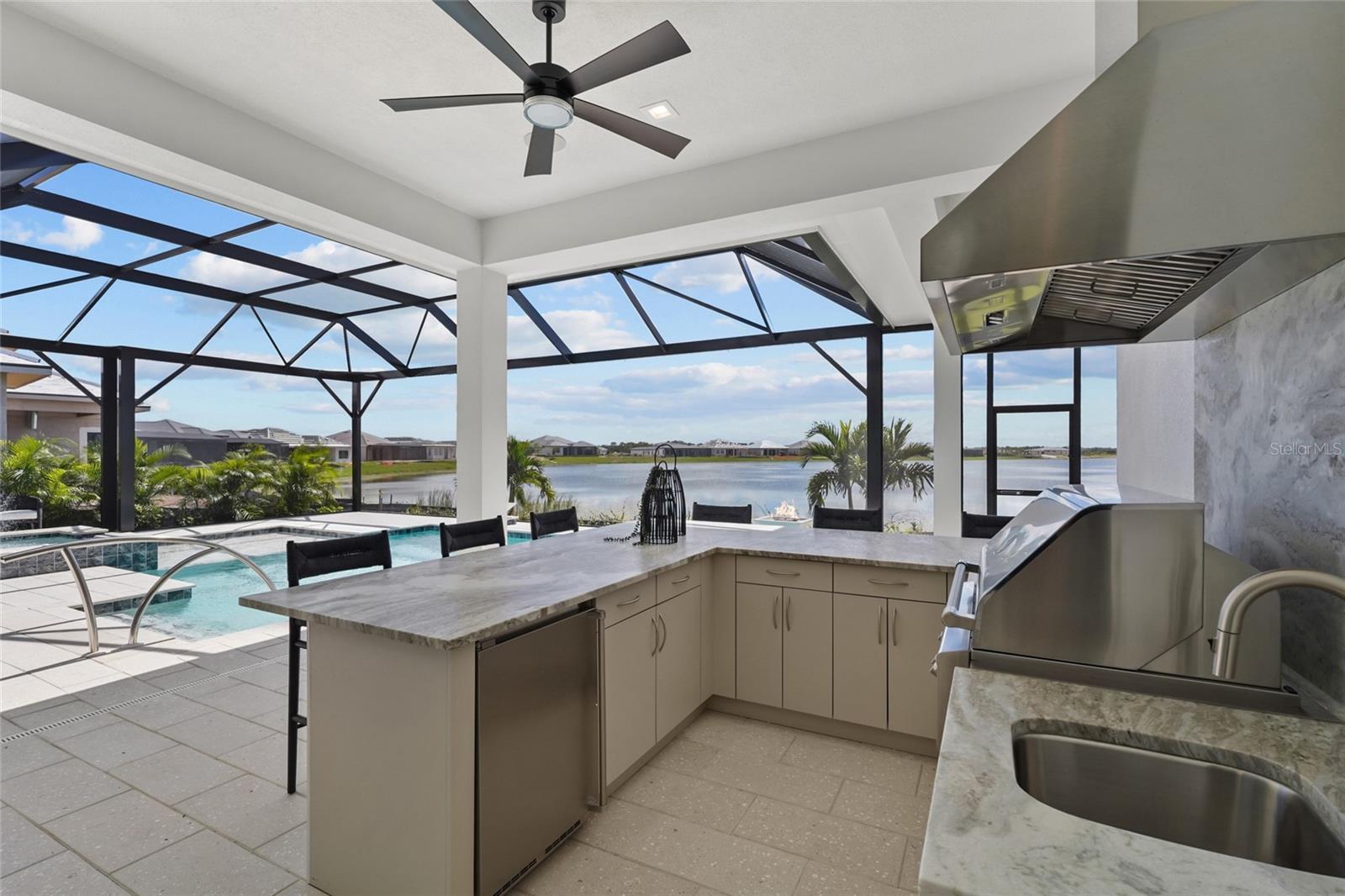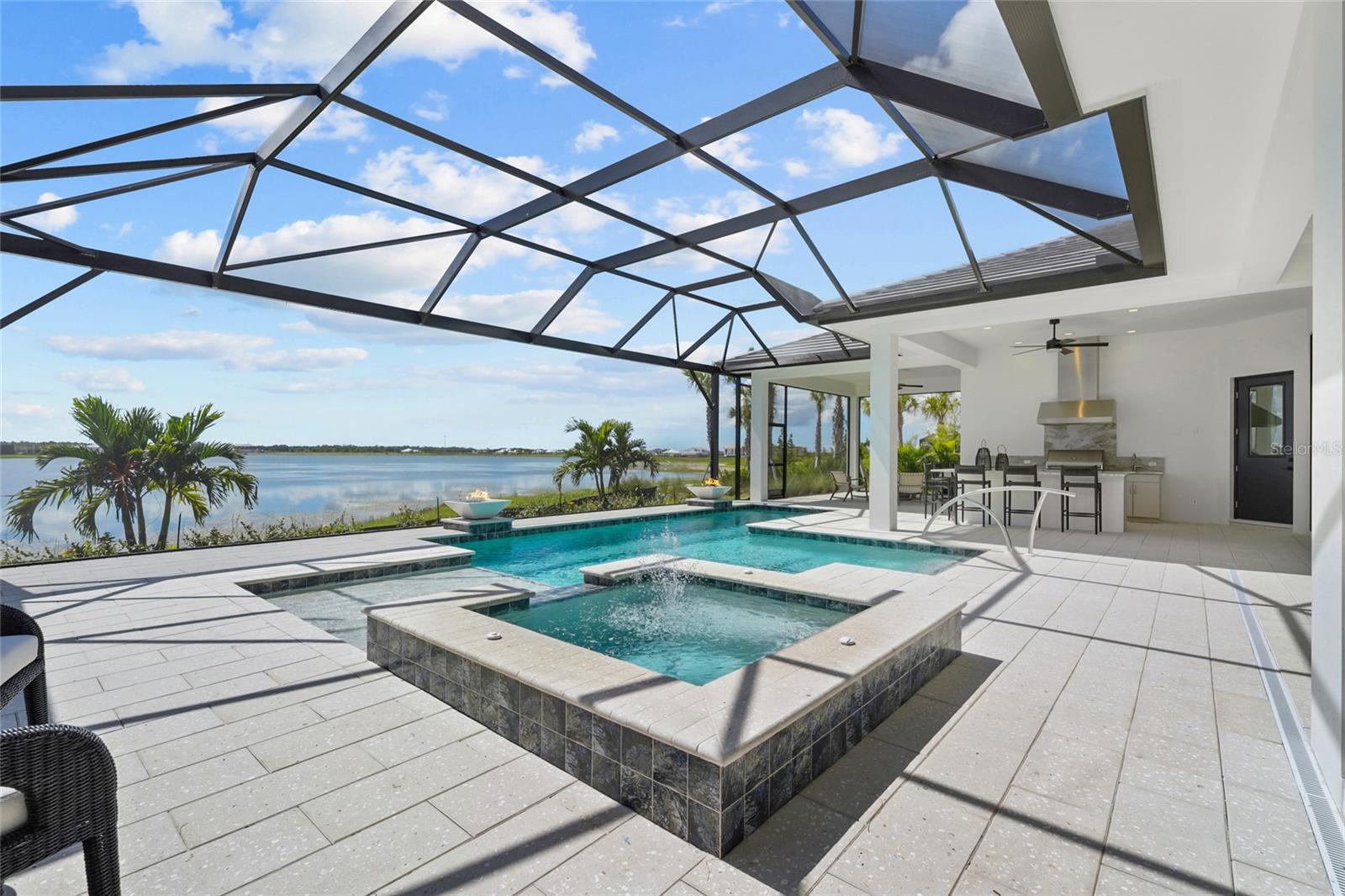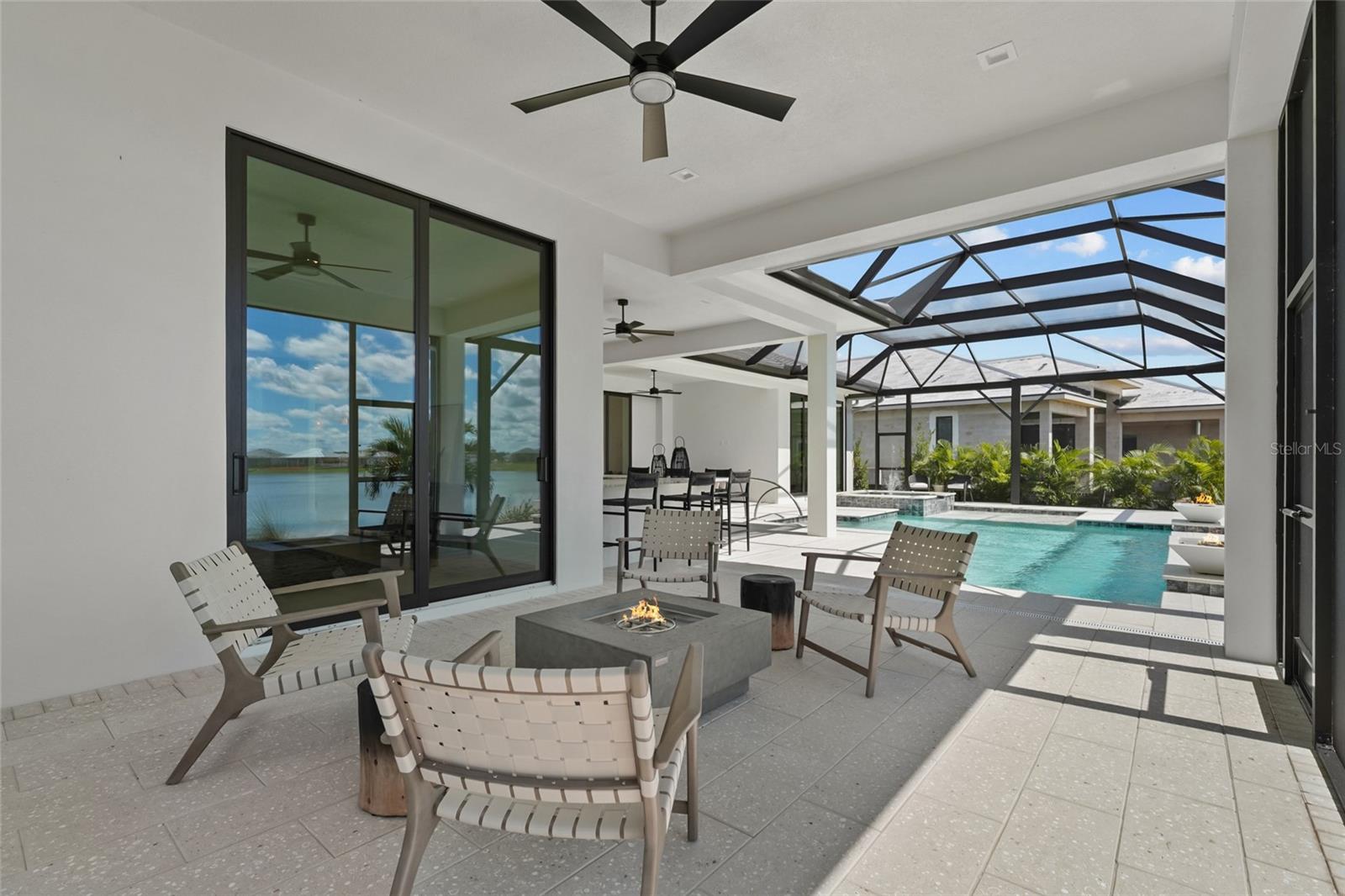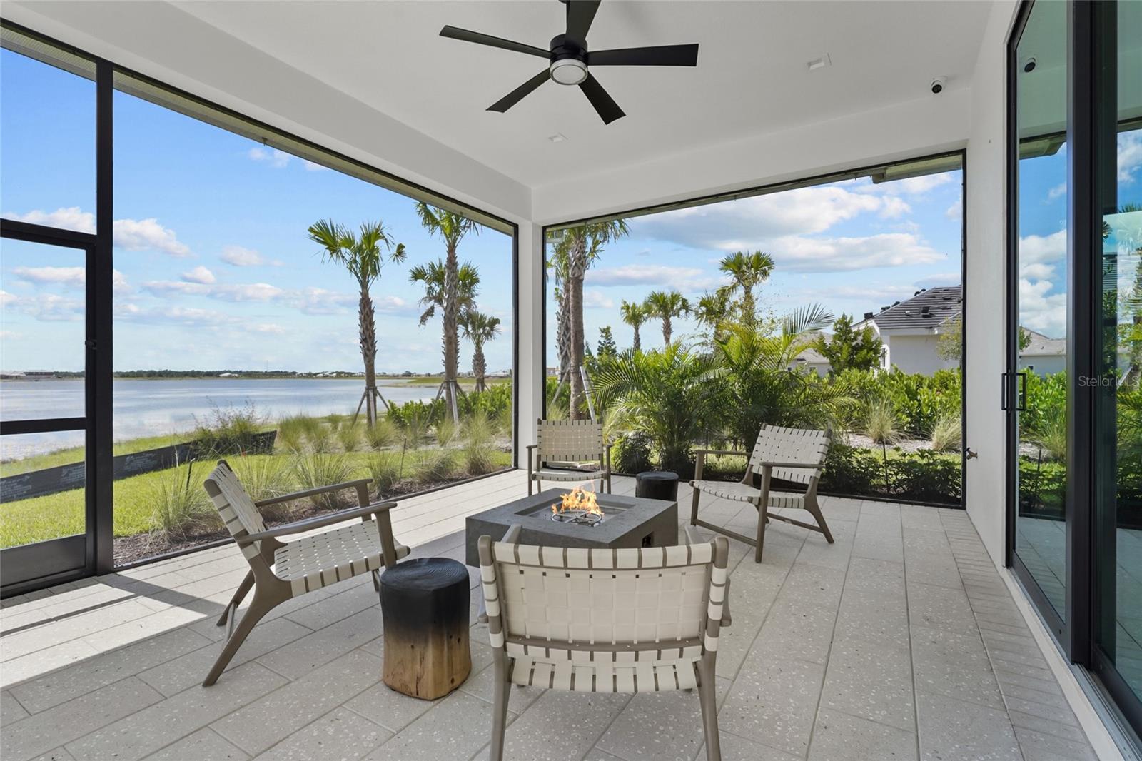 A modern lakefront masterpiece in Wild Blue, this never-lived-in Arthur Rutenberg estate captures the essence of luxury Florida living. Completed in late 2025 and move-in ready, the home offers a rare opportunity to enjoy new construction without the wait. With 5 bedrooms, 5.5 bathrooms, 4,631 square feet, a bonus room, office, and a versatile flex space off the owner's suite, the design blends functionality with elegant entertaining spaces. A highlight of the home is the private multi-generational studio with its own entrance, kitchenette, full bath, and living area, perfect for extended family or long-term guests. From the moment you step inside the pivoting front door with switchable privacy glass, the home makes a statement with soaring ceilings, wide-plank wood floors, and walls of glass framing panoramic water views. The great room is an entertainer's dream, seamlessly connected to the chef's kitchen appointed with quartz counters, custom cabinetry, a Thermador Appliance package (Bosch Dishwasher), expansive walk-in pantry provides abundant storage, prep space, and an additional refrigerator. The open design allows the main living and dining areas to flow together effortlessly, creating a bright and welcoming atmosphere ideal for gathering with friends and family. The owner's retreat is a private sanctuary designed to impress with dual custom walk-in closets by Closet Envy, and a private exercise room with durable slip-resistant flooring for your personal wellness routine. Relax in the spa-inspired ensuite featuring a freestanding soaking tub and an expansive Roman shower with triple shower heads and designer tile. Each additional bedroom is paired with its own ensuite bath, ensuring privacy and comfort for family or guests. The outdoor living experience is truly exceptional. A custom pool and spa with cascading fountains, fire bowls, and LED lighting sets the stage for relaxation or entertainment, while the expansive lanai offers a full outdoor kitchen, bar seating, and retractable screens that make the space usable year-round. From peaceful mornings with coffee overlooking the lake to vibrant evening gatherings under glowing sunsets, the backyard becomes a destination in itself. Wild Blue is more than a neighborhood, it is a lifestyle community built around connection, recreation, and wellness. At Midway Park, residents enjoy tennis and pickleball with professional instruction, fitness classes on the event lawn, playgrounds, a dog park, and scenic walking trails. A robust calendar of social activities ensures there is always something to do, whether it's live music, food truck nights, or wellness programs that keep neighbors engaged and active. Skip the wait of new construction and step into a move-in-ready estate that brings resort-style living to your everyday life. This is your chance to claim one of Wild Blue's finest properties and begin your next chapter surrounded by beauty, comfort, and endless possibilities. ***Must see Cinematic Video Tour available.***