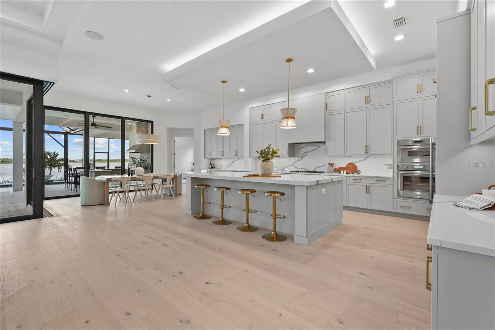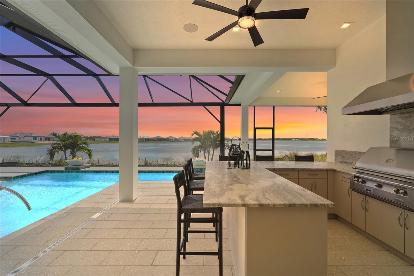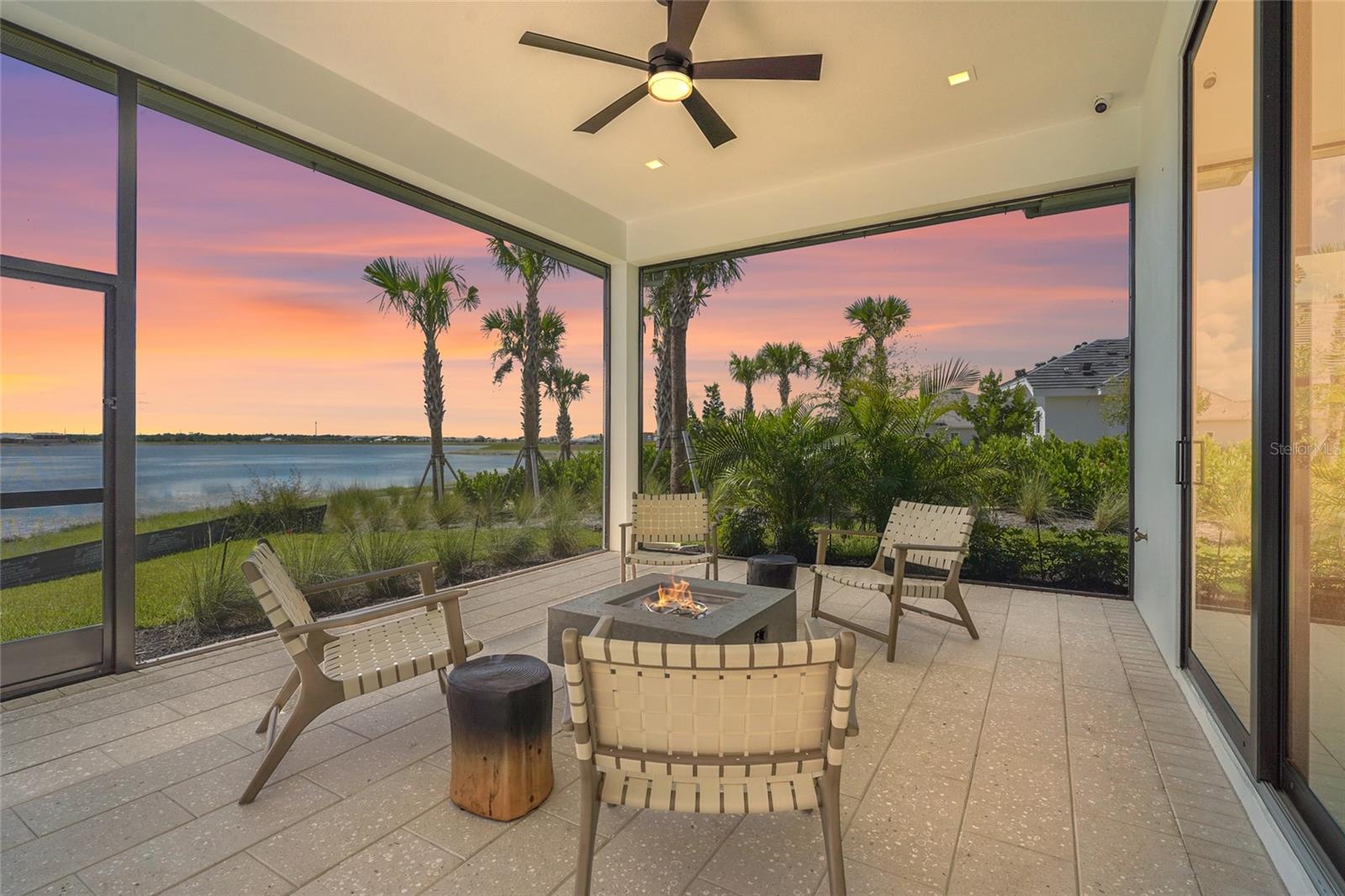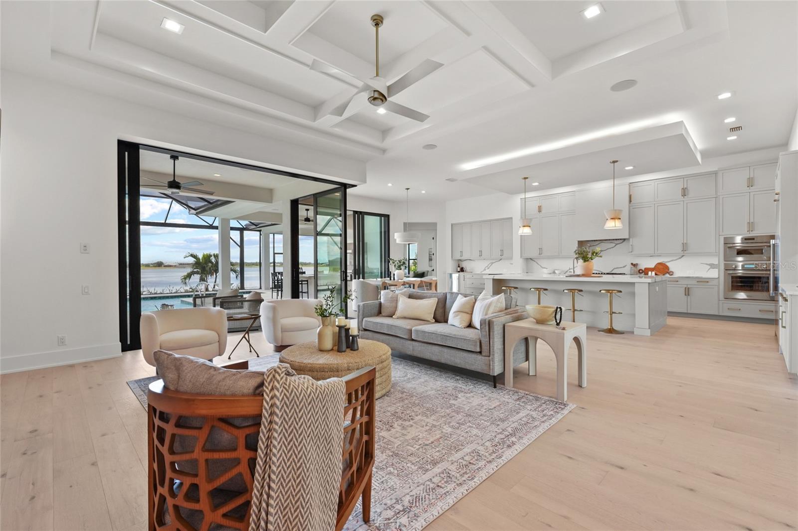A modern lakefront masterpiece in Wild Blue, this never-lived-in Arthur Rutenberg estate captures the essence of luxury Florida living. Completed in late 2025 and move-in ready, the home offers a rare opportunity to enjoy new construction without the wait. With 5 bedrooms, 5.5 bathrooms, 4,631 square feet, a bonus room, office, and a versatile flex space off the owner's suite, the design blends functionality with elegant entertaining spaces. A highlight of the home is the private multi-generational studio with its own entrance, kitchenette, full bath, and living area, perfect for extended family or long-term guests. From the moment you step inside the pivoting front door with switchable privacy glass, the home makes a statement with soaring ceilings, wide-plank wood floors, and walls of glass framing panoramic water views. The great room is an entertainer's dream, seamlessly connected to the chef's kitchen appointed with quartz counters, custom cabinetry, a Thermador Appliance package (Bosch Dishwasher), expansive walk-in pantry provides abundant storage, prep space, and an additional refrigerator. The open design allows the main living and dining areas to flow together effortlessly, creating a bright and welcoming atmosphere ideal for gathering with friends and family. The owner's retreat is a private sanctuary designed to impress with dual custom walk-in closets by Closet Envy, and a private exercise room with durable slip-resistant flooring for your personal wellness routine. Relax in the spa-inspired ensuite featuring a freestanding soaking tub and an expansive Roman shower with triple shower heads and designer tile. Each additional bedroom is paired with its own ensuite bath, ensuring privacy and comfort for family or guests. The outdoor living experience is truly exceptional. A custom pool and spa with cascading fountains, fire bowls, and LED lighting sets the stage for relaxation or entertainment, while the expansive lanai offers a full outdoor kitchen, bar seating, and retractable screens that make the space usable year-round. From peaceful mornings with coffee overlooking the lake to vibrant evening gatherings under glowing sunsets, the backyard becomes a destination in itself. Wild Blue is more than a neighborhood, it is a lifestyle community built around connection, recreation, and wellness. At Midway Park, residents enjoy tennis and pickleball with professional instruction, fitness classes on the event lawn, playgrounds, a dog park, and scenic walking trails. A robust calendar of social activities ensures there is always something to do, whether it's live music, food truck nights, or wellness programs that keep neighbors engaged and active. Skip the wait of new construction and step into a move-in-ready estate that brings resort-style living to your everyday life. This is your chance to claim one of Wild Blue's finest properties and begin your next chapter surrounded by beauty, comfort, and endless possibilities. ***Must see Cinematic Video Tour available.***