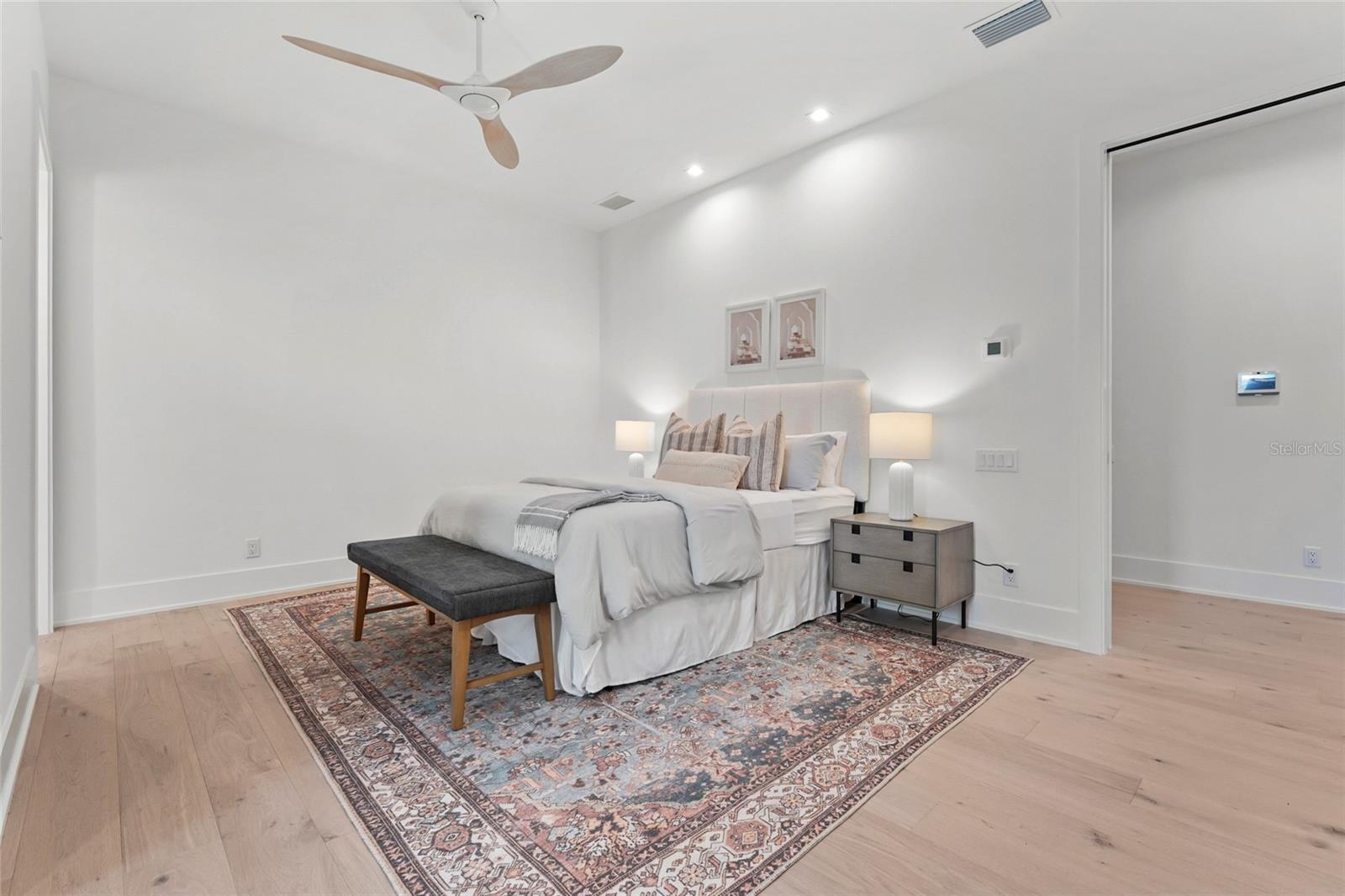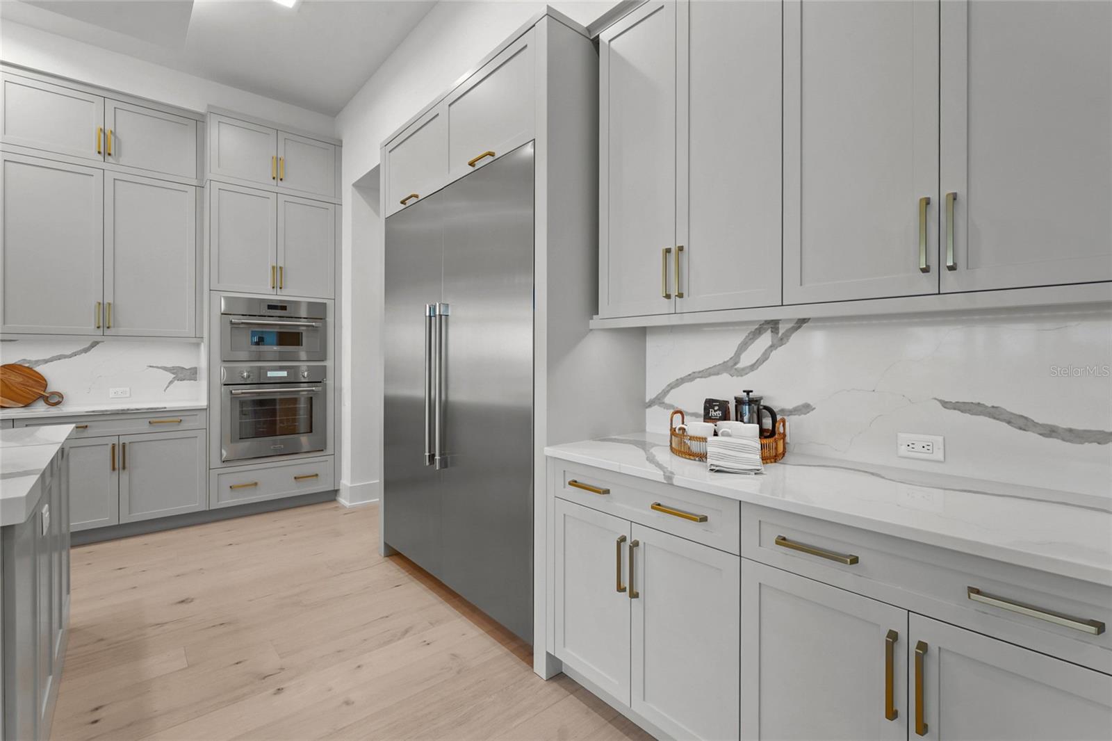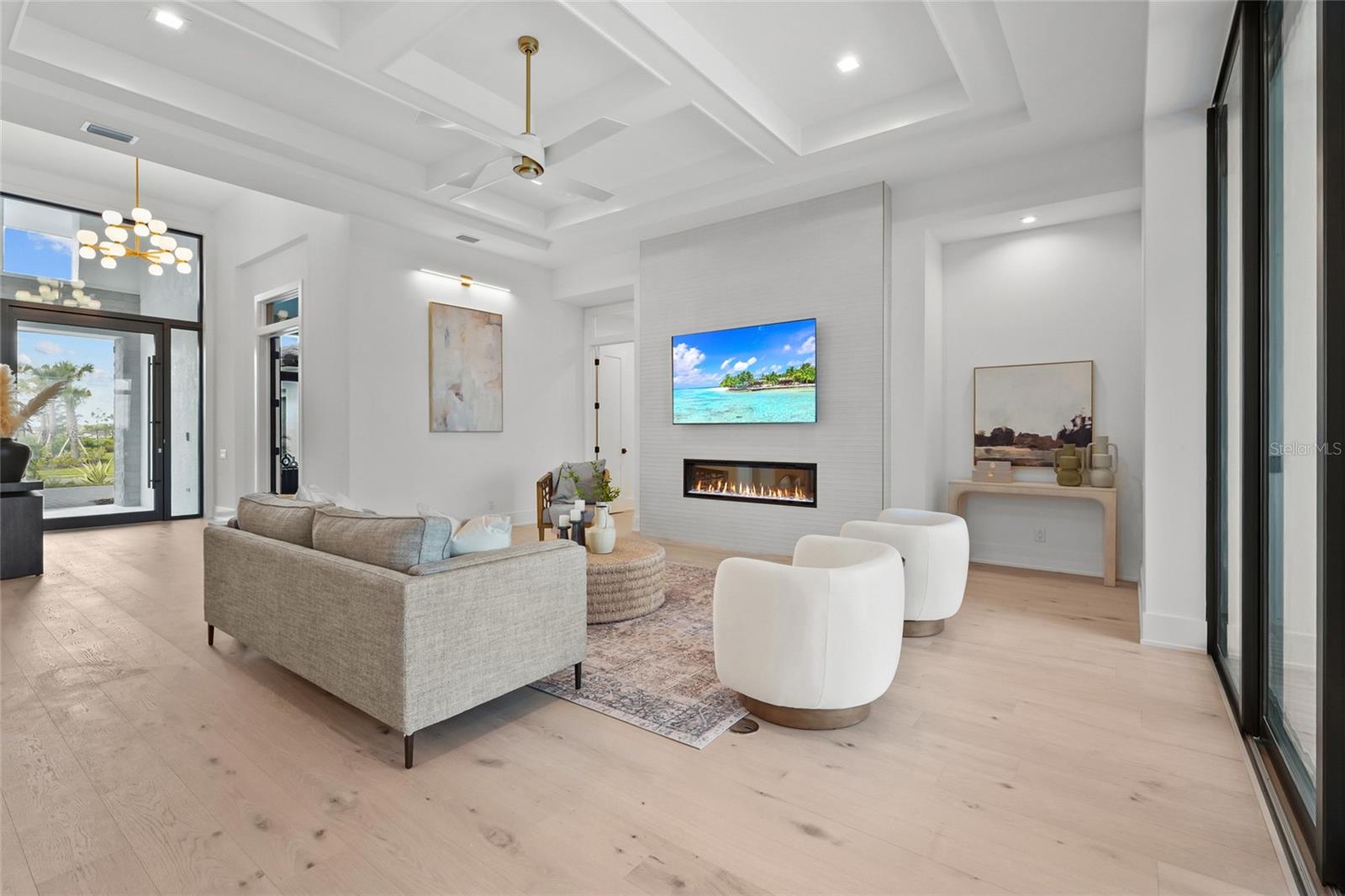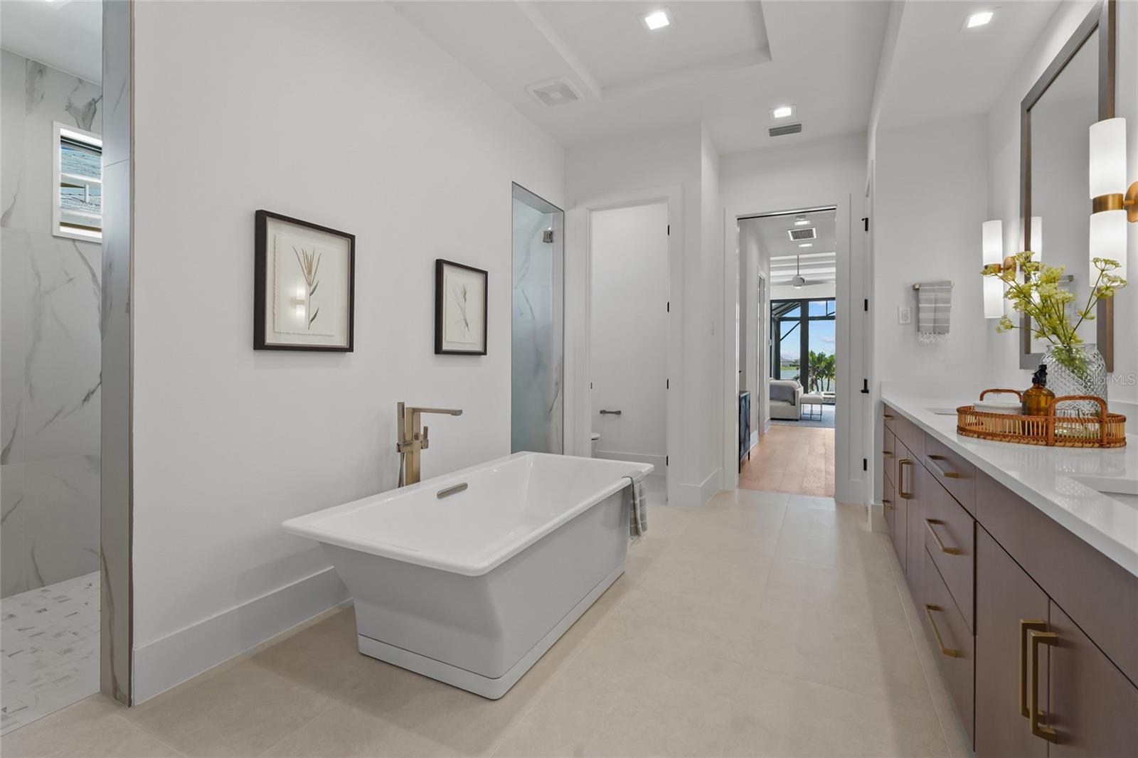A modern lakefront masterpiece in Wild Blue, this never-lived-in Arthur Rutenberg estate captures the essence of luxury Florida living. Completed in late 2025 and move-in ready, the home offers a rare opportunity to enjoy new construction without the wait. With 5 bedrooms, 5.5 bathrooms, 4,631 square feet, a bonus room, office, and a versatile flex space off the owner's suite, the design blends functionality with elegant entertaining spaces. A highlight of the home is the private multi-generational studio with its own entrance, kitchenette, full bath, and living area, perfect for extended family or long-term guests. From the moment you step inside the pivoting front door with switchable privacy glass, the home makes a statement with soaring ceilings, wide-plank wood floors, and walls of glass framing panoramic water views. The great room is an entertainer's dream, seamlessly connected to the chef's kitchen appointed with quartz counters, custom cabinetry, a Thermador Appliance package (Bosch Dishwasher), expansive walk-in pantry provides abundant storage, prep space, and an additional refrigerator. The open design allows the main living and dining areas to flow together effortlessly, creating a bright and welcoming atmosphere ideal for gathering with friends and family. The owner's retreat is a private sanctuary designed to impress with dual custom walk-in closets by Closet Envy, and a private exercise room with durable slip-resistant flooring for your personal wellness routine. Relax in the spa-inspired ensuite featuring a freestanding soaking tub and an expansive Roman shower with triple shower heads and designer tile. Each additional bedroom is paired with its own ensuite bath, ensuring privacy and comfort for family or guests. The outdoor living experience is truly exceptional. A custom pool and spa with cascading fountains, fire bowls, and LED lighting sets the stage for relaxation or entertainment, while the expansive lanai offers a full outdoor kitchen, bar seating, and retractable screens that make the space usable year-round. From peaceful mornings with coffee overlooking the lake to vibrant evening gatherings under glowing sunsets, the backyard becomes a destination in itself. Wild Blue is more than a neighborhood, it is a lifestyle community built around connection, recreation, and wellness. At Midway Park, residents enjoy tennis and pickleball with professional instruction, fitness classes on the event lawn, playgrounds, a dog park, and scenic walking trails. A robust calendar of social activities ensures there is always something to do, whether it's live music, food truck nights, or wellness programs that keep neighbors engaged and active. Skip the wait of new construction and step into a move-in-ready estate that brings resort-style living to your everyday life. This is your chance to claim one of Wild Blue's finest properties and begin your next chapter surrounded by beauty, comfort, and endless possibilities. ***Must see Cinematic Video Tour available.***