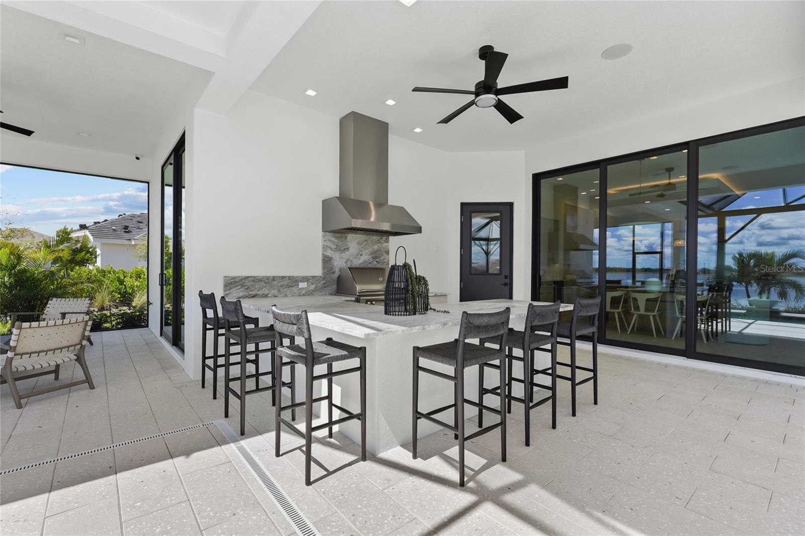 Exterior: Lighting, Outdoor Grill, Outdoor Kitchen, Private Mailbox, Rain Gutters, Sidewalk, Sliding Doors