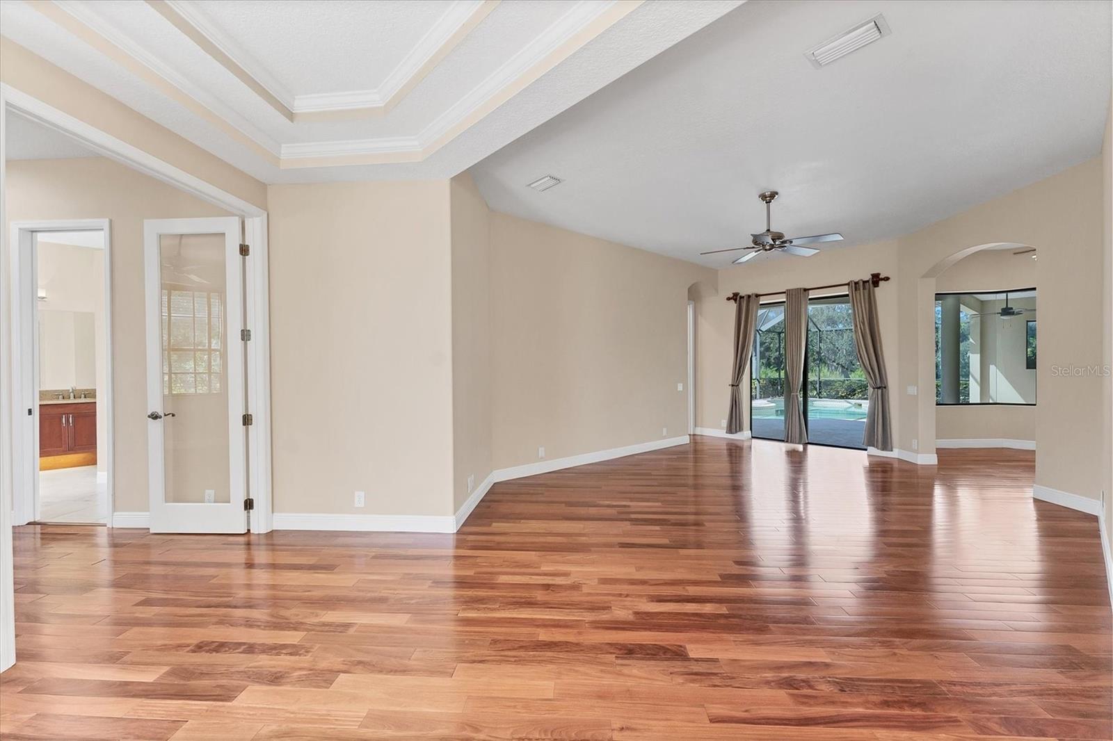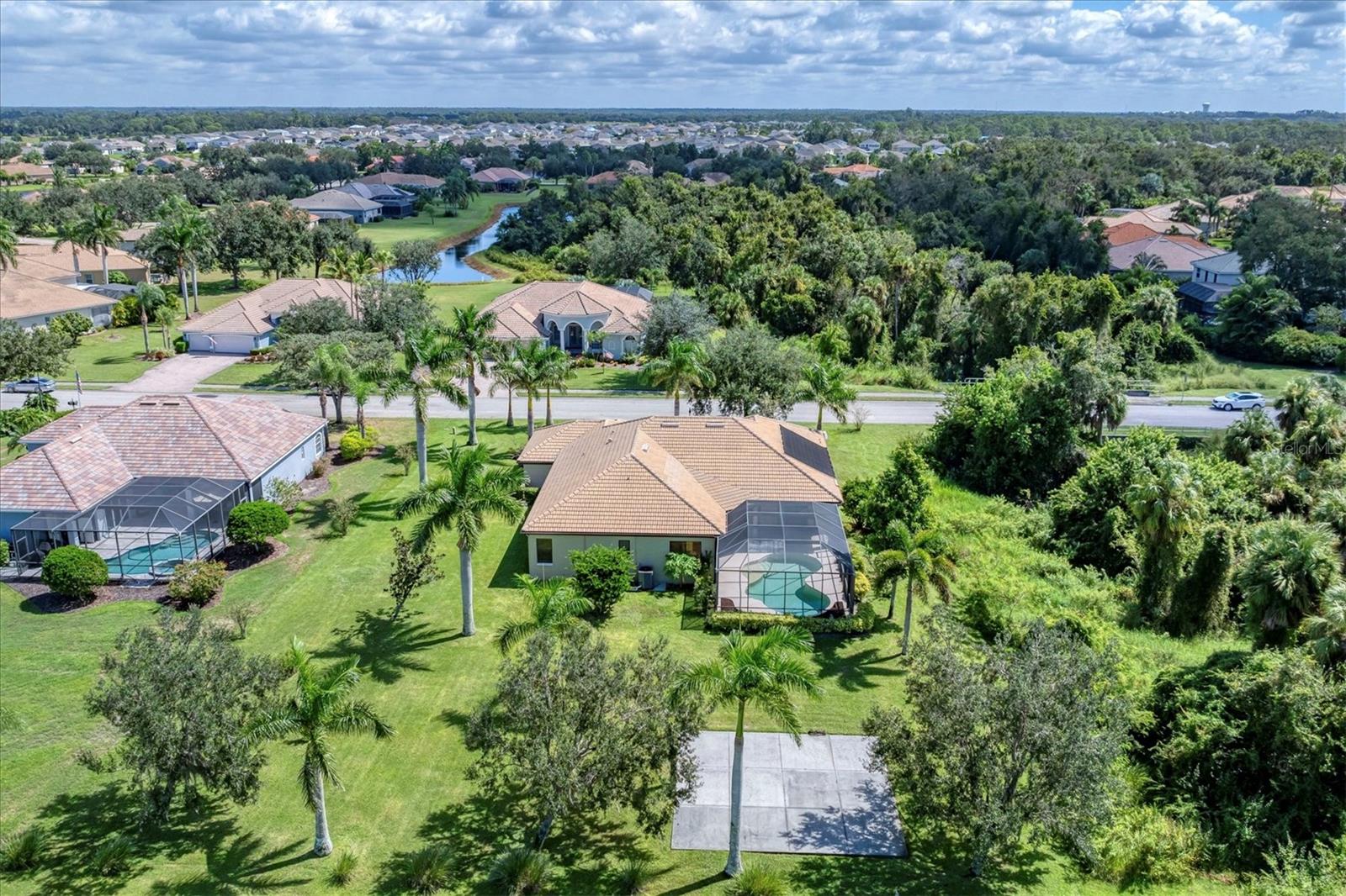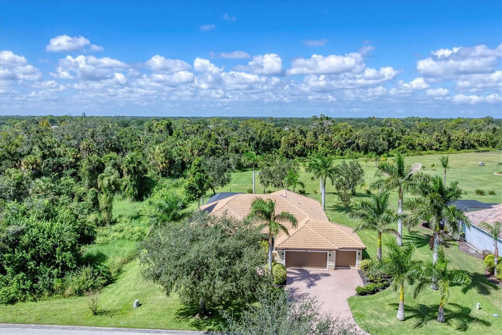 Looking for space, style and location for a great price? The search is over; this property checks all the boxes! Fantastic value for this 4 bed/3 bath/+den/3 car garage, pool home in desirable Country Meadows. Located on a .67 ace lot next to a preserve, you'll love the privacy and curb appeal this tile roof, paver drive, executive home offers. Pre-inspected and move-in ready, this home is perfect for a quick close. Gorgeous Santos mahogany wood floors welcome you into the impressive interior with tray ceiling details. The split floor plan offers great flexibility, including a private guest suite ideal for visitors or multi-generational living. Start your day in the breakfast nook with aquarium window framing serene views of the preserve. The stylish and functional kitchen features cherry wood cabinetry, stone counters and a breakfast bar. A butler's pantry and closet pantry lead seamlessly from the kitchen to the dining room. The spacious primary suite has sliders that open to the pool area, plus dual walk-in closets, double sinks, a Roman shower and jetted tub. Pocketing sliders open to the screen enclosed patio, inviting you to your private, backyard oasis with solar heated, salt-water pool and summer kitchen with bar seating. There is even a backyard basketball/sports court for your enjoyment! Recent (2025) improvements include new HVAC, water heater and salt cell for pool. Additional interior features are central vac, laundry with utility sink and storage. Country Meadows has NO CDD FEES and residents enjoy a community park with playground, sidewalks and underground utility lines, fences are permitted. Not in a flood zone and hurricane shutters provided for additional peace of mind. This home offers incredible value in a prime location--a little bit country but minutes to I-75, convenient to shopping, dining, and everything this fast-growing area offers.