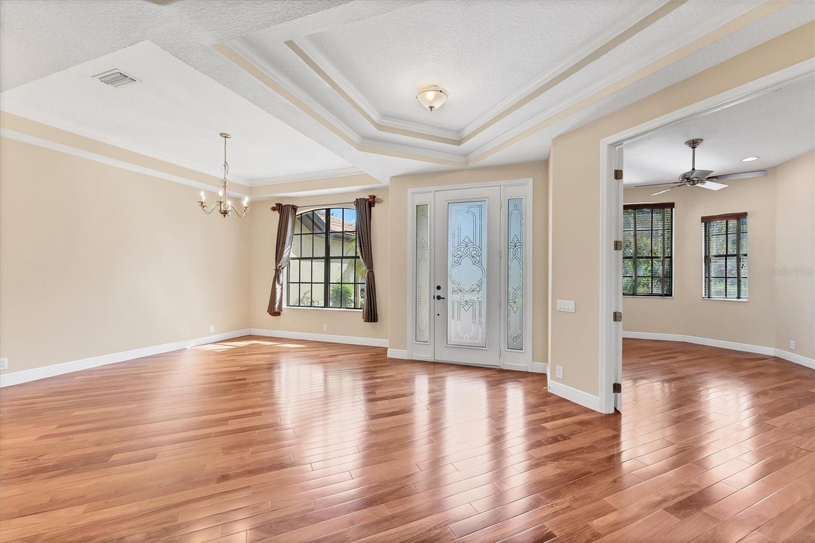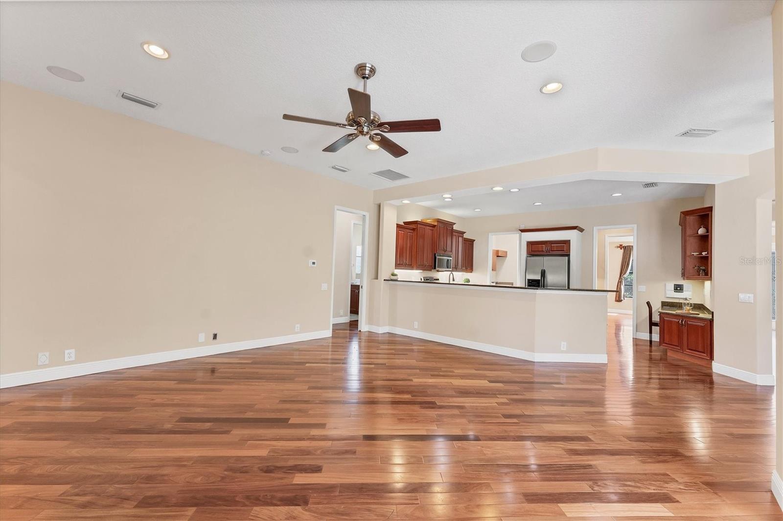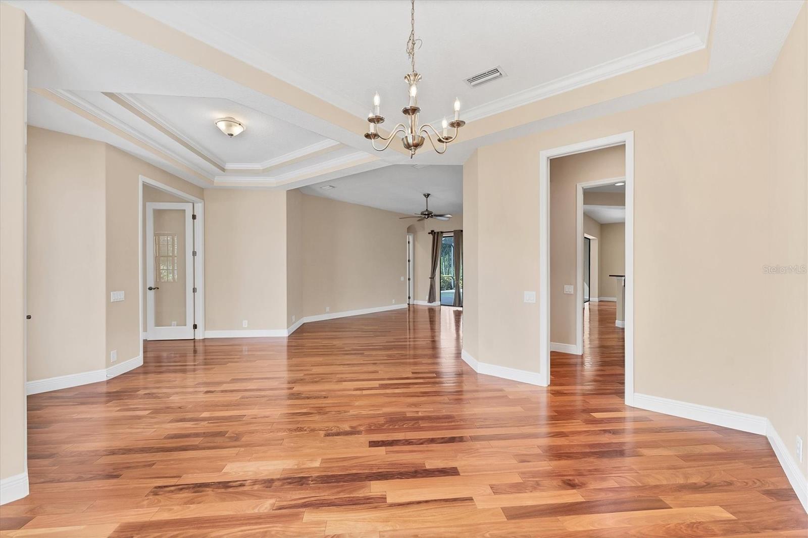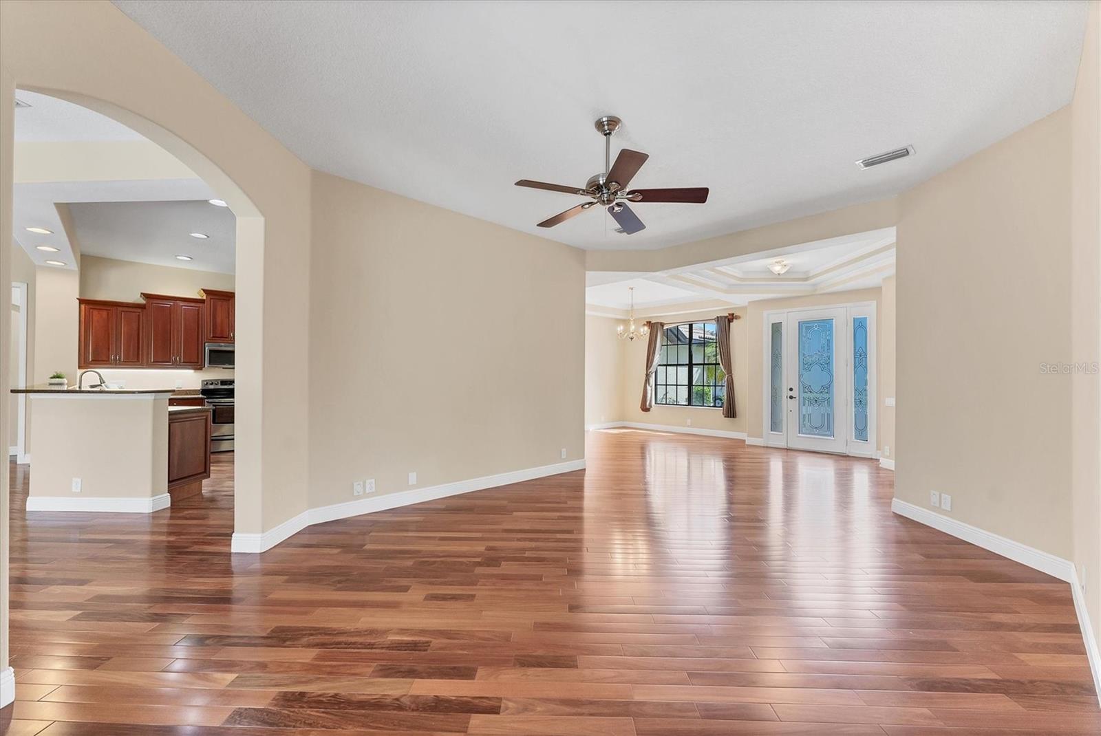 Looking for space, style and location for a great price? The search is over; this property checks all the boxes! Fantastic value for this 4 bed/3 bath/+den/3 car garage, pool home in desirable Country Meadows. Located on a .67 ace lot next to a preserve, you'll love the privacy and curb appeal this tile roof, paver drive, executive home offers. Pre-inspected and move-in ready, this home is perfect for a quick close. Gorgeous Santos mahogany wood floors welcome you into the impressive interior with tray ceiling details. The split floor plan offers great flexibility, including a private guest suite ideal for visitors or multi-generational living. Start your day in the breakfast nook with aquarium window framing serene views of the preserve. The stylish and functional kitchen features cherry wood cabinetry, stone counters and a breakfast bar. A butler's pantry and closet pantry lead seamlessly from the kitchen to the dining room. The spacious primary suite has sliders that open to the pool area, plus dual walk-in closets, double sinks, a Roman shower and jetted tub. Pocketing sliders open to the screen enclosed patio, inviting you to your private, backyard oasis with solar heated, salt-water pool and summer kitchen with bar seating. There is even a backyard basketball/sports court for your enjoyment! Recent (2025) improvements include new HVAC, water heater and salt cell for pool. Additional interior features are central vac, laundry with utility sink and storage. Country Meadows has NO CDD FEES and residents enjoy a community park with playground, sidewalks and underground utility lines, fences are permitted. Not in a flood zone and hurricane shutters provided for additional peace of mind. This home offers incredible value in a prime location--a little bit country but minutes to I-75, convenient to shopping, dining, and everything this fast-growing area offers.