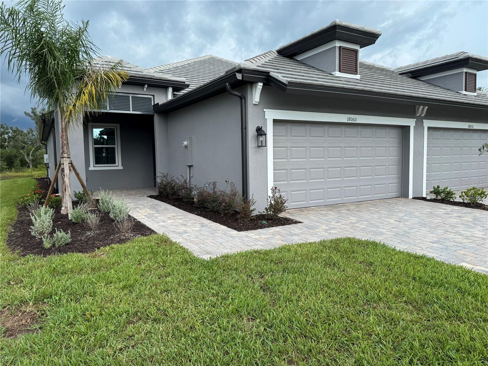 Nestled in the gated community of Eagle Trace, this 2 bedroom, 2 bath villa invites you in with its bright and seamless design. A screened-in entryway with a glass front door welcomes you inside, where you're greeted by a versatile area that can serve as a formal dining room, home office or den. The kitchen then takes center stage with its large island offering plenty of storage, gleaming quartz countertops, a stylish glass tile backsplash, and a gas range that makes cooking a joy. From here, the layout flows effortlessly into the living area, where natural light pours in through the windows and highlights the wood-look flooring that extends throughout the home, creating a warm and cohesive feel with a seamless connection to the outdoors. Step outside to the extended lanai, where you'll enjoy beautifully landscaped surroundings and plenty of room to relax or entertain. The split floor plan provides privacy with the primary suite tucked away as a true retreat, complete with a modern walk-in shower. Towards the front of the home, a second bedroom and full bath offer flexibility for guests or additional flex space. With its thoughtful updates, welcoming layout, and low-maintenance lifestyle, this is the perfect place to call home, whether for everyday living or a seasonal escape. Eagle Trace offers resort-style amenities including a community pool, spa, tennis courts, dog park, and gathering spaces, all in a prime location near shopping, dining, and everything Lakewood Ranch has to offer. And, no CDD fees!