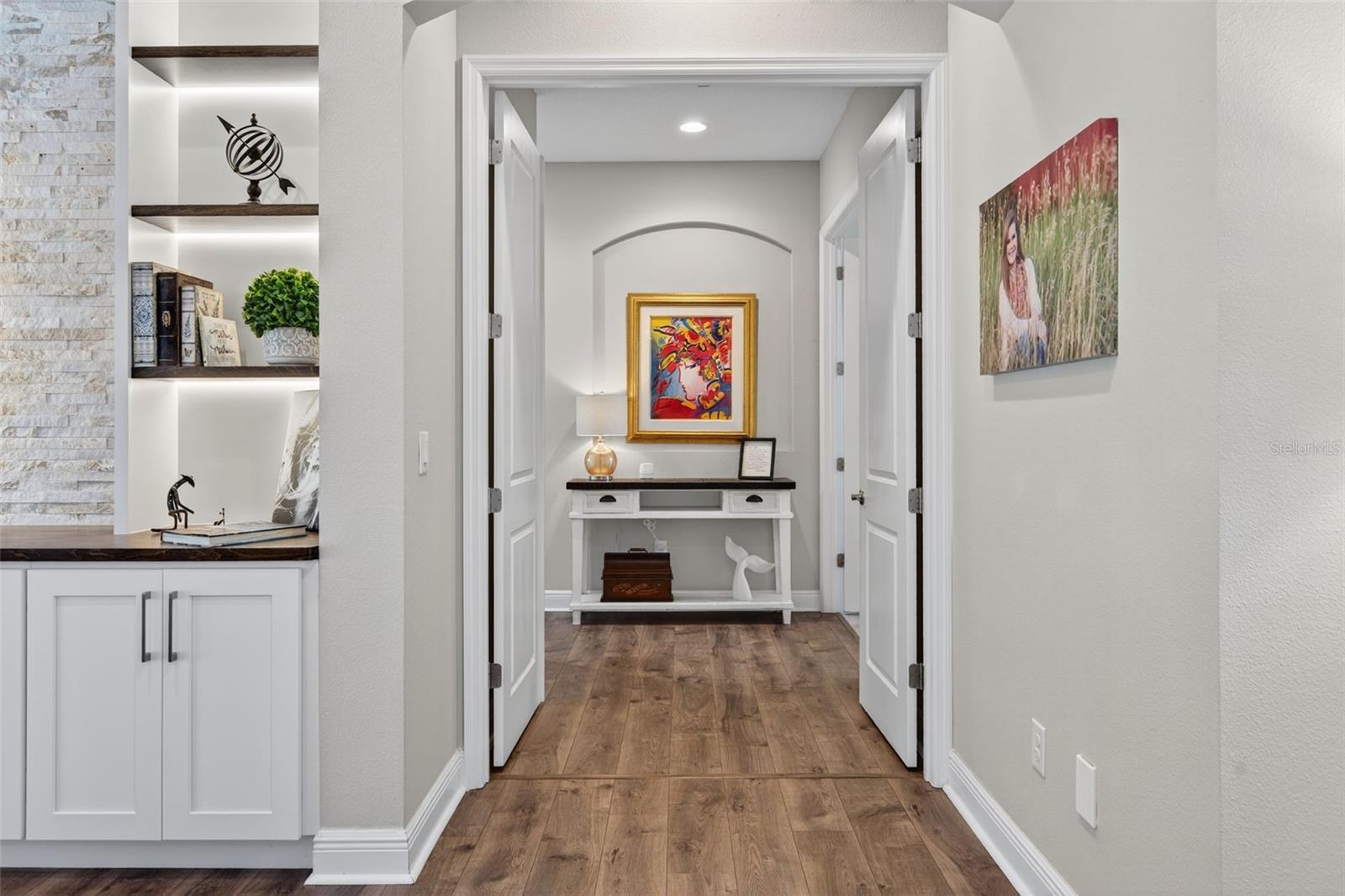 Experience refined Florida living in this exceptional estate located in the sought-after community of Rye Wilderness Estates. Perfectly situated on an oversized homesite surrounded by lush greenery, this custom-designed residence offers 4 bedrooms, 4 bathrooms, and a spacious 3-car garage--crafted for elegance, functionality, and modern convenience.Step inside to discover sophisticated interiors with high ceilings, designer finishes, and abundant natural light that seamlessly connects the open living spaces. The gourmet kitchen is a showpiece with rich cabinetry, a large center island, luxury appliances, and a layout ideal for both entertaining and everyday living. The family room, anchored by a custom feature wall, electric fireplace, custom built-in shelving and expansive sliders, transitions effortlessly to the outdoor oasis.The generously sized master suite is a private retreat, offering a spacious layout, tray ceiling, and serene views that set the tone for ultimate relaxation. Its spa-like bathroom features a luxurious soaking tub, walk-in shower, dual vanities, and elegant finishes, creating a personal sanctuary for unwinding at the end of the day. Two additional bedrooms each feature ensuite bathrooms, providing privacy and comfort for family or guests, while the fourth bedroom enjoys easy access to a nearby guest/pool bath--perfectly designed for versatility and convenience.Designed for year-round enjoyment, the resort-style lanai boasts a full custom outdoor kitchen, saltwater heated pool, and spa--all framed by tropical landscaping and a large fenced-in backyard that offers unmatched privacy and serene natural views. For ultimate peace of mind, the home is equipped with a whole-home Generac generator, Tesla chargers in the garage, and a central vacuum system, not to mention the designer crafted window treatments and finishes throughout the home. Rye Wilderness is known for its oversized lots, luxury residences, and NO CDD fees. Residents enjoy the tranquility of wide-open spaces while remaining just minutes from Lakewood Ranch, top-rated schools, golf courses, shopping, dining, and the Gulf Coast's award-winning beaches.This home embodies the perfect balance of elegance, technology, and Florida lifestyle--making it a rare offering in one of Bradenton's most desirable neighborhoods.