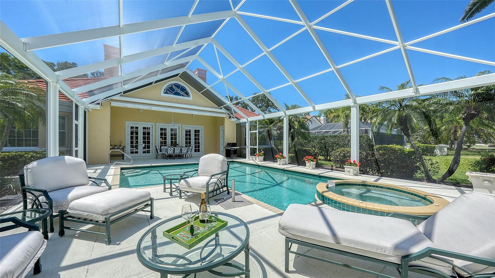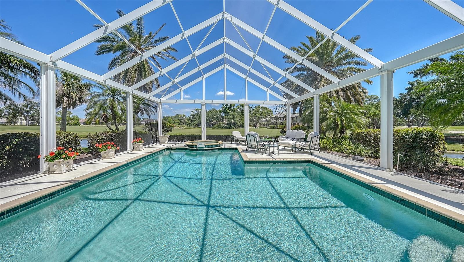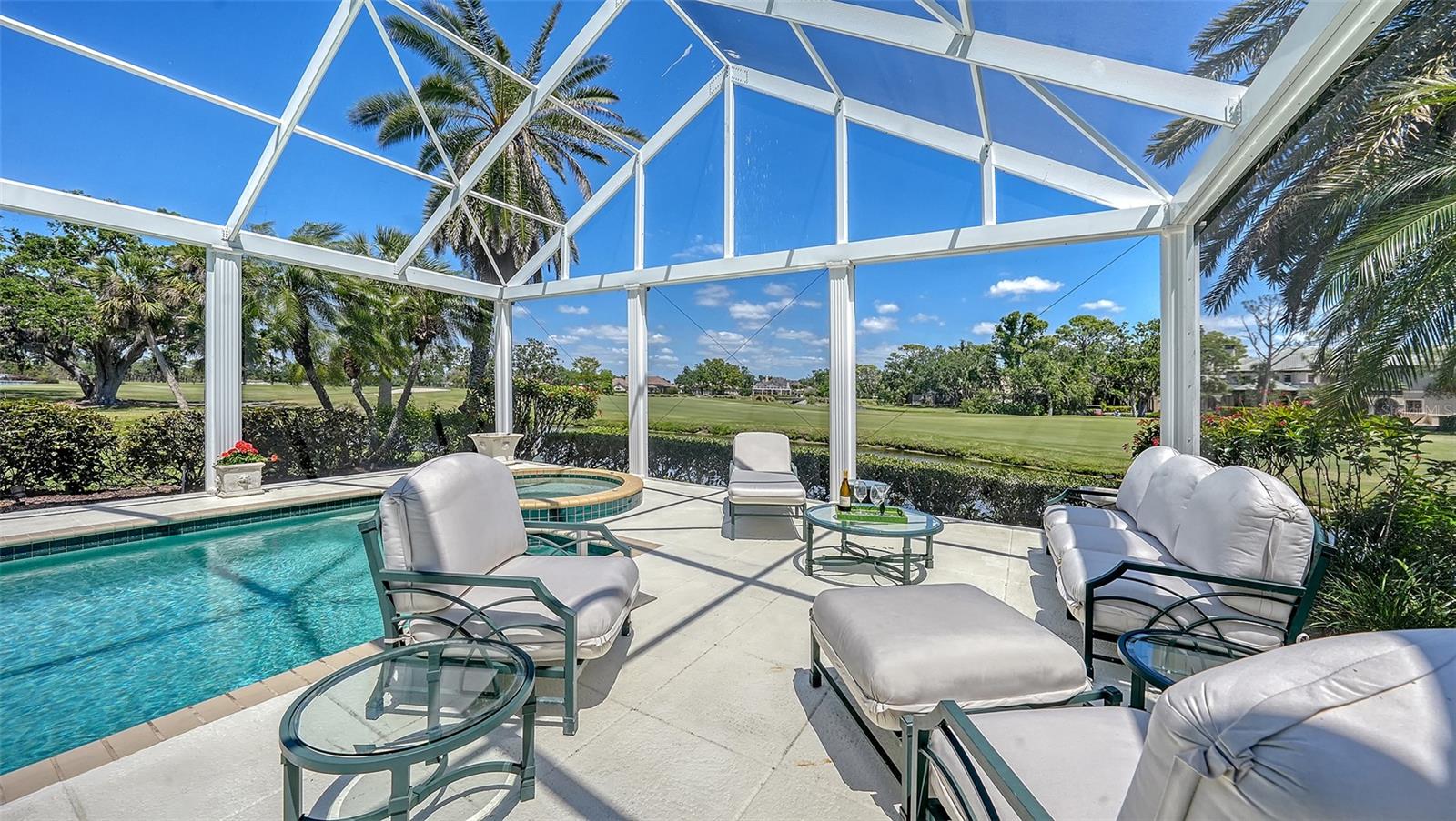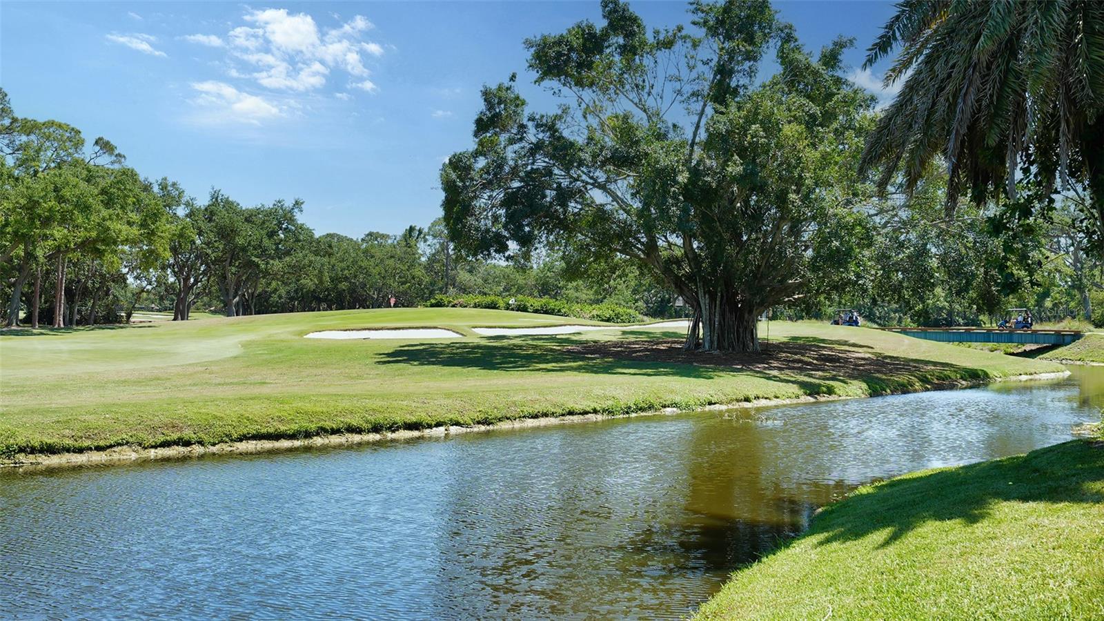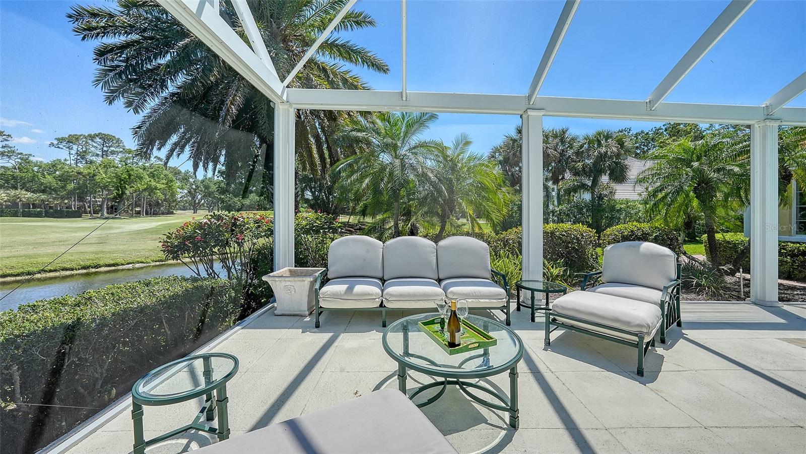 Experience the unparalleled charm and convenience of this golf course home in The Oaks Club, the country club community designed by noted Sarasota architect Bo MacEwen. 228 Saint James Park is an original Bo MacEwen design, is located on the leafy and quiet Saint James Park cul-de-sac, and directly overlooks the opening hole of the Heron golf course. This single-floor three-bedroom, two-and-a-half bath will captivate you from the moment you step inside with its open floor plan, high, coffered ceilings with extensive crown moldings, and generous French doors providing wonderful lighting, beautiful views to the lanai, swimming pool, spa, and the Heron golf course itself. 228 provides mahogany flooring in most areas, and a completely redesigned and updated kitchen with quartz countertops, Sub-Zero refrigerator, wine refrigerator, cooktop, microwave, two beverage-cooling drawers, center island, custom cabinetry, and walk-in pantry. The great room is perfect for entertaining and flows seamlessly onto the lanai that overlooks Heron #1. The split floor plan has ensuite sleeping and bath areas on each side of 228: the master suite on the north side of the home features a completely remodeled spa-like bath and soaking tub, separate glassed-in shower, stylish lighting, and a generous, custom walk-in closet. On the south side of 228 is the ensuite guest area with the spacious second bedroom and fully renovated guest bath. The third bedroom is on this south side of the home as well, and is currently being used as the residents' office, which enjoys pleasant, direct views of Heron #1 also and direct access to the lanai and pool. Numerous details associated with this home a two-car garage with epoxy floor, storage areas, and refrigerator/freezer, French doors, plantation shutters, newer roof (2020), plantation shutters, hurricane shades, walled-in motor court, and new bay windows by Pella. Saint James Park is the residential area closest to the athletic facilities of The Oaks Club, so SJP residents can easily walk or bike to the tennis courts, pickleball courts, Well-Fit Center, or golf pro shop. Residents enjoy both casual and fine dining, as well as a social atmosphere that encourages all to stay engaged in all that The Oaks Club offers. For those electing golf memberships, the ability to play the two courses here is immediate....no waiting period! And The Oaks Club has been designated a Platinum Club of America and an Emerald Club, signifying its standing among the finest country clubs in Florida and the nation. Schedule a showing today!
