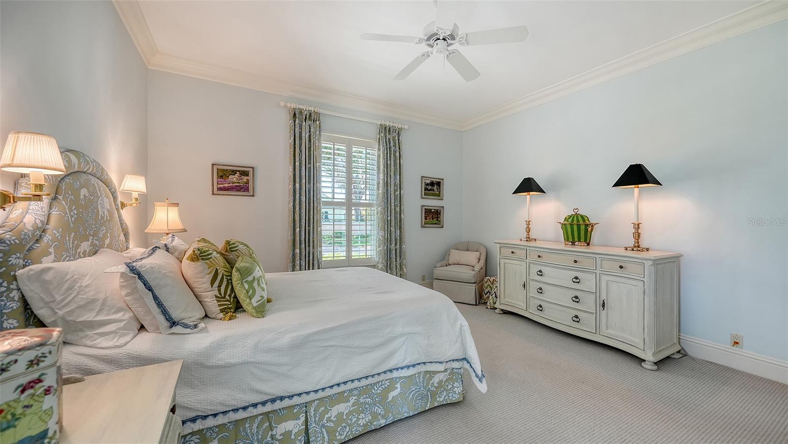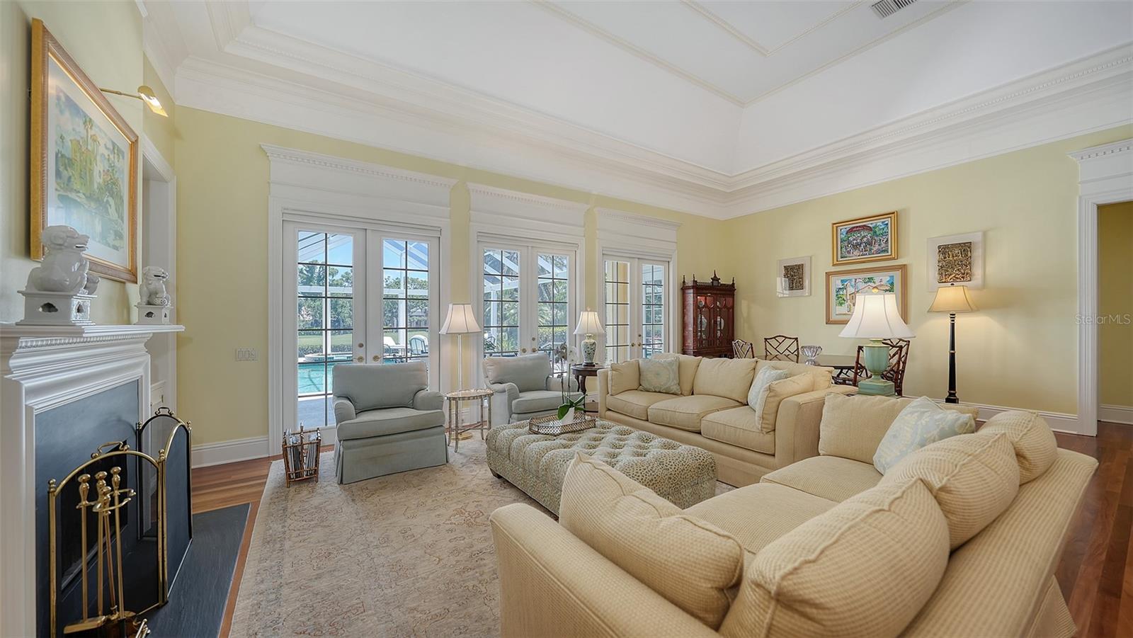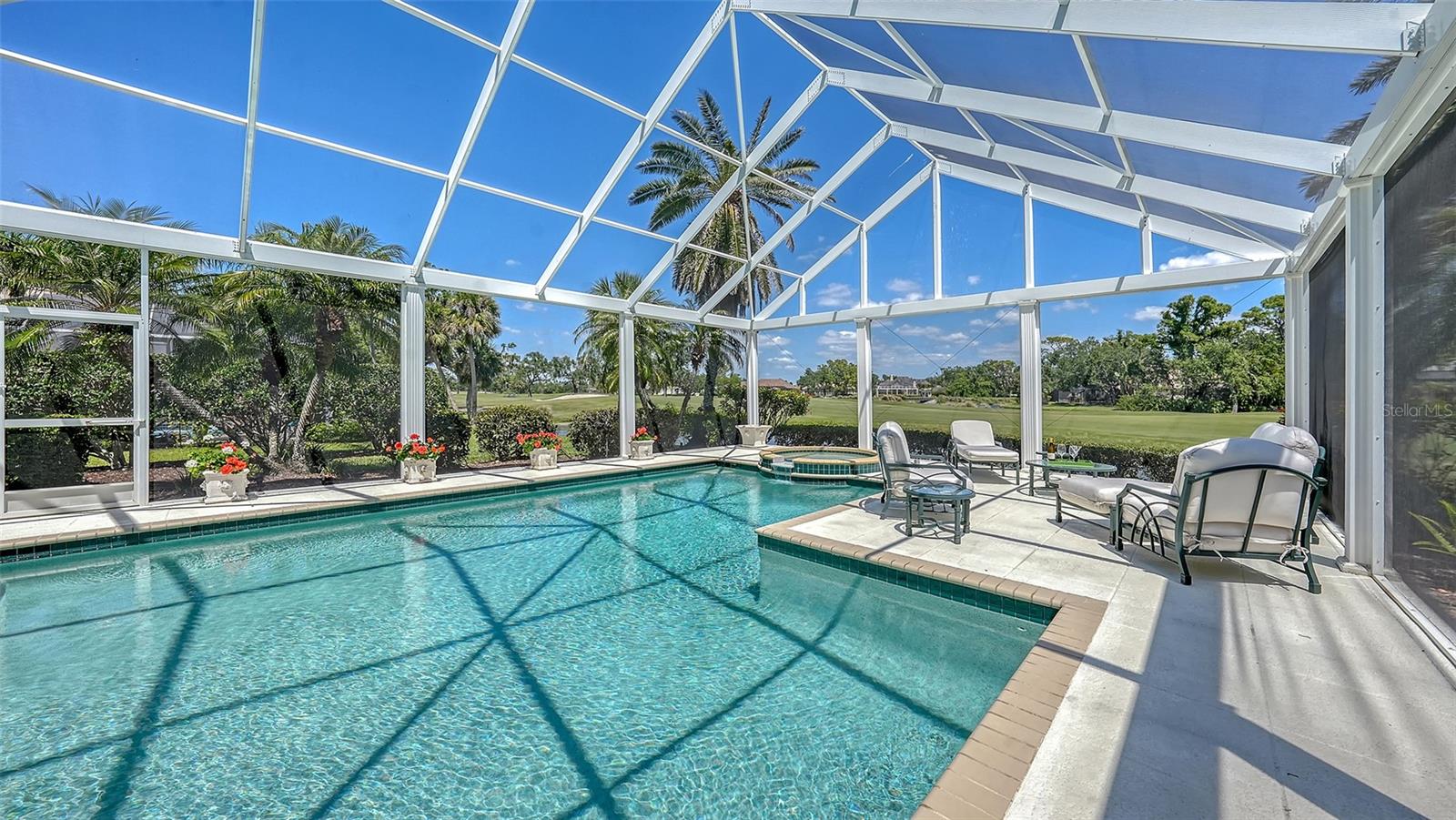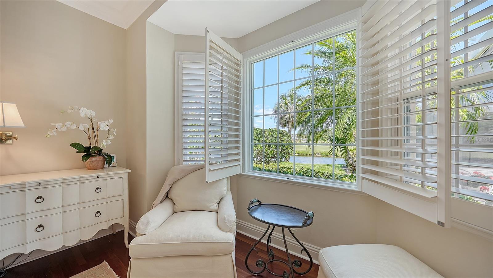 Experience the unparalleled charm and convenience of this golf course home in The Oaks Club, the country club community designed by noted Sarasota architect Bo MacEwen. 228 Saint James Park is an original Bo MacEwen design, is located on the leafy and quiet Saint James Park cul-de-sac, and directly overlooks the opening hole of the Heron golf course. This single-floor three-bedroom, two-and-a-half bath will captivate you from the moment you step inside with its open floor plan, high, coffered ceilings with extensive crown moldings, and generous French doors providing wonderful lighting, beautiful views to the lanai, swimming pool, spa, and the Heron golf course itself. 228 provides mahogany flooring in most areas, and a completely redesigned and updated kitchen with quartz countertops, Sub-Zero refrigerator, wine refrigerator, cooktop, microwave, two beverage-cooling drawers, center island, custom cabinetry, and walk-in pantry. The great room is perfect for entertaining and flows seamlessly onto the lanai that overlooks Heron #1. The split floor plan has ensuite sleeping and bath areas on each side of 228: the master suite on the north side of the home features a completely remodeled spa-like bath and soaking tub, separate glassed-in shower, stylish lighting, and a generous, custom walk-in closet. On the south side of 228 is the ensuite guest area with the spacious second bedroom and fully renovated guest bath. The third bedroom is on this south side of the home as well, and is currently being used as the residents' office, which enjoys pleasant, direct views of Heron #1 also and direct access to the lanai and pool. Numerous details associated with this home a two-car garage with epoxy floor, storage areas, and refrigerator/freezer, French doors, plantation shutters, newer roof (2020), plantation shutters, hurricane shades, walled-in motor court, and new bay windows by Pella. Saint James Park is the residential area closest to the athletic facilities of The Oaks Club, so SJP residents can easily walk or bike to the tennis courts, pickleball courts, Well-Fit Center, or golf pro shop. Residents enjoy both casual and fine dining, as well as a social atmosphere that encourages all to stay engaged in all that The Oaks Club offers. For those electing golf memberships, the ability to play the two courses here is immediate....no waiting period! And The Oaks Club has been designated a Platinum Club of America and an Emerald Club, signifying its standing among the finest country clubs in Florida and the nation. Schedule a showing today!