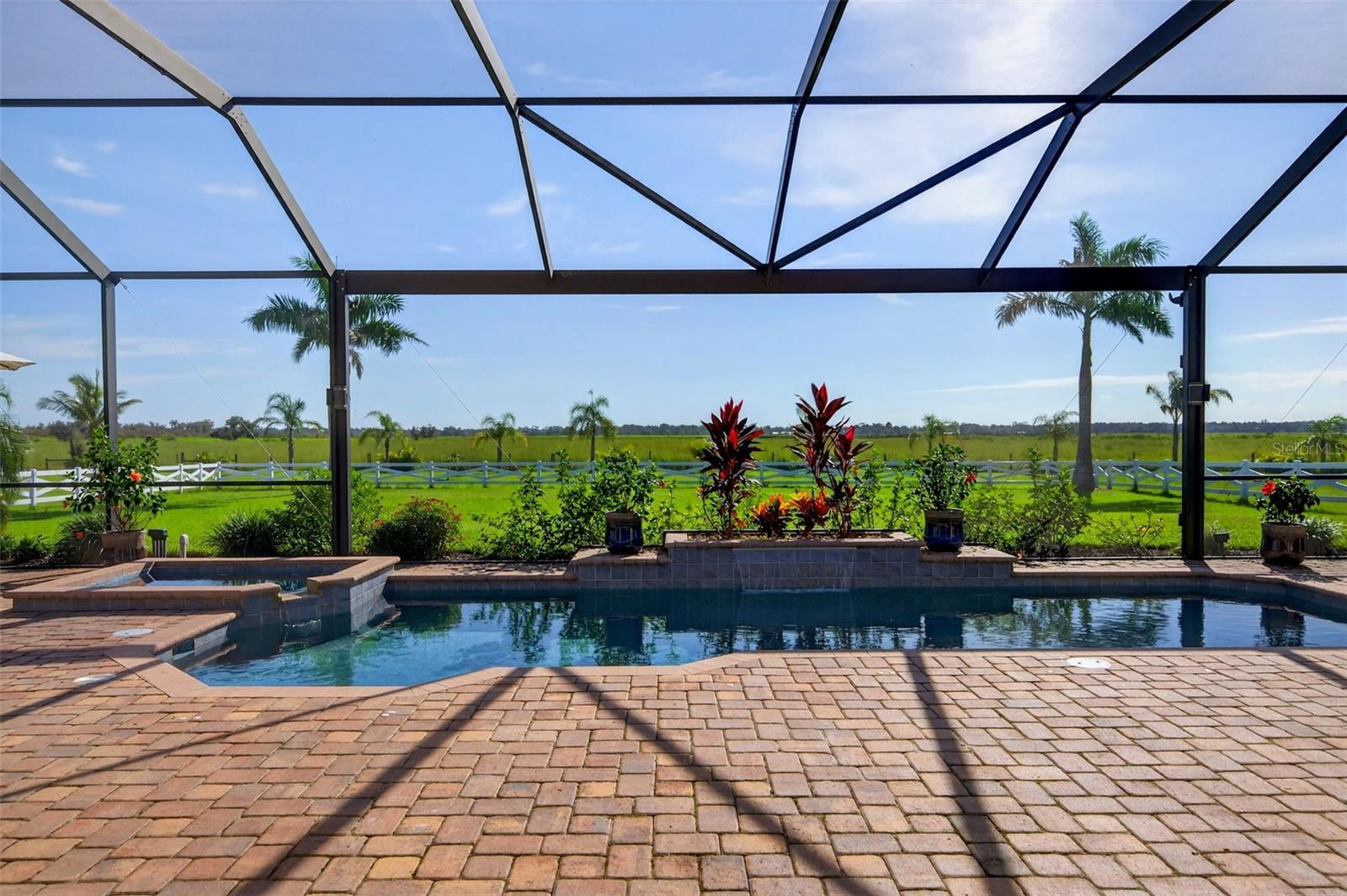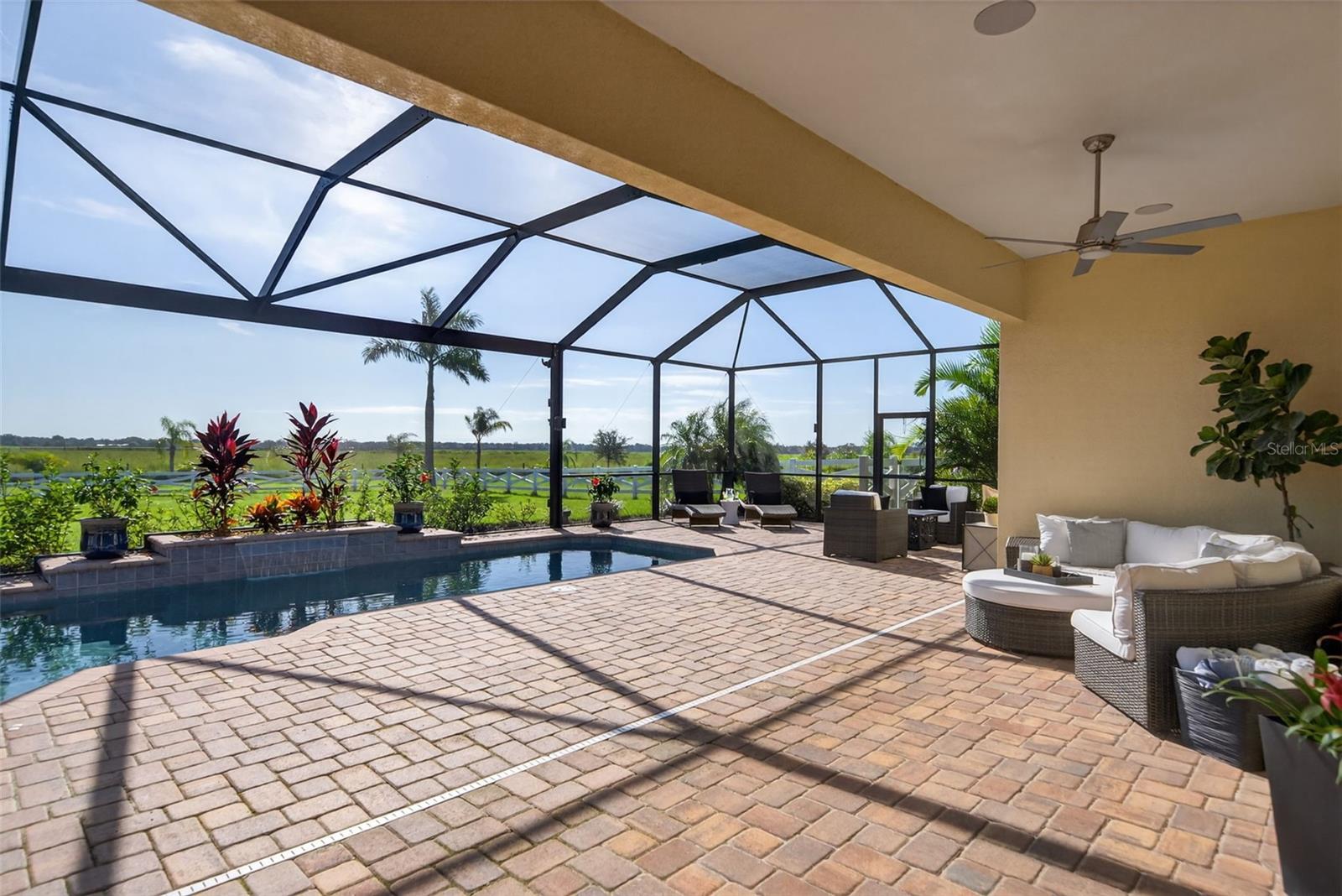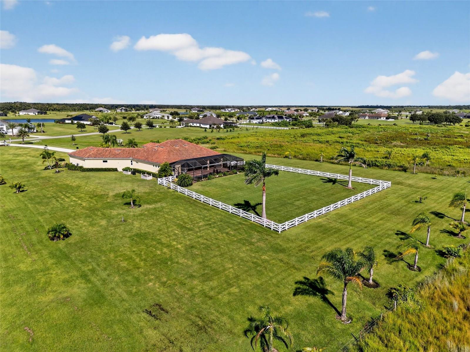 Experience the best of both worlds with this farm-to-table lifestyle -- where two gardens, an abundance of fruit trees, and the beauty of rural living meet the convenience of Sarasota's vibrant urban core just miles away. Set on a sprawling 3.5 acres in the picturesque community of Hampton Lakes, this custom Caicos model home combines refined elegance with everyday comfort. Step through the double glass doors into a spacious open floor plan featuring a formal dining area and a versatile den with double doors, a built-in Murphy bed, and sleek tile flooring. At the heart of the home, the gourmet chef's kitchen is a showstopper -- complete with wood cabinetry, quartz countertops, an induction cooktop, built-in wall oven, stainless steel range hood, corner walk-in pantry, and a central island with bar seating. A charming breakfast nook makes the perfect spot to enjoy the nearby nature. The great room is ideal for entertaining, with soaring tray ceilings, plantation shutters, and crown molding adding to the home's timeless appeal. Two private bedroom suites provide comfort for family or guests, while the oversized primary suite offers a spa-inspired retreat with walk-in closets, double vanities, and a luxurious walk-in shower. Resort-style living continues outdoors on the expansive lanai, where a heated saltwater pool, fire pit, and state-of-the-art summer kitchen create the ultimate entertaining space. Panoramic screens showcase sweeping views, delivering a serene backdrop of peace and privacy. Additional features include an extended laundry room, oversized four-car air-conditioned garage, whole-house portable generator, outdoor lighting, and a buried 1,000-gallon propane tank. All this, just 10 minutes from I-75, offering unmatched access to Sarasota's shopping, dining, and cultural lifestyle. This is where farm-to-table living meets refined luxury -- a rare opportunity not to be missed.