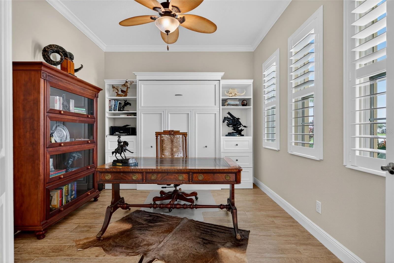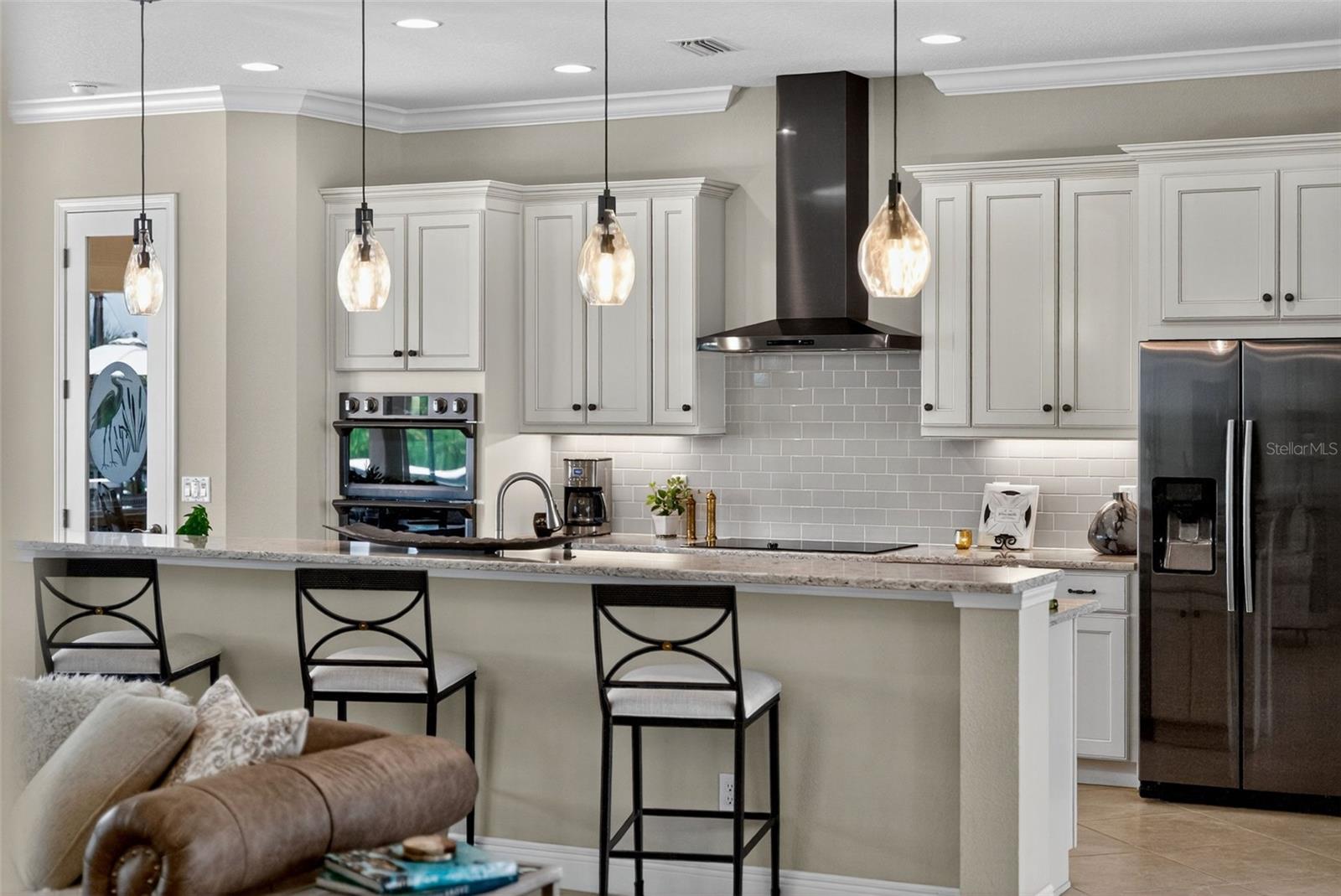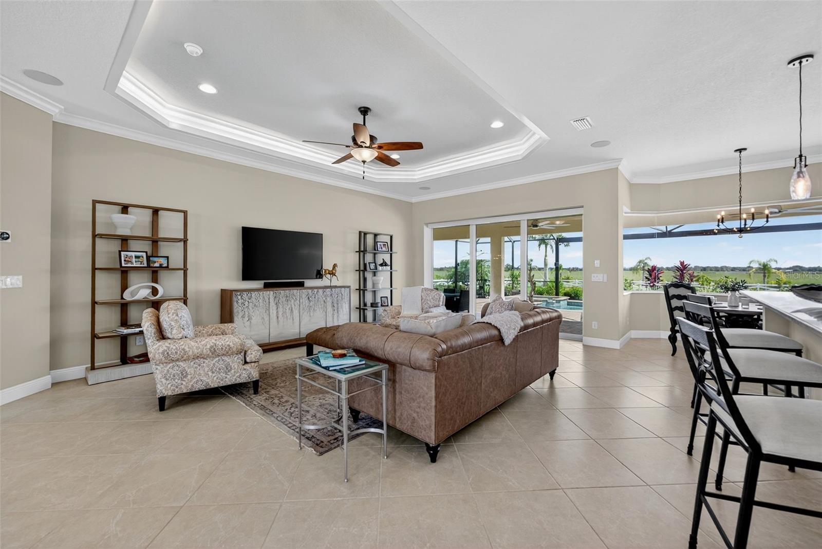 Experience the best of both worlds with this farm-to-table lifestyle -- where two gardens, an abundance of fruit trees, and the beauty of rural living meet the convenience of Sarasota's vibrant urban core just miles away. Set on a sprawling 3.5 acres in the picturesque community of Hampton Lakes, this custom Caicos model home combines refined elegance with everyday comfort. Step through the double glass doors into a spacious open floor plan featuring a formal dining area and a versatile den with double doors, a built-in Murphy bed, and sleek tile flooring. At the heart of the home, the gourmet chef's kitchen is a showstopper -- complete with wood cabinetry, quartz countertops, an induction cooktop, built-in wall oven, stainless steel range hood, corner walk-in pantry, and a central island with bar seating. A charming breakfast nook makes the perfect spot to enjoy the nearby nature. The great room is ideal for entertaining, with soaring tray ceilings, plantation shutters, and crown molding adding to the home's timeless appeal. Two private bedroom suites provide comfort for family or guests, while the oversized primary suite offers a spa-inspired retreat with walk-in closets, double vanities, and a luxurious walk-in shower. Resort-style living continues outdoors on the expansive lanai, where a heated saltwater pool, fire pit, and state-of-the-art summer kitchen create the ultimate entertaining space. Panoramic screens showcase sweeping views, delivering a serene backdrop of peace and privacy. Additional features include an extended laundry room, oversized four-car air-conditioned garage, whole-house portable generator, outdoor lighting, and a buried 1,000-gallon propane tank. All this, just 10 minutes from I-75, offering unmatched access to Sarasota's shopping, dining, and cultural lifestyle. This is where farm-to-table living meets refined luxury -- a rare opportunity not to be missed.