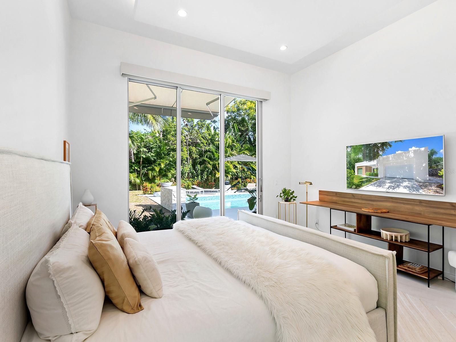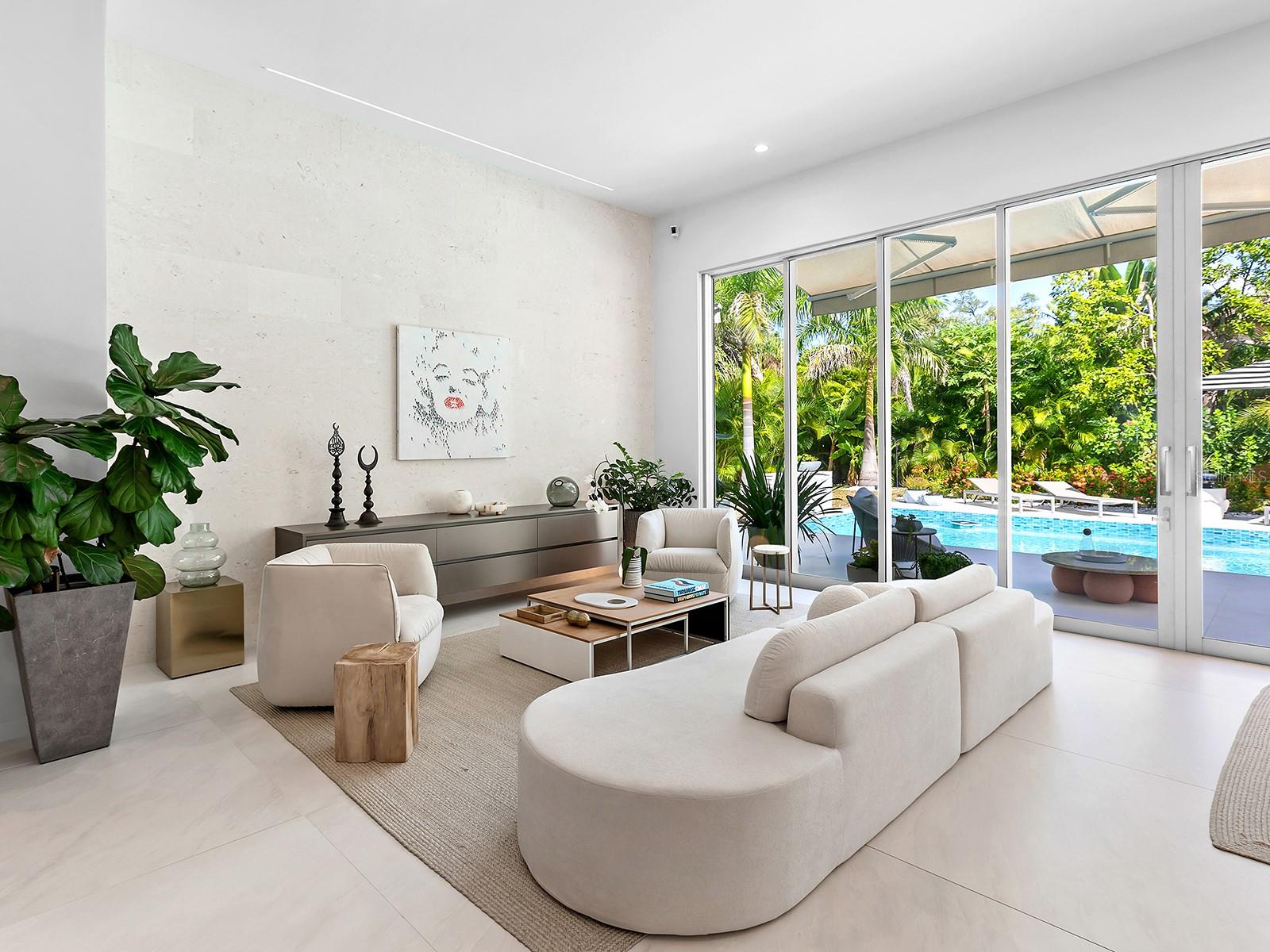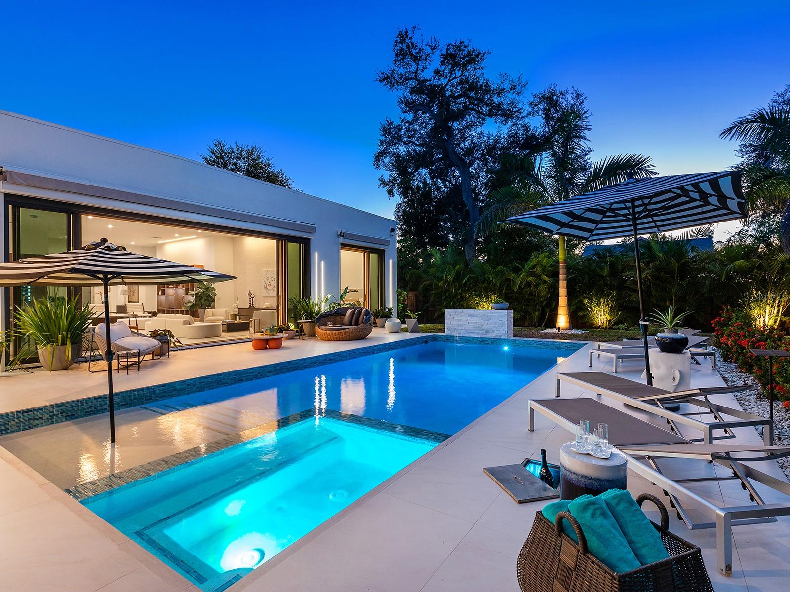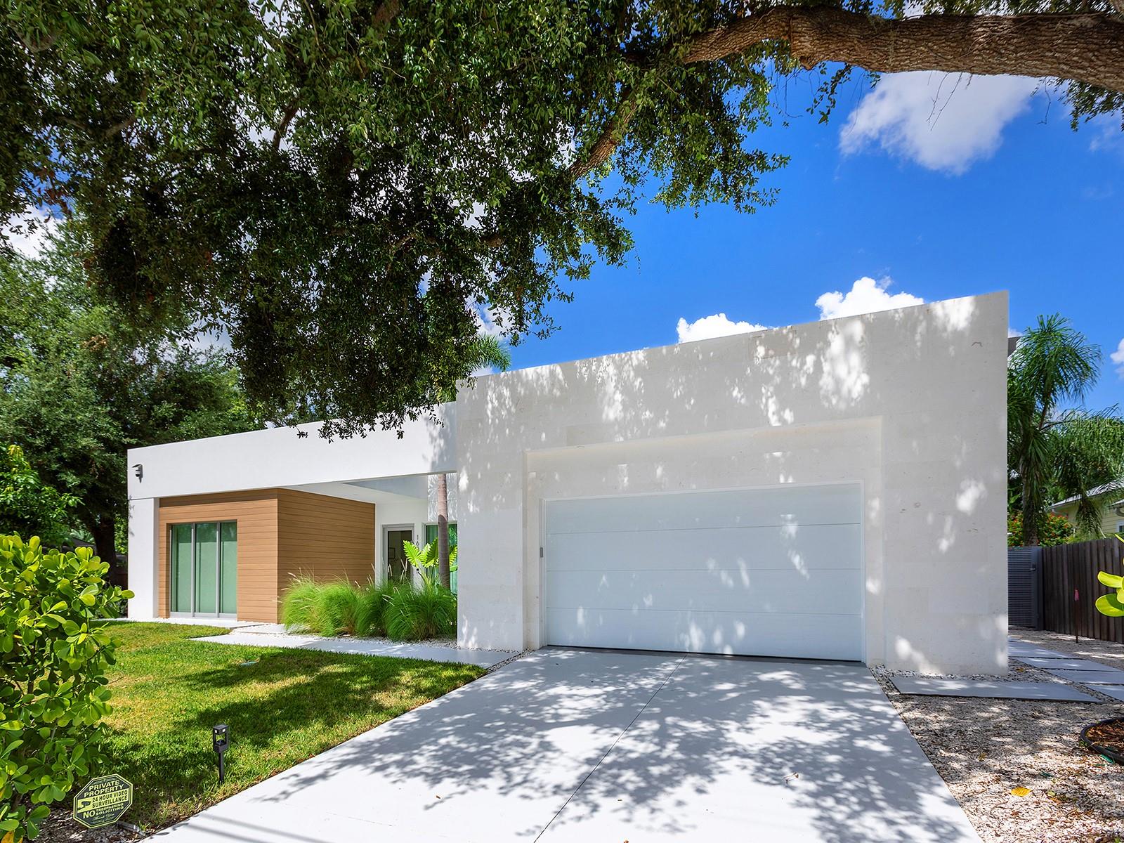 Tucked quietly West of the Trail, just steps from Southside Village, this 2023 custom-built residence blends architectural precision with effortless Sarasota living. Every line, material, and light-filled space reflects intentional design for those who value modern form, privacy, and connection. Behind its limestone and engineered wood facade, the home unfolds in a gallery-like flow of clean lines and calm tones. Inside, the welcoming foyer with its walls of glass leads to the open-concept great room that anchors the home, a space of volume, natural light, complete with multiple seating areas and custom-designed built-ins. Walls of oversized impact glass sliders blur the boundary between interior and exterior, opening to a lushly landscaped sanctuary centered on a smart-controlled pool and spa with a waterfall feature, see-through gas fireplace, and lounging areas framed by tropical greenery. With its cantilevered wood ceiling, remote-controlled awnings and custom lighting, the outdoor spaces are designed for effortless enjoyment, where modern design meets everyday comfort. Blending sleek contemporary design with chef-level performance, the custom kitchen is as beautiful as it is functional, featuring custom Cucine Ricci walnut cabinetry, Moderno Porcelain Works backsplash, and a suite of Miele appliances, including a 6-burner gas stove, Micro/Convection Speed Oven, and Electric Convection Oven. Completing the ensemble are Liebherr Monolith refrigerator and freezer columns, Bosch dual dishwashers, and a 106-bottle dual-zone wine cooler with LED illumination and smart temperature modes. The primary suite, located poolside for ultimate privacy, embodies spa-like serenity. Porcelain slab walls, Grohe and HansGrohe fixtures, a Toto smart commode, and Cucine Ricci vanities define the bath, while a Closets Envy custom walk-in closet and retractable privacy screens add tailored sophistication. The versatile office, accessible through a private street entrance, offers the flexibility today's lifestyle demands--perfect as a home workspace, guest suite, or professional studio. Its thoughtful design allows for easy enclosure to create a fully private, self-contained retreat, complete with a custom Closets Envy wardrobe and ensuite bath showcasing porcelain finishes, Cucine Ricci cabinetry, and high-end fixtures. Two additional guest bedrooms are equally well appointed, each featuring Closets Envy built-ins and abundant natural light. They share a spacious Jack & Jill bathroom with Cucine Ricci cabinetry, porcelain walls, and designer fixtures, complemented by a large-format tile backsplash that extends throughout, creating a cohesive, elevated aesthetic. Throughout the home, fully integrated smart systems manage lighting, climate, security, shading, and irrigation with ease. 48x48 Brazilian porcelain tile flooring, Lutron smart-controlled lighting, and dual-zone Ecobee thermostats ensure seamless comfort and consistency. The two-car garage, clad in matching limestone, includes app-based controls, an integrated camera, and a 220 line for EV charging. Every element of 1631 Hillview Street is crafted to simplify life and elevate every moment--whether entertaining, working from home, or unwinding in quiet privacy. Perfectly situated near Southside Village, downtown Sarasota, and the Gulf beaches, this home captures the essence of refined, effortless modern living.