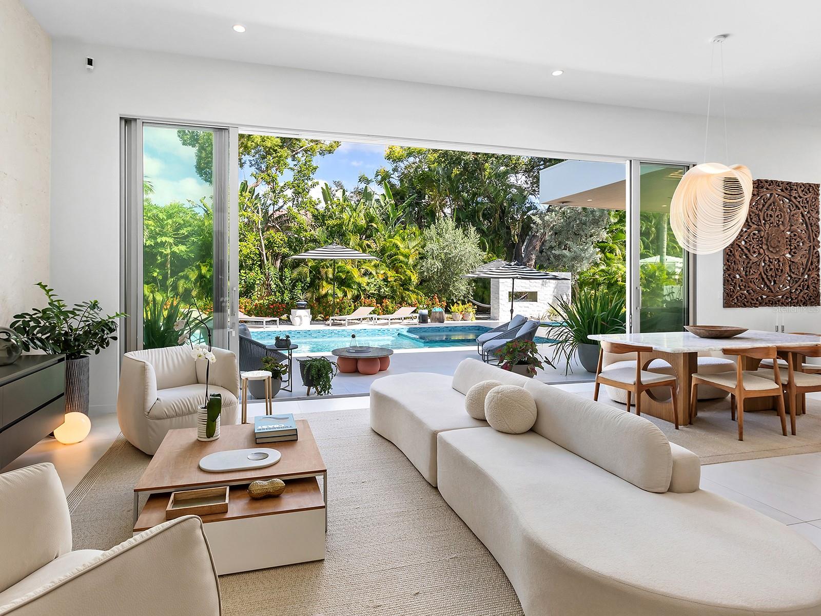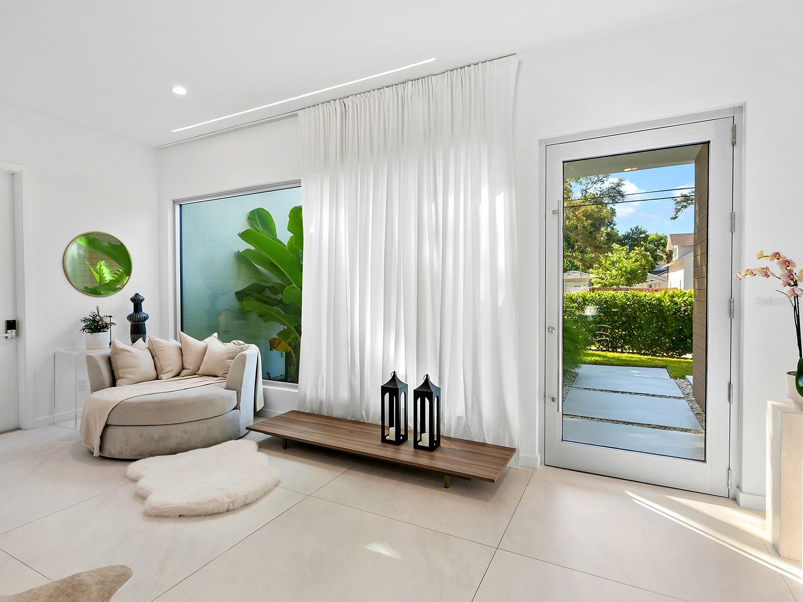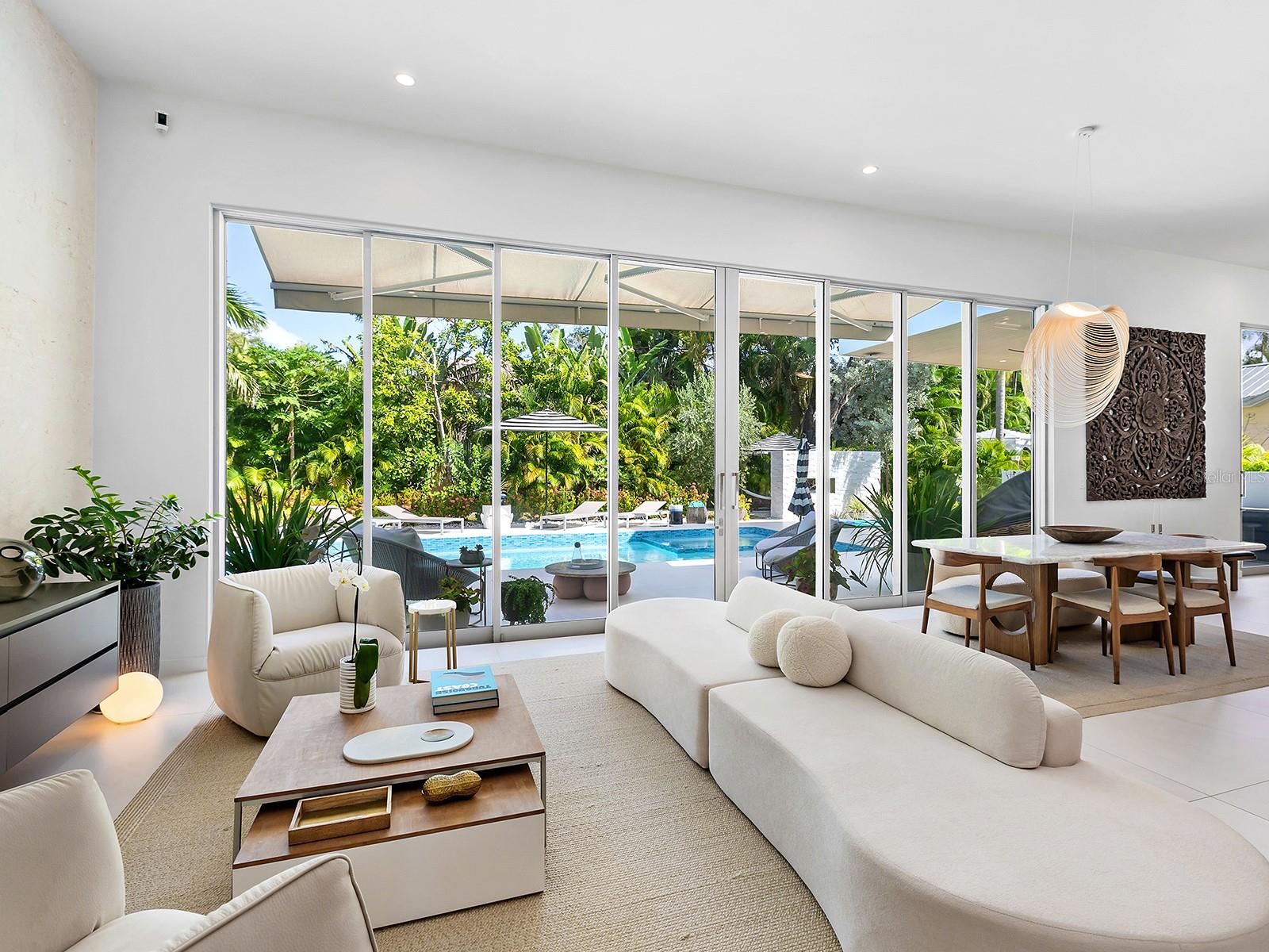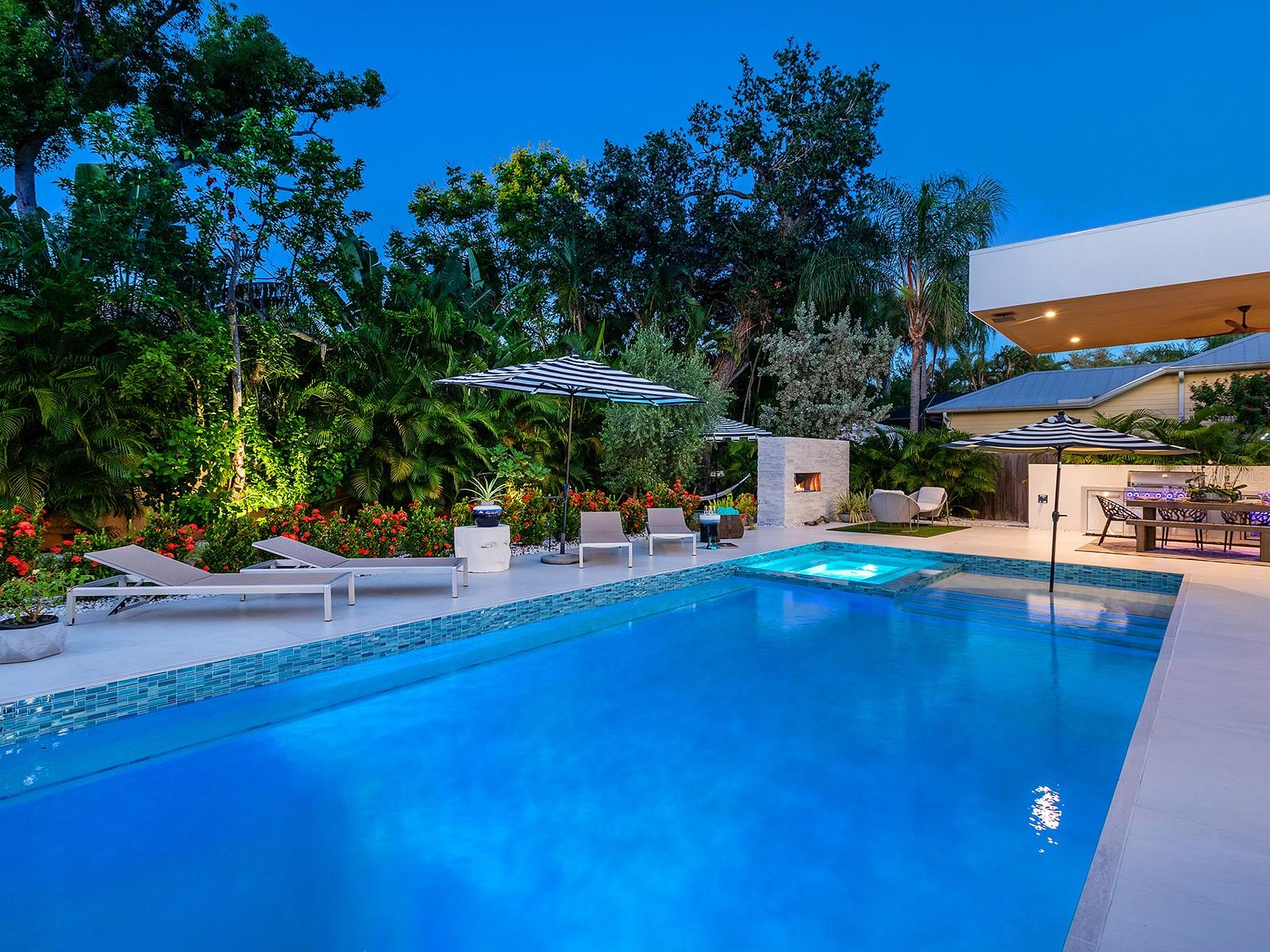 Tucked quietly West of the Trail, just steps from Southside Village, this 2023 custom-built residence blends architectural precision with effortless Sarasota living. Every line, material, and light-filled space reflects intentional design for those who value modern form, privacy, and connection. Behind its limestone and engineered wood facade, the home unfolds in a gallery-like flow of clean lines and calm tones. Inside, the welcoming foyer with its walls of glass leads to the open-concept great room that anchors the home, a space of volume, natural light, complete with multiple seating areas and custom-designed built-ins. Walls of oversized impact glass sliders blur the boundary between interior and exterior, opening to a lushly landscaped sanctuary centered on a smart-controlled pool and spa with a waterfall feature, see-through gas fireplace, and lounging areas framed by tropical greenery. With its cantilevered wood ceiling, remote-controlled awnings and custom lighting, the outdoor spaces are designed for effortless enjoyment, where modern design meets everyday comfort. Blending sleek contemporary design with chef-level performance, the custom kitchen is as beautiful as it is functional, featuring custom Cucine Ricci walnut cabinetry, Moderno Porcelain Works backsplash, and a suite of Miele appliances, including a 6-burner gas stove, Micro/Convection Speed Oven, and Electric Convection Oven. Completing the ensemble are Liebherr Monolith refrigerator and freezer columns, Bosch dual dishwashers, and a 106-bottle dual-zone wine cooler with LED illumination and smart temperature modes. The primary suite, located poolside for ultimate privacy, embodies spa-like serenity. Porcelain slab walls, Grohe and HansGrohe fixtures, a Toto smart commode, and Cucine Ricci vanities define the bath, while a Closets Envy custom walk-in closet and retractable privacy screens add tailored sophistication. The versatile office, accessible through a private street entrance, offers the flexibility today's lifestyle demands--perfect as a home workspace, guest suite, or professional studio. Its thoughtful design allows for easy enclosure to create a fully private, self-contained retreat, complete with a custom Closets Envy wardrobe and ensuite bath showcasing porcelain finishes, Cucine Ricci cabinetry, and high-end fixtures. Two additional guest bedrooms are equally well appointed, each featuring Closets Envy built-ins and abundant natural light. They share a spacious Jack & Jill bathroom with Cucine Ricci cabinetry, porcelain walls, and designer fixtures, complemented by a large-format tile backsplash that extends throughout, creating a cohesive, elevated aesthetic. Throughout the home, fully integrated smart systems manage lighting, climate, security, shading, and irrigation with ease. 48x48 Brazilian porcelain tile flooring, Lutron smart-controlled lighting, and dual-zone Ecobee thermostats ensure seamless comfort and consistency. The two-car garage, clad in matching limestone, includes app-based controls, an integrated camera, and a 220 line for EV charging. Every element of 1631 Hillview Street is crafted to simplify life and elevate every moment--whether entertaining, working from home, or unwinding in quiet privacy. Perfectly situated near Southside Village, downtown Sarasota, and the Gulf beaches, this home captures the essence of refined, effortless modern living.