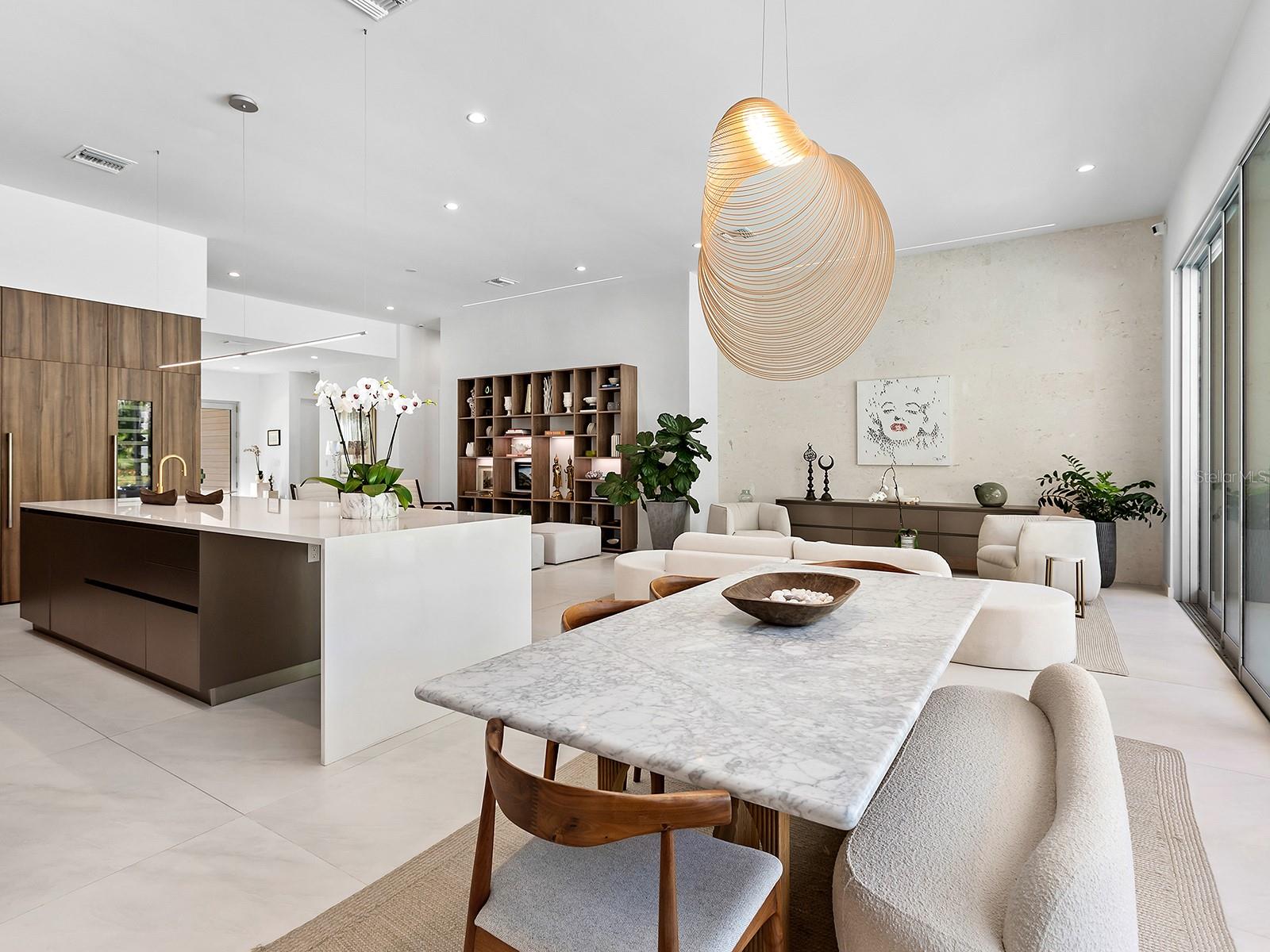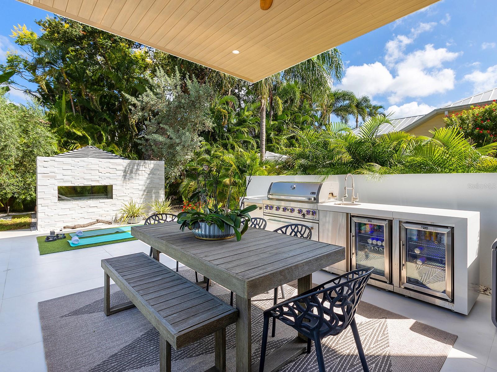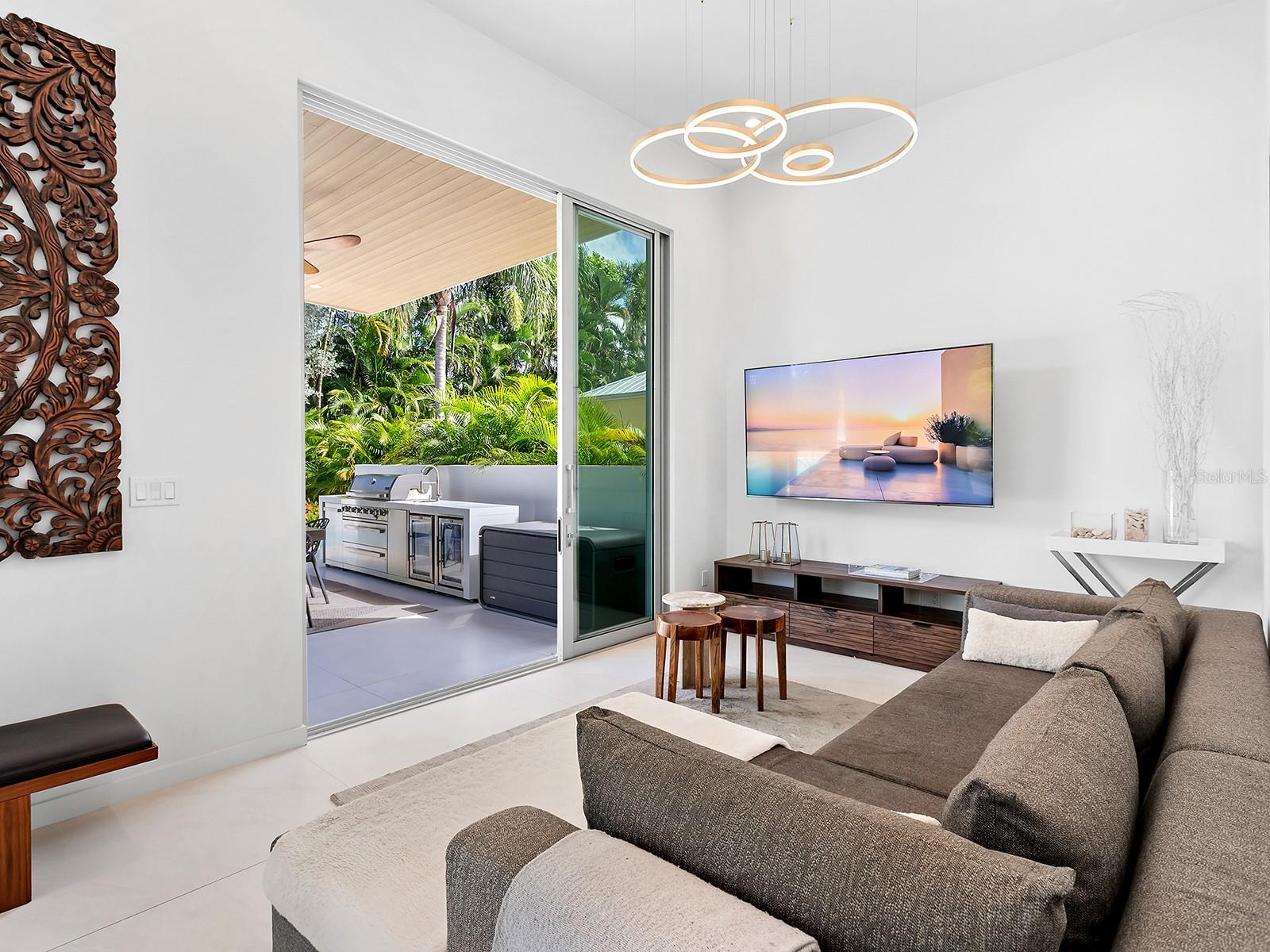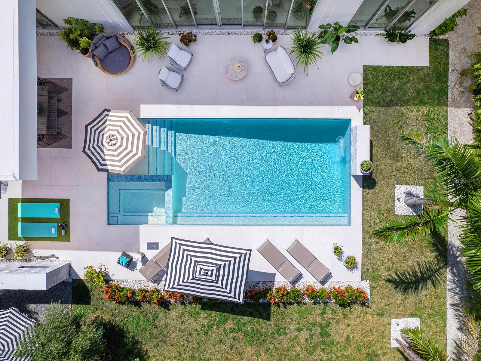 Tucked quietly West of the Trail, just steps from Southside Village, this 2023 custom-built residence blends architectural precision with effortless Sarasota living. Every line, material, and light-filled space reflects intentional design for those who value modern form, privacy, and connection. Behind its limestone and engineered wood facade, the home unfolds in a gallery-like flow of clean lines and calm tones. Inside, the welcoming foyer with its walls of glass leads to the open-concept great room that anchors the home, a space of volume, natural light, complete with multiple seating areas and custom-designed built-ins. Walls of oversized impact glass sliders blur the boundary between interior and exterior, opening to a lushly landscaped sanctuary centered on a smart-controlled pool and spa with a waterfall feature, see-through gas fireplace, and lounging areas framed by tropical greenery. With its cantilevered wood ceiling, remote-controlled awnings and custom lighting, the outdoor spaces are designed for effortless enjoyment, where modern design meets everyday comfort. Blending sleek contemporary design with chef-level performance, the custom kitchen is as beautiful as it is functional, featuring custom Cucine Ricci walnut cabinetry, Moderno Porcelain Works backsplash, and a suite of Miele appliances, including a 6-burner gas stove, Micro/Convection Speed Oven, and Electric Convection Oven. Completing the ensemble are Liebherr Monolith refrigerator and freezer columns, Bosch dual dishwashers, and a 106-bottle dual-zone wine cooler with LED illumination and smart temperature modes. The primary suite, located poolside for ultimate privacy, embodies spa-like serenity. Porcelain slab walls, Grohe and HansGrohe fixtures, a Toto smart commode, and Cucine Ricci vanities define the bath, while a Closets Envy custom walk-in closet and retractable privacy screens add tailored sophistication. The versatile office, accessible through a private street entrance, offers the flexibility today's lifestyle demands--perfect as a home workspace, guest suite, or professional studio. Its thoughtful design allows for easy enclosure to create a fully private, self-contained retreat, complete with a custom Closets Envy wardrobe and ensuite bath showcasing porcelain finishes, Cucine Ricci cabinetry, and high-end fixtures. Two additional guest bedrooms are equally well appointed, each featuring Closets Envy built-ins and abundant natural light. They share a spacious Jack & Jill bathroom with Cucine Ricci cabinetry, porcelain walls, and designer fixtures, complemented by a large-format tile backsplash that extends throughout, creating a cohesive, elevated aesthetic. Throughout the home, fully integrated smart systems manage lighting, climate, security, shading, and irrigation with ease. 48x48 Brazilian porcelain tile flooring, Lutron smart-controlled lighting, and dual-zone Ecobee thermostats ensure seamless comfort and consistency. The two-car garage, clad in matching limestone, includes app-based controls, an integrated camera, and a 220 line for EV charging. Every element of 1631 Hillview Street is crafted to simplify life and elevate every moment--whether entertaining, working from home, or unwinding in quiet privacy. Perfectly situated near Southside Village, downtown Sarasota, and the Gulf beaches, this home captures the essence of refined, effortless modern living.