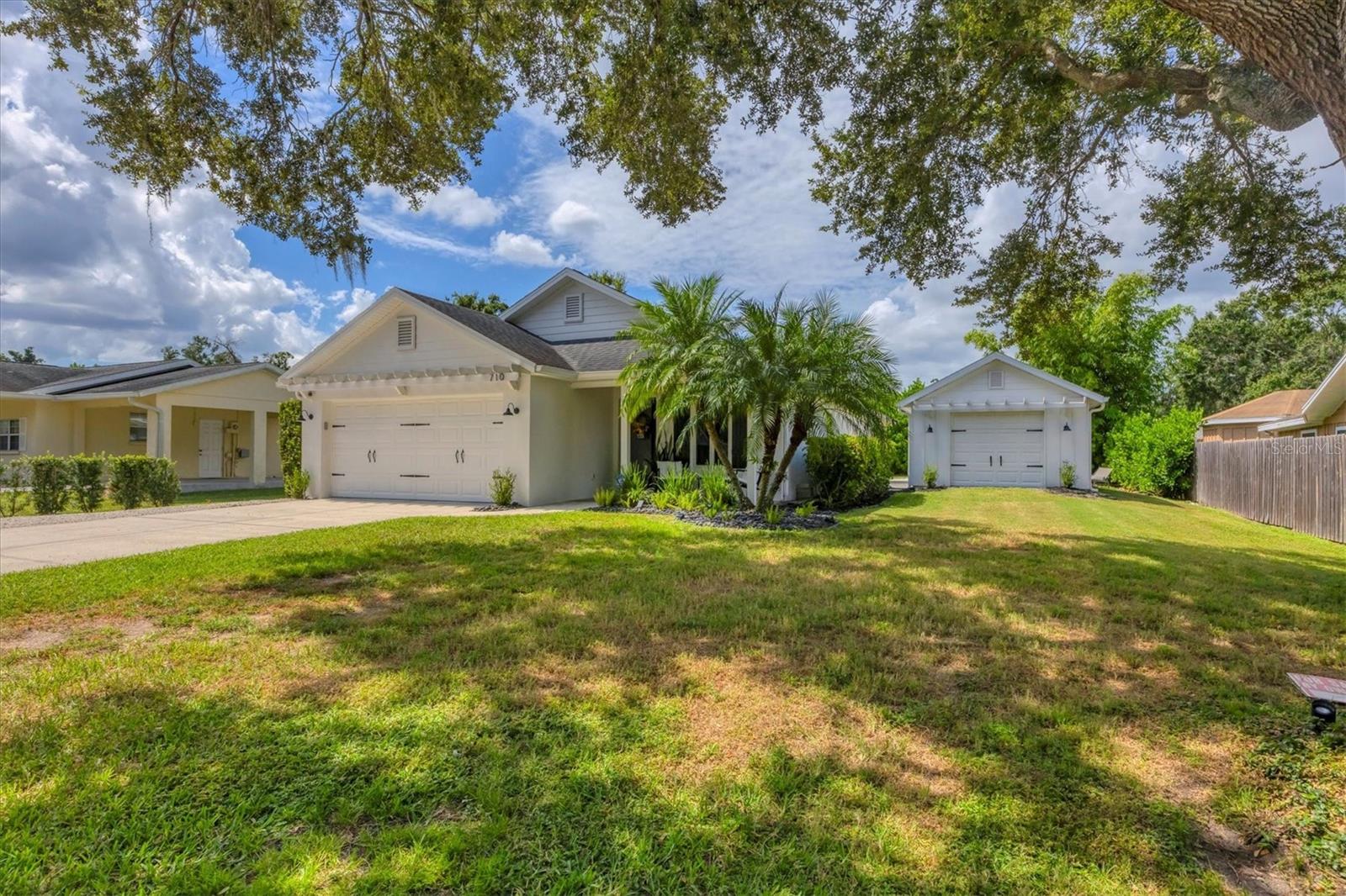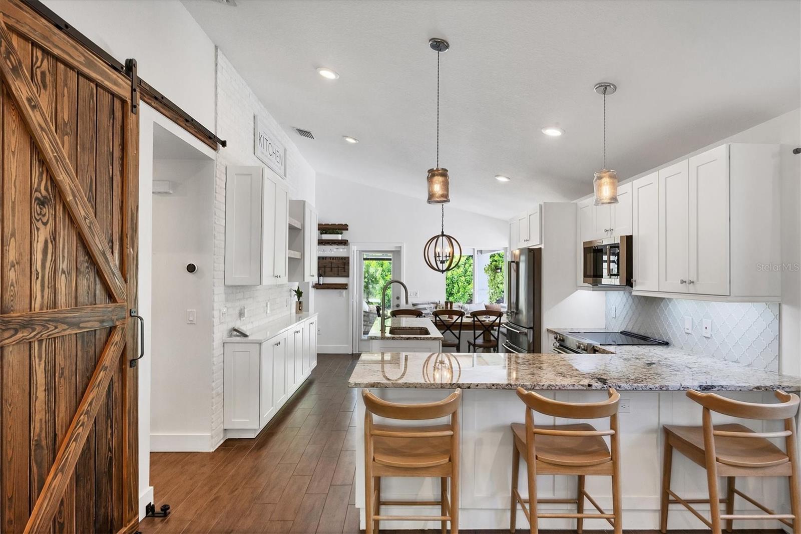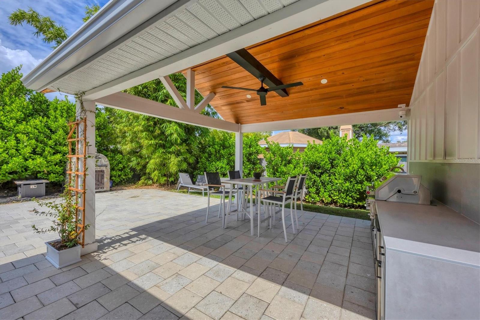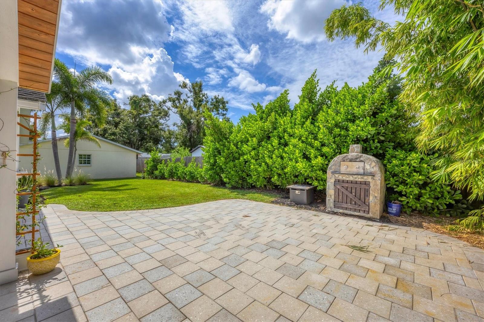 This Charming 3-Bedroom, 2-Bath Home with 2-car garage plus a detached shed/workshop combines High End Craftsmanship with Modern Farmhouse Style. Built by a local builder with meticulous attention to detail, every space in this home was thoughtfully designed for comfort, style, and function. Step inside to find custom touches throughout, including wood-inlaid ceilings on front porch and outdoor covered living areas, a sliding barn door separating the living area from the bedrooms, a built-in dining bench with storage, shiplap wall details in the Primary Suite, detailed trim in the second bedroom, and a built-in desk in the third bedroom, perfect for a home office or study space. The heart of the home is the spacious kitchen, featuring custom wood cabinetry, granite countertops, New Stainless Appliances, an island, a breakfast bar with seating, and an adjacent Dining Area with adorable and functional bench for family dinners or friendly gatherings. The Primary Suite is a retreat of its own with a stunning bathroom showcasing marble floors and marble tile shower, and custom dual vanity with marble tops. Two guest bedrooms share a stylish bath with marble top vanity and a tub/shower combination. Outdoor living is just as impressive. A covered entertainment area provides plenty of room for lounging and dining, complete with outdoor kitchen (grill and beverage cooler), while fenced backyard offers a wood-fired pizza oven-a dream for entertaining. Energy efficiency is built with solar panels that power appliances, New Tankless hot water heater, AC, and lighting, making this home as smart as it is beautiful, with extremely low energy costs. Also, Hurricane Impact Windows throughout the home provides peace of mind! The fenced yard also features an outdoor private shower, irrigation system, and a large lot providing privacy and function for pets, gardening, or family play. Located in the heart of Sarasota, this home is just minutes from top-rated schools, downtown Sarasota, I-75, University Town Center, award winning restaurants, shopping, and the world-renowned Lido Key and Siesta Key Beaches. This One-of-a-Kind property blends thoughtful design, modern efficiency, and timeless style. Don't miss your chance to call it Yours!