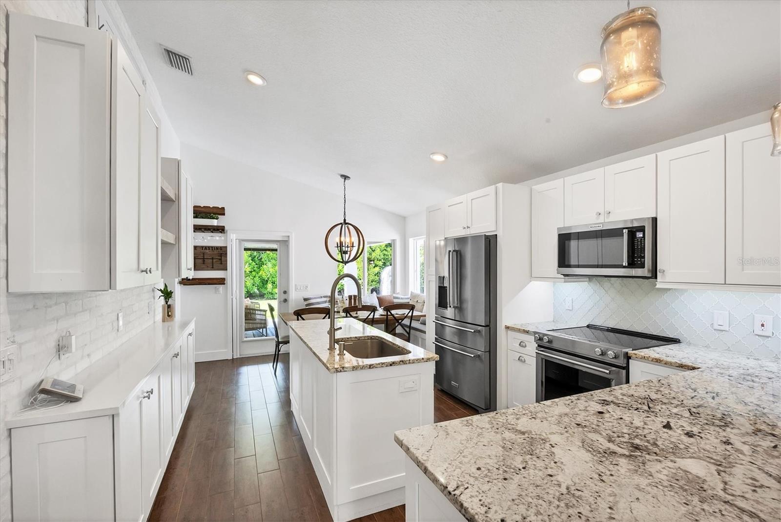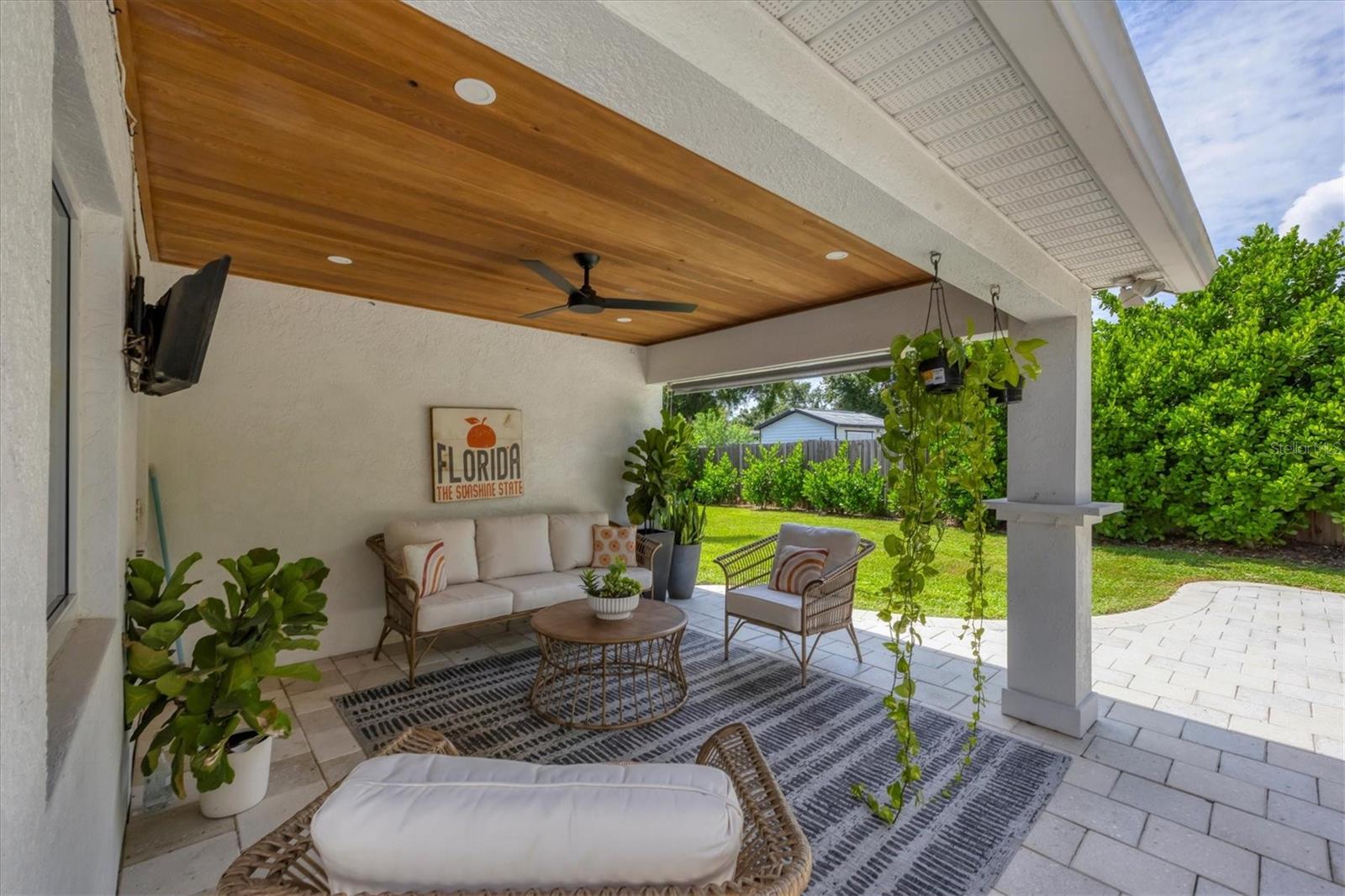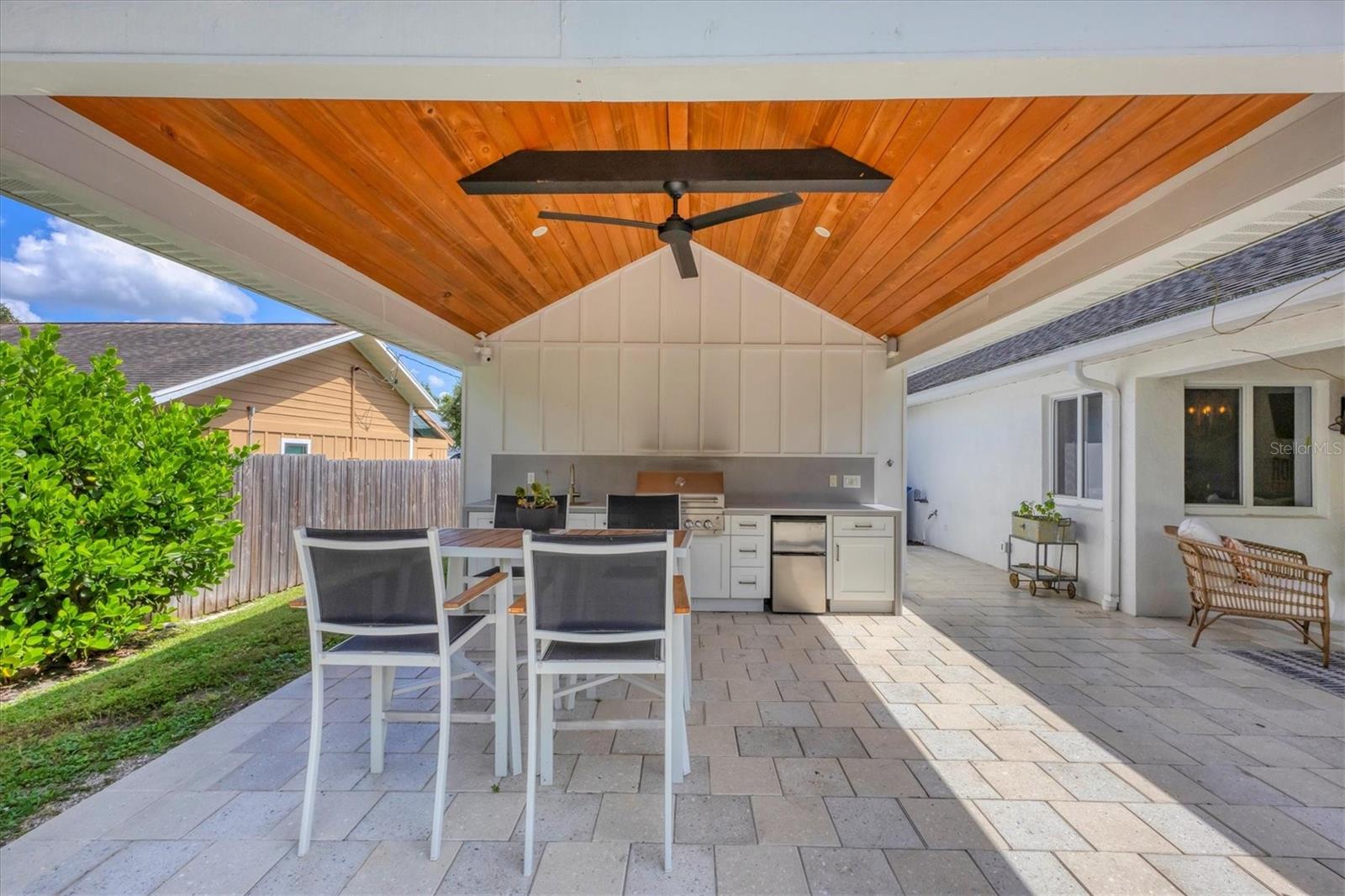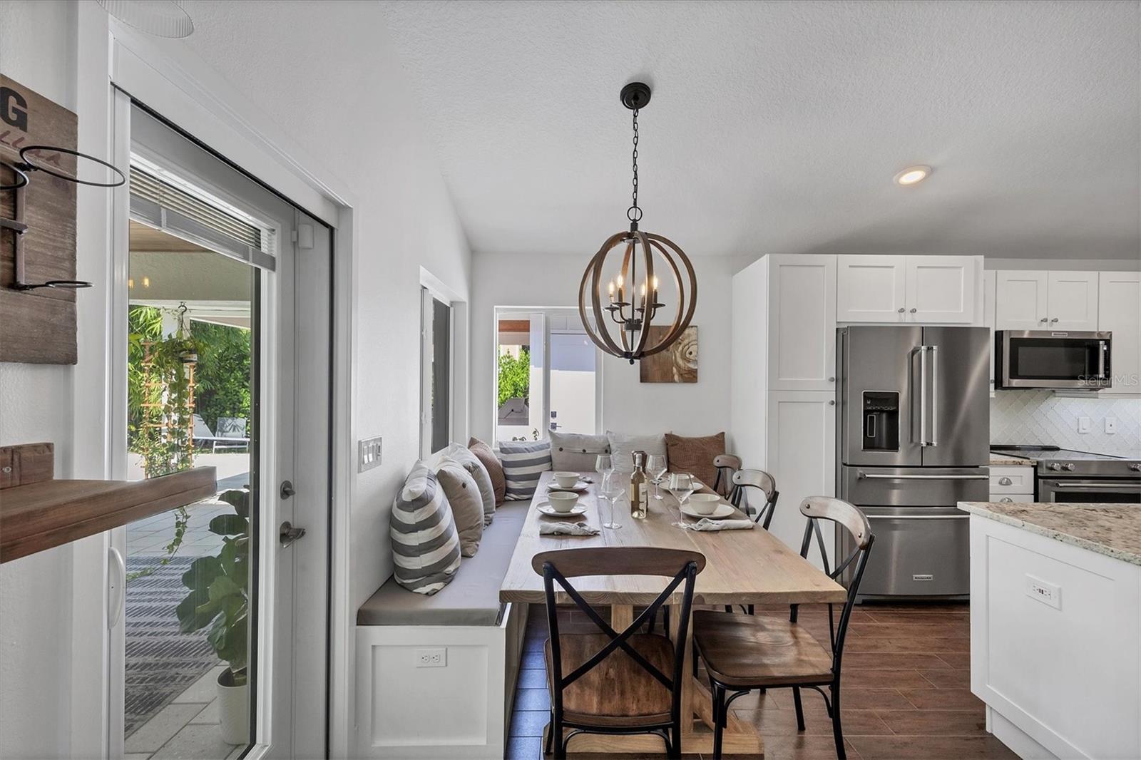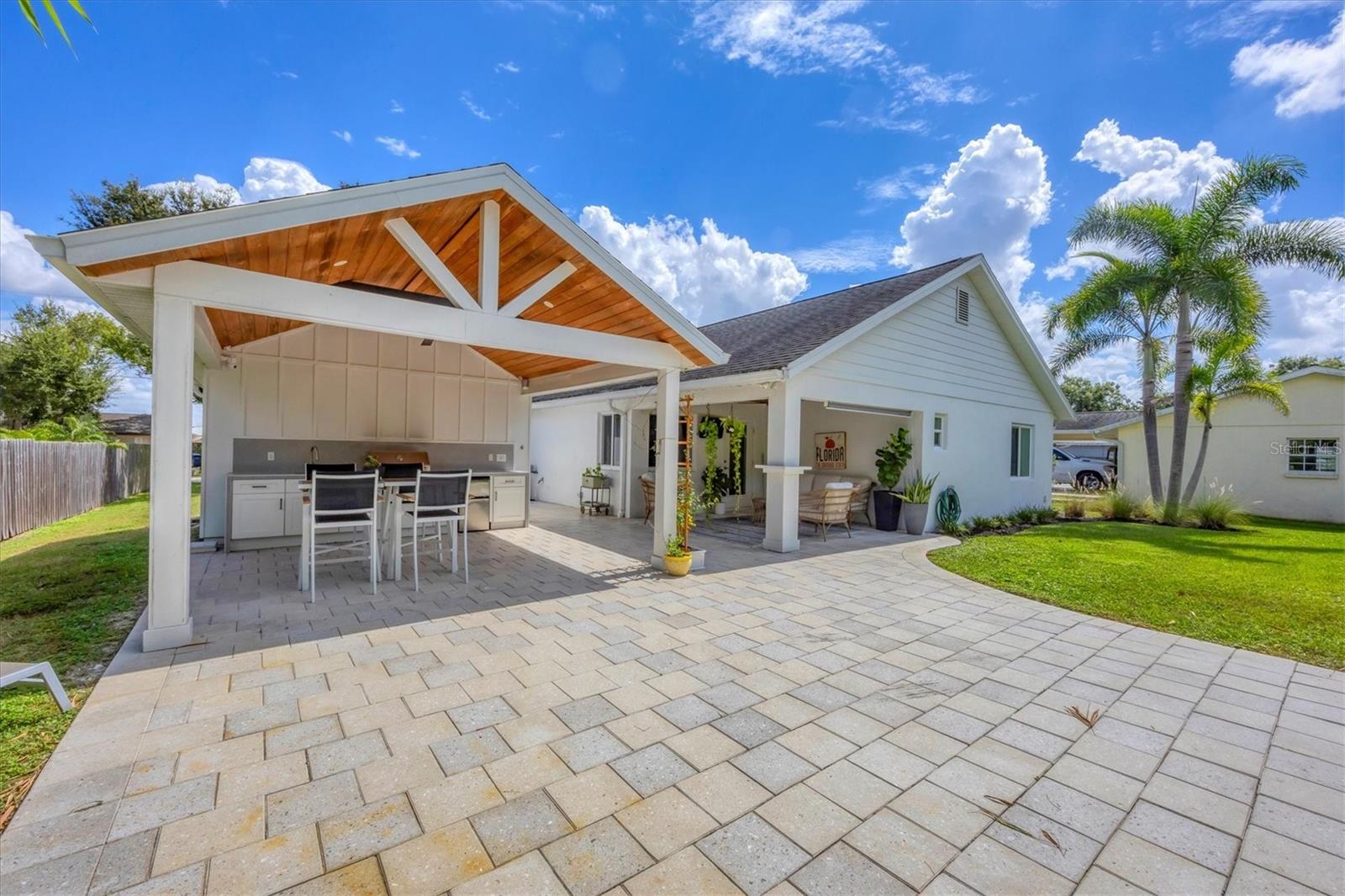 This Charming 3-Bedroom, 2-Bath Home with 2-car garage plus a detached shed/workshop combines High End Craftsmanship with Modern Farmhouse Style. Built by a local builder with meticulous attention to detail, every space in this home was thoughtfully designed for comfort, style, and function. Step inside to find custom touches throughout, including wood-inlaid ceilings on front porch and outdoor covered living areas, a sliding barn door separating the living area from the bedrooms, a built-in dining bench with storage, shiplap wall details in the Primary Suite, detailed trim in the second bedroom, and a built-in desk in the third bedroom, perfect for a home office or study space. The heart of the home is the spacious kitchen, featuring custom wood cabinetry, granite countertops, New Stainless Appliances, an island, a breakfast bar with seating, and an adjacent Dining Area with adorable and functional bench for family dinners or friendly gatherings. The Primary Suite is a retreat of its own with a stunning bathroom showcasing marble floors and marble tile shower, and custom dual vanity with marble tops. Two guest bedrooms share a stylish bath with marble top vanity and a tub/shower combination. Outdoor living is just as impressive. A covered entertainment area provides plenty of room for lounging and dining, complete with outdoor kitchen (grill and beverage cooler), while fenced backyard offers a wood-fired pizza oven-a dream for entertaining. Energy efficiency is built with solar panels that power appliances, New Tankless hot water heater, AC, and lighting, making this home as smart as it is beautiful, with extremely low energy costs. Also, Hurricane Impact Windows throughout the home provides peace of mind! The fenced yard also features an outdoor private shower, irrigation system, and a large lot providing privacy and function for pets, gardening, or family play. Located in the heart of Sarasota, this home is just minutes from top-rated schools, downtown Sarasota, I-75, University Town Center, award winning restaurants, shopping, and the world-renowned Lido Key and Siesta Key Beaches. This One-of-a-Kind property blends thoughtful design, modern efficiency, and timeless style. Don't miss your chance to call it Yours!