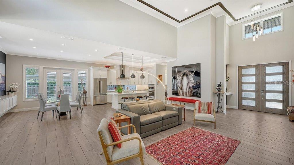 An exceptional single-story Allegra home in Sarasota's coveted West of Trail Flower Streets, perfectly positioned within the Southside School district and just steps from the charming Southside Village restaurants, shops, and Morton's Gourmet Market. This impeccably designed 3-bedroom + office + bonus room, 2.5-bathroom home epitomizes modern coastal living and showcases the esteemed Kristi Ann single story floor plan, offering a seamless blend of sophisticated design and everyday functionality, making it an ideal primary or seasonal residence. From the moment you step through the double doors, you'll be captivated by the open and inviting main living space. The soaring 18-foot ceiling and wall of expansive 10-foot pocketing sliders draw you towards the resort-like outdoor retreat, perfect for relaxing or entertaining. The living room is a true architectural masterpiece, featuring a dramatic floating tray ceiling with Halo-LED lighting and a focal wall complete with a remote-controlled electric fireplace. The chef's kitchen is as functional as it is stylish, equipped with stainless steel appliances, a 5-burner gas range, Quartz island and countertops, and a generous walk-in pantry. The dining area, both intimate and elegant, includes a built-in Quartz-topped buffet, creating a serene space for family meals or hosting guests. The primary suite offers a tranquil escape, with vaulted ceiling accented by charming wood beams. The spacious custom walk-in closet ensures ample storage, while the spa-like en-suite bathroom, featuring glass-enclosed shower and designer tile, is the perfect respite after a long day. Two additional large guest bedrooms, along with a well-appointed guest bathroom and powder room, offer comfort and privacy for family or visitors. This award-winning floorplan also boasts a dedicated office, versatile bonus room, laundry room, and a 2-car garage with added storage, meeting the needs of modern living. Step outside and discover an expansive lanai with a resort-style heated pool, spa, and impressive summer kitchen, all surrounded by lush landscaping and illuminated by custom lighting. The disappearing corner sliders seamlessly blend indoor and outdoor spaces, offering the quintessential Sarasota lifestyle. This home is packed with custom features, including designer lighting and built-ins, PGT impact windows, solid-core interior doors, and spray foam insulation for optimal energy efficiency. Recent upgrades include remote-controlled Kevlar shades for additional hurricane protection/storage for outside furnishings/sunshade, new AC unit with UV lights, 2023 mini split AC unit in the garage, and a whole-home in-duct air purifier, ensuring comfort and peace of mind. This impeccably crafted residence captures the essence of Southside Village living, offering a single-level floor plan that balances everyday comfort with refined style. Ideally positioned near Southside School, Sarasota Memorial Hospital, Downtown Sarasota, and Siesta Key Beach, it delivers the ultimate blend of location, luxury, and lifestyle. Built to the latest hurricane codes and outside the flood zone, the home provides peace of mind along with timeless design. Every detail has been thoughtfully curated, creating an exceptional opportunity for discerning buyers to experience the best of Sarasota living in a true single-story gem.