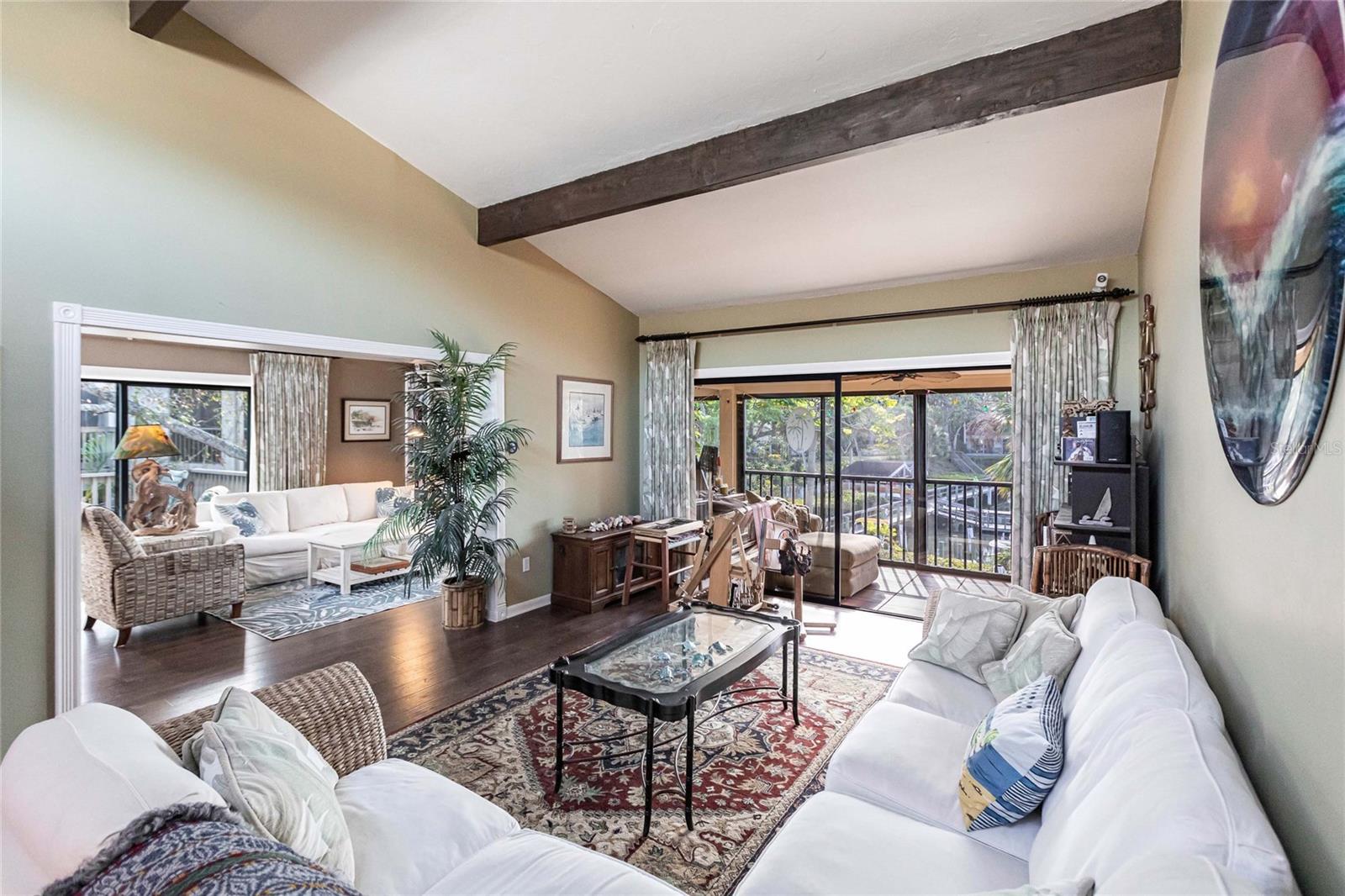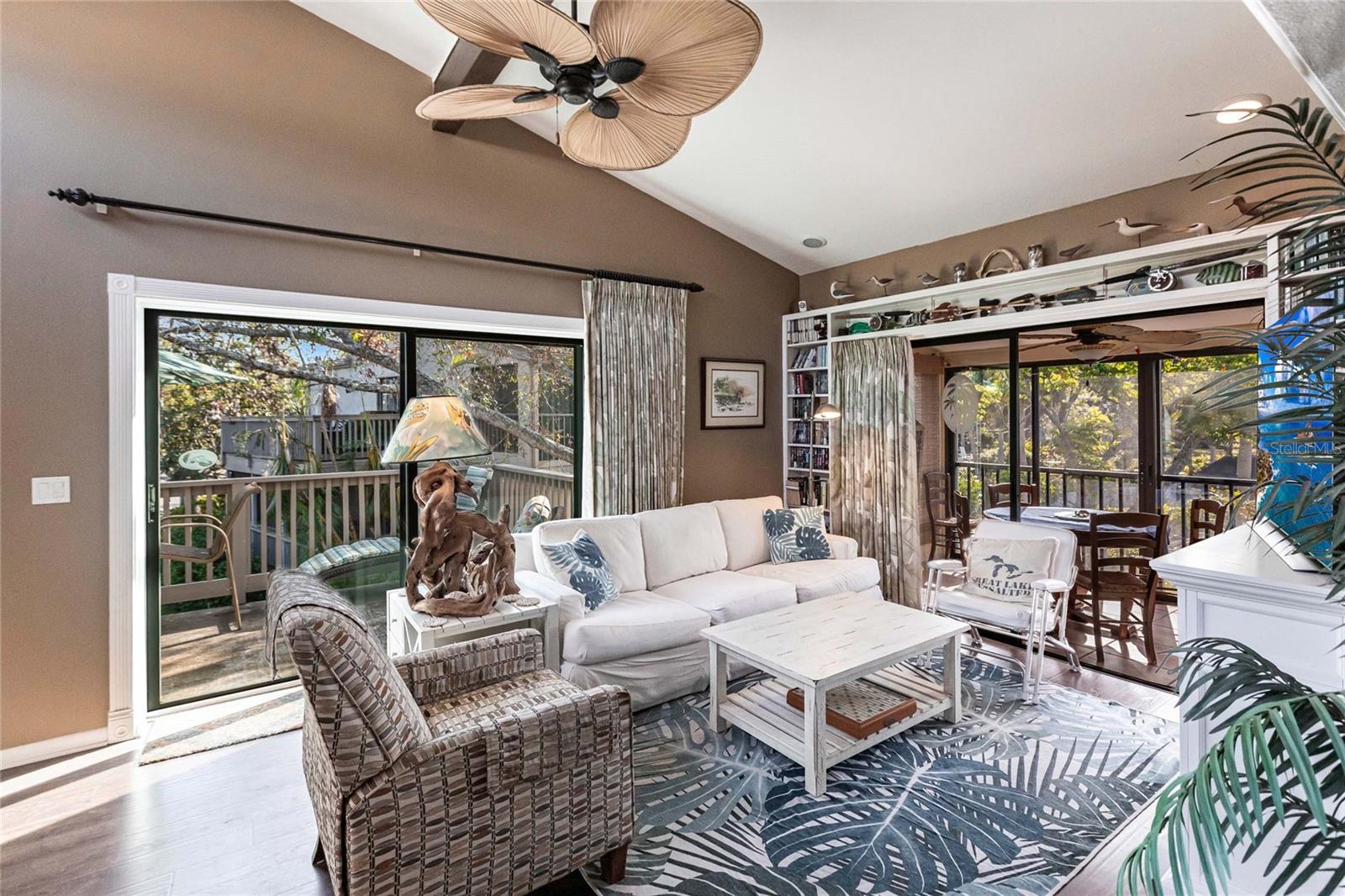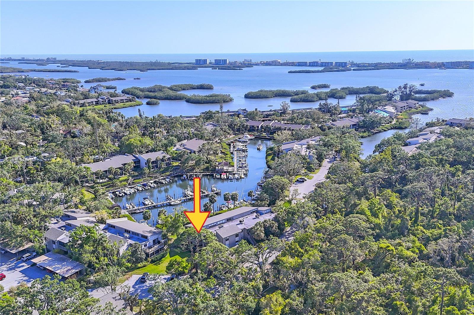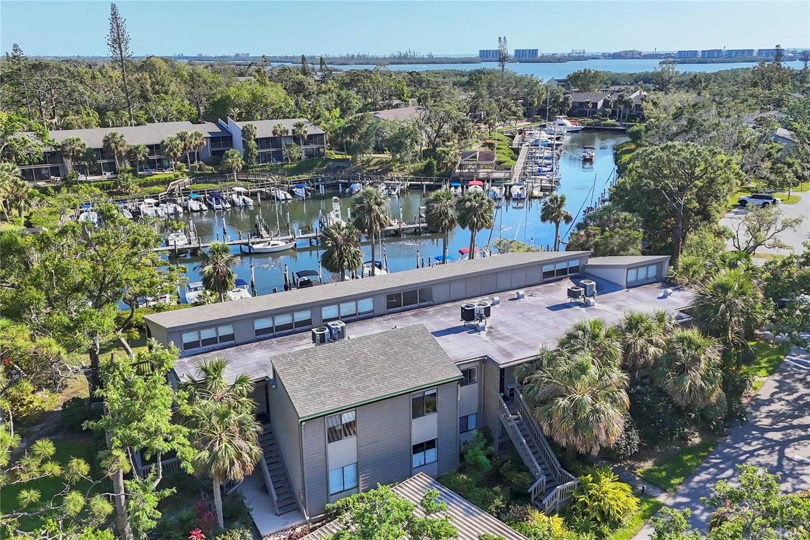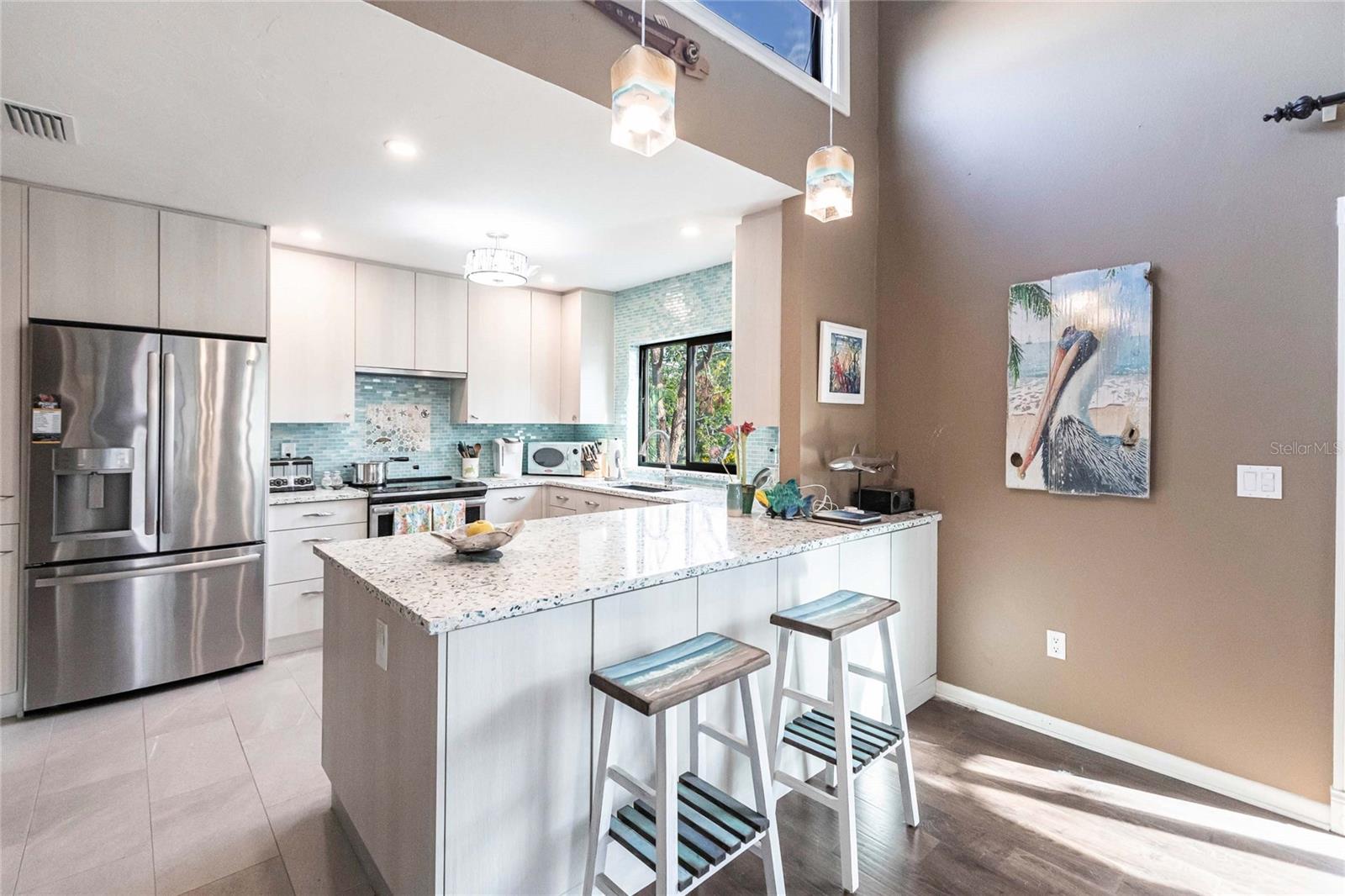 Harborfront (marina) views from this 3BR/2B + Family Room floorplan! This floorplan is rarely available and offers space and natural light that truly feels like a home and not a condo. Features include neutral tile and handsome laminate wood-look flooring, an opened-up and beautifully updated showcase kitchen in a coastal theme. Tiger grey cabinetry, stainless appliances, and striking recycled blue-bottle granite counters with huge kitchen window bring in the light and coastal feel. The kitchen with breakfast bar overlooks the family room. The family room, living room, and all three bedrooms have vaulted ceilings with high clerestory windows for added light. The family room, living room, and oversized primary bedroom step out to the sliding glass-enclosed lanai. The primary bathroom was updated featuring an expanded bathroom footprint. Relax on your rear 36' lanai and look down directly at the 87-slip boat harbor with excellent water views or step out on the side onto your 8' x 25' open deck to enjoy the fresh air. Some furniture can be included in this sale. Pelican Cove is less than one mile from Costco, grocery, restaurants, and shopping and 3 miles to Siesta Key. PELICAN COVE FEATURES includes over 28+ organized clubs including art & sculpture, active yacht club, folk music, photography & cinema clubs, social clubs, and many more. There is a for-fun "Pelican Cove University" covering several diverse subjects, woodworking studio, many card-playing clubs, water exercise and yoga, and a tennis club. There are several yearly jazz, musical, and cultural concerts and a few harborside concerts as well. Pelican Cove has a 24-hour gated and staffed entrance, 87-slip boat harbor with over 130 kayak/canoe storage racks & launch docks, fishing docks, three active clubhouses, exercise room, six heated pools, hot tub, basketball, dog walk area, 5.5 miles of meandering boardwalks & nature trails, two lighted tennis courts and eight lighted pickleball courts all in an award-winning community with unbelievably well-manicured tropical grounds! Welcome to Pelican Cove!