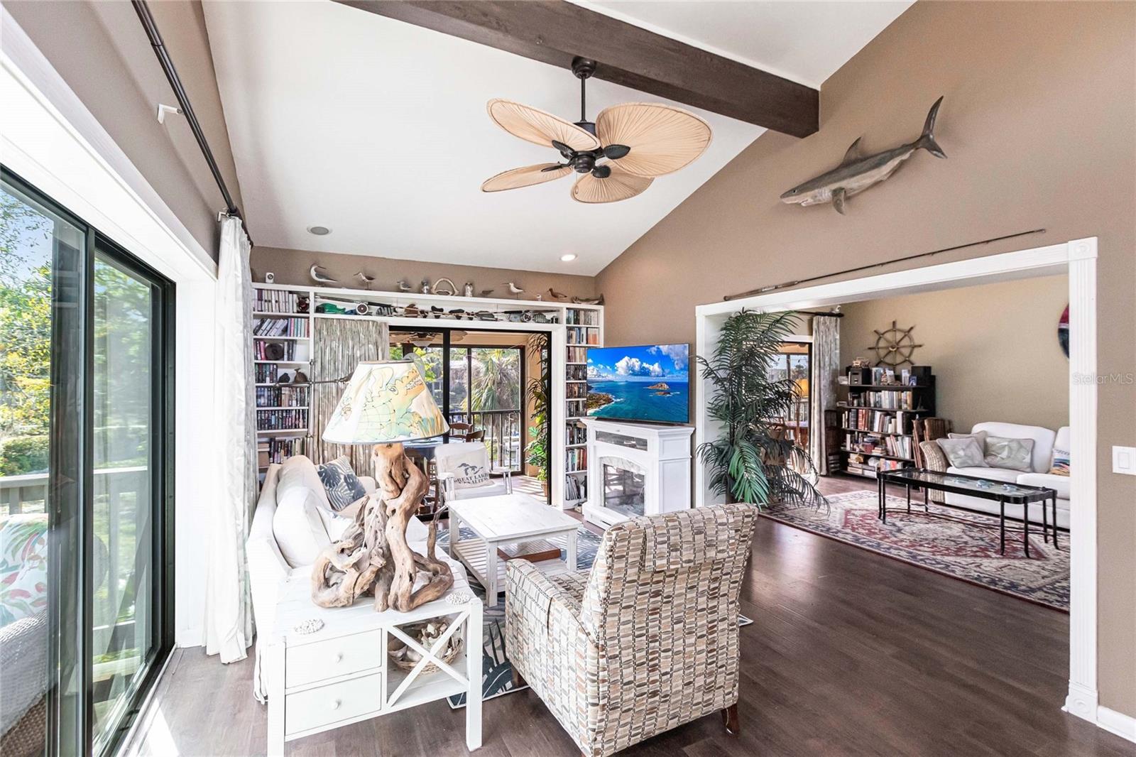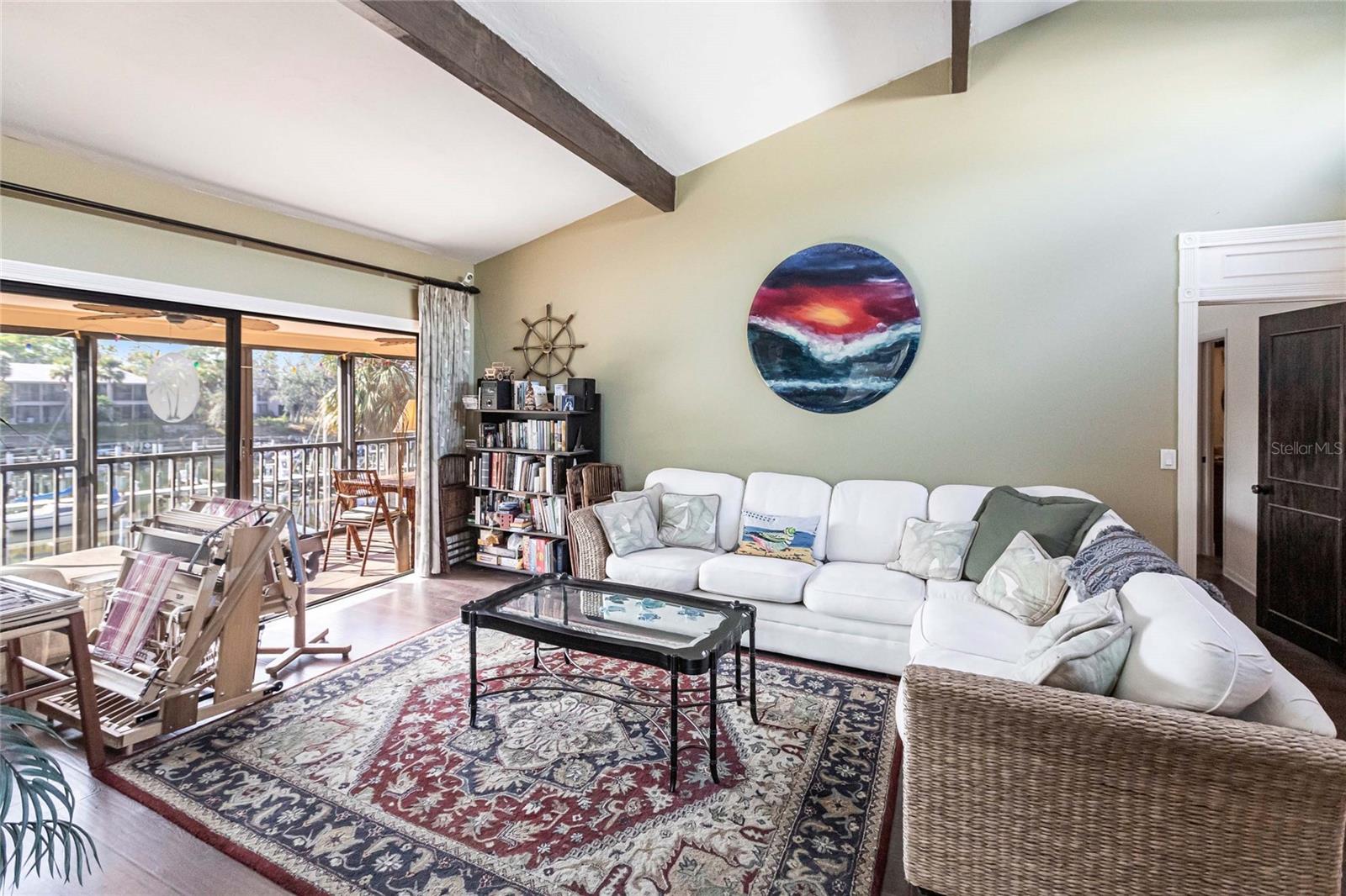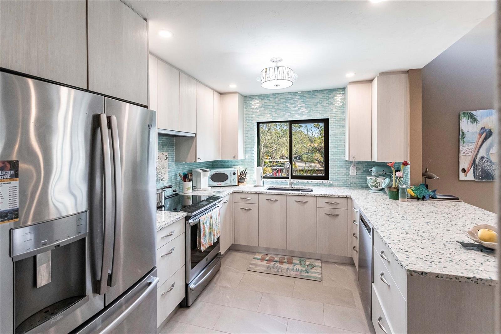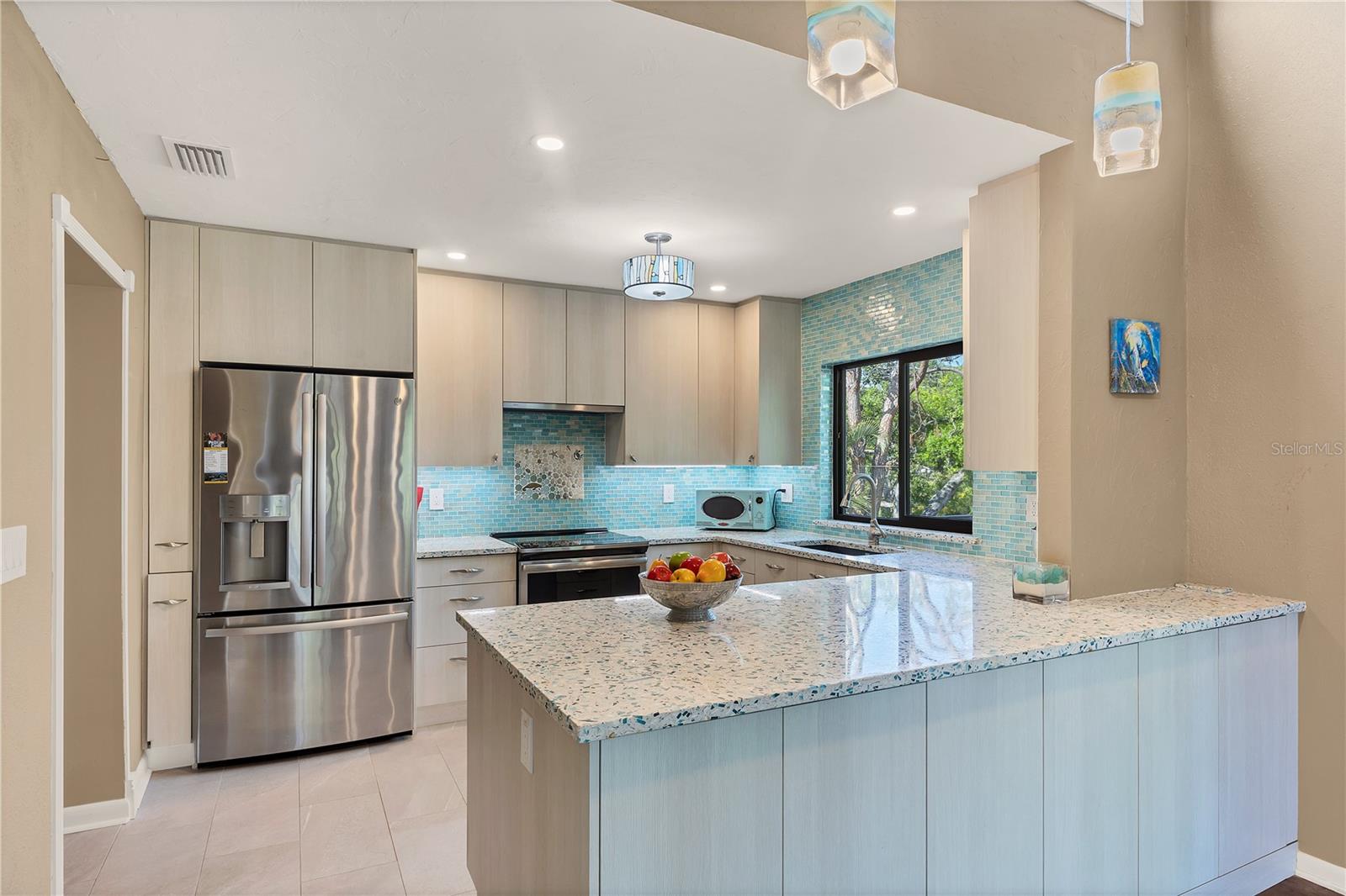 Harborfront (marina) views from this 3BR/2B + Family Room floorplan! This floorplan is rarely available and offers space and natural light that truly feels like a home and not a condo. Features include neutral tile and handsome laminate wood-look flooring, an opened-up and beautifully updated showcase kitchen in a coastal theme. Tiger grey cabinetry, stainless appliances, and striking recycled blue-bottle granite counters with huge kitchen window bring in the light and coastal feel. The kitchen with breakfast bar overlooks the family room. The family room, living room, and all three bedrooms have vaulted ceilings with high clerestory windows for added light. The family room, living room, and oversized primary bedroom step out to the sliding glass-enclosed lanai. The primary bathroom was updated featuring an expanded bathroom footprint. Relax on your rear 36' lanai and look down directly at the 87-slip boat harbor with excellent water views or step out on the side onto your 8' x 25' open deck to enjoy the fresh air. Some furniture can be included in this sale. Pelican Cove is less than one mile from Costco, grocery, restaurants, and shopping and 3 miles to Siesta Key. PELICAN COVE FEATURES includes over 28+ organized clubs including art & sculpture, active yacht club, folk music, photography & cinema clubs, social clubs, and many more. There is a for-fun "Pelican Cove University" covering several diverse subjects, woodworking studio, many card-playing clubs, water exercise and yoga, and a tennis club. There are several yearly jazz, musical, and cultural concerts and a few harborside concerts as well. Pelican Cove has a 24-hour gated and staffed entrance, 87-slip boat harbor with over 130 kayak/canoe storage racks & launch docks, fishing docks, three active clubhouses, exercise room, six heated pools, hot tub, basketball, dog walk area, 5.5 miles of meandering boardwalks & nature trails, two lighted tennis courts and eight lighted pickleball courts all in an award-winning community with unbelievably well-manicured tropical grounds! Welcome to Pelican Cove!