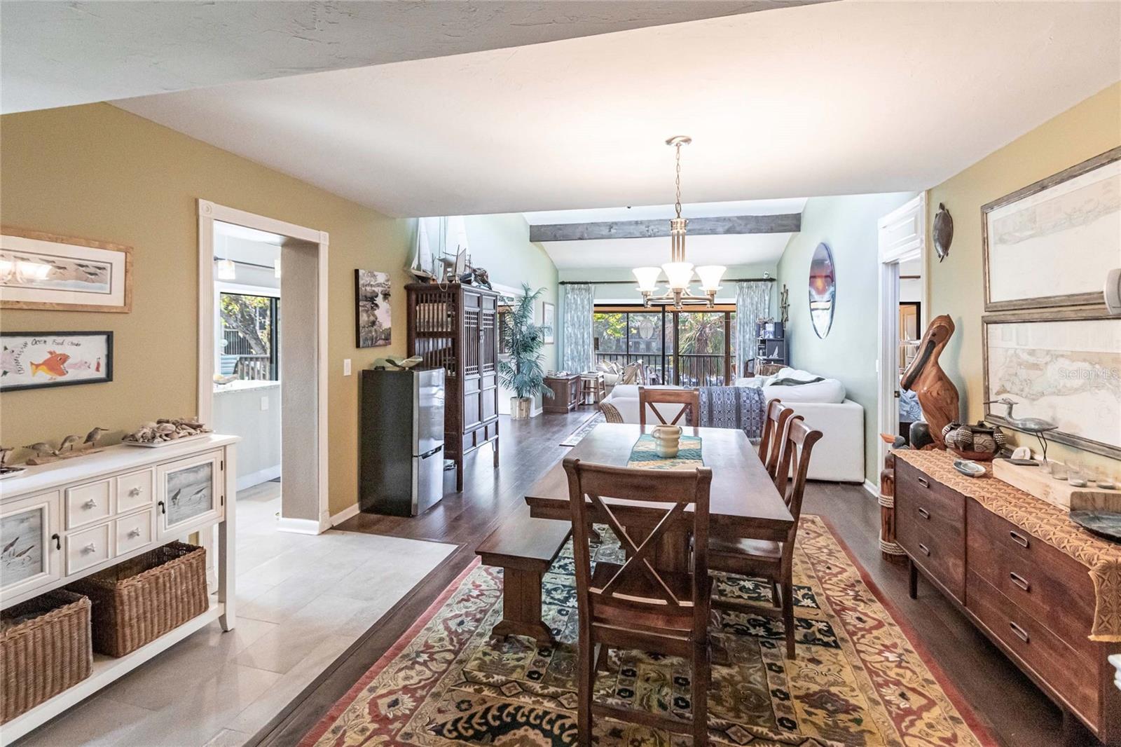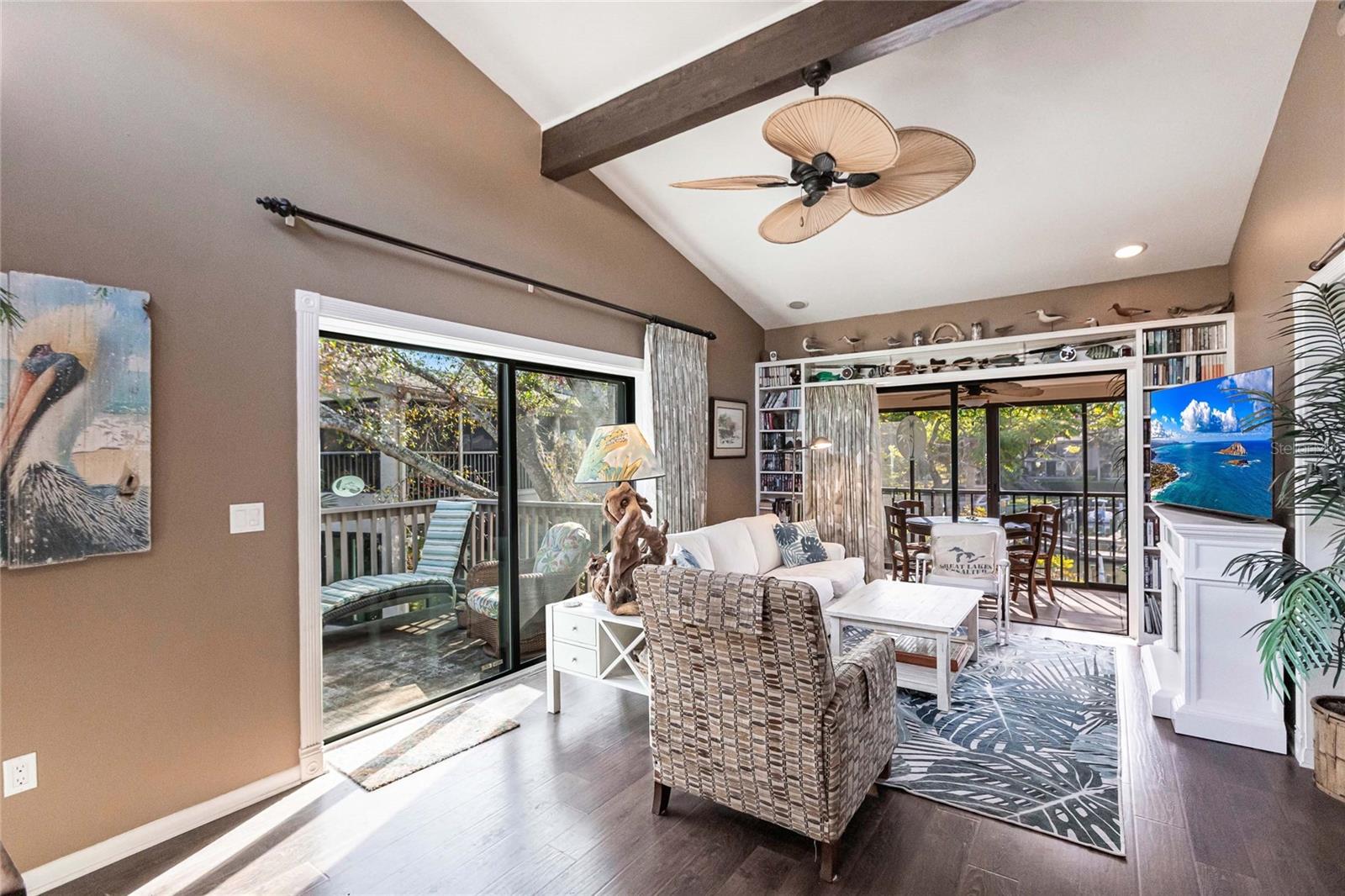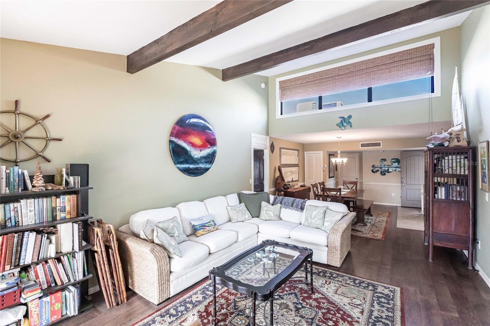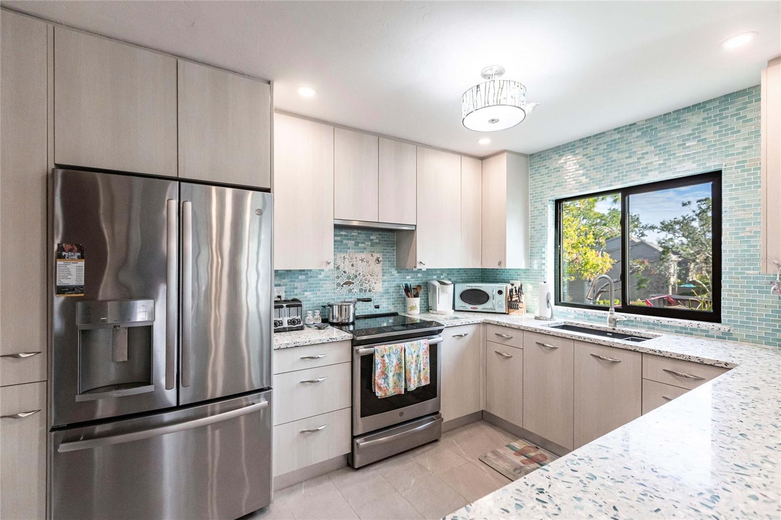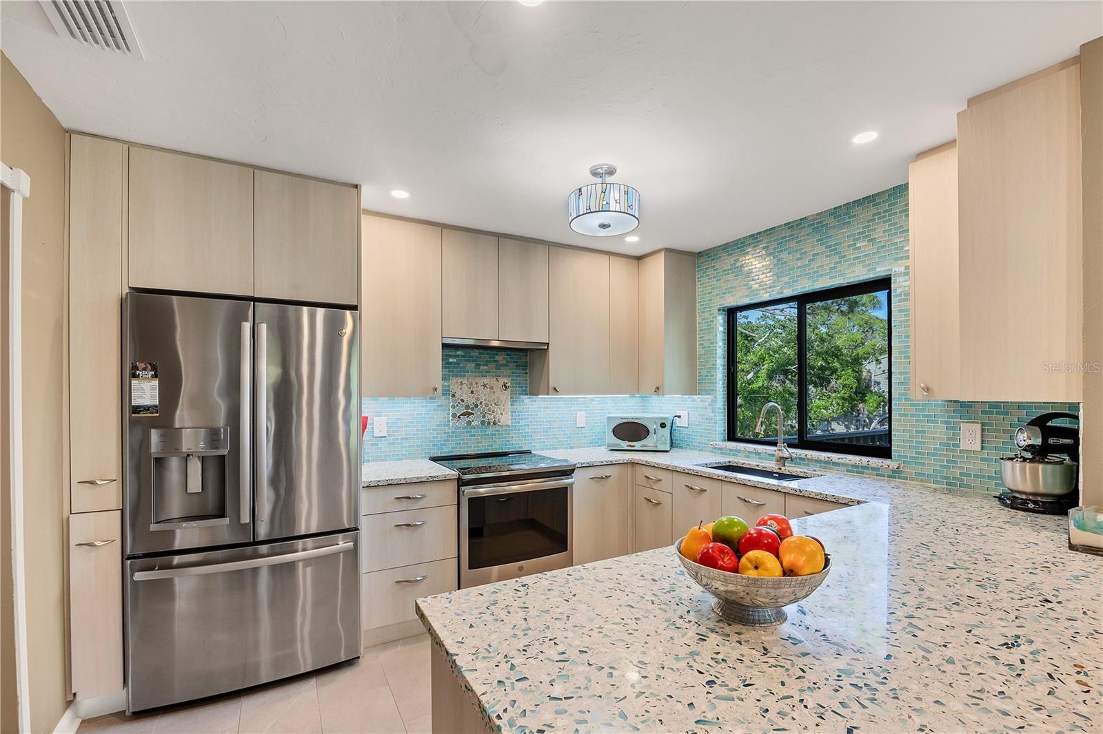 Harborfront (marina) views from this 3BR/2B + Family Room floorplan! This floorplan is rarely available and offers space and natural light that truly feels like a home and not a condo. Features include neutral tile and handsome laminate wood-look flooring, an opened-up and beautifully updated showcase kitchen in a coastal theme. Tiger grey cabinetry, stainless appliances, and striking recycled blue-bottle granite counters with huge kitchen window bring in the light and coastal feel. The kitchen with breakfast bar overlooks the family room. The family room, living room, and all three bedrooms have vaulted ceilings with high clerestory windows for added light. The family room, living room, and oversized primary bedroom step out to the sliding glass-enclosed lanai. The primary bathroom was updated featuring an expanded bathroom footprint. Relax on your rear 36' lanai and look down directly at the 87-slip boat harbor with excellent water views or step out on the side onto your 8' x 25' open deck to enjoy the fresh air. Some furniture can be included in this sale. Pelican Cove is less than one mile from Costco, grocery, restaurants, and shopping and 3 miles to Siesta Key. PELICAN COVE FEATURES includes over 28+ organized clubs including art & sculpture, active yacht club, folk music, photography & cinema clubs, social clubs, and many more. There is a for-fun "Pelican Cove University" covering several diverse subjects, woodworking studio, many card-playing clubs, water exercise and yoga, and a tennis club. There are several yearly jazz, musical, and cultural concerts and a few harborside concerts as well. Pelican Cove has a 24-hour gated and staffed entrance, 87-slip boat harbor with over 130 kayak/canoe storage racks & launch docks, fishing docks, three active clubhouses, exercise room, six heated pools, hot tub, basketball, dog walk area, 5.5 miles of meandering boardwalks & nature trails, two lighted tennis courts and eight lighted pickleball courts all in an award-winning community with unbelievably well-manicured tropical grounds! Welcome to Pelican Cove!