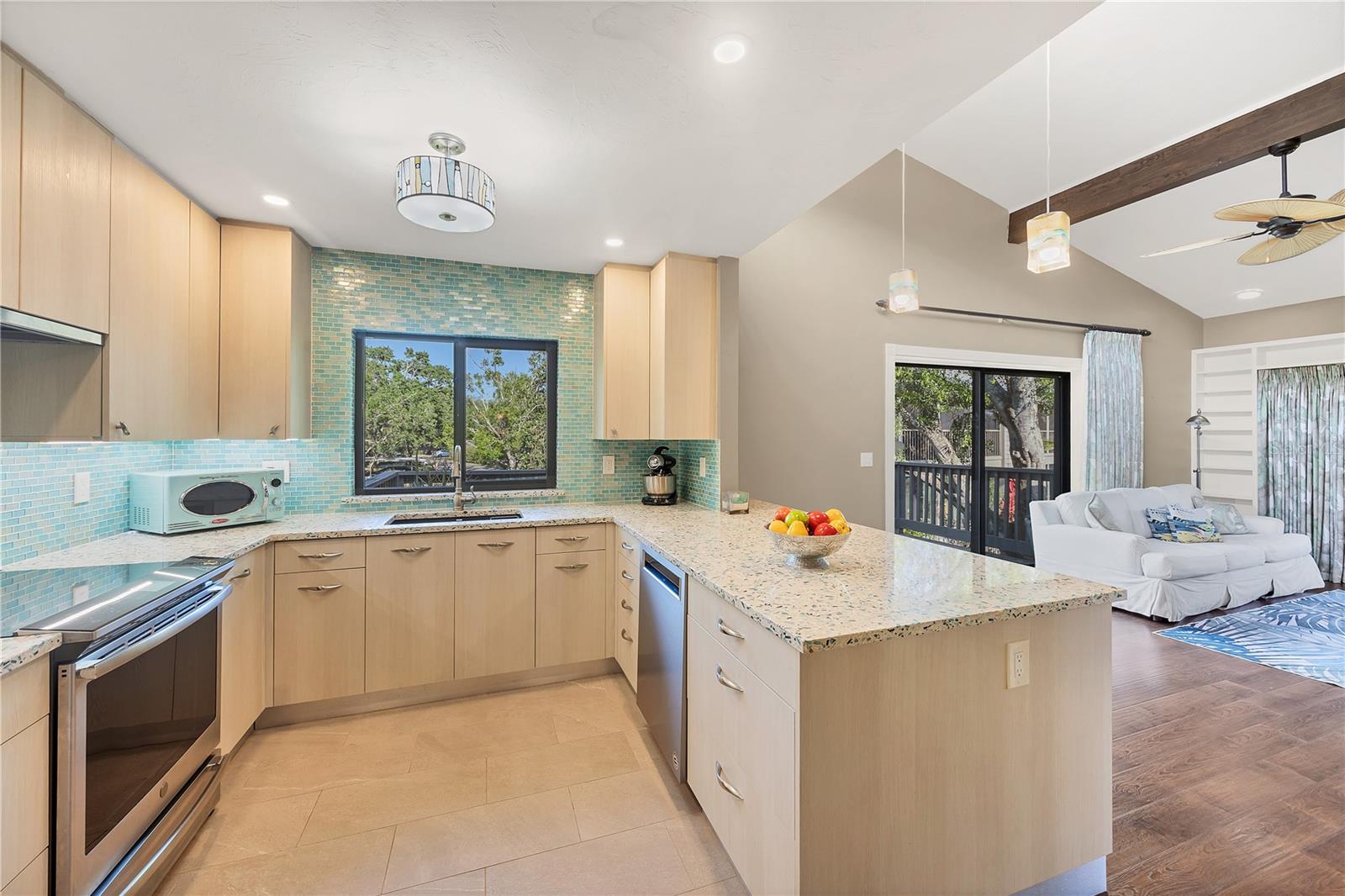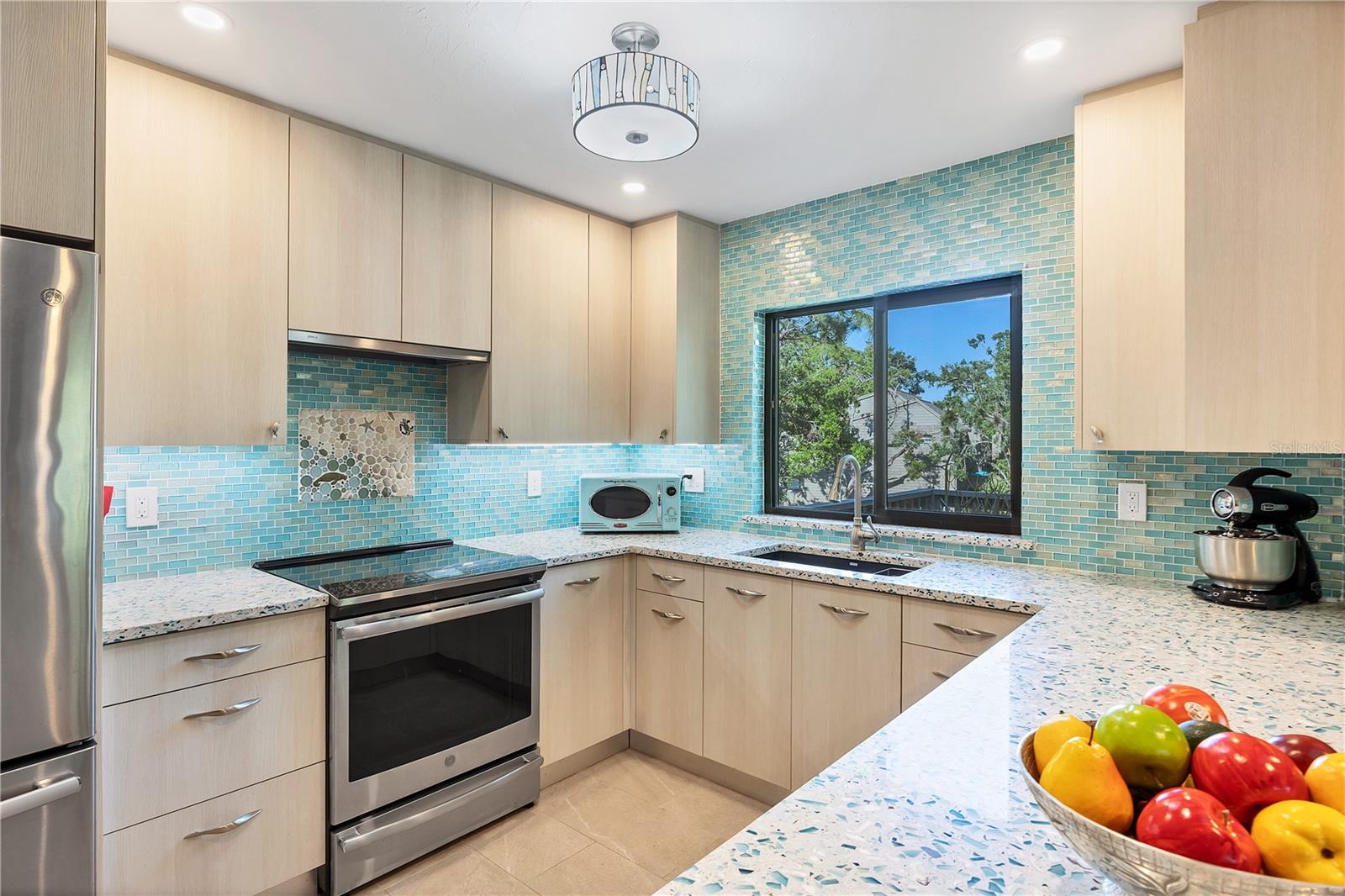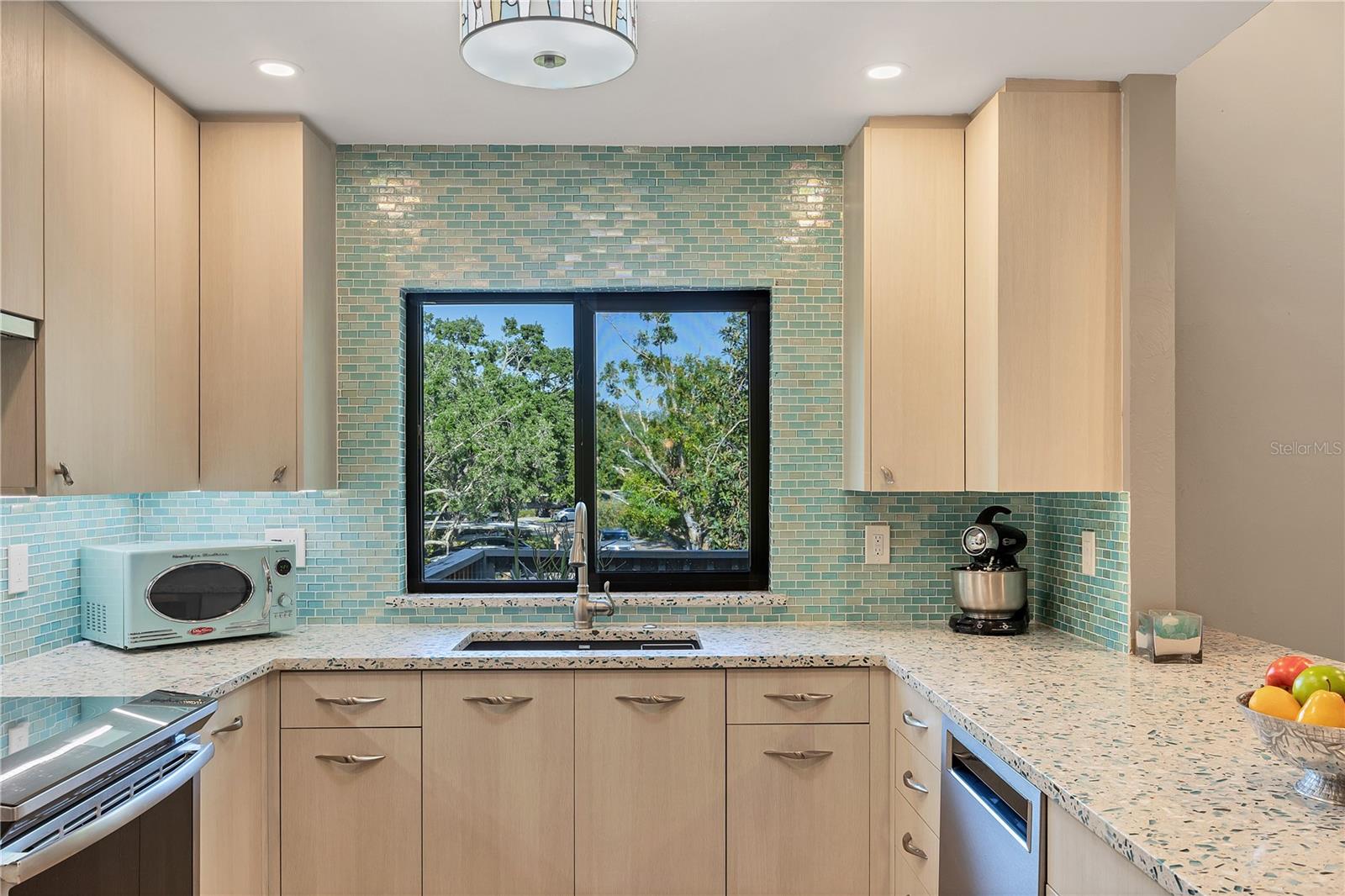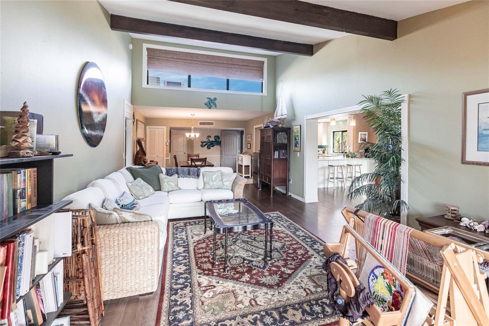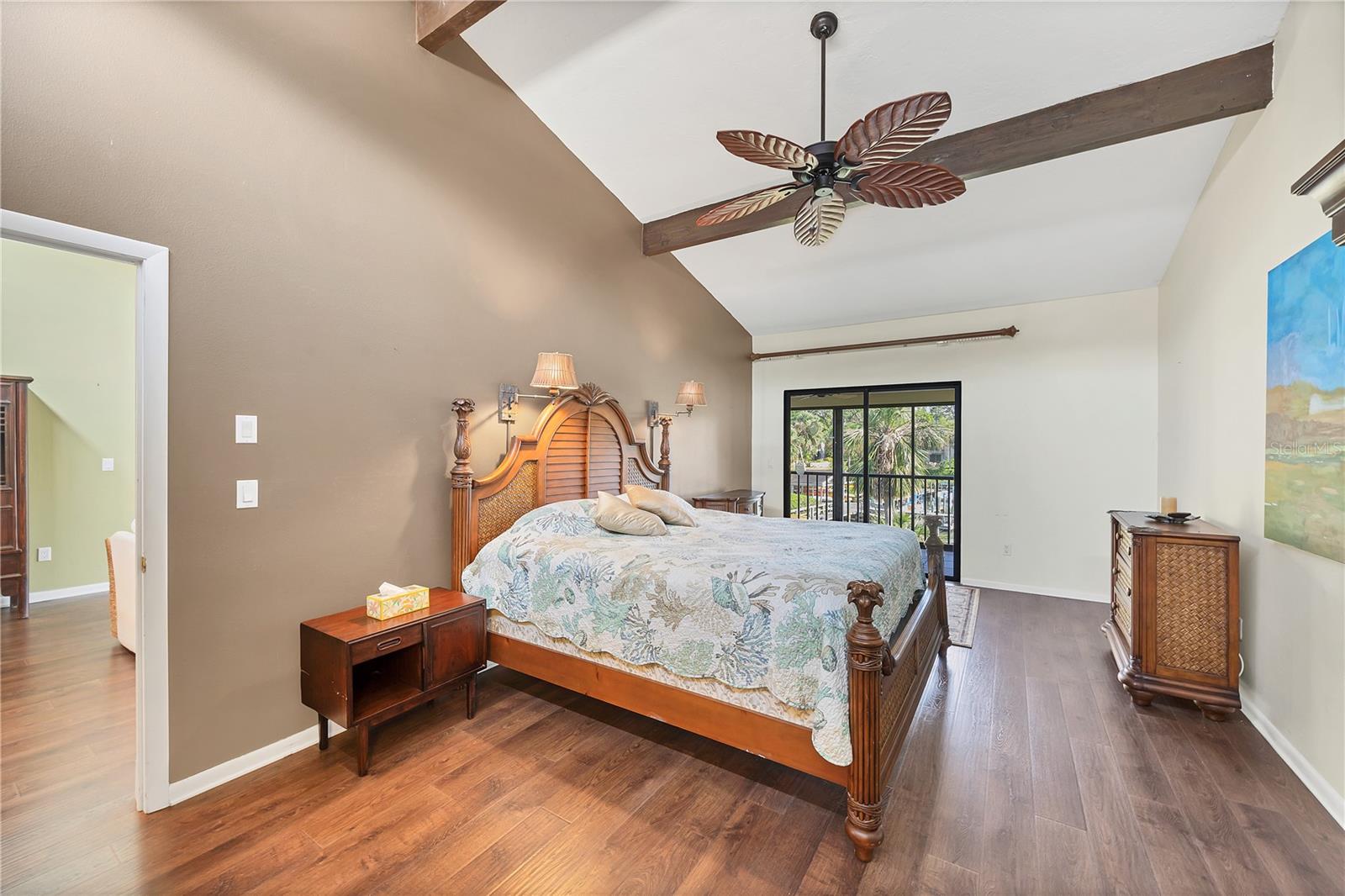 Harborfront (marina) views from this 3BR/2B + Family Room floorplan! This floorplan is rarely available and offers space and natural light that truly feels like a home and not a condo. Features include neutral tile and handsome laminate wood-look flooring, an opened-up and beautifully updated showcase kitchen in a coastal theme. Tiger grey cabinetry, stainless appliances, and striking recycled blue-bottle granite counters with huge kitchen window bring in the light and coastal feel. The kitchen with breakfast bar overlooks the family room. The family room, living room, and all three bedrooms have vaulted ceilings with high clerestory windows for added light. The family room, living room, and oversized primary bedroom step out to the sliding glass-enclosed lanai. The primary bathroom was updated featuring an expanded bathroom footprint. Relax on your rear 36' lanai and look down directly at the 87-slip boat harbor with excellent water views or step out on the side onto your 8' x 25' open deck to enjoy the fresh air. Some furniture can be included in this sale. Pelican Cove is less than one mile from Costco, grocery, restaurants, and shopping and 3 miles to Siesta Key. PELICAN COVE FEATURES includes over 28+ organized clubs including art & sculpture, active yacht club, folk music, photography & cinema clubs, social clubs, and many more. There is a for-fun "Pelican Cove University" covering several diverse subjects, woodworking studio, many card-playing clubs, water exercise and yoga, and a tennis club. There are several yearly jazz, musical, and cultural concerts and a few harborside concerts as well. Pelican Cove has a 24-hour gated and staffed entrance, 87-slip boat harbor with over 130 kayak/canoe storage racks & launch docks, fishing docks, three active clubhouses, exercise room, six heated pools, hot tub, basketball, dog walk area, 5.5 miles of meandering boardwalks & nature trails, two lighted tennis courts and eight lighted pickleball courts all in an award-winning community with unbelievably well-manicured tropical grounds! Welcome to Pelican Cove!