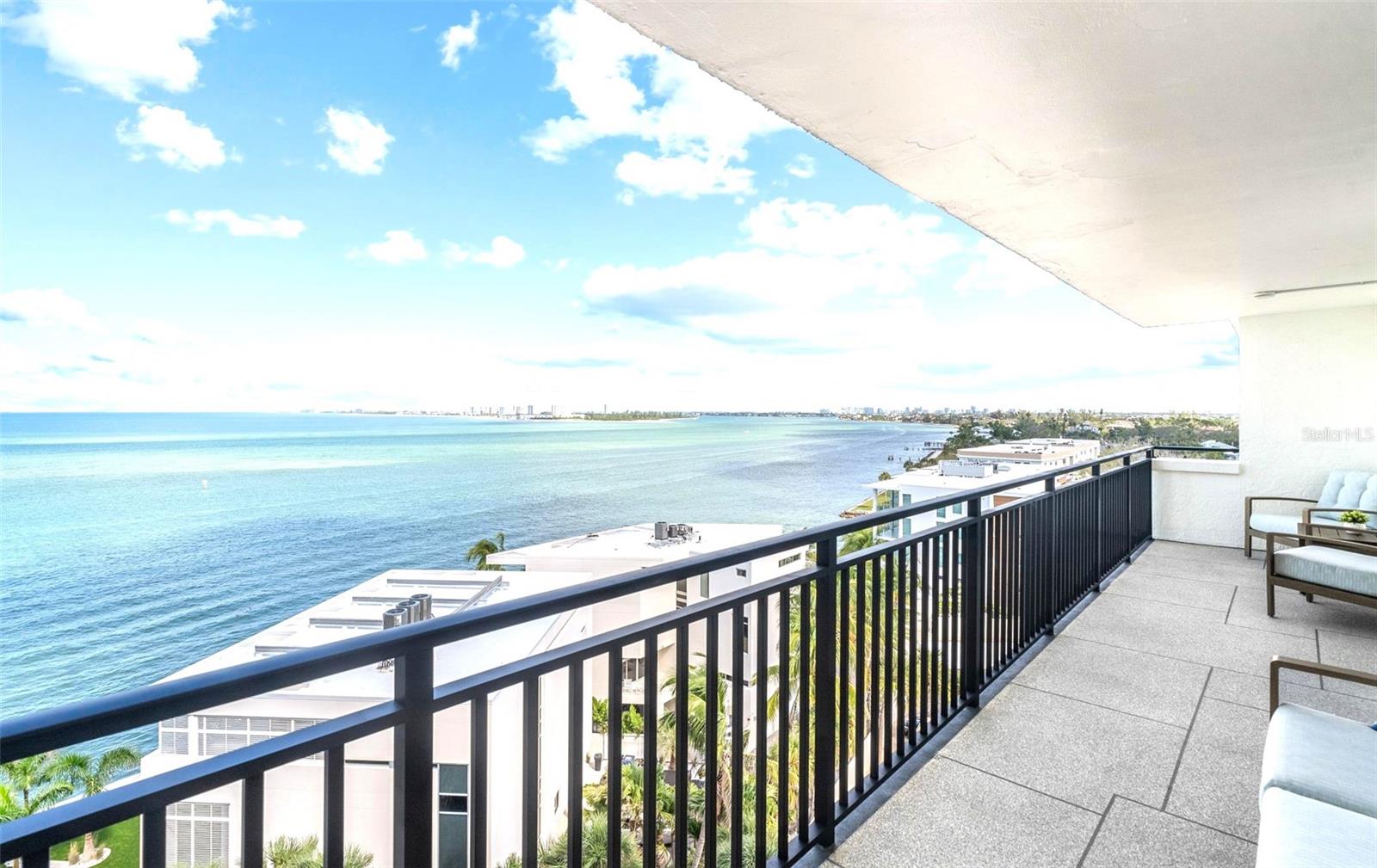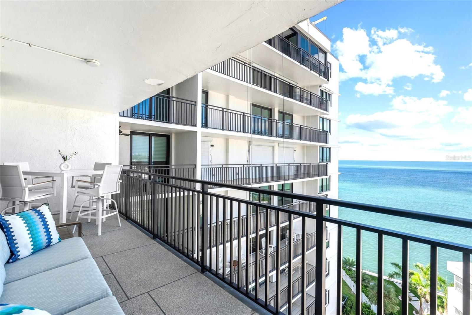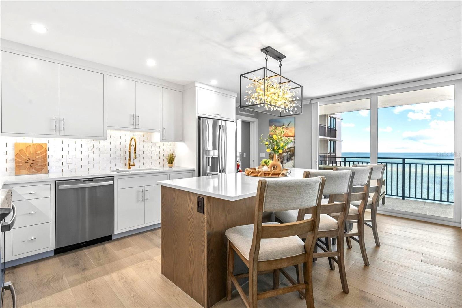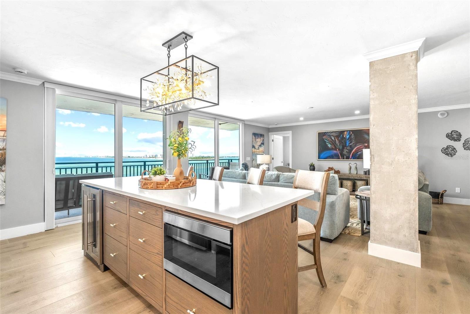 Welcome to Siesta Towers on Siesta Key, where breathtaking Gulf views meet luxurious modern living. Positioned high above on the 9th floor, this stunning 2-bedroom, 2-bath residence showcases sweeping vistas of the Gulf waters, Big Sarasota Pass, and Downtown Sarasota from its expansive private lanai. Completely remodeled with no expense speared, from the studs out in 2024. This 1,440 sq. ft. condo is brand new in every sense of the way. Updates include all new drywall, texture and paint, new plumbing, new electrical, new electrical panel, new hurricane-rated impact windows and sliding glass doors, new air conditioner, and a new hot water heater. Inside new high-end interior finishes, with no expense spared. The chef's inspired kitchen is equipped with custom cabinetry with soft close doors and drawers, beautiful quartz countertops, large island, undermount single bowl kitchen sink, designer tile backsplash, top-of-the-line GE stainless steel appliances, built-in island microwave, and a wine/beverage refrigerator. All new interior doors, closet doors, all new interior millwork to include crown molding, all new lighting and fixtures, new luxury vinyl flooring throughout. Beautifully re-designed bathrooms to include high-end porcelain tile, custom cabinetry with soft close doors and drawers, lighted mirrors, and glass enclosure showers, create a sophisticated yet inviting coastal ambiance. Also, a new in-unit full size washer & dryer with folding table, for ultimate convenience. This beautiful residence comes completely turnkey-furnished with designer-quality furnishings and carefully curated dcor, kitchenware, bedding, bathroom linens, and even high-end "Art Frame" TVs making it move-in ready for you to enjoy the Siesta Key lifestyle immediately. Siesta Towers itself has been thoughtfully updated throughout the building and grounds, offering resort-style amenities, including a state-of-the-art club room, fitness center, heated waterfront swimming pool, fishing pier, and a social pier perfect for sunset cocktails. Additional conveniences include storage room for beach equipment, bike storage and a very secure building environment. Whether you're seeking a full-time residence or a perfect beachside retreat, this pristine condo delivers the best of island living. Modern luxury, panoramic views, and resort-style amenities, all just minutes from the world-famous white sands of Siesta Beach. And with Siesta Key Village dining, shopping, and entertainment just a short walk away, this condo truly offers it all.