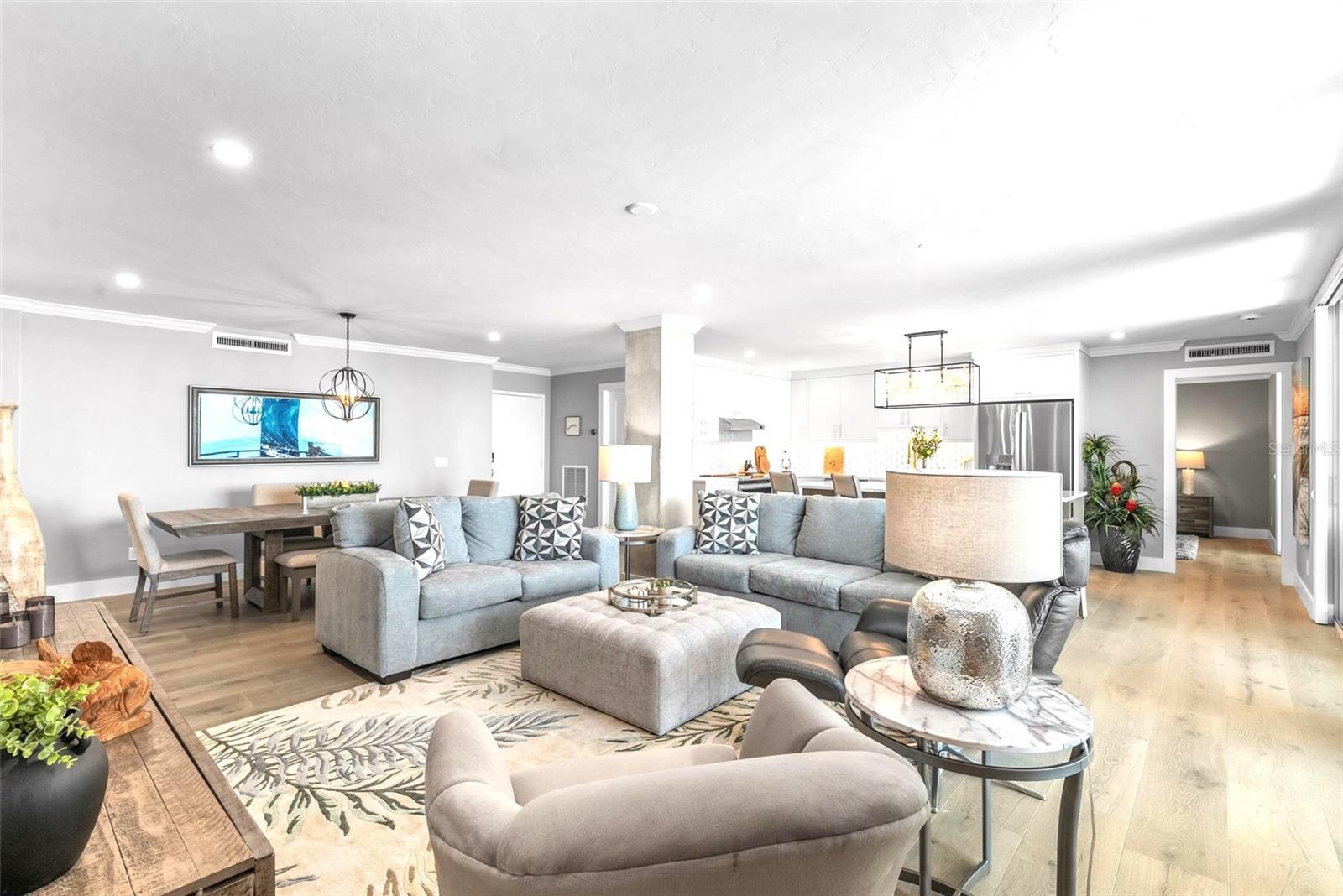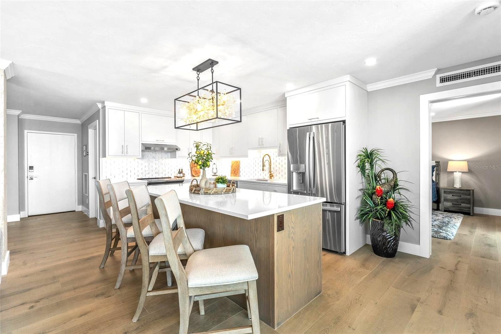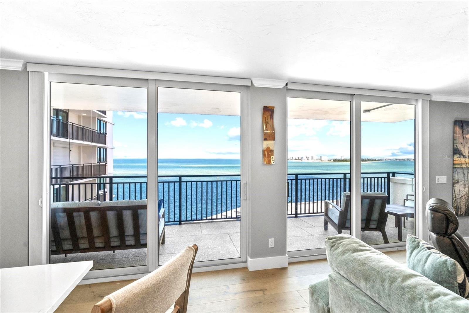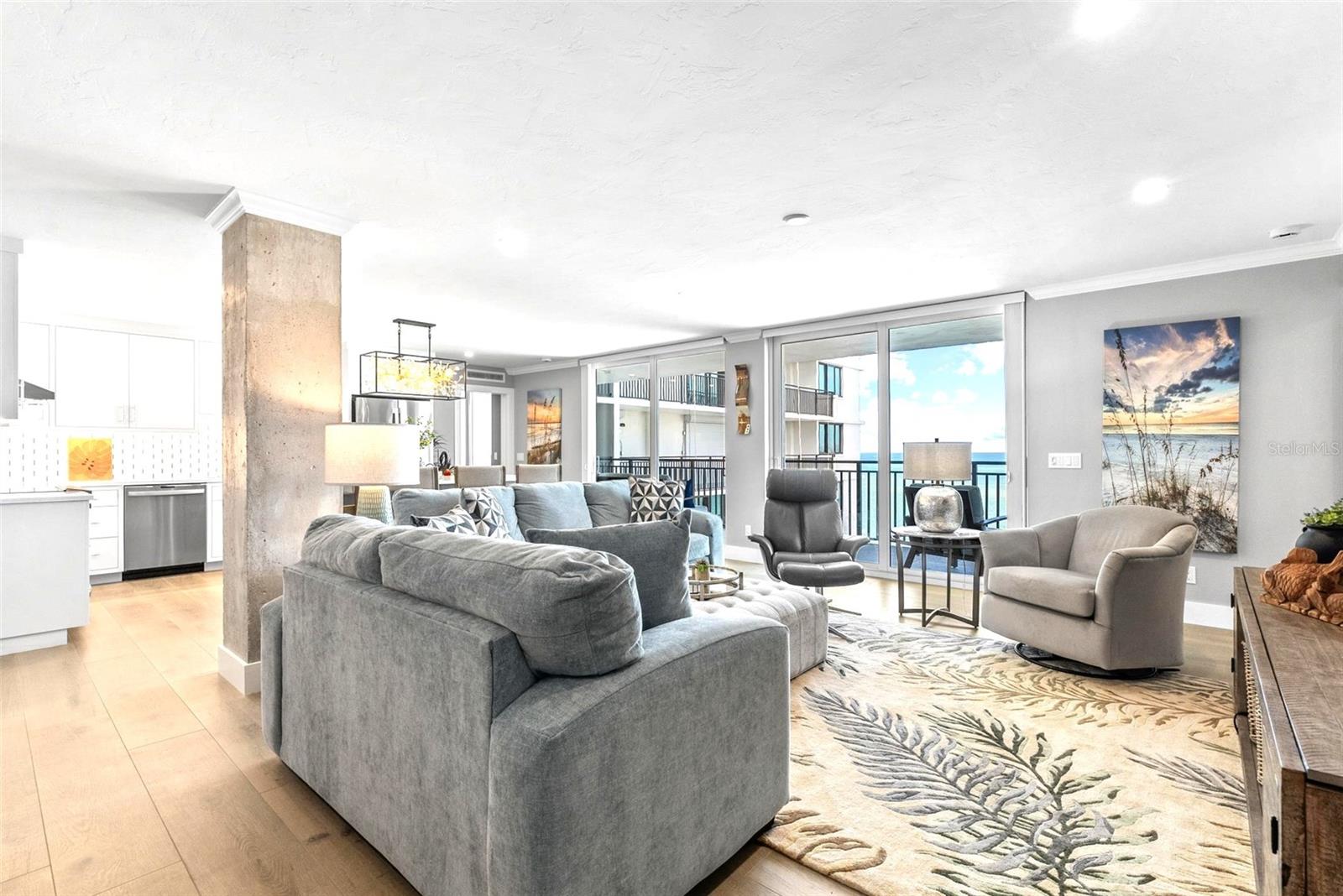 Welcome to Siesta Towers on Siesta Key, where breathtaking Gulf views meet luxurious modern living. Positioned high above on the 9th floor, this stunning 2-bedroom, 2-bath residence showcases sweeping vistas of the Gulf waters, Big Sarasota Pass, and Downtown Sarasota from its expansive private lanai. Completely remodeled with no expense speared, from the studs out in 2024. This 1,440 sq. ft. condo is brand new in every sense of the way. Updates include all new drywall, texture and paint, new plumbing, new electrical, new electrical panel, new hurricane-rated impact windows and sliding glass doors, new air conditioner, and a new hot water heater. Inside new high-end interior finishes, with no expense spared. The chef's inspired kitchen is equipped with custom cabinetry with soft close doors and drawers, beautiful quartz countertops, large island, undermount single bowl kitchen sink, designer tile backsplash, top-of-the-line GE stainless steel appliances, built-in island microwave, and a wine/beverage refrigerator. All new interior doors, closet doors, all new interior millwork to include crown molding, all new lighting and fixtures, new luxury vinyl flooring throughout. Beautifully re-designed bathrooms to include high-end porcelain tile, custom cabinetry with soft close doors and drawers, lighted mirrors, and glass enclosure showers, create a sophisticated yet inviting coastal ambiance. Also, a new in-unit full size washer & dryer with folding table, for ultimate convenience. This beautiful residence comes completely turnkey-furnished with designer-quality furnishings and carefully curated dcor, kitchenware, bedding, bathroom linens, and even high-end "Art Frame" TVs making it move-in ready for you to enjoy the Siesta Key lifestyle immediately. Siesta Towers itself has been thoughtfully updated throughout the building and grounds, offering resort-style amenities, including a state-of-the-art club room, fitness center, heated waterfront swimming pool, fishing pier, and a social pier perfect for sunset cocktails. Additional conveniences include storage room for beach equipment, bike storage and a very secure building environment. Whether you're seeking a full-time residence or a perfect beachside retreat, this pristine condo delivers the best of island living. Modern luxury, panoramic views, and resort-style amenities, all just minutes from the world-famous white sands of Siesta Beach. And with Siesta Key Village dining, shopping, and entertainment just a short walk away, this condo truly offers it all.