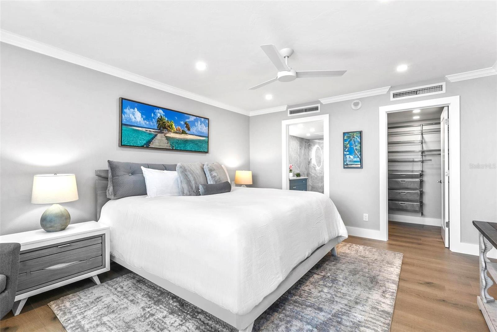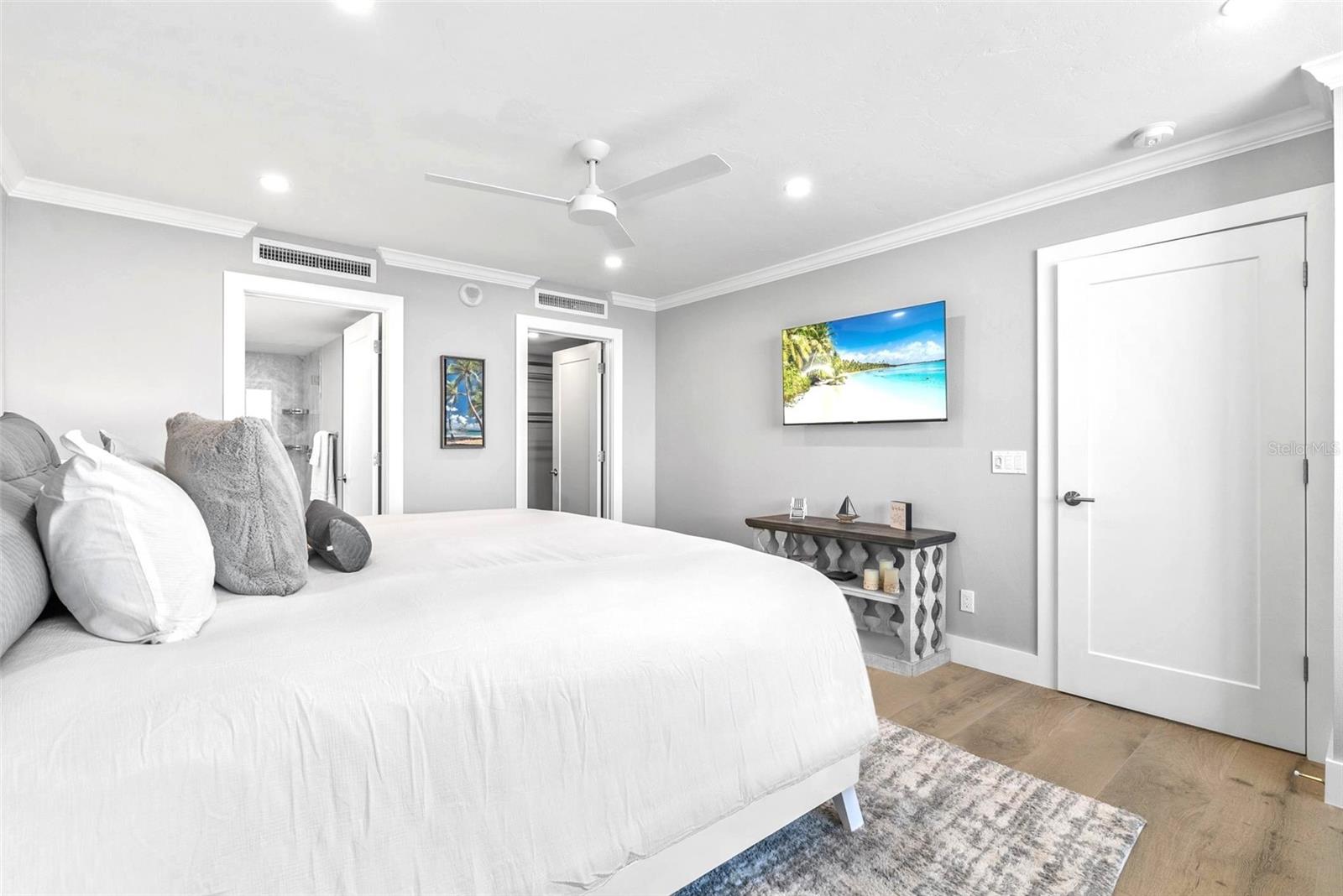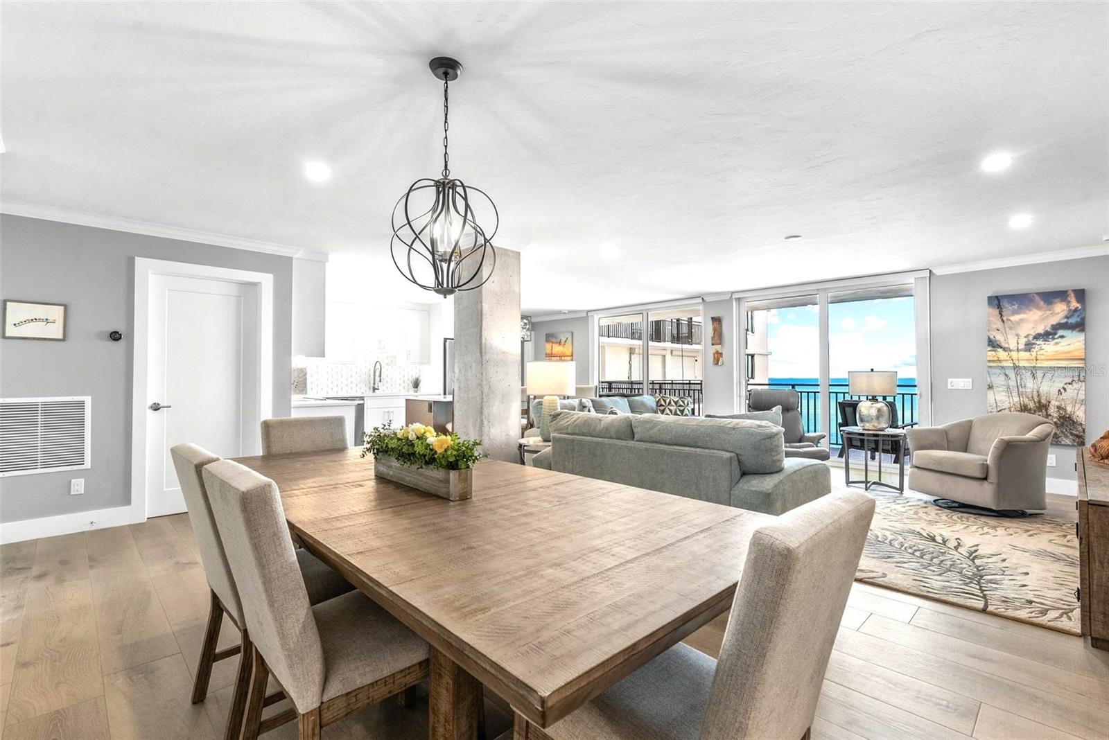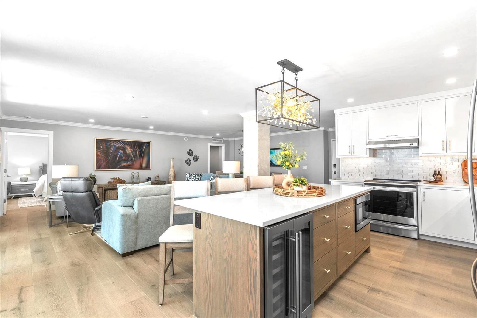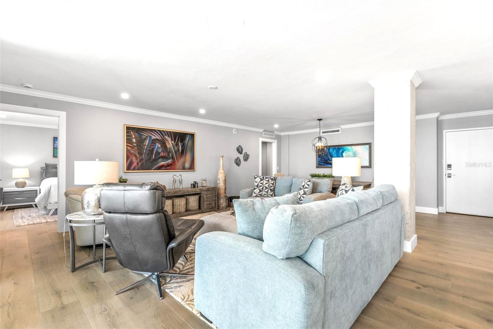 Welcome to Siesta Towers on Siesta Key, where breathtaking Gulf views meet luxurious modern living. Positioned high above on the 9th floor, this stunning 2-bedroom, 2-bath residence showcases sweeping vistas of the Gulf waters, Big Sarasota Pass, and Downtown Sarasota from its expansive private lanai. Completely remodeled with no expense speared, from the studs out in 2024. This 1,440 sq. ft. condo is brand new in every sense of the way. Updates include all new drywall, texture and paint, new plumbing, new electrical, new electrical panel, new hurricane-rated impact windows and sliding glass doors, new air conditioner, and a new hot water heater. Inside new high-end interior finishes, with no expense spared. The chef's inspired kitchen is equipped with custom cabinetry with soft close doors and drawers, beautiful quartz countertops, large island, undermount single bowl kitchen sink, designer tile backsplash, top-of-the-line GE stainless steel appliances, built-in island microwave, and a wine/beverage refrigerator. All new interior doors, closet doors, all new interior millwork to include crown molding, all new lighting and fixtures, new luxury vinyl flooring throughout. Beautifully re-designed bathrooms to include high-end porcelain tile, custom cabinetry with soft close doors and drawers, lighted mirrors, and glass enclosure showers, create a sophisticated yet inviting coastal ambiance. Also, a new in-unit full size washer & dryer with folding table, for ultimate convenience. This beautiful residence comes completely turnkey-furnished with designer-quality furnishings and carefully curated dcor, kitchenware, bedding, bathroom linens, and even high-end "Art Frame" TVs making it move-in ready for you to enjoy the Siesta Key lifestyle immediately. Siesta Towers itself has been thoughtfully updated throughout the building and grounds, offering resort-style amenities, including a state-of-the-art club room, fitness center, heated waterfront swimming pool, fishing pier, and a social pier perfect for sunset cocktails. Additional conveniences include storage room for beach equipment, bike storage and a very secure building environment. Whether you're seeking a full-time residence or a perfect beachside retreat, this pristine condo delivers the best of island living. Modern luxury, panoramic views, and resort-style amenities, all just minutes from the world-famous white sands of Siesta Beach. And with Siesta Key Village dining, shopping, and entertainment just a short walk away, this condo truly offers it all.