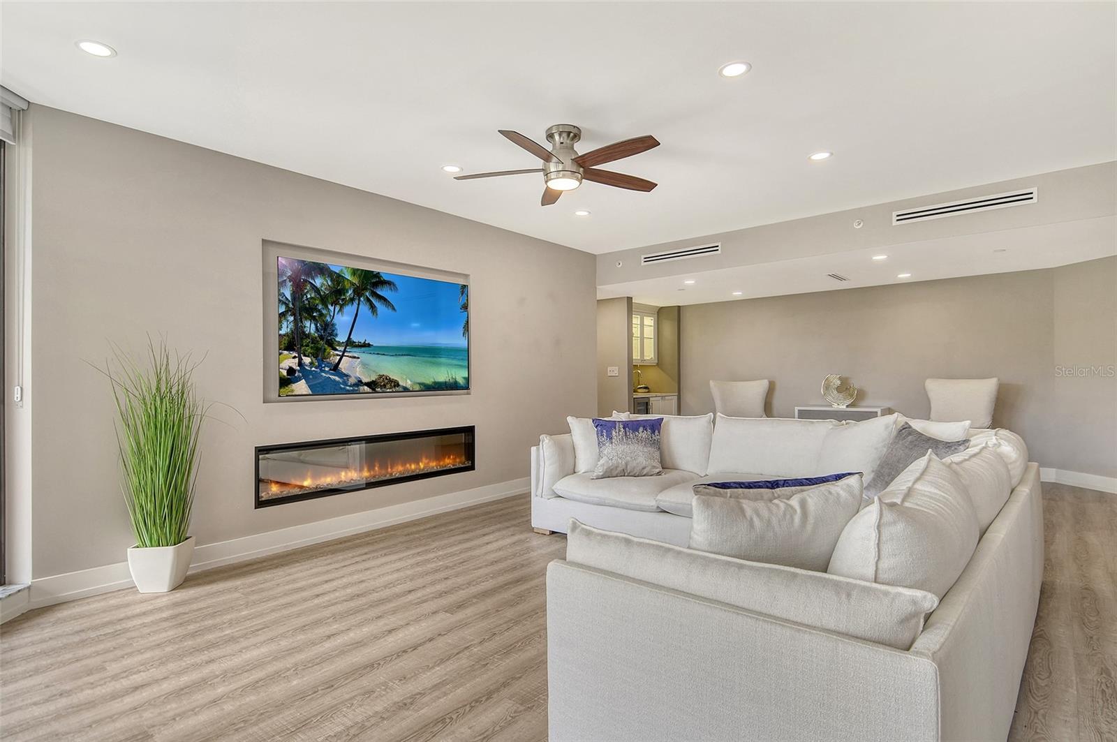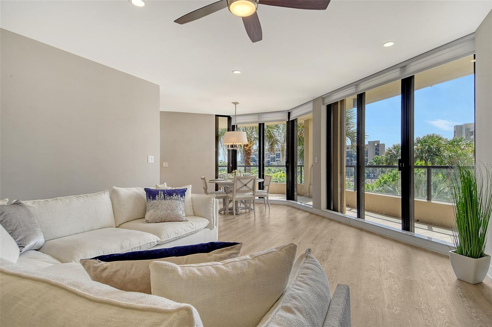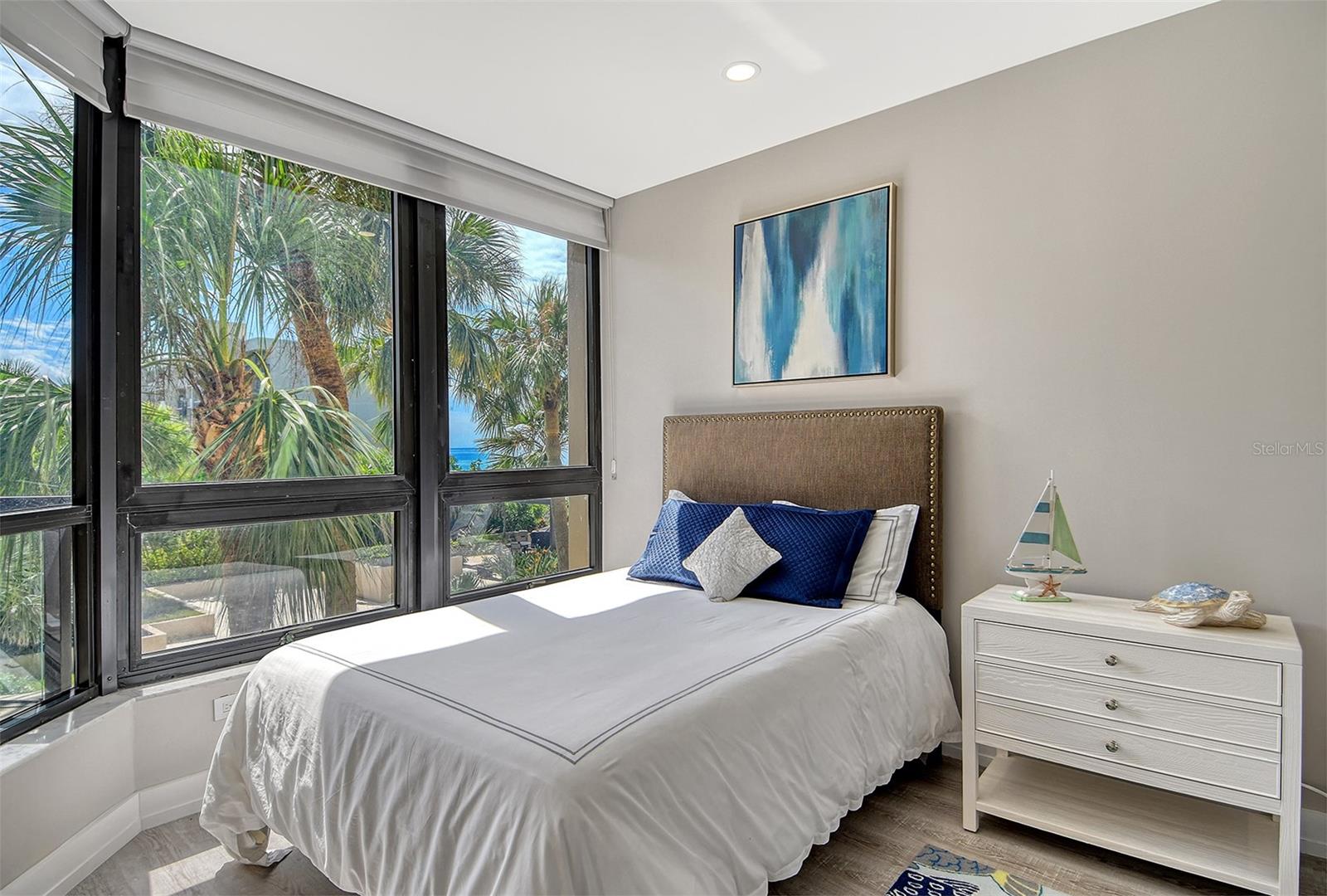 Experience the ultimate in Gulf-front living from this meticulously updated 1827 sq. ft. beach retreat located on the sunny southern side and offering peaceful Gulf and courtyard vistas. The open floor plan is perfectly suited for entertaining, seamlessly connecting the living and dining areas. A modern wet bar with sleek finishes and electric fireplace complements the cozy ambiance of the great room. Floor-to-ceiling glass sliders line the gorgeous interior, opening to a wraparound terrace that offers ocean views and extends to the kitchen and primary suite, creating seamless indoor-outdoor flow. The kitchen, renovated with quartz countertops and chic shaker-style cabinetry, offers plenty of storage, tile backsplash, and stainless-steel Bosch appliances, making it as functional as it is stylish. Overnight guests will appreciate the privacy afforded by the split-bedroom layout. Situated for optimal Gulf views, the primary suite is a peaceful retreat with direct terrace access, dual walk-in closets, and a built-in makeup vanity. The en-suite bathroom has been beautifully modernized with quartz countertops, a glass-enclosed shower with multiple shower heads, and a private water closet. The guest bedroom includes a walk-in closet and an updated bathroom with a floating vanity. Additional conveniences include one secure under-building parking space and a storage locker. The Promenade delivers unparalleled luxury with amenities designed to elevate everyday living. On-site management, a full-service concierge team, and secure lobby with a manned guard gate offer peace of mind and effortless convenience. Residents enjoy exclusive access to beautifully updated social rooms, and a fully equipped fitness center with sauna. Outdoor amenities include four Har-Tru tennis courts, a Gulfside sundeck, and an oversized heated swimming pool and spa. A private boardwalk leads directly to the sugar sand beach and azure waters of the Gulf of Mexico and complete this exceptional coastal experience.