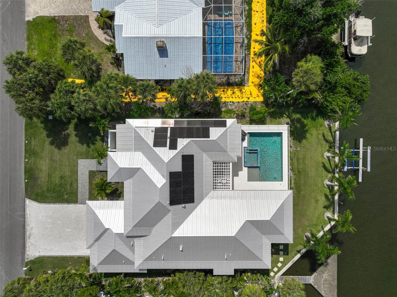 This custom-built home received the "Best Overall" award in the 2021 Manatee and Sarasota County Parade of Homes. Experience the pinnacle of Siesta Key waterfront living in this 2019-built masterpiece by Nutter Custom Construction. Designed with precision and built to last, this solar-powered coastal retreat sits on high elevation and spans over 3,400 living square feet, offering 3 bedrooms, 3 baths, and two versatile flex rooms that redefine modern island living. Every element blends elegance, performance, and peace of mind. You walk into a wide-open floor plan that immediately draws you in. To the left, the primary suite offers total privacy with a spacious bedroom, spa-inspired bathroom featuring double vanities, a soaking tub, glass-enclosed shower with 4 shower heads, and a private outdoor shower with 2 shower heads, connected directly to the master bath a truly open-air sanctuary. To the right, your dedicated office provides focus and functionality and can easily serve as a fourth bedroom, with the flex room ideal for a home office or bonus space. The heart of the home opens to expansive living and dining spaces with a chef's kitchen showcasing high-end cabinetry, premium flooring, designer lighting, and top-of-the-line Sub-Zero and Wolf appliances. Each guest bedroom includes its own private en-suite bath, offering comfort and privacy for family and visitors alike. A large walk-in pantry and laundry room are conveniently positioned near the kitchen. A whole-home water softening system, an In-wall pest control system with access ports, 2 air conditioning systems to keep the home evenly comfortable during the warmest weather, and 2 tankless water heaters to provide plenty of hot water. An oversized three-car garage for everyday ease. An additional flex room opens to the pool through oversized sliders, perfect for a second office, game room, or guest suite. There are automated window shades in the living room and game room. The home runs entirely on solar power and includes a multi-room sound system that fills the home and outdoor living space with your favorite music. Massive hurricane-rated sliding glass doors wrap the back of the home, creating a seamless flow to your backyard oasis, including landscape lighting and an irrigation system. An Integrated Security System with perimeter cameras provides extra peace of mind. Step out onto the beautiful travertine pool deck, featuring a heated pool and champagne-edged spa, outdoor lounge, and covered dining area with a built-in outdoor chef's kitchen powered by propane, perfect for entertaining in style, and all with a sunset view. Beyond the pool, enjoy a lush, manicured backyard with direct access to the wide Siesta Key Grand Canal. A dedicated 14,000-pound boat lift allows you to launch your boat with ease, making days on the water effortless. A separate private docking area is available for your friends to arrive by boat or for jet skis. Enjoy kayaking, paddleboarding, and scenic canal rides, or simply relax and take in the sunsets from your extended concrete pad with a built-in concrete firepit, ideal for gatherings by the water. Every detail of this home is custom-crafted, from its hurricane-rated construction and elevated-lot placement to its energy-efficient systems and timeless coastal design. 5058 Windward Ave isn't just a home, it's a statement in waterfront living: high elevation, solar-powered, elegant, and built for those who expect the very best on Siesta Key.
