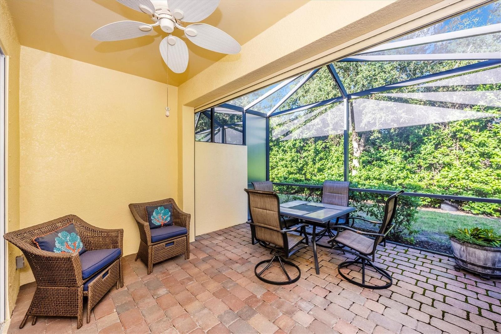 Welcome to Stillwater--a vibrant, gated, and maintenance-free villa community where every day feels like a vacation! Perfectly positioned on a quiet preserve lot with no rear neighbors and just steps from the pool and clubhouse, this fully furnished, move-in-ready 2 bedroom PLUS an office, 2 bathroom villa offers the ideal blend of comfort, privacy, and resort-style living.From the moment you arrive, you'll be greeted by paver walkways, manicured landscaping, palm-lined streets, and glowing lantern-style streetlights that set the tone for this warm and welcoming neighborhood. Step through the glass front door and into a beautifully maintained interior featuring tile flooring throughout the main areas, stainless steel appliances, granite countertops, wood cabinetry with 42" uppers, tile backsplash, upgraded lighting and ceiling fans, plantation shutters, and 8' sliders that fill the home with natural light.Designed with both relaxation and functionality in mind, this open-concept floor plan offers a spacious great room and a split-bedroom layout--giving guests their own private wing when visiting. The extended screened lanai with pavers is the perfect spot to sip your morning coffee or unwind in the evening while taking in peaceful preserve views. For peace of mind, the home includes 2016 impact windows and 2017 hurricane roll-down shutters on the lanai, and best of all--no flood insurance required.Living in Stillwater means maintenance-free ownership--the HOA takes care of exterior upkeep while you simply enjoy life. Spend your mornings strolling past scenic lakes and fountains, your afternoons by the heated pool or spa, and your evenings gathering with neighbors at the clubhouse or community gazebo.And when adventure calls, you're just minutes from the Gulf beaches, boat ramps, golf courses, parks, medical facilities, YMCA, and the charming shops and dining along Historic Dearborn Street, home to weekly Farmers Markets and lively community events.Whether you're seeking a full-time residence or seasonal escape, this impeccably maintained villa offers luxury, convenience, and Florida living at its finest--without lifting a finger.