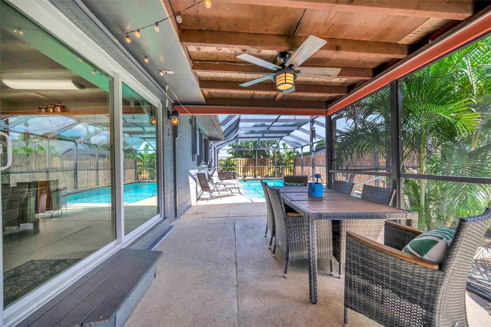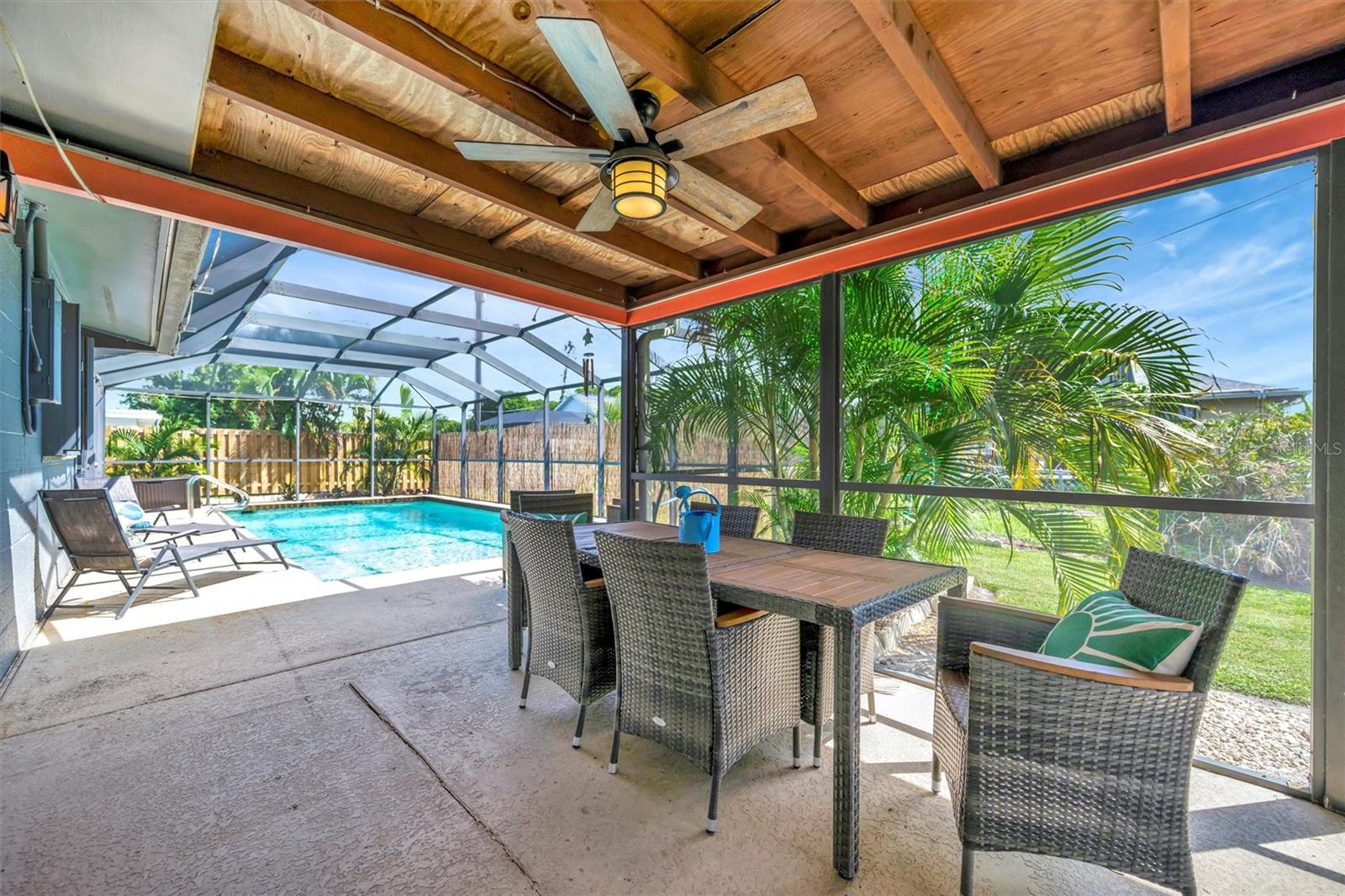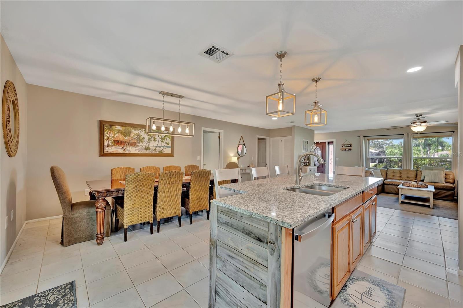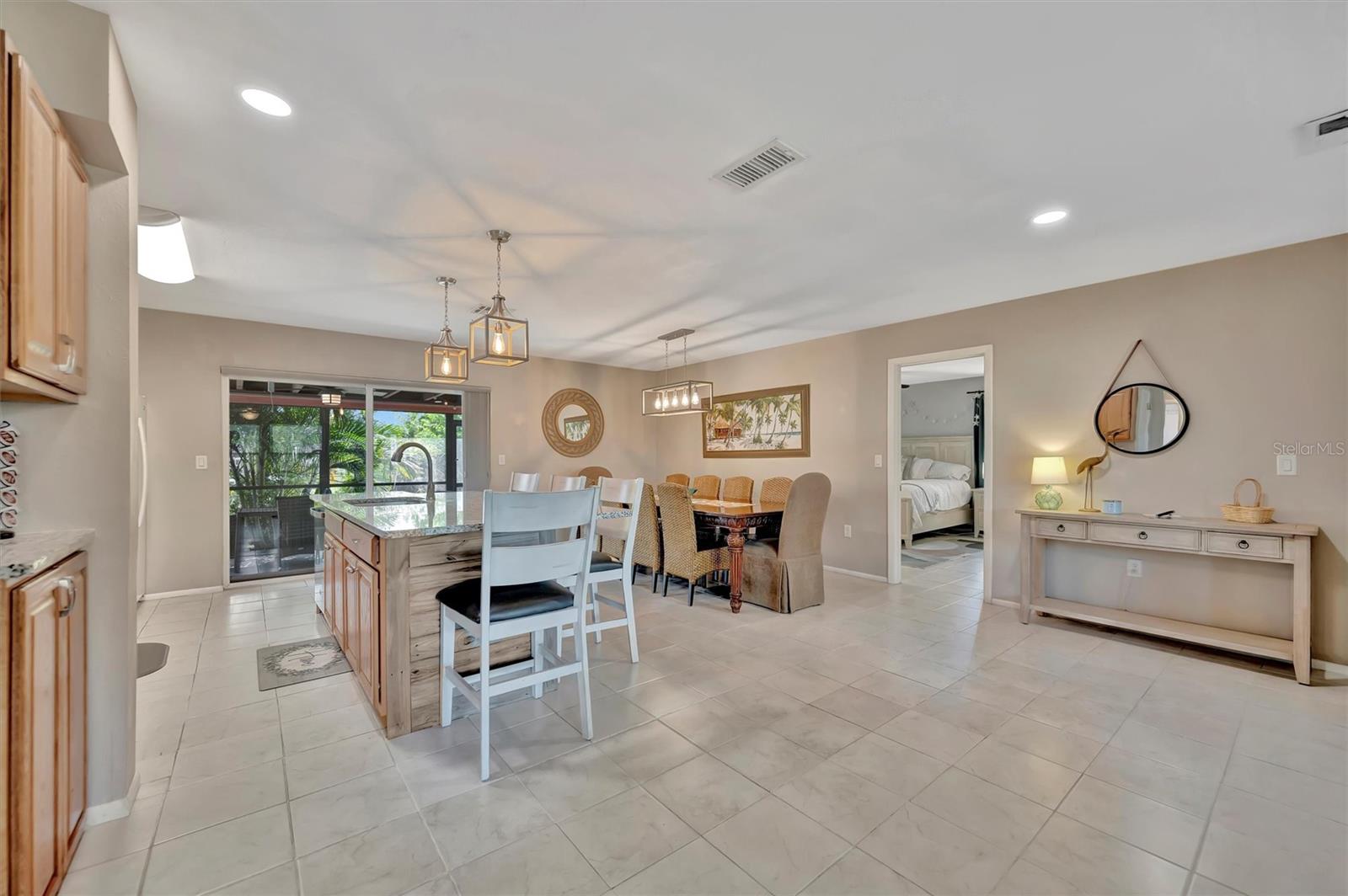 Enjoy the laid-back Florida lifestyle in this turnkey furnished South Venice POOL home on a rare triple lot! With plenty of room for your RV, boat, or extra vehicles, this 3-bedroom, 2-bathroom retreat has no HOA and sits in an X flood zone, so no flood insurance is required.Step inside this coastal-inspired home and discover a bright, open floor plan designed for entertaining. The spacious living room flows effortlessly into the dining area and updated kitchen, featuring wood cabinetry, granite countertops, and newer appliances. Just beyond the hurricane-impact sliding doors, you'll find your private oasis -- a huge screened-in, heated saltwater pool with a covered lanai perfect for outdoor dining and relaxation.The split floor plan offers privacy and comfort, with two guest bedrooms and a full bath on one side, and the primary suite on the other -- complete with a walk-in closet, en-suite bath with walk-in shower, and direct access to the pool area.Enjoy peace of mind with impact windows and doors, accordion shutters, a 2020 AC and ductwork replacement, newer pool heater, and a fully fenced backyard. A detached workshop with power adds even more versatility -- ideal for storage, hobbies, or your tools and toys.Ideally located within walking distance to Shamrock Park & Nature Center and just minutes from Downtown Venice, Gulf beaches, and the South Venice Boat Ramp & Ferry, where residents can access a private beach through an optional membership -- this home truly captures the best of coastal Florida living.Sold turnkey furnished -- just bring your suitcase and start enjoying paradise!
