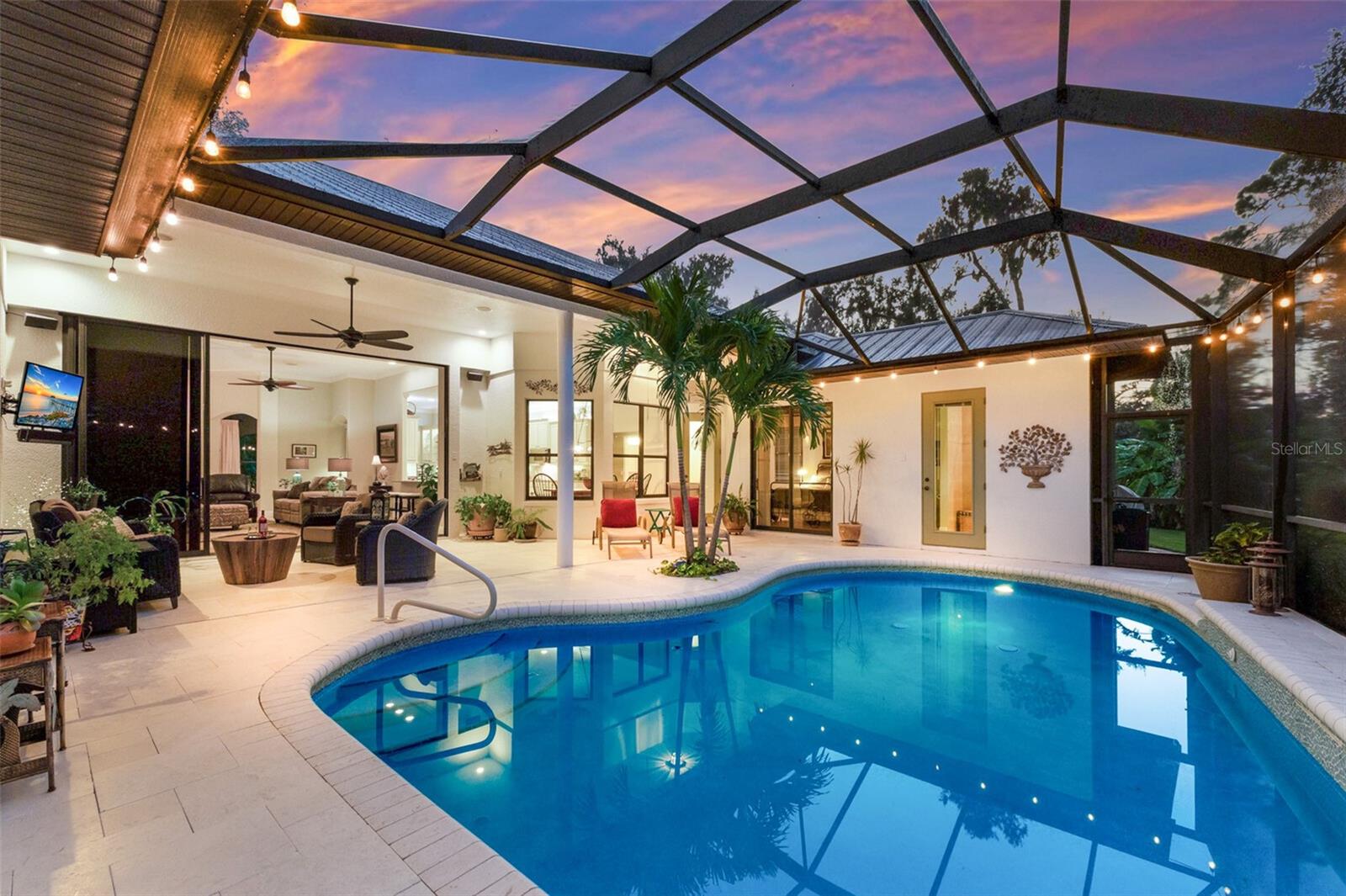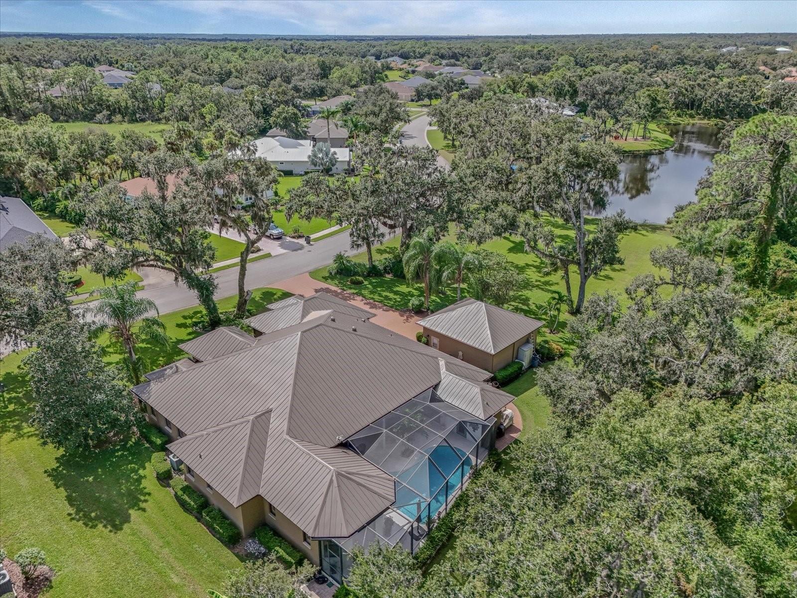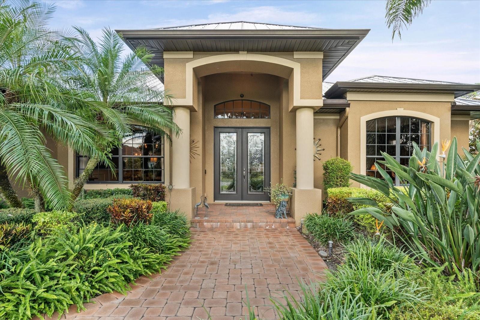 Highly sought-after Twin Rivers is where you'll find this stunning, custom-built Mark Cahill home -- perfectly positioned in a serene, park-like setting surrounded by majestic oaks, swaying palms, and lush lawns. This immaculately maintained residence blends timeless craftsmanship with thoughtful recent upgrades and incredible 'Old Florida' curb appeal.Step through the beautiful glass double doors into the inviting foyer and take in the open, well-designed floor plan. Beyond the wall of disappearing sliders, the private lanai and refreshed pool and decking create a true outdoor oasis framed by the tranquil natural preserve.Boasting 3,235 sq. ft. of living space, the home includes three bedrooms, three full baths, a spacious great room that flows effortlessly into the kitchen and pool areas, a formal living and dining room, and a dedicated office/den with French doors and built-in shelving -- ideal for working from home or nursery. The chef's kitchen is a showstopper -- complete with double ovens, two prep sinks with disposals, granite counters, abundant 42" solid wood cabinetry with crown molding, a separate pantry, and a butler's pantry with glass-front display cabinets. Ample natural light pours in from solar tubes, while under- and over-cabinet lighting enhances both style and function.The split bedroom floor plan ensures privacy for everyone. The luxurious primary suite offers his-and-her walk-in closets, plantation shutters, dual vanities, an oversized jetted soaking tub, and a fully tiled walk-in shower "room" with dual shower heads. The en-suite guest bedroom features its own large tiled shower and walk-in closet -- perfect for extended stays.Throughout the home, you'll find 6" crown molding and baseboards, upgraded lighting and ceiling fans, complete interior painting including ceilings, and updated fixtures that give the entire home a fresh, sophisticated feel.Outdoor living shines on the private, screened lanai -- perfect for lounging by the sparkling pool, entertaining, or relaxing under the caf lighting that adds a touch of evening magic.A new (2023) 5V painted metal roof crowns the home for years of beauty and durability.Garages & Storage-Main home: Oversized 612 sq. ft. two-car garage with tall ceilings and built-in storage.Detached garage: Additional 550 sq. ft. air-conditioned two-car garage ideal for hobby space, vehicles, or workshop use -- both with pull-down attic storage. And a wide, paver driveway provides ample parking for guests.Additional Opportunity-An adjacent premium lakeside lot is also available under separate contract -- ideal for additional privacy or future investment.Community Highlights-Residents enjoy a fishing dock, kayak/canoe launch, playground, basketball and volleyball courts, soccer field, and scenic walk/bike/golf cart-friendly streets throughout this beautiful Twin Rivers community.