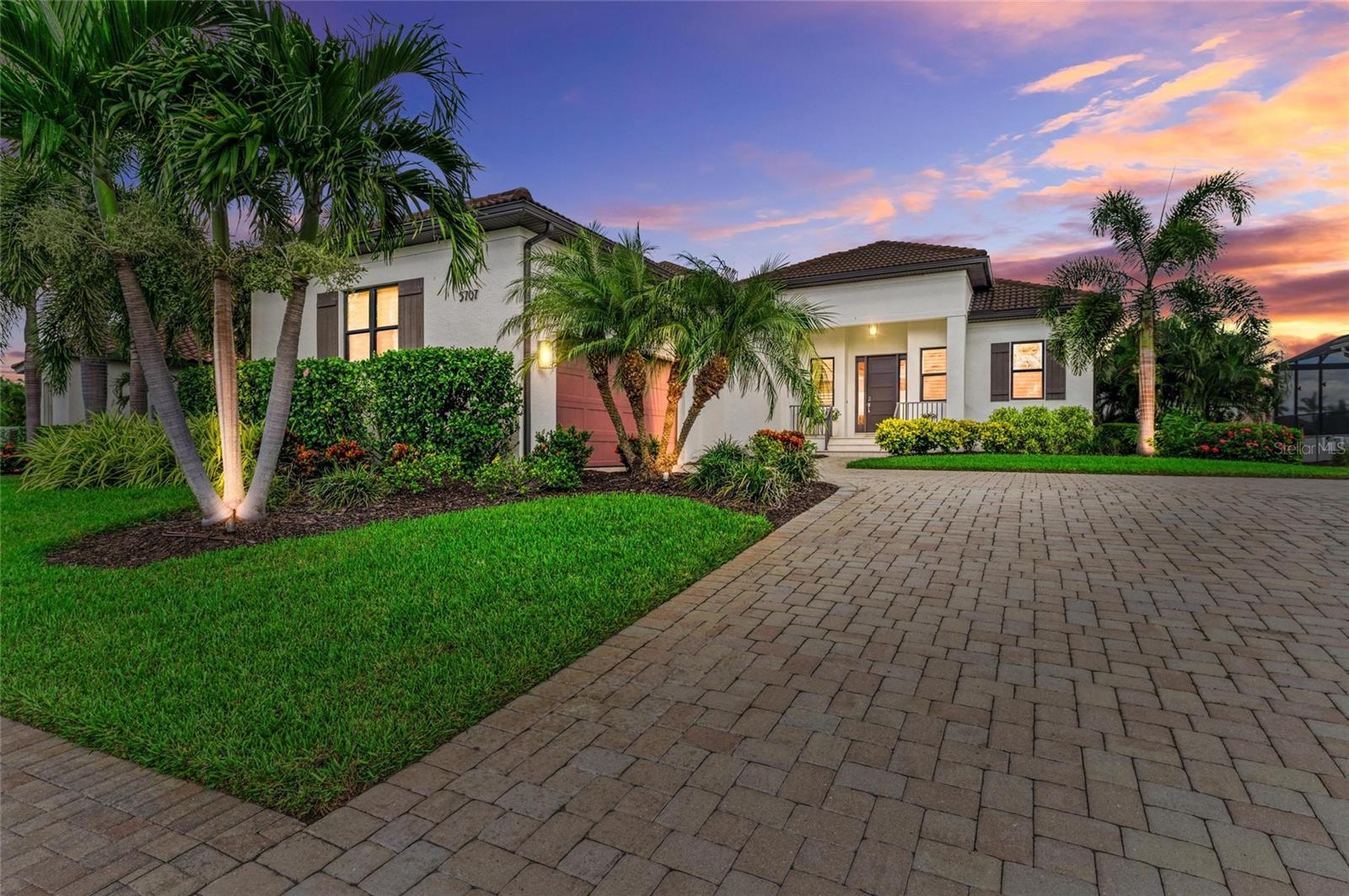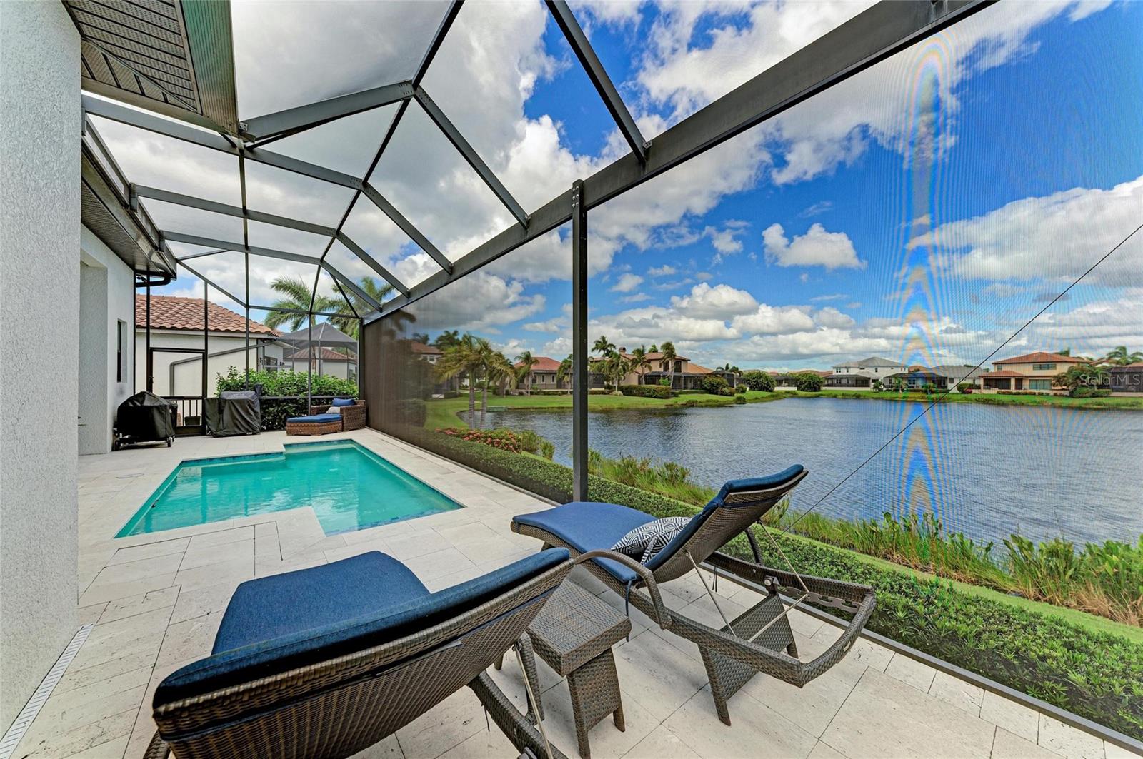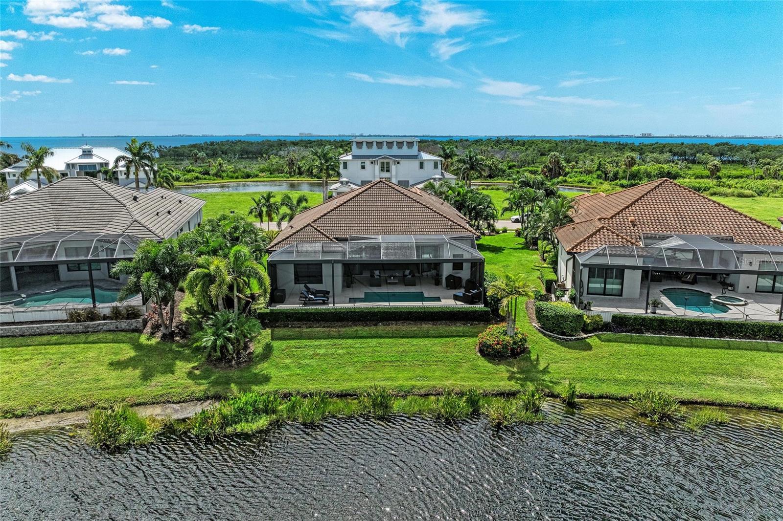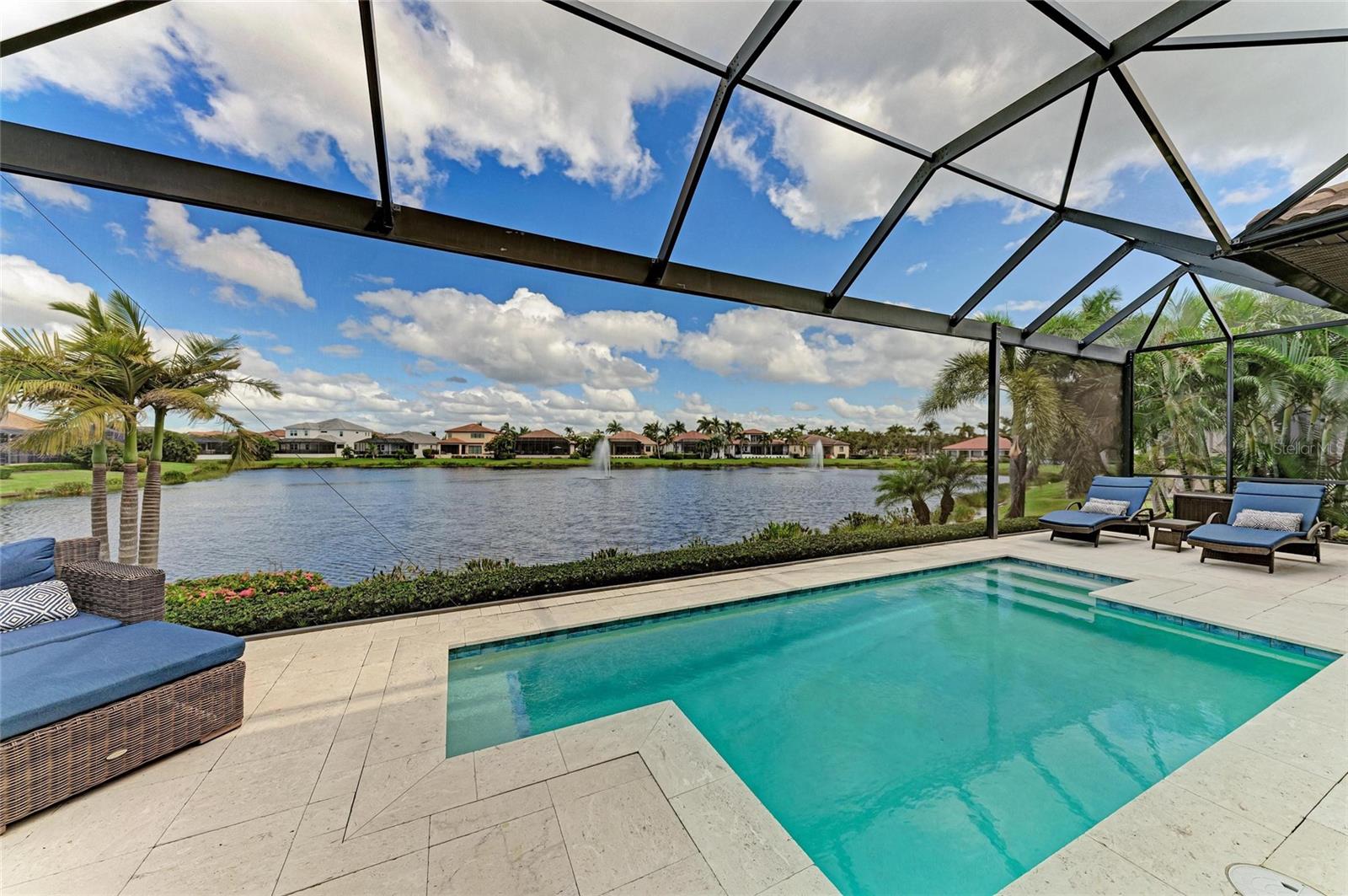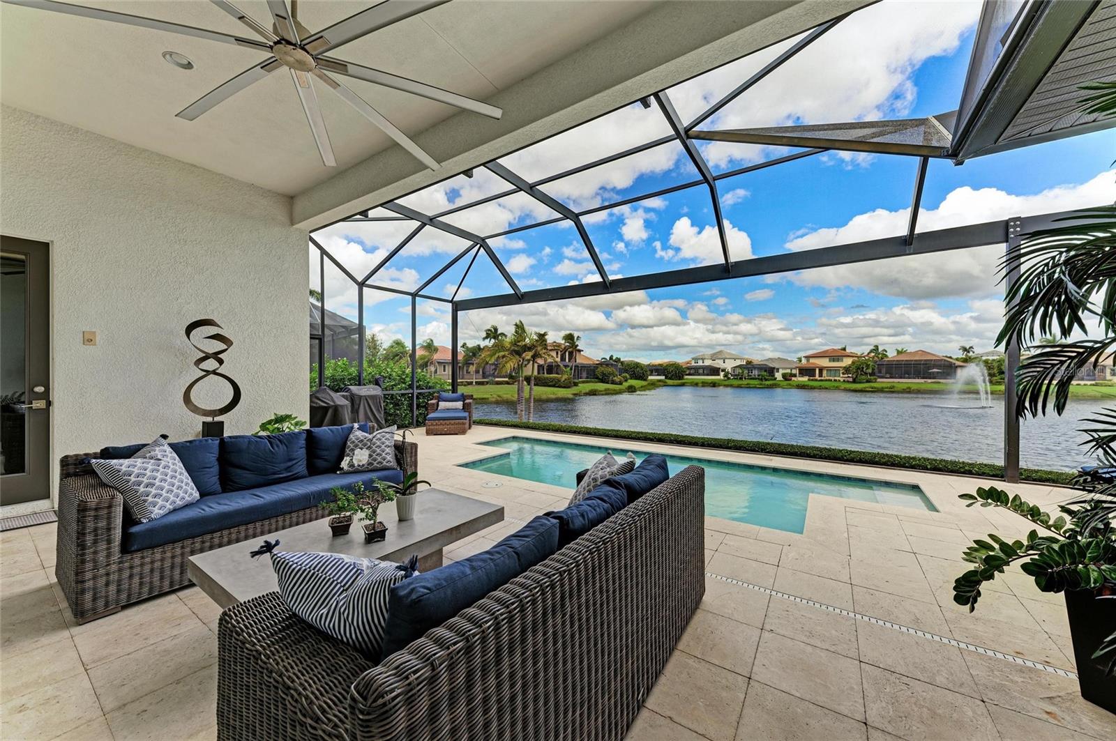 Exceptional custom home in the beautiful, gated enclave of Legends Bay. This home is immaculately maintained and offers remarkable construction quality, sophisticated design, and outstanding functionality. A prime water view location provides a serene backdrop to daily life. Lush tropical landscaping, a paver driveway, and a timeless exterior welcome you home. Built by a highly respected custom home builder, with meticulous attention to detail, you'll enjoy open sight lines, elegant designer features, symmetrical architecture, and abundant natural light. This 3-bedroom plus den home offers open space for gathering and split bedrooms for privacy. Soaring 12' ceilings and tall impact stacked sliding glass doors and transom windows contribute to an airy ambiance. Seamless indoor and outdoor living spaces showcase tranquil lake and fountain views. Special features include enhanced landscaping, designer lighting, timeless wall treatments, exquisite stone flooring and counters, crown molding, solid-core doors, plantation shutters, and state-of the-art appliances.The stunning showcase kitchen is a chef's dream with a natural gas Wolf range, tall wine refrigerator, double ovens, and quality dovetail soft close wood cabinets. The gleaming quartz countertops and large island are ideal for entertaining and everyday convenience. The well-appointed owner's retreat offers peaceful views, a walk-in shower, and expansive custom closet cabinetry for organization. Two guest bedrooms share a "Jack and Jill bath" on a private wing. The flexible den space is ready for remote work or extra space for relaxation. The fabulous outdoor living is an oasis that blends seamlessly with the indoor living area. Luxurious travertine and an extended screened in lanai surround the heated pool. The panoramic screen frames beautiful year-round views. The pool bath is accessible from the lanai for added convenience. Residents appreciate Legends Bay's welcoming atmosphere and charming tree-lined streets. Amenities include a lakeside pool, clubhouse, walking path to the pier, and social activities. The association fee covers yard maintenance and cable/internet for ease of living. Quick access to IMG Golf & Country Club and IMG Academy (golf-cart accessible), and just minutes from Anna Maria Island and Longboat Key. This energy-efficient and elevated home was quality built for the utmost peace of mind and reasonable insurance. Legends Bay's vibrant community and amenities make it easy to settle in and enjoy the Florida lifestyle. Experience the joy of living close enough to the bay that you can feel the coastal breeze yet sheltered away enough to avoid the stress of storms. This home was built with exceptional construction quality for very discerning clients. Come see if this incredible home is the opportunity for you. Virtual tours by drone and 3D Matterport available.