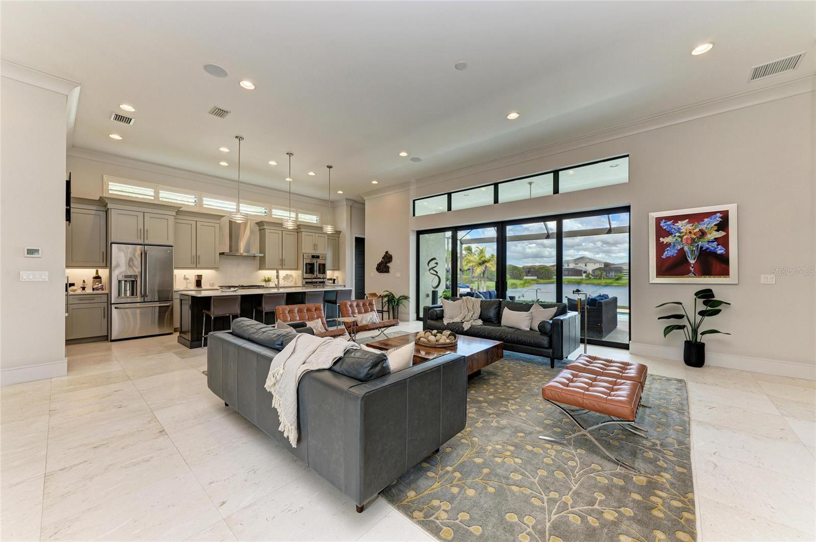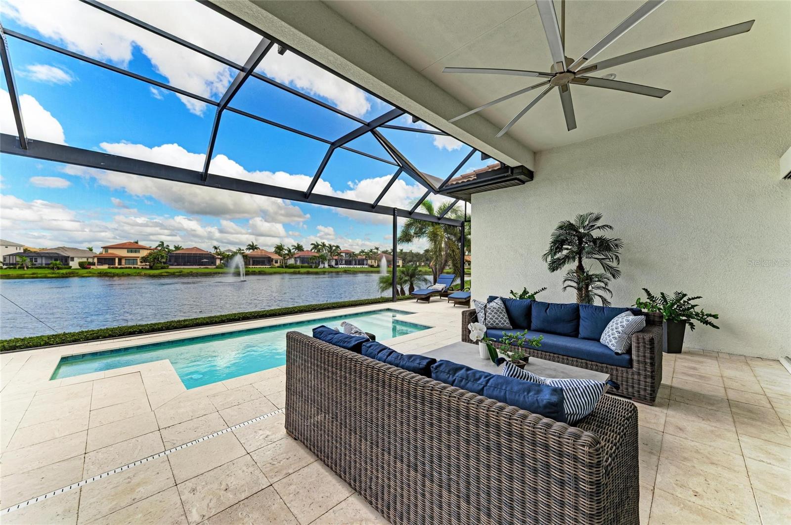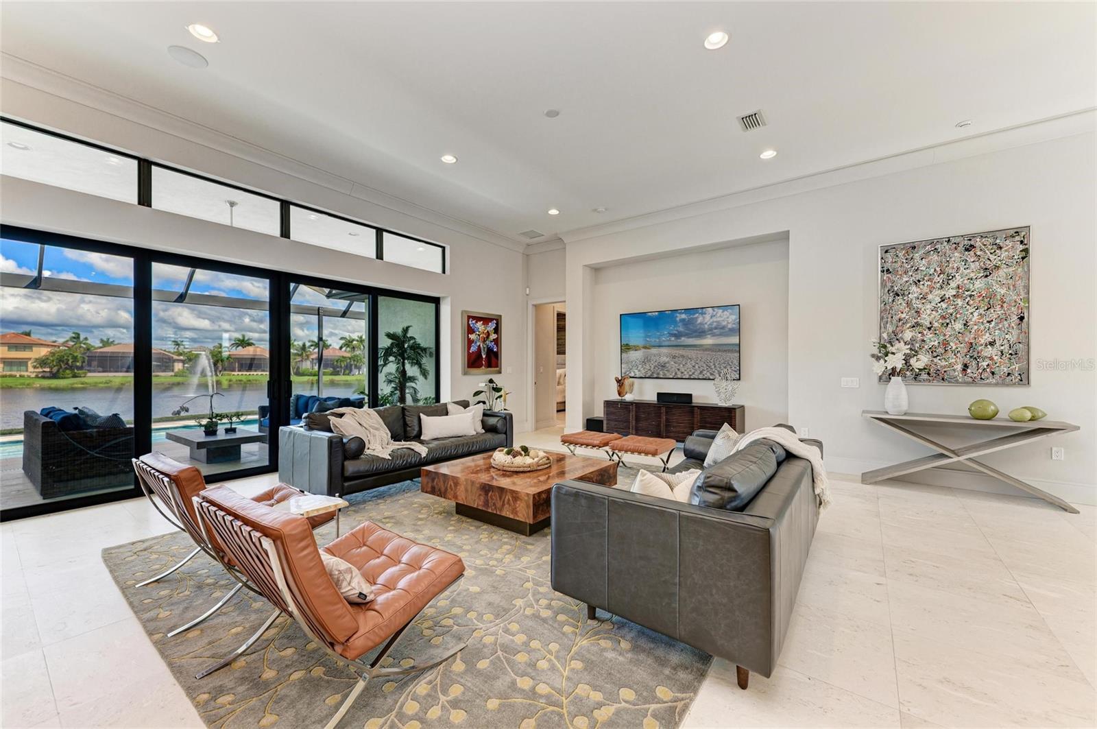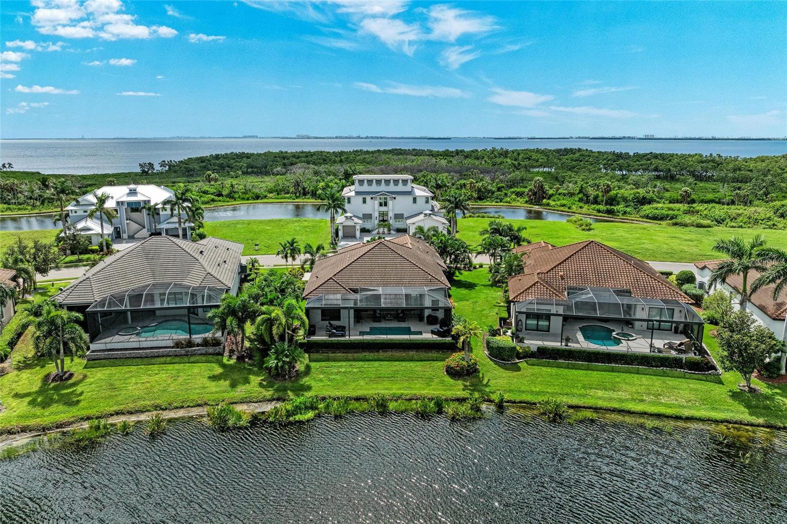 Exceptional custom home in the beautiful, gated enclave of Legends Bay. This home is immaculately maintained and offers remarkable construction quality, sophisticated design, and outstanding functionality. A prime water view location provides a serene backdrop to daily life. Lush tropical landscaping, a paver driveway, and a timeless exterior welcome you home. Built by a highly respected custom home builder, with meticulous attention to detail, you'll enjoy open sight lines, elegant designer features, symmetrical architecture, and abundant natural light. This 3-bedroom plus den home offers open space for gathering and split bedrooms for privacy. Soaring 12' ceilings and tall impact stacked sliding glass doors and transom windows contribute to an airy ambiance. Seamless indoor and outdoor living spaces showcase tranquil lake and fountain views. Special features include enhanced landscaping, designer lighting, timeless wall treatments, exquisite stone flooring and counters, crown molding, solid-core doors, plantation shutters, and state-of the-art appliances.The stunning showcase kitchen is a chef's dream with a natural gas Wolf range, tall wine refrigerator, double ovens, and quality dovetail soft close wood cabinets. The gleaming quartz countertops and large island are ideal for entertaining and everyday convenience. The well-appointed owner's retreat offers peaceful views, a walk-in shower, and expansive custom closet cabinetry for organization. Two guest bedrooms share a "Jack and Jill bath" on a private wing. The flexible den space is ready for remote work or extra space for relaxation. The fabulous outdoor living is an oasis that blends seamlessly with the indoor living area. Luxurious travertine and an extended screened in lanai surround the heated pool. The panoramic screen frames beautiful year-round views. The pool bath is accessible from the lanai for added convenience. Residents appreciate Legends Bay's welcoming atmosphere and charming tree-lined streets. Amenities include a lakeside pool, clubhouse, walking path to the pier, and social activities. The association fee covers yard maintenance and cable/internet for ease of living. Quick access to IMG Golf & Country Club and IMG Academy (golf-cart accessible), and just minutes from Anna Maria Island and Longboat Key. This energy-efficient and elevated home was quality built for the utmost peace of mind and reasonable insurance. Legends Bay's vibrant community and amenities make it easy to settle in and enjoy the Florida lifestyle. Experience the joy of living close enough to the bay that you can feel the coastal breeze yet sheltered away enough to avoid the stress of storms. This home was built with exceptional construction quality for very discerning clients. Come see if this incredible home is the opportunity for you. Virtual tours by drone and 3D Matterport available.