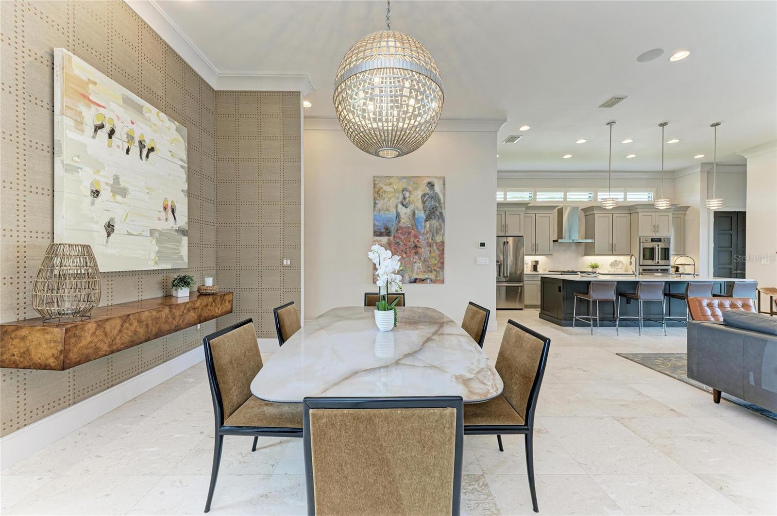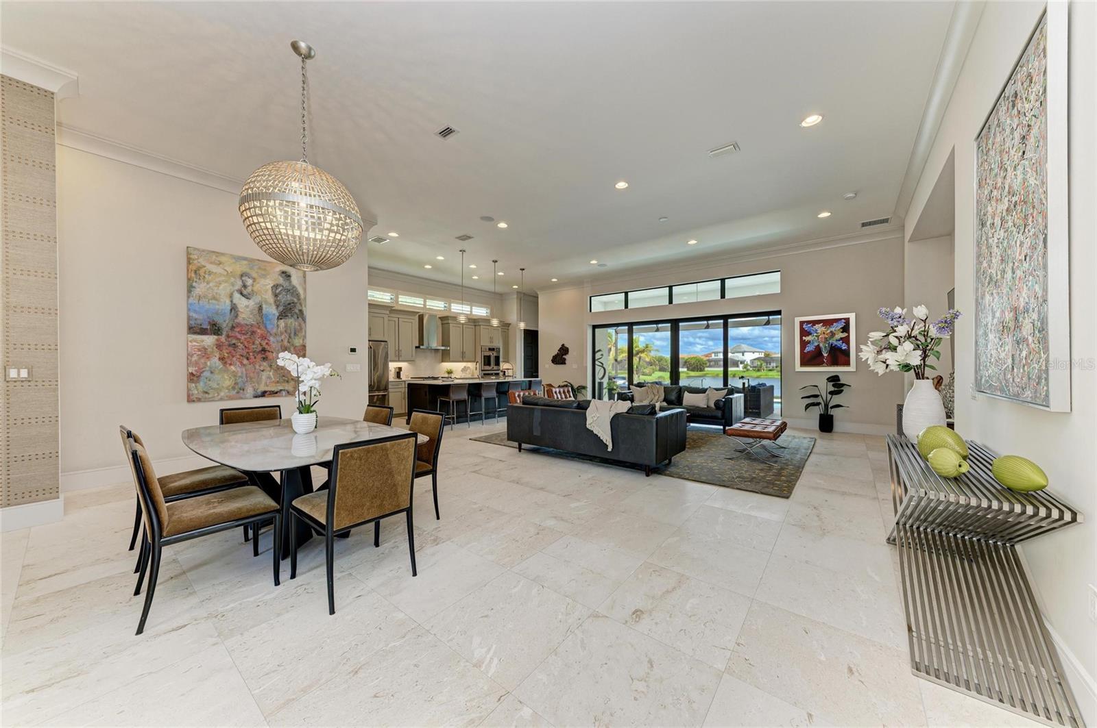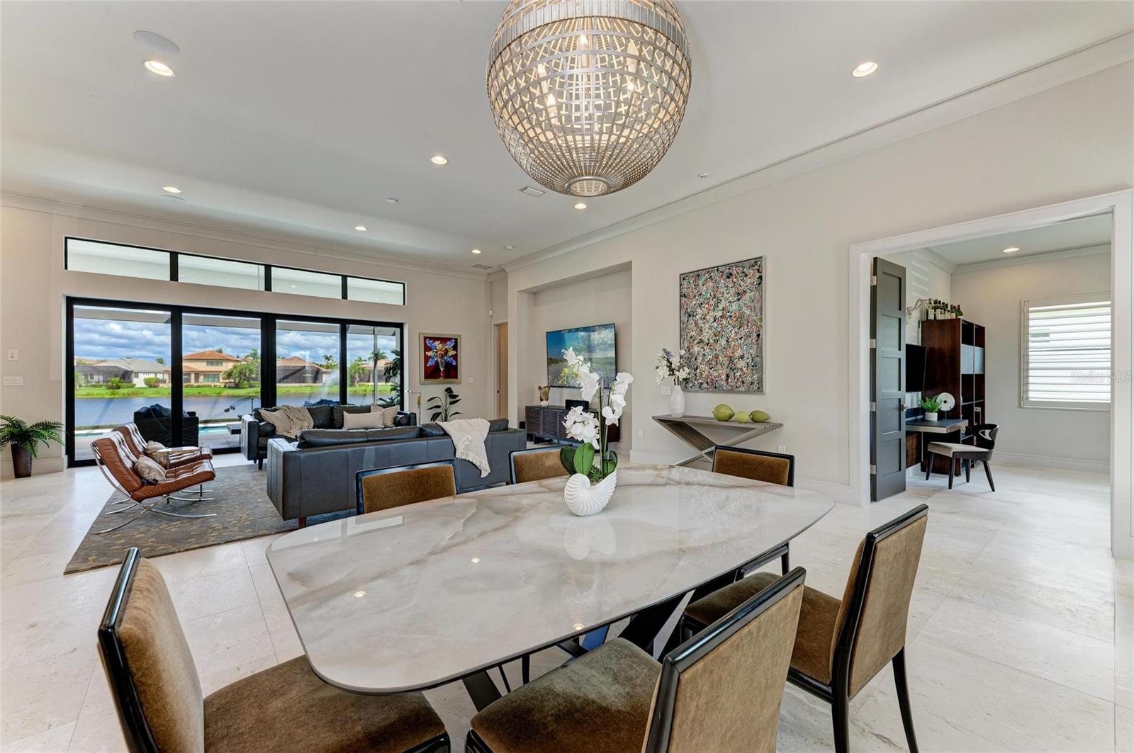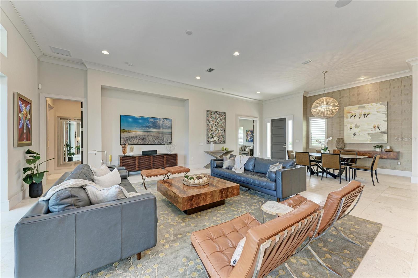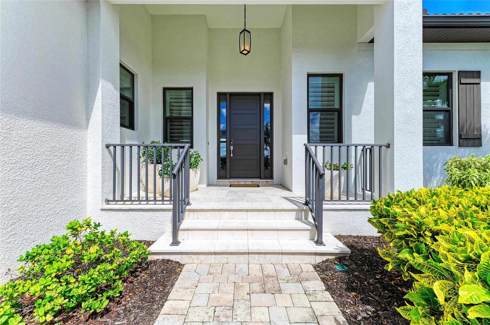 Exceptional custom home in the beautiful, gated enclave of Legends Bay. This home is immaculately maintained and offers remarkable construction quality, sophisticated design, and outstanding functionality. A prime water view location provides a serene backdrop to daily life. Lush tropical landscaping, a paver driveway, and a timeless exterior welcome you home. Built by a highly respected custom home builder, with meticulous attention to detail, you'll enjoy open sight lines, elegant designer features, symmetrical architecture, and abundant natural light. This 3-bedroom plus den home offers open space for gathering and split bedrooms for privacy. Soaring 12' ceilings and tall impact stacked sliding glass doors and transom windows contribute to an airy ambiance. Seamless indoor and outdoor living spaces showcase tranquil lake and fountain views. Special features include enhanced landscaping, designer lighting, timeless wall treatments, exquisite stone flooring and counters, crown molding, solid-core doors, plantation shutters, and state-of the-art appliances.The stunning showcase kitchen is a chef's dream with a natural gas Wolf range, tall wine refrigerator, double ovens, and quality dovetail soft close wood cabinets. The gleaming quartz countertops and large island are ideal for entertaining and everyday convenience. The well-appointed owner's retreat offers peaceful views, a walk-in shower, and expansive custom closet cabinetry for organization. Two guest bedrooms share a "Jack and Jill bath" on a private wing. The flexible den space is ready for remote work or extra space for relaxation. The fabulous outdoor living is an oasis that blends seamlessly with the indoor living area. Luxurious travertine and an extended screened in lanai surround the heated pool. The panoramic screen frames beautiful year-round views. The pool bath is accessible from the lanai for added convenience. Residents appreciate Legends Bay's welcoming atmosphere and charming tree-lined streets. Amenities include a lakeside pool, clubhouse, walking path to the pier, and social activities. The association fee covers yard maintenance and cable/internet for ease of living. Quick access to IMG Golf & Country Club and IMG Academy (golf-cart accessible), and just minutes from Anna Maria Island and Longboat Key. This energy-efficient and elevated home was quality built for the utmost peace of mind and reasonable insurance. Legends Bay's vibrant community and amenities make it easy to settle in and enjoy the Florida lifestyle. Experience the joy of living close enough to the bay that you can feel the coastal breeze yet sheltered away enough to avoid the stress of storms. This home was built with exceptional construction quality for very discerning clients. Come see if this incredible home is the opportunity for you. Virtual tours by drone and 3D Matterport available.